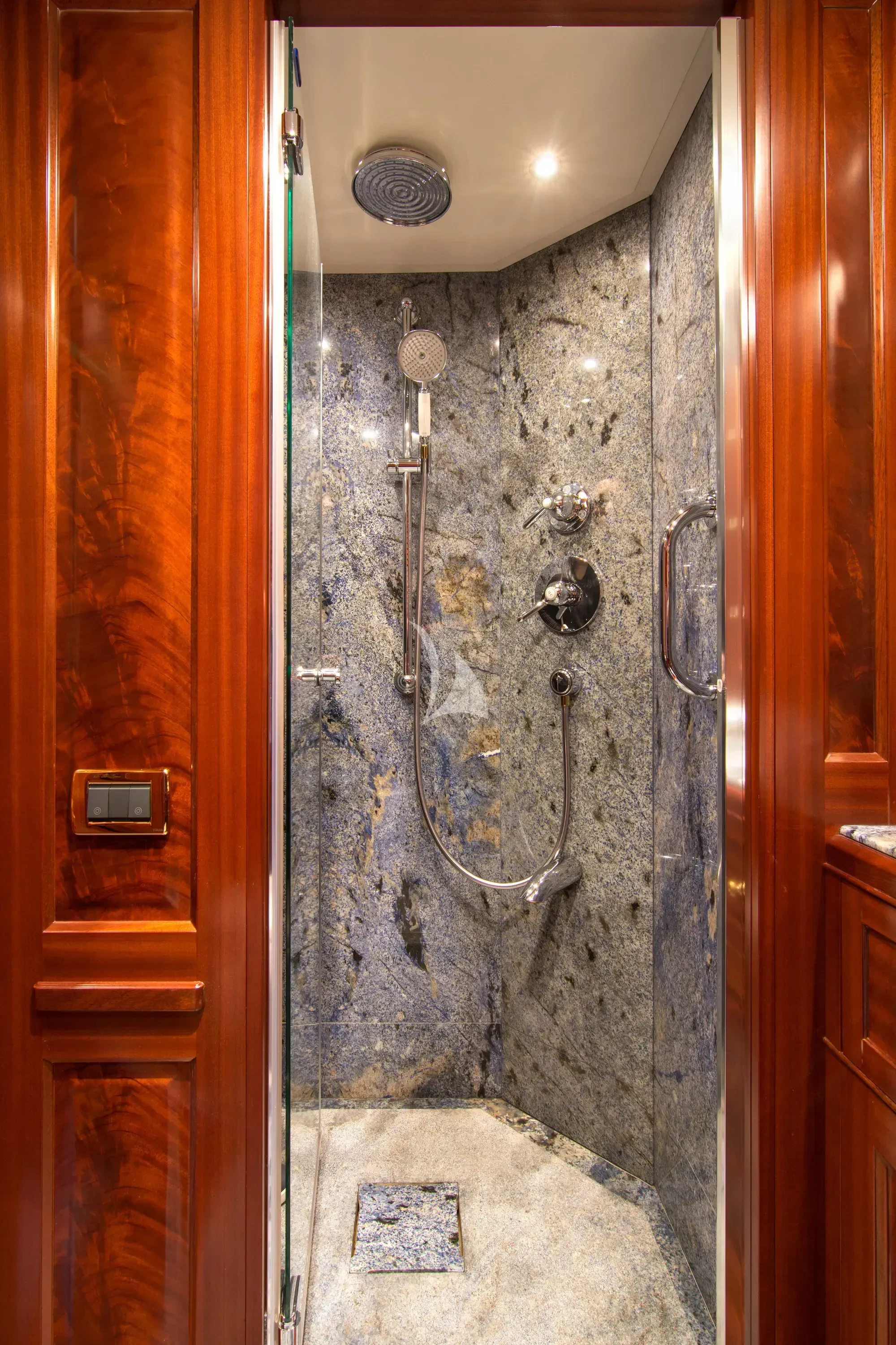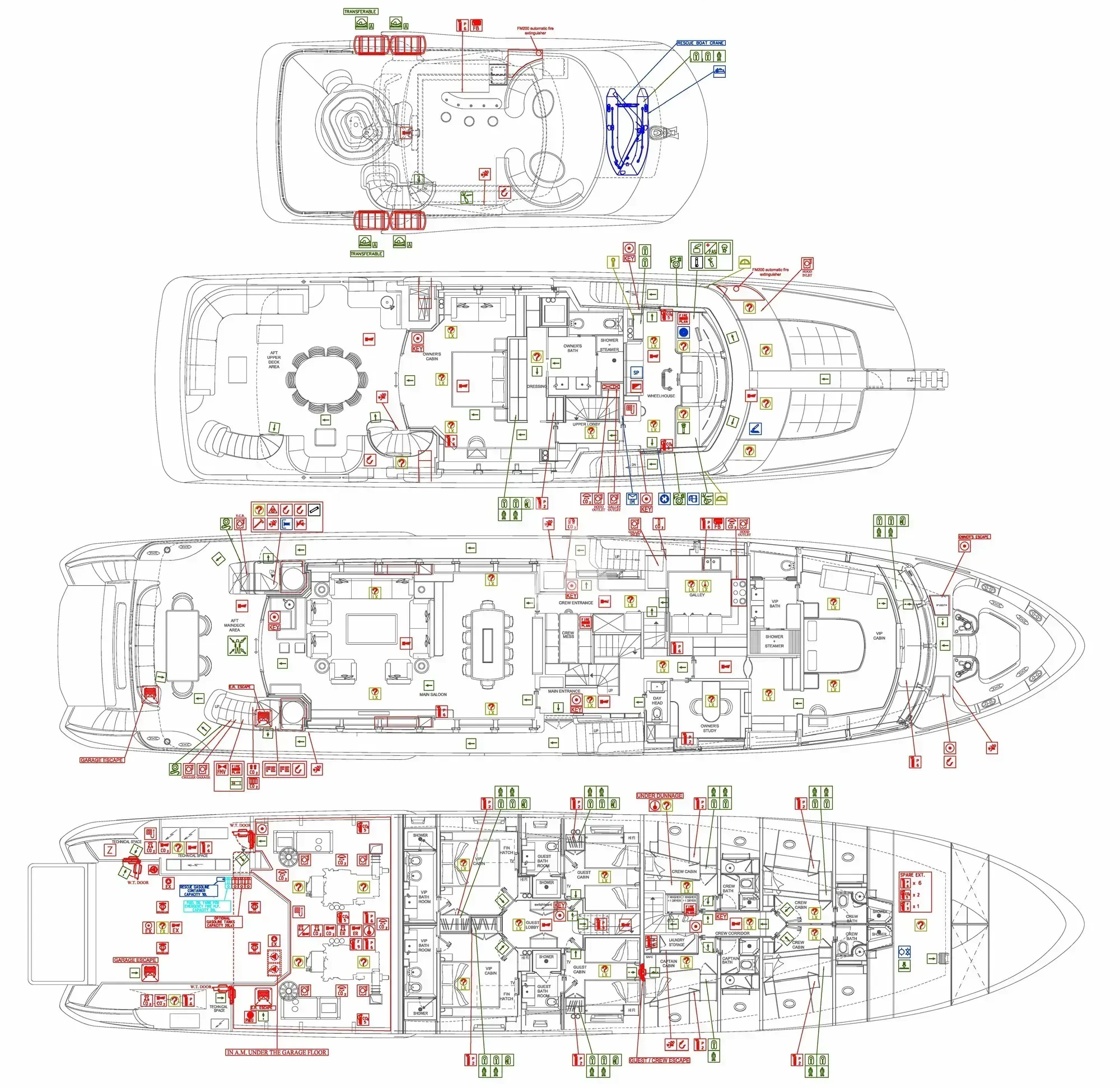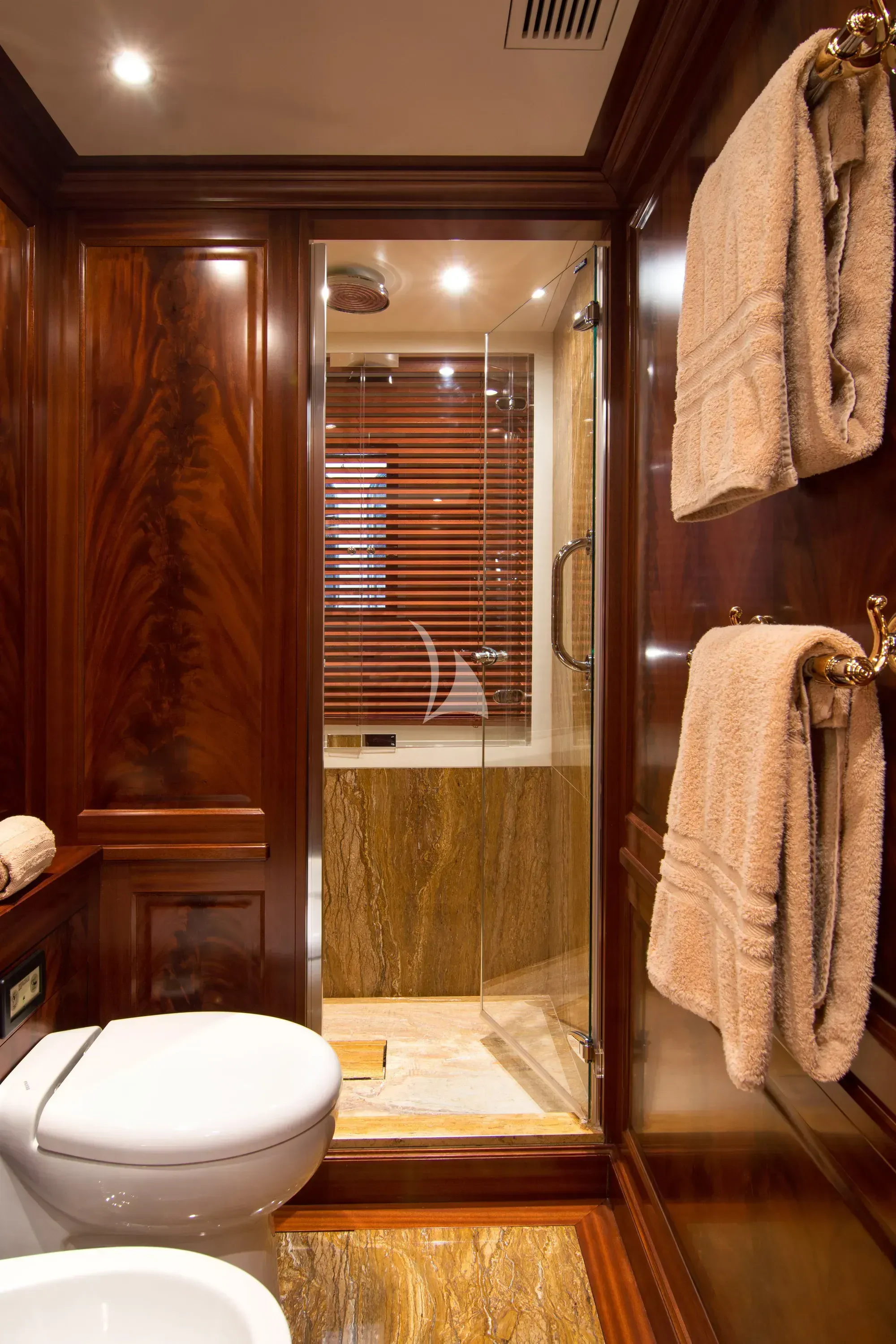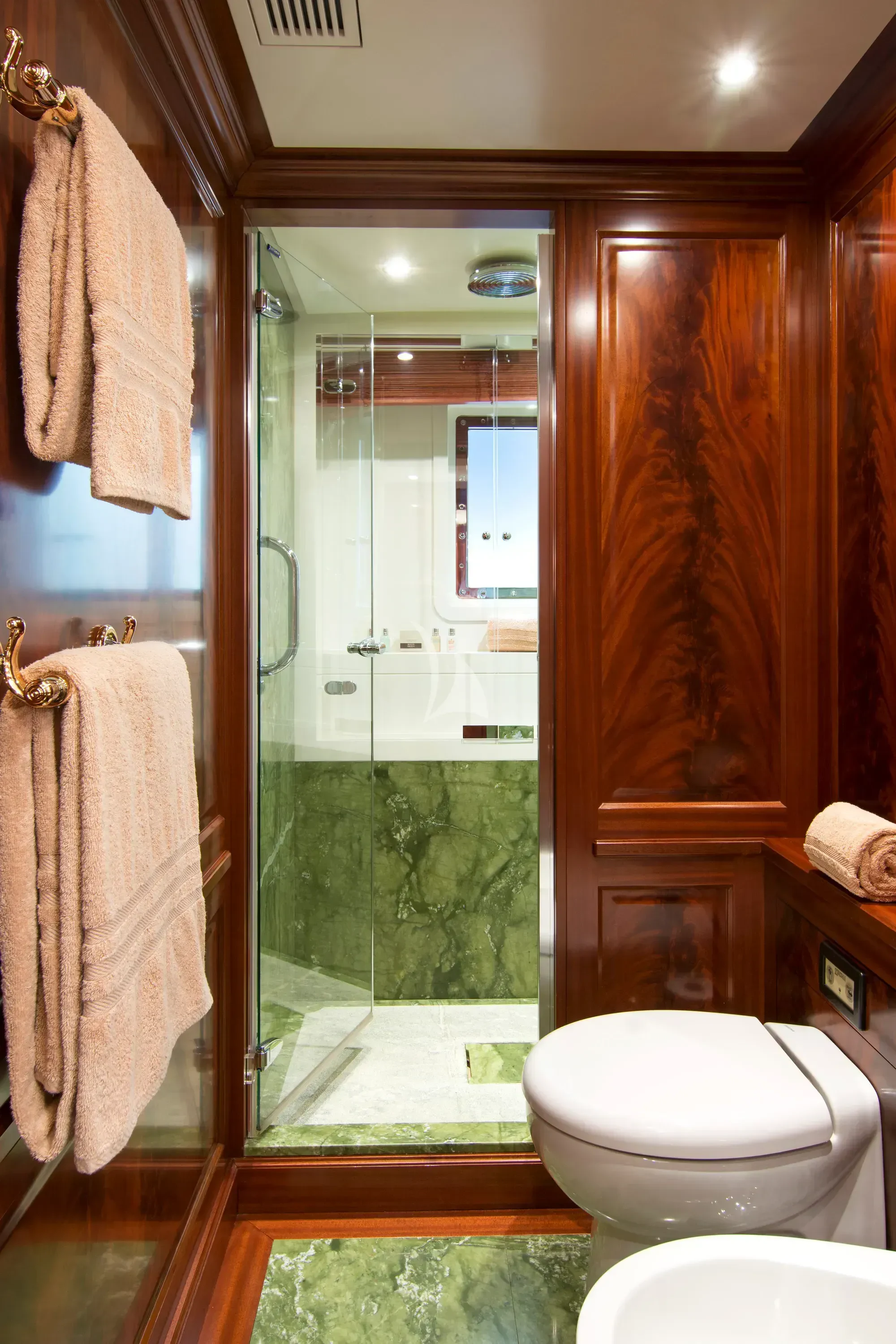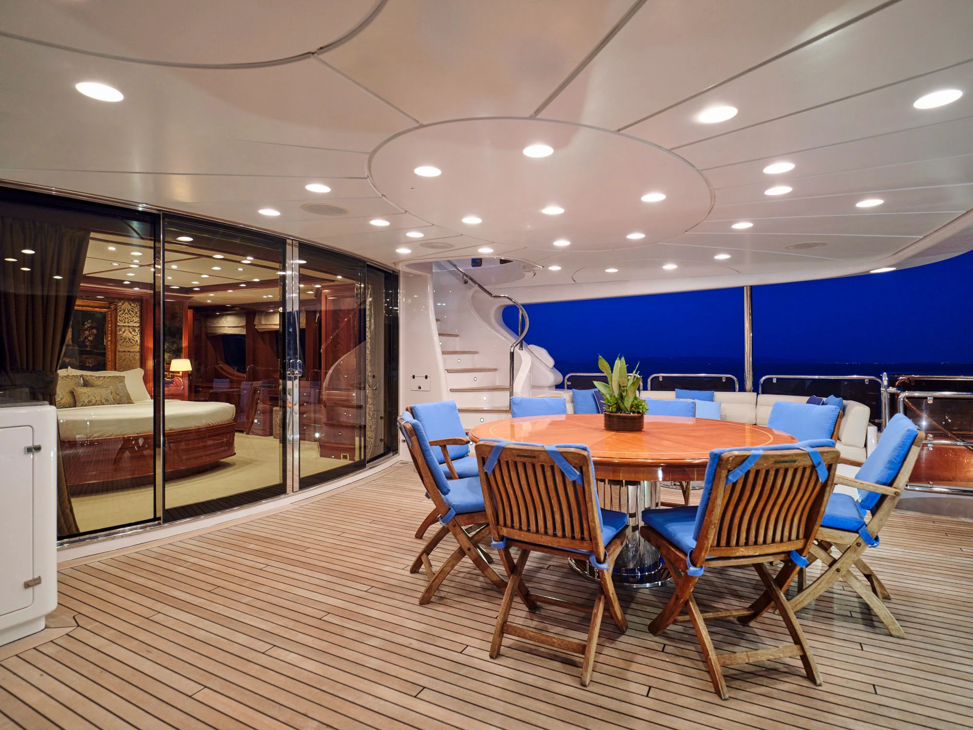 Luxury charter yacht OPTION B's six guest staterooms include a king-sized master on the main deck, complete with an en-suite and a sauna. On the upper deck, an en-suite VIP stateroom is similarly appointed with a sauna and a queen-sized bed. There are also two double and two twin cabins on the lower deck.