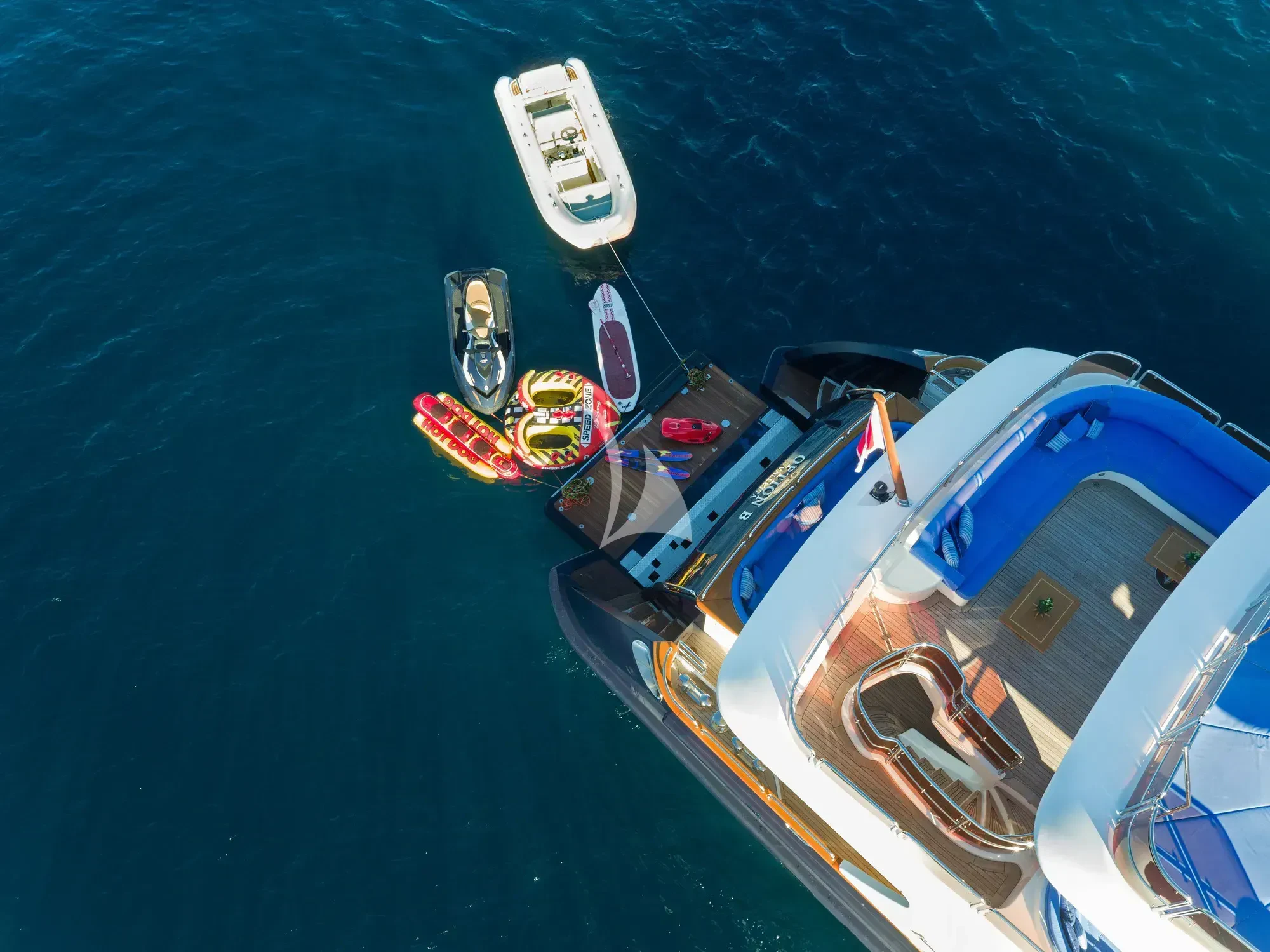 Luxury charter yacht OPTION B offers her 12 guests every opportunity to enjoy the water, sun and views of their cruising destination. As well as enjoying the yacht's performance as she powers from one scenic coastline and island to the next, guests can make the most of a great selection of water toys when she anchors. Whenever they want to head ashore, the tender is available to drop them off and later escort them back to the yacht.