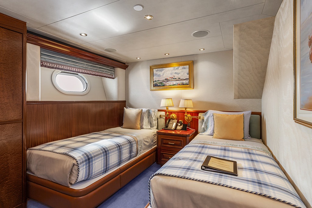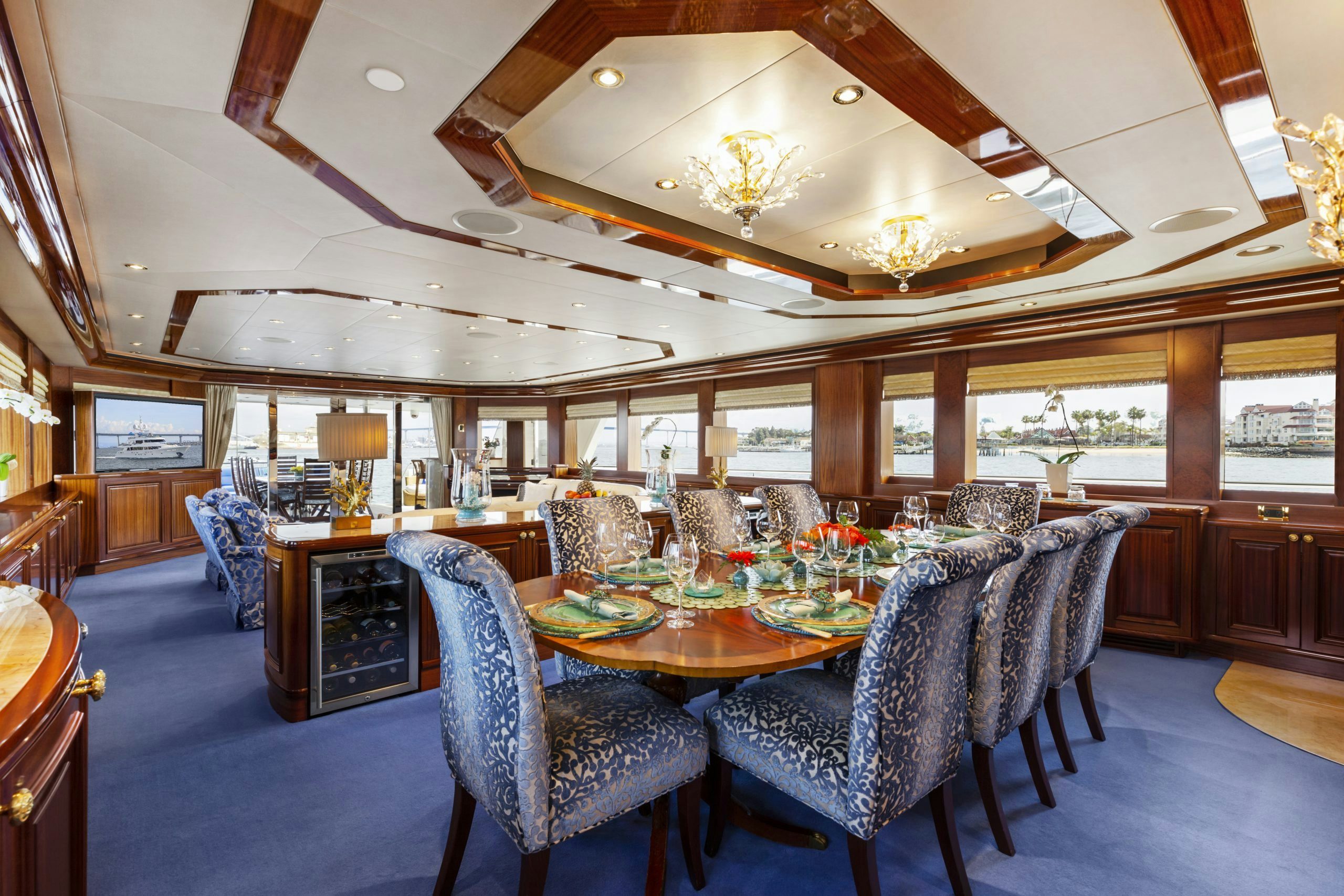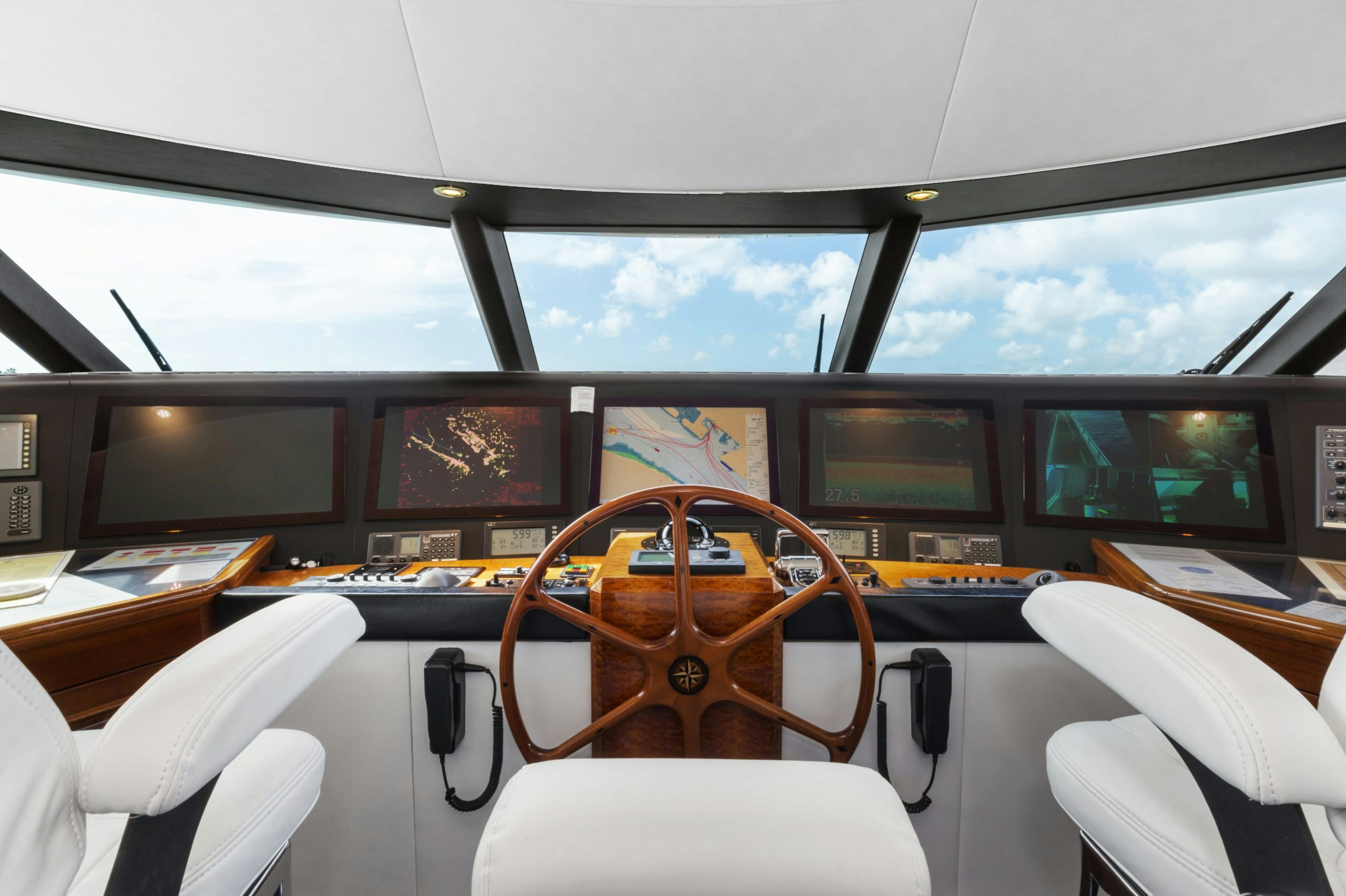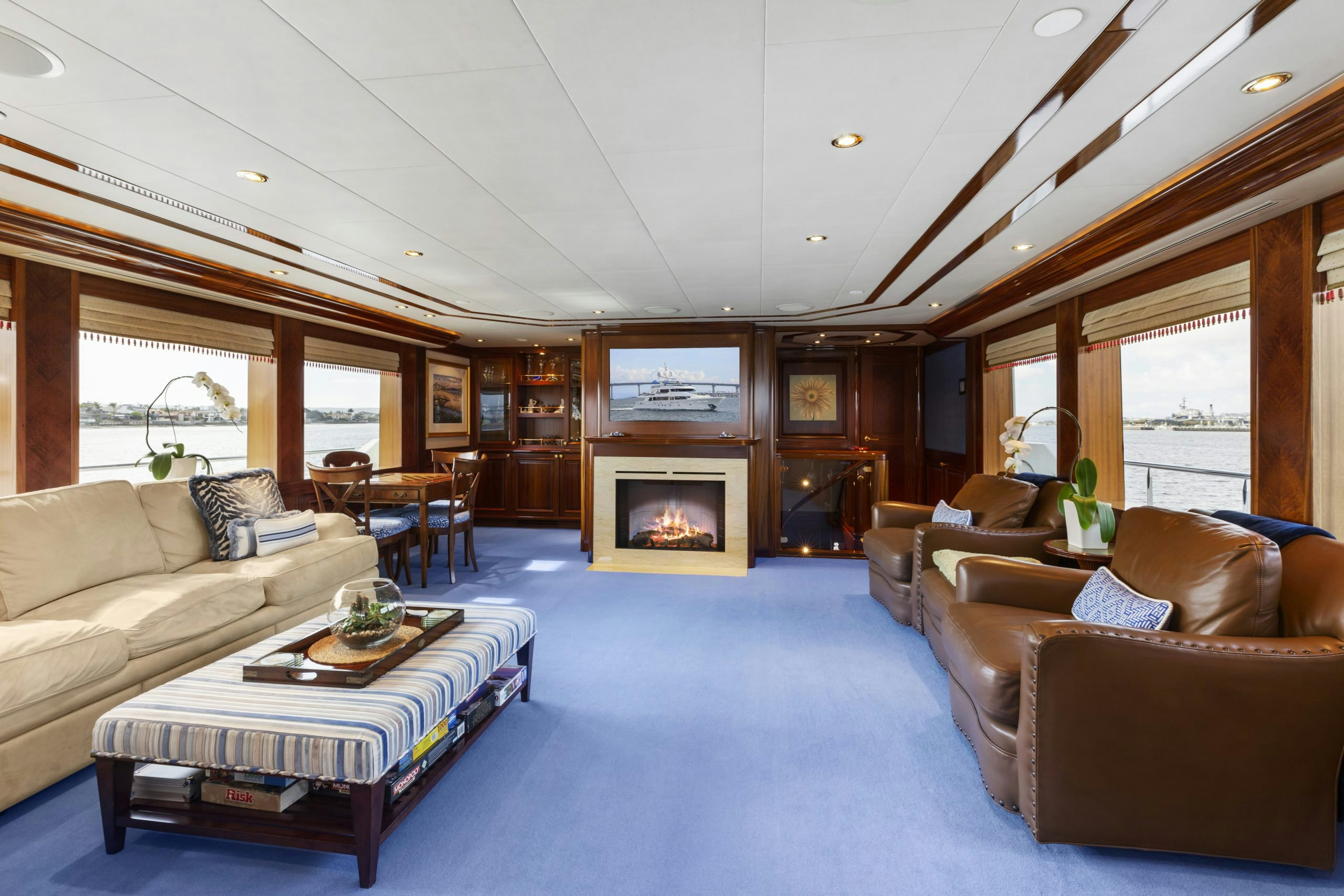 The spacious and expertly designed interior is light and bright with contemporary styling and comfortable furnishings. Large windows in the main salon and skylounge flood the interior with ambient light and provide unparalleled views of your cruising location. The skylounge, with its marble full-service bar and electric fireplace, is the perfect spot for onboard entertaining.