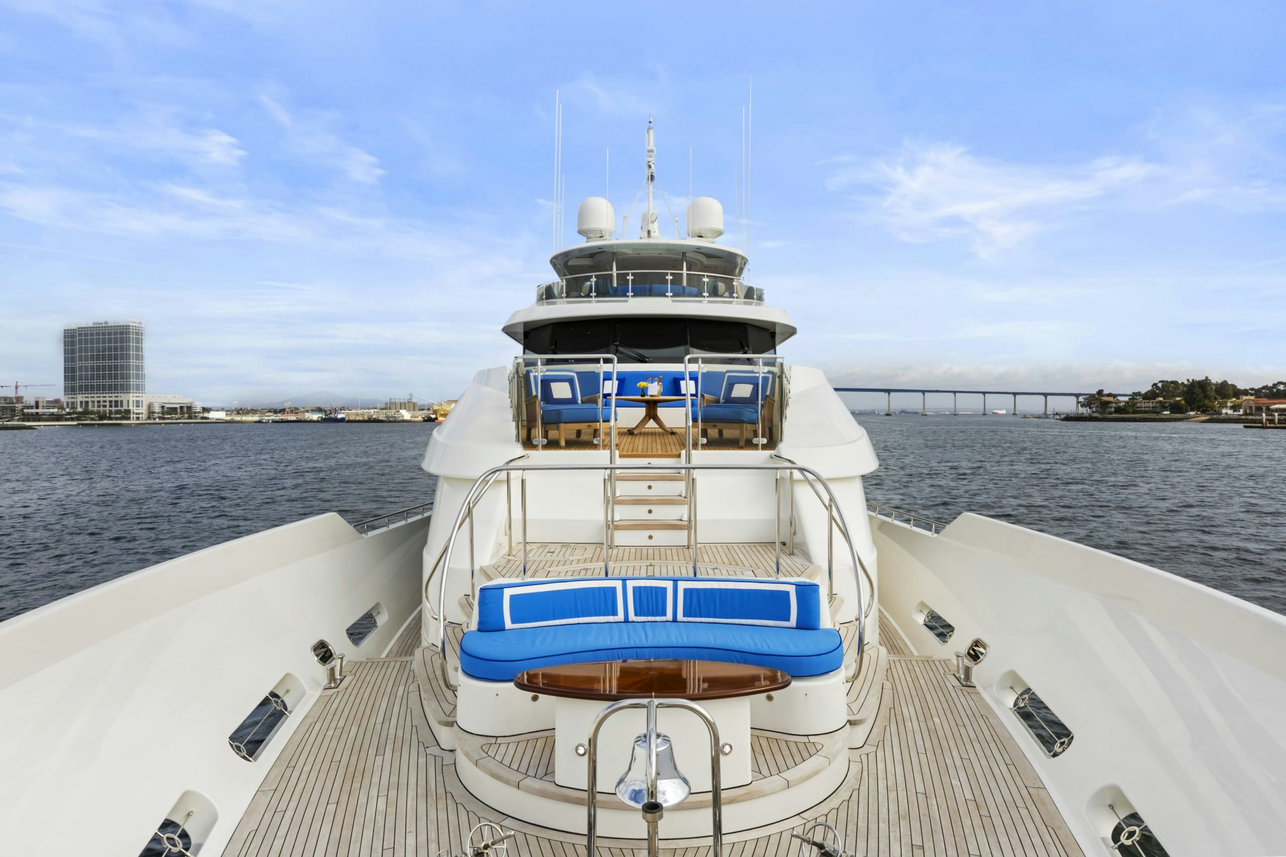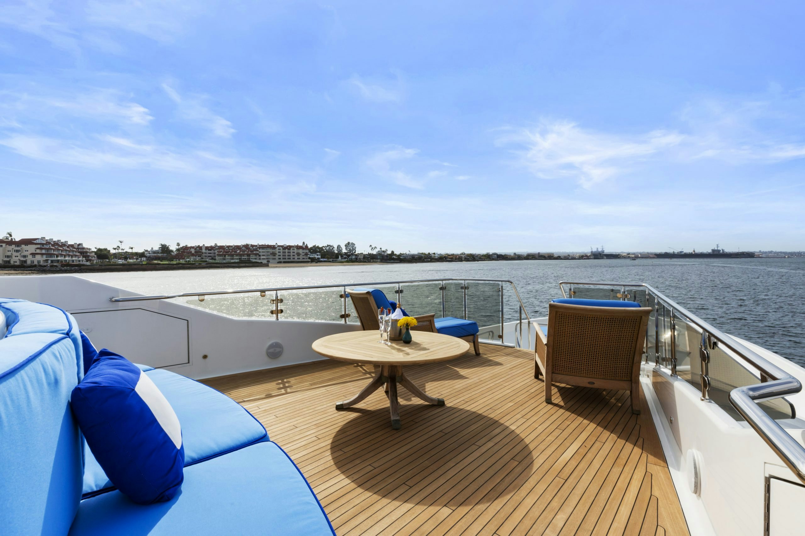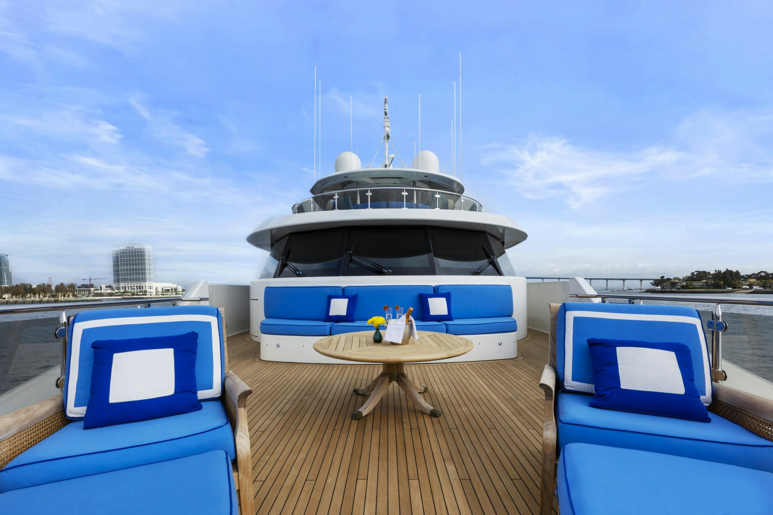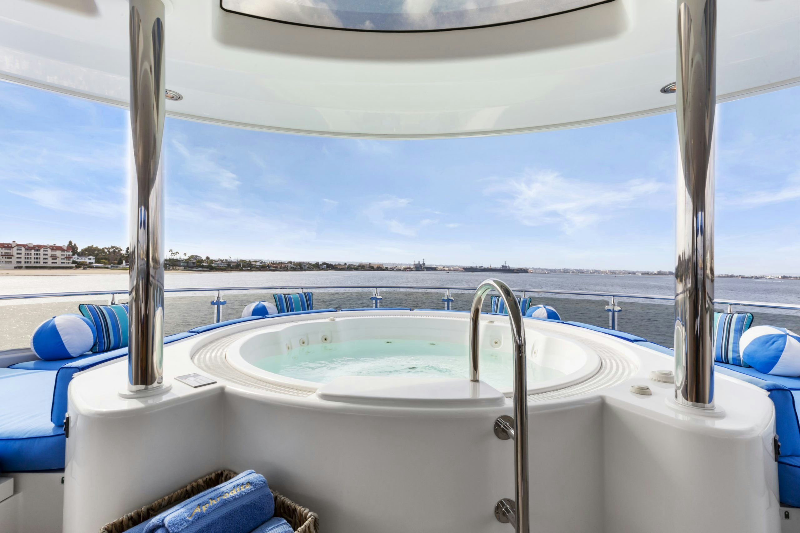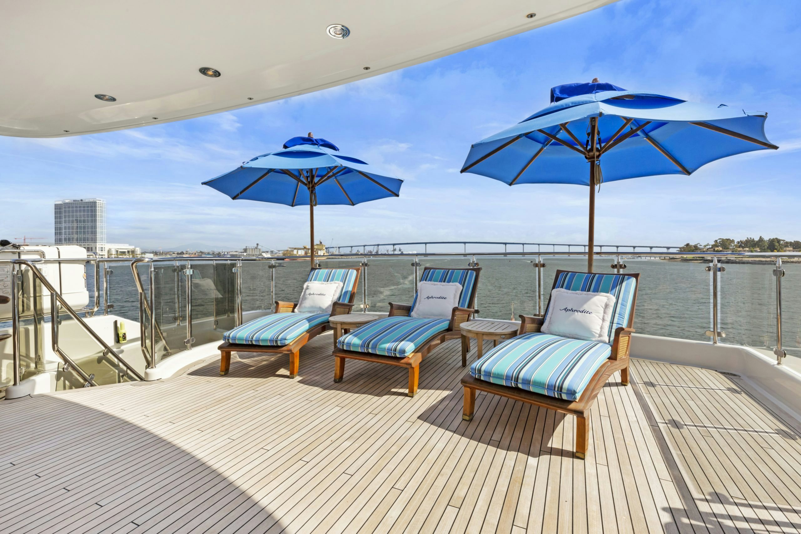 Primed for alfresco living her main deck aft is well suited for breakfasts and lunches with a large, cushioned settee and dining table; it also features a wet bar and can easily seat 12 to 18 guests during parties or events. The oversized swim platform is accessible via port and starboard stairs and is the best spot for launching any of the yacht’s water toys. APHRODITE is easily accessible thanks to full walk-around decks. Her forepeak is outfitted with a cocktail table and settee — an ideal place to relax and unwind. Soak up the sun on APHRODITE’s airy sundeck, which features a dedicated sunbathing space, a Jacuzzi and alfresco dining for up to 10.