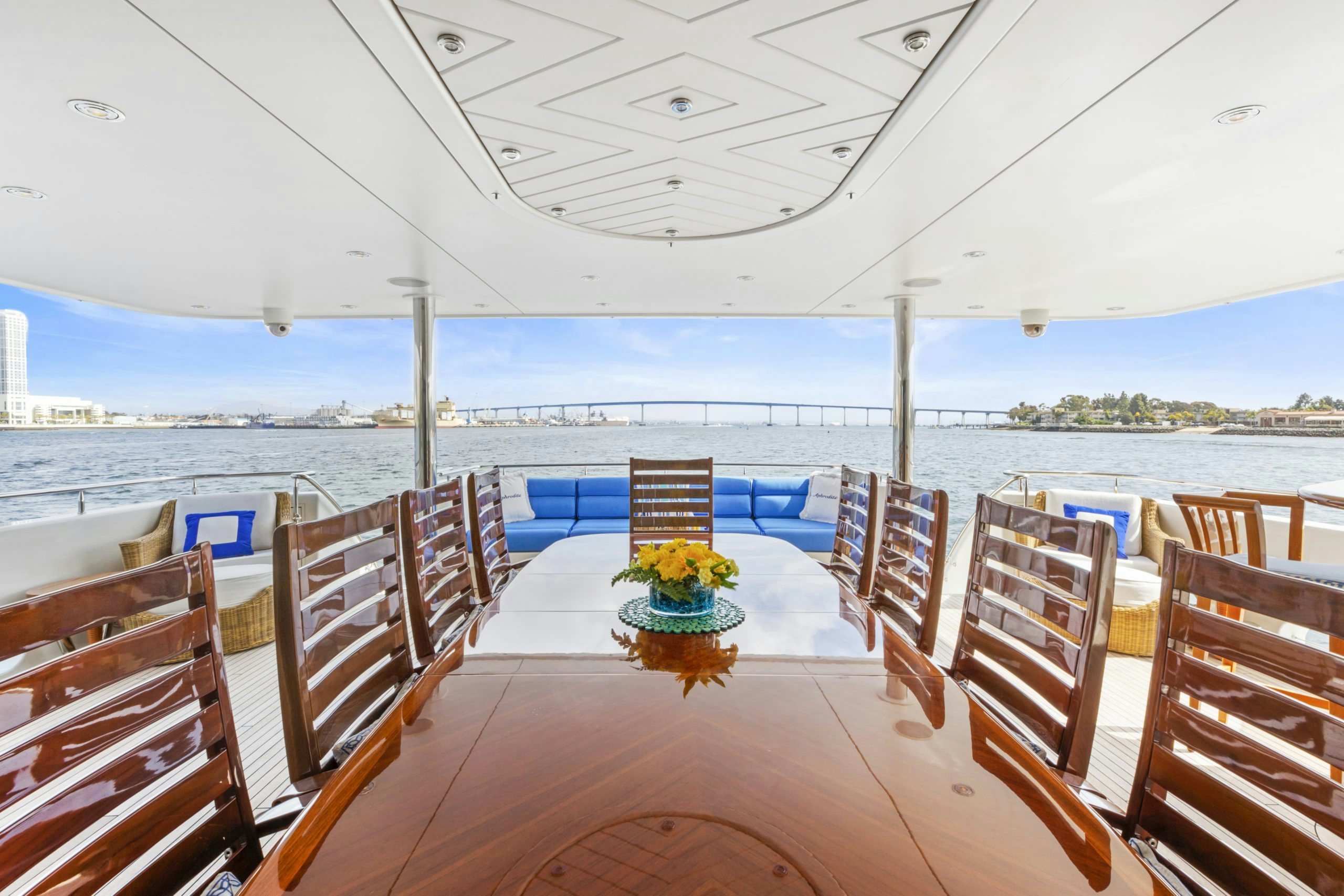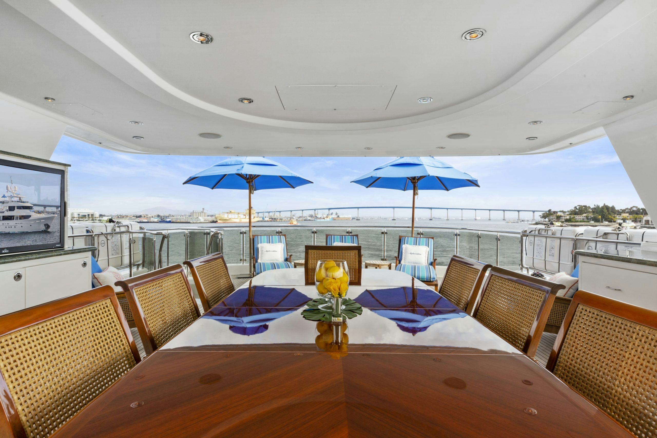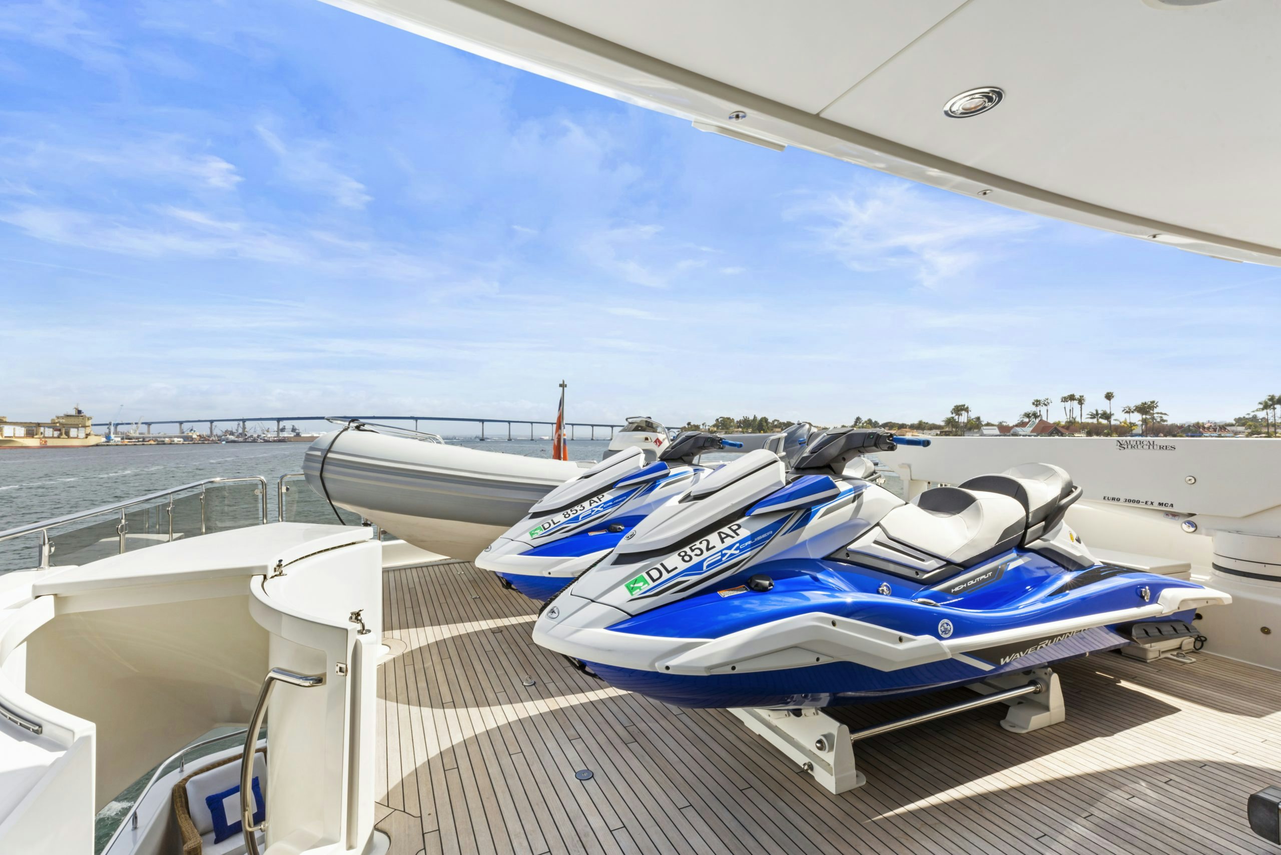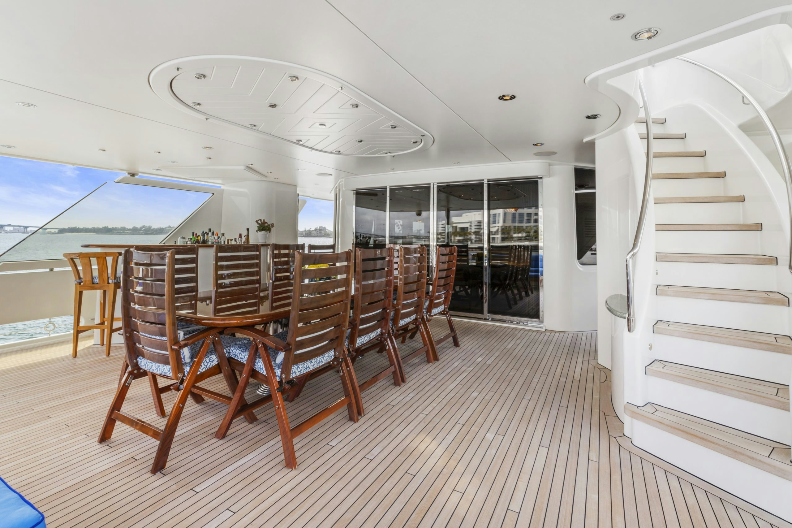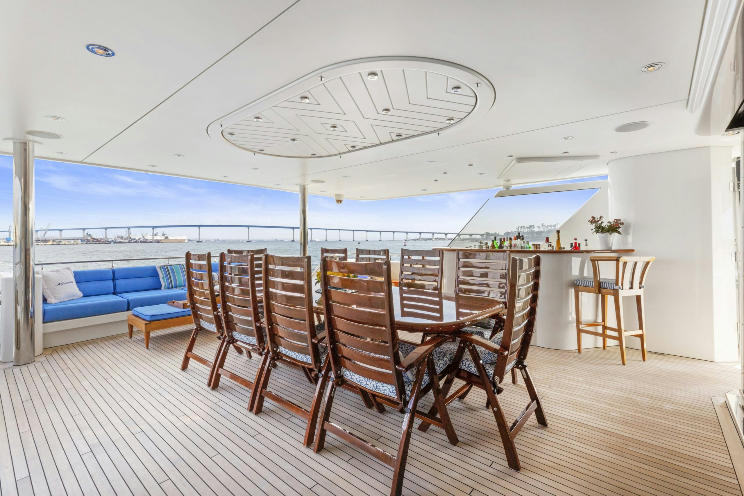 Primed for alfresco living her main deck aft is well suited for breakfasts and lunches with a large, cushioned settee and dining table; it also features a wet bar and can easily seat 12 to 18 guests during parties or events. The oversized swim platform is accessible via port and starboard stairs and is the best spot for launching any of the yacht’s water toys. APHRODITE is easily accessible thanks to full walk-around decks. Her forepeak is outfitted with a cocktail table and settee — an ideal place to relax and unwind. Soak up the sun on APHRODITE’s airy sundeck, which features a dedicated sunbathing space, a Jacuzzi and alfresco dining for up to 10.
