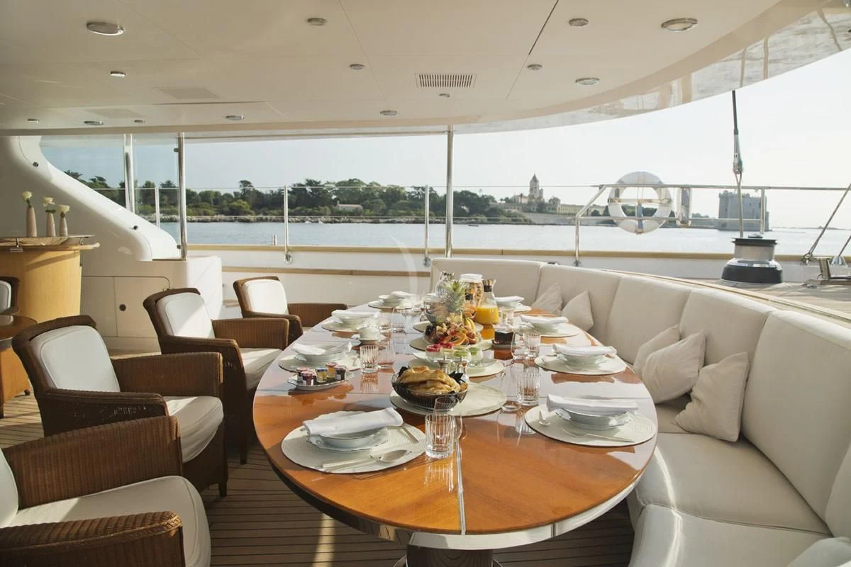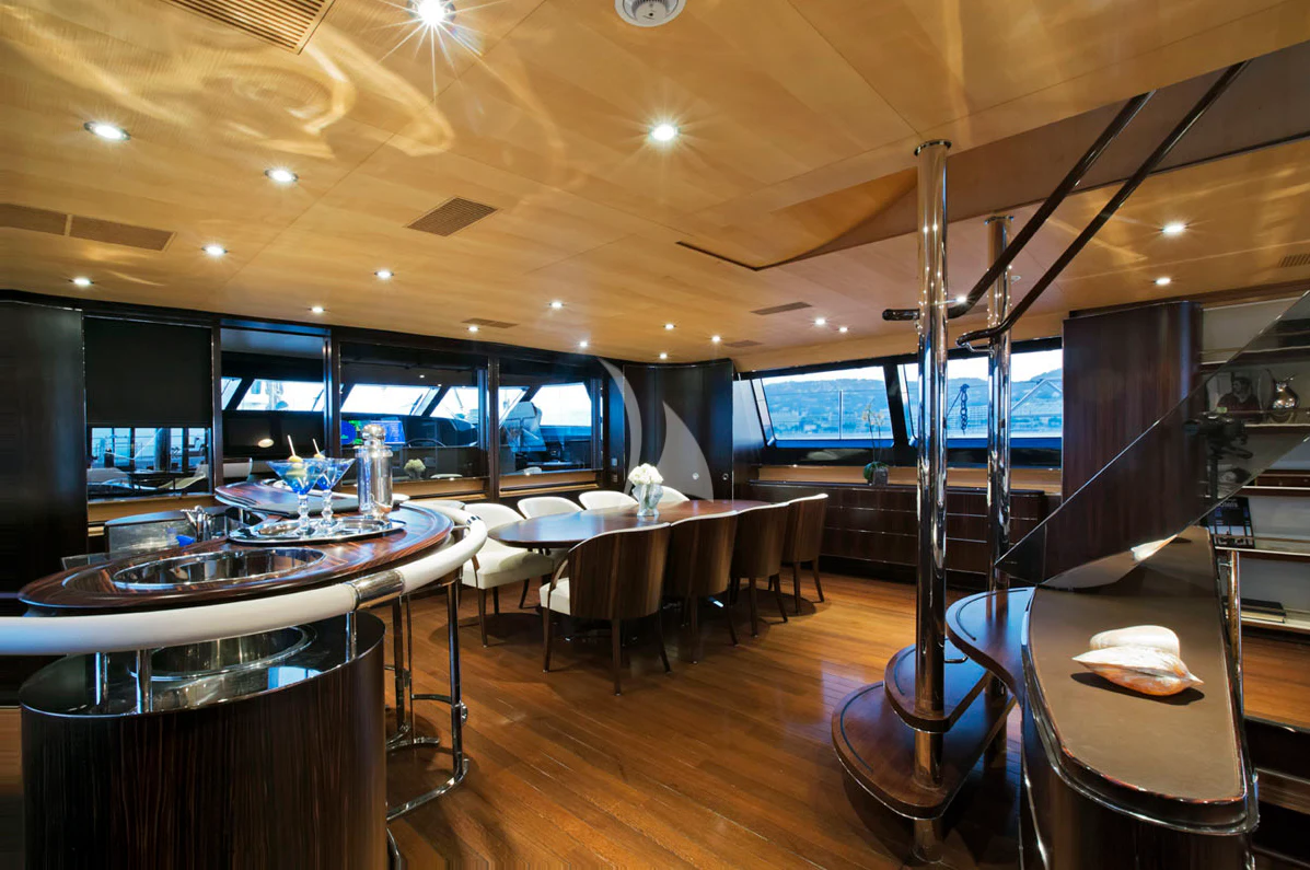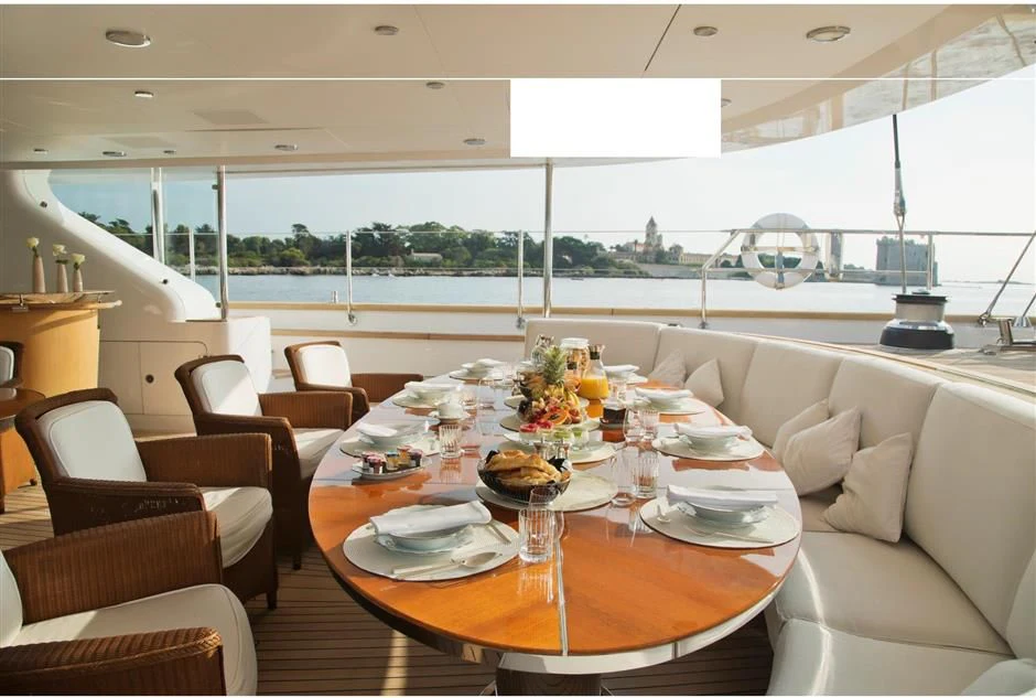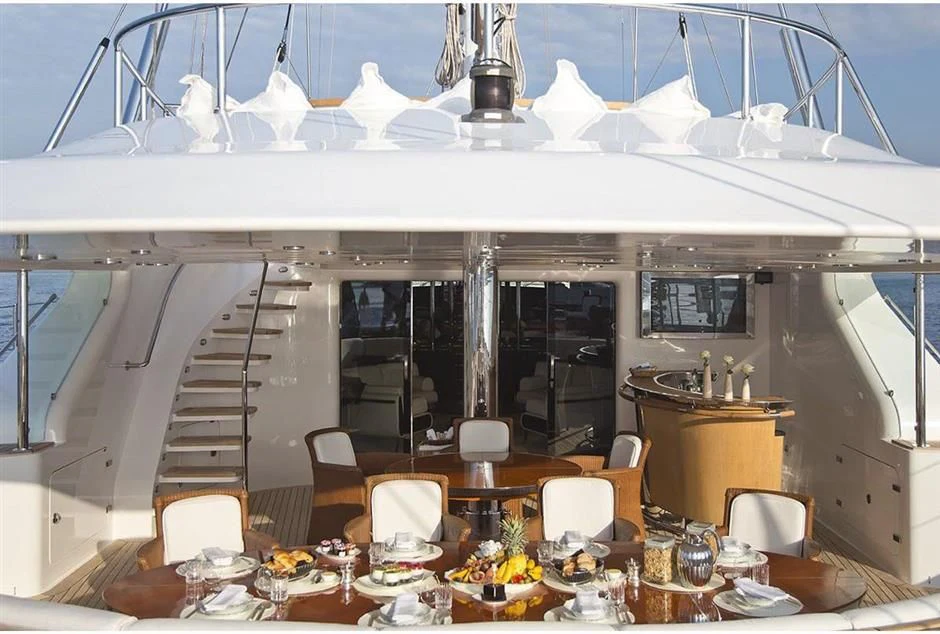 Outdoor areas of PARSIFAL III offer a range of amenities, including sunbathing and entertainment areas, an outdoor dining area in the cockpit shielded by clear glass windbreaks, a large flybridge with dual helm stations, a Jacuzzi and sunpads, a full wet bar, and lounging and dining areas that can be shaded by a large awning if needed. For outside of the norm, guests can also dine on the hydraulic swim platform.