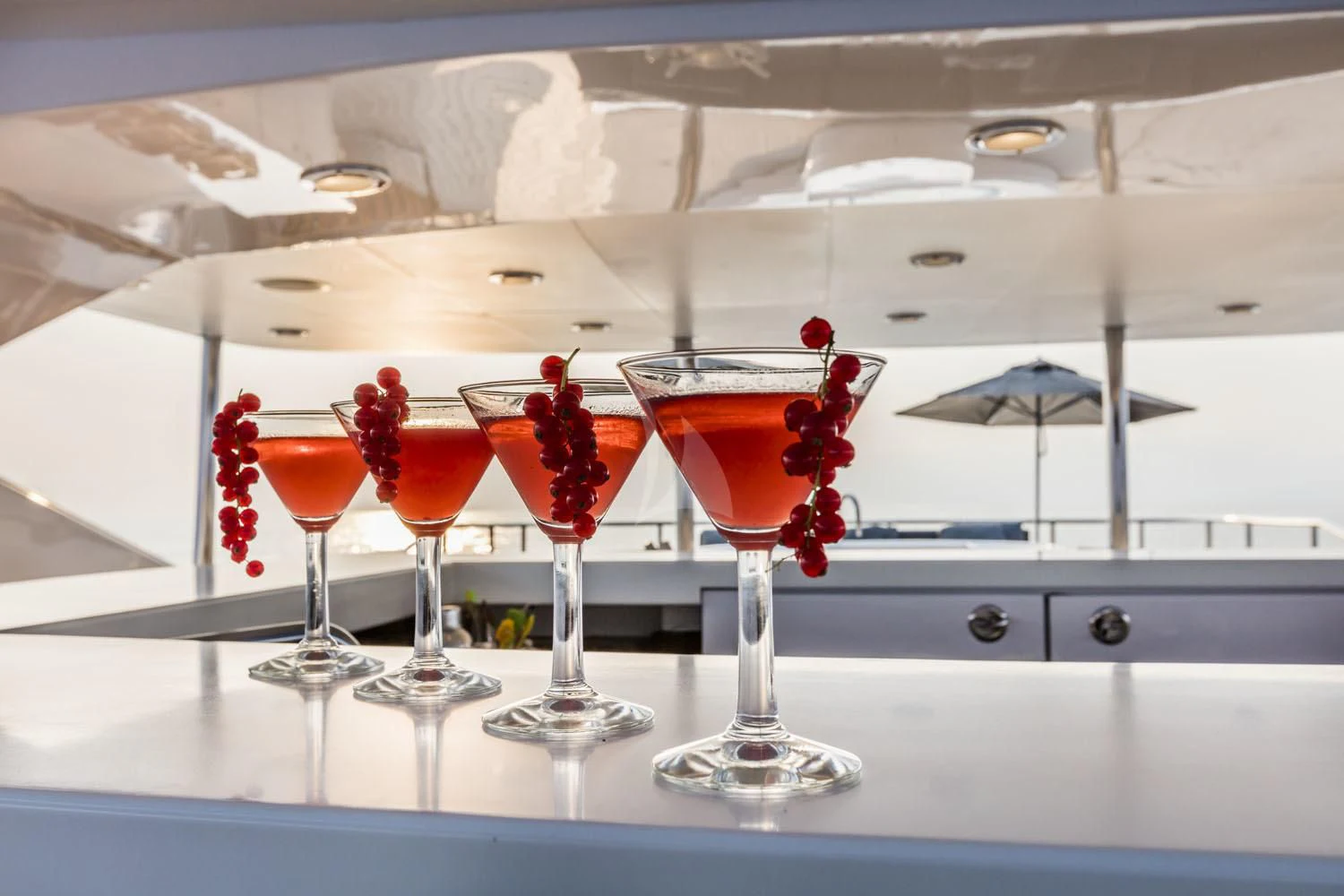 R23 has vast and impressive deck areas and a distinctive and eye-catching profile. She is equally suited to family cruises or high class-entertaining and event charters. One of R23’s most outstanding features is her vast sundeck, offering alfresco dining, a fully-equipped bar and a Jacuzzi.