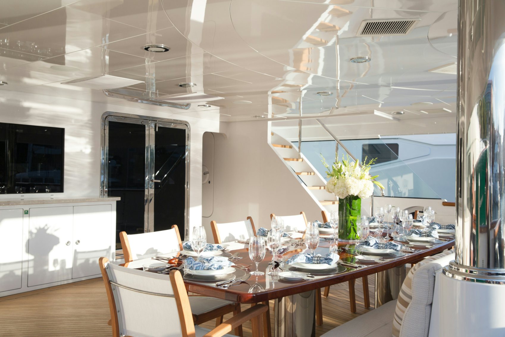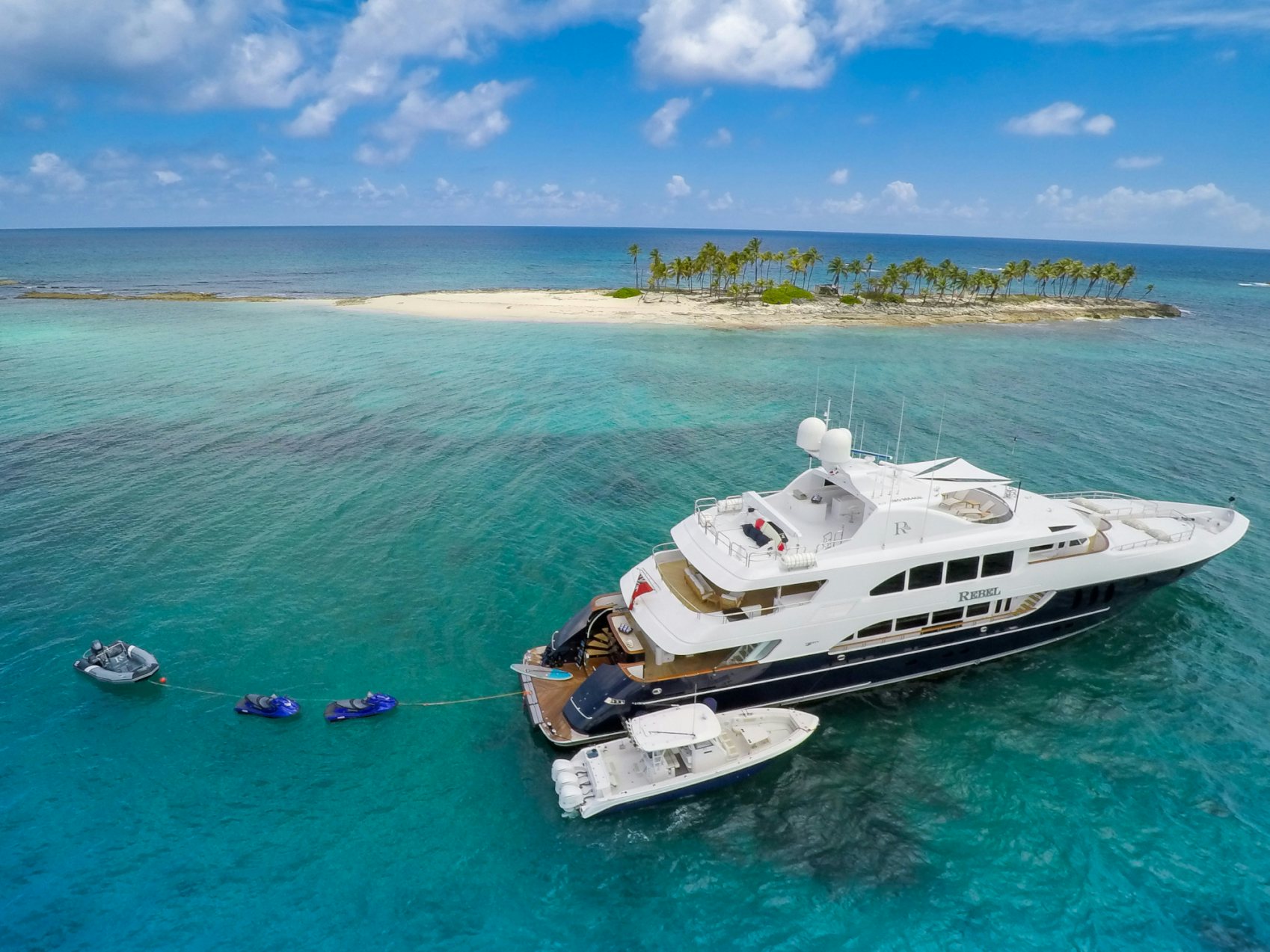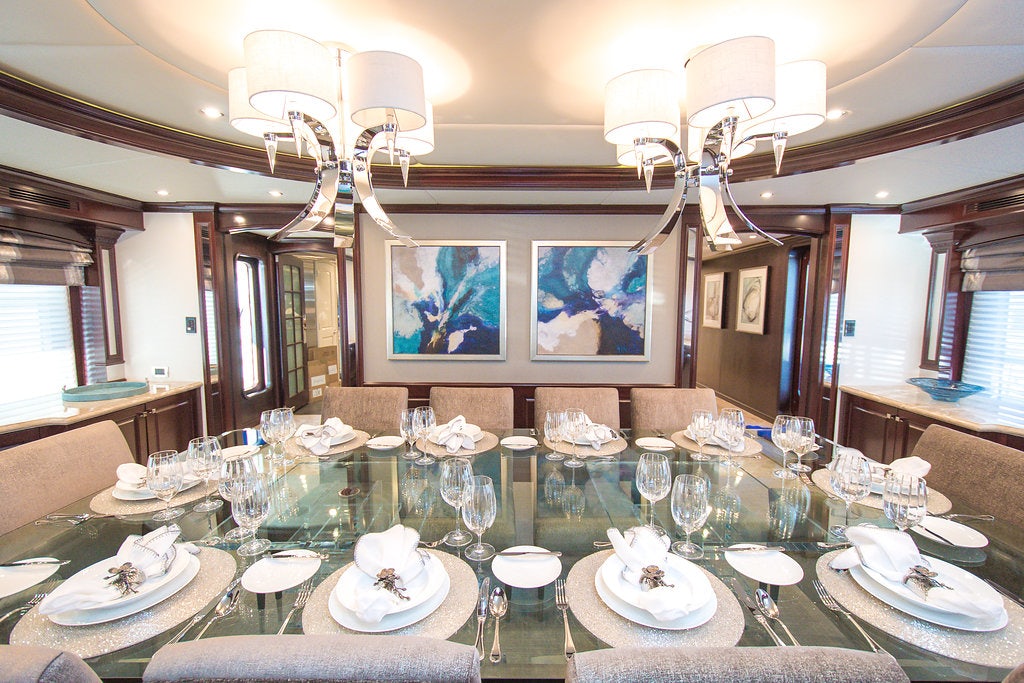 Boasting exceptional outdoor living areas, REBEL’s amenities are expansive for charter guest enjoyment. Take in views as you cruise on the yacht’s massive sunpads whilst sipping a delectable cocktail on the foredeck, socialize on the sundeck and relish time on the water with the yacht’s immense array of tenders and toys. After working up an appetite, enjoy a delectable meal as you dine alfresco.