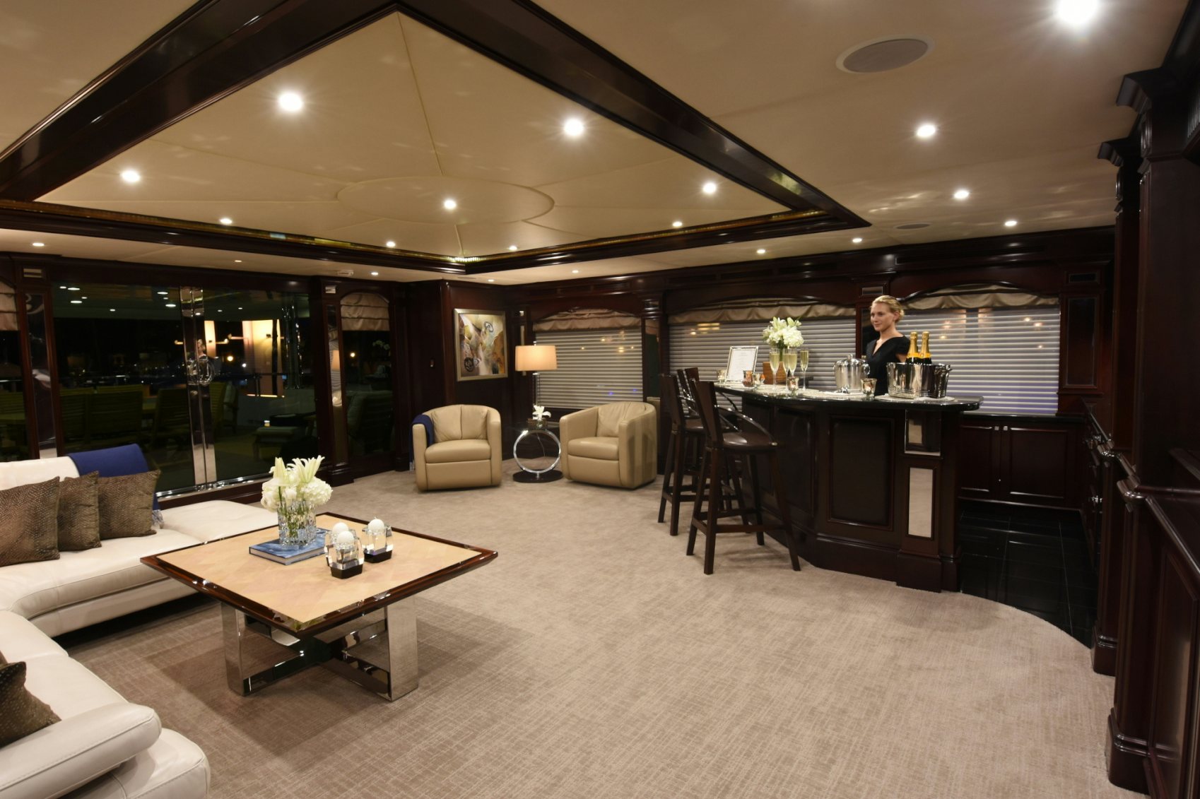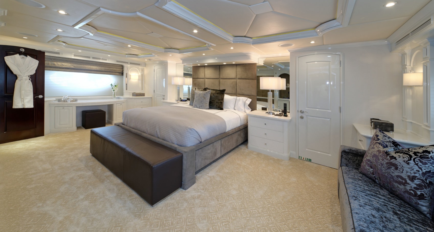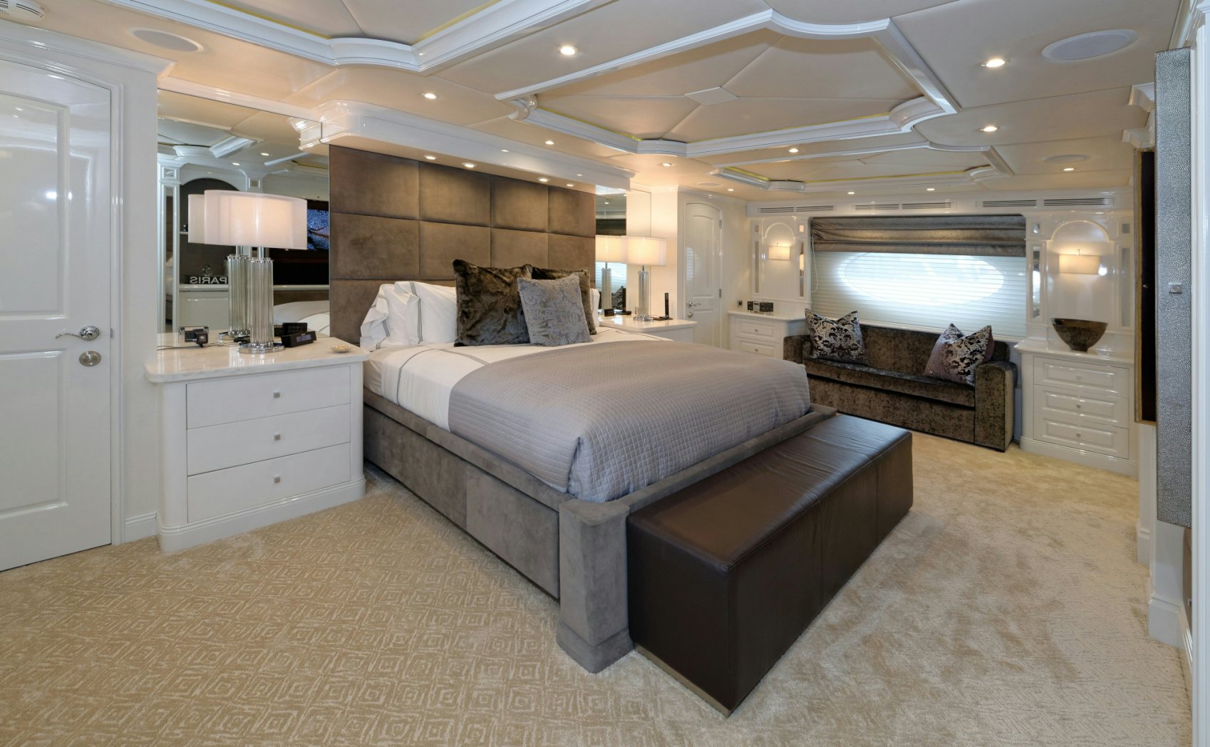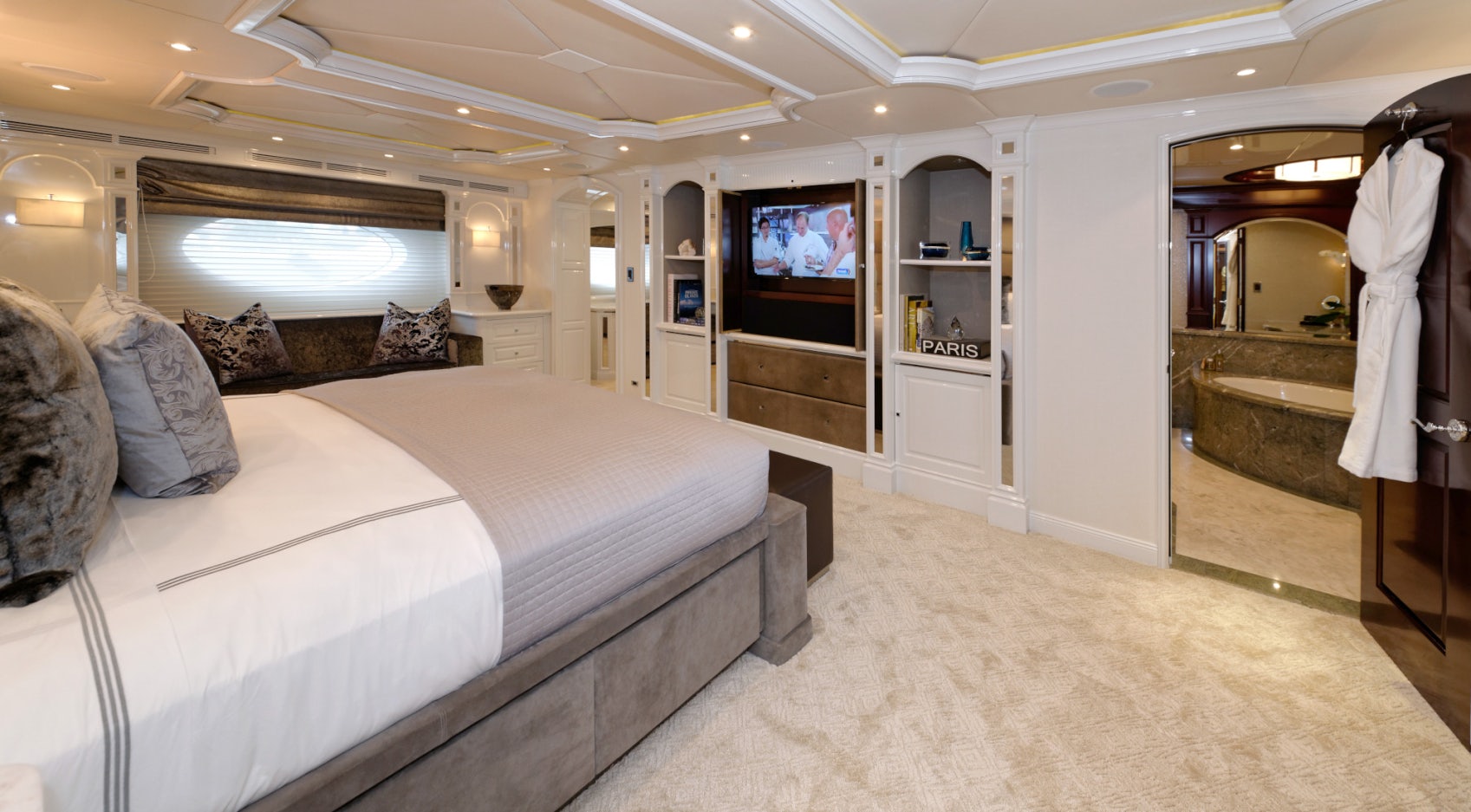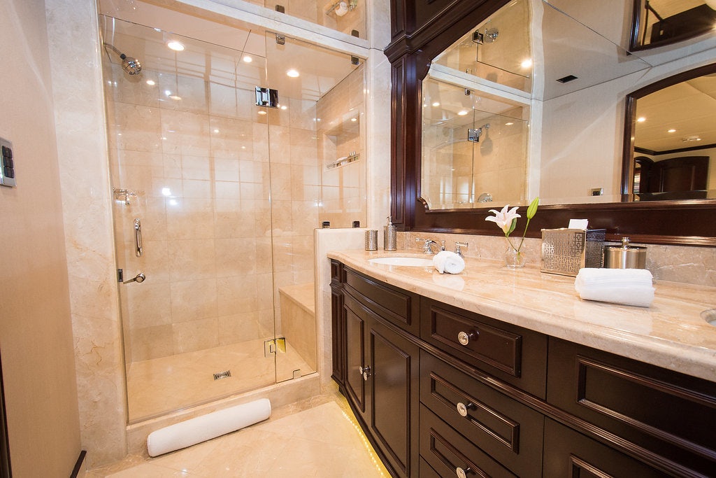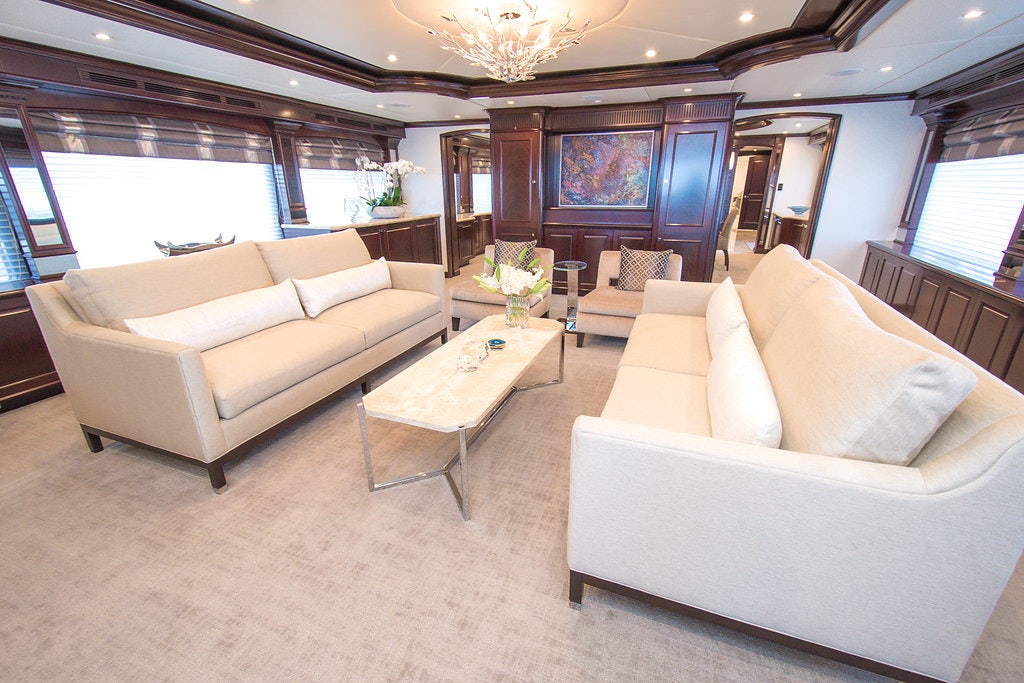 Luxury charter yacht REBEL showcases a modern and elegant interior that has a warm, welcoming ambiance —making charter guests feel at home. REBEL accommodates 10 guests in five sophisticated staterooms. The yacht’s contemporary full-beam master stateroom is a tranquil haven complete with large windows that provide stunning views of your destination and a spacious his-hers en-suite bath with a central steam shower and Jacuzzi tub. Led by a spectacular sculpted stairwell, the yacht’s below deck guest staterooms include three kings and a twin — each stateroom is complete with luxurious amenities and its own en-suite bath with Hermes bath products.