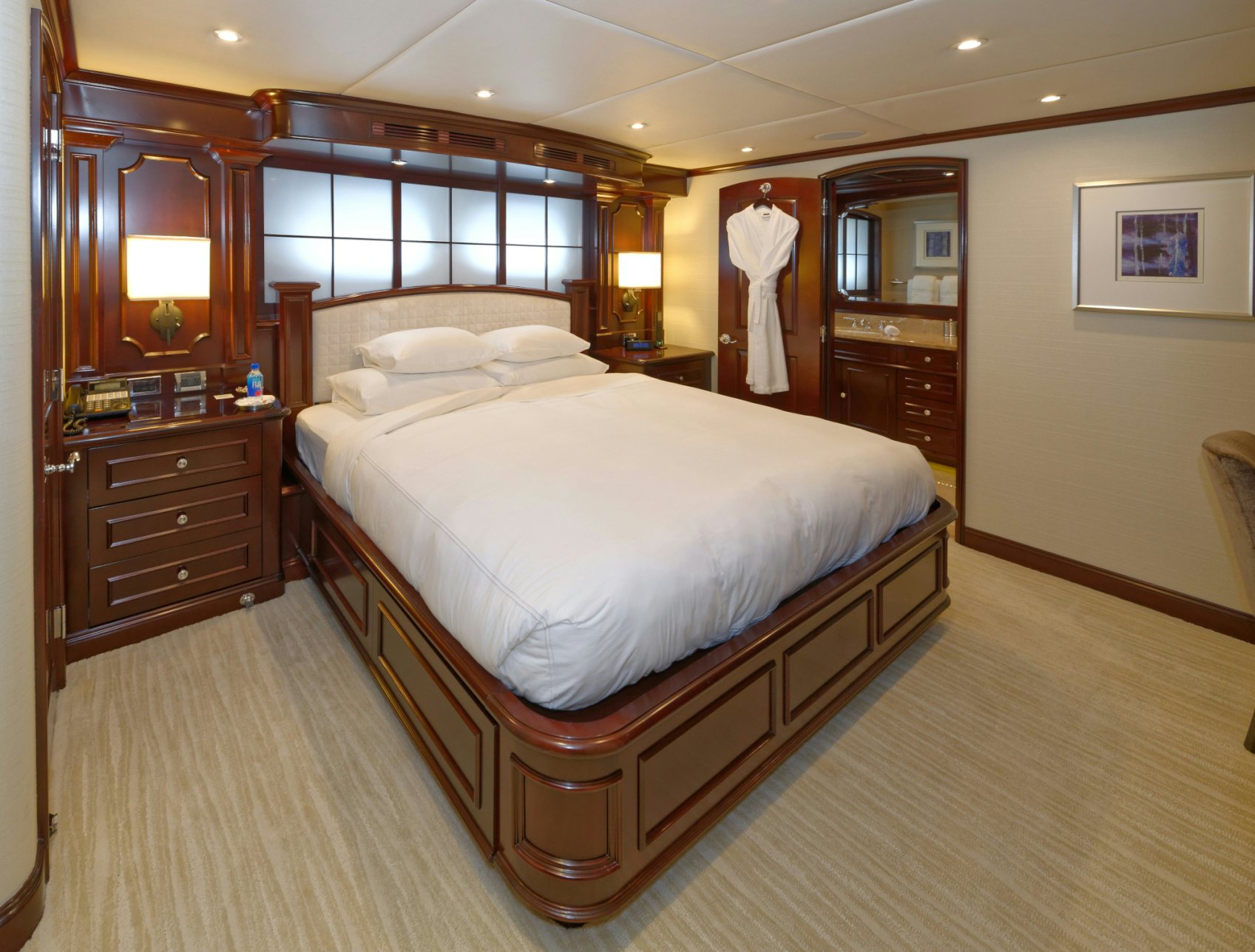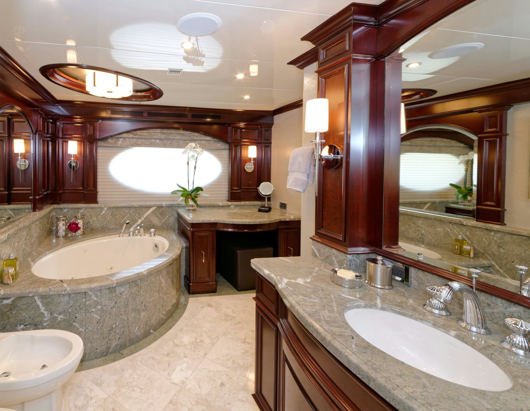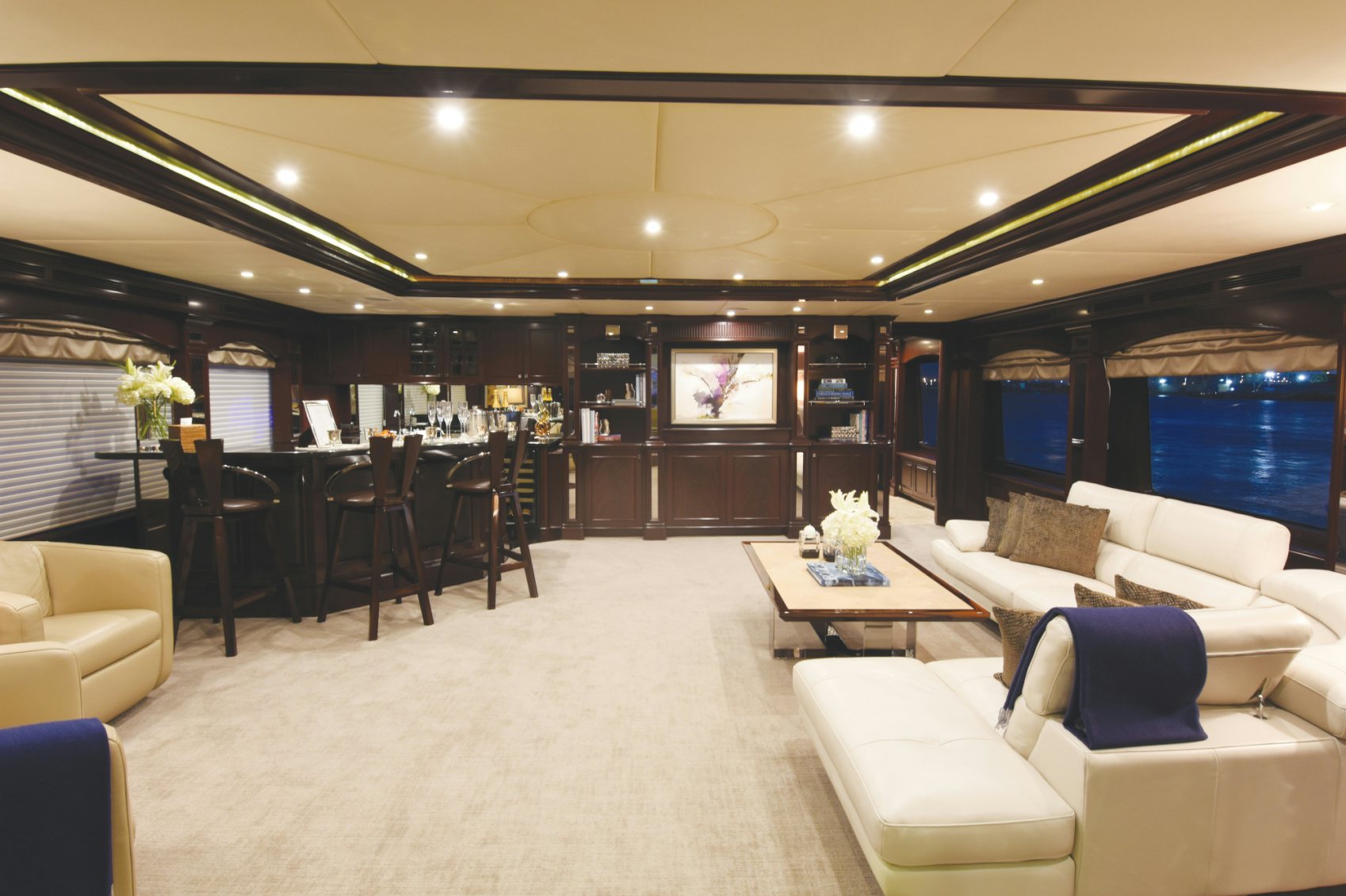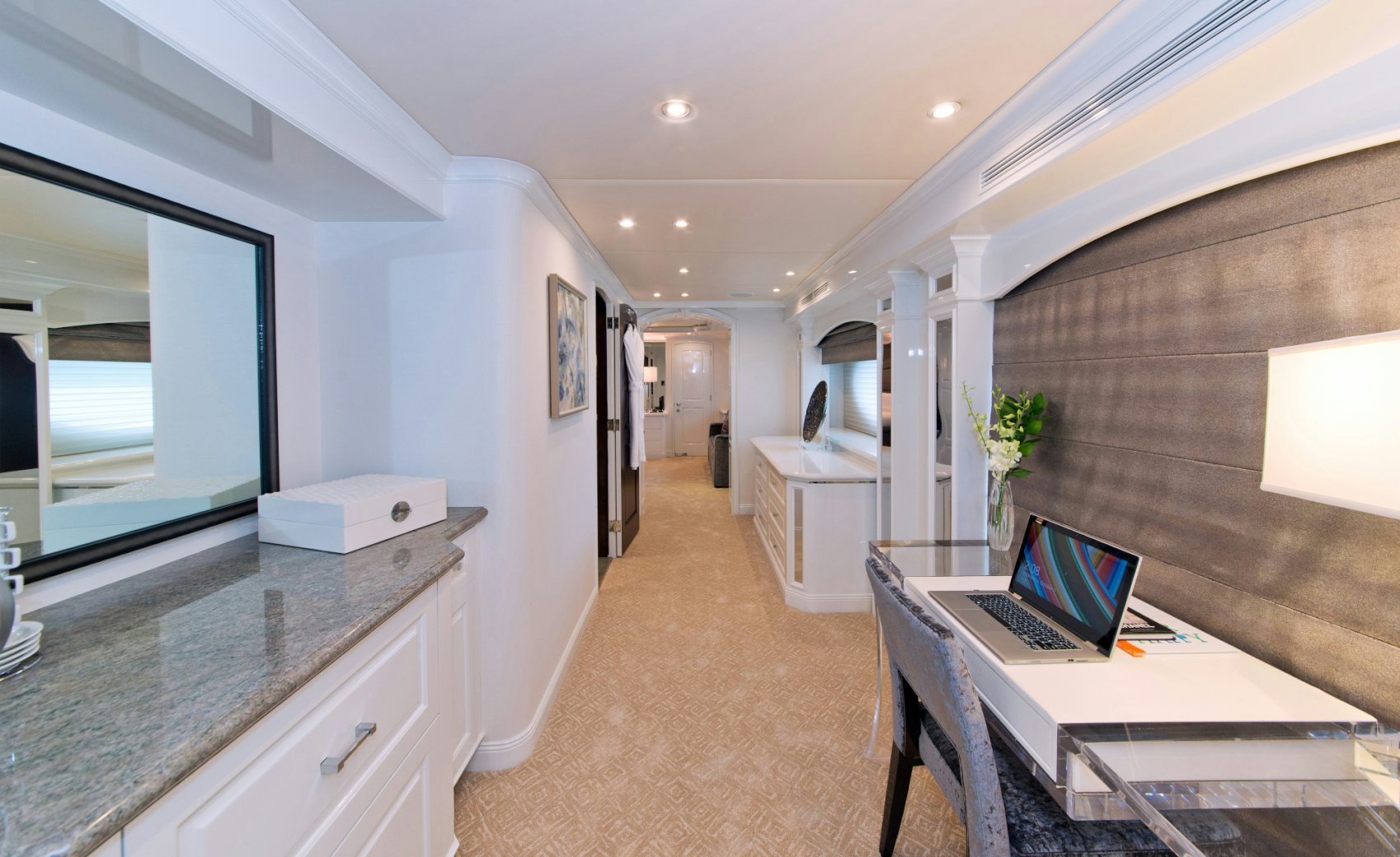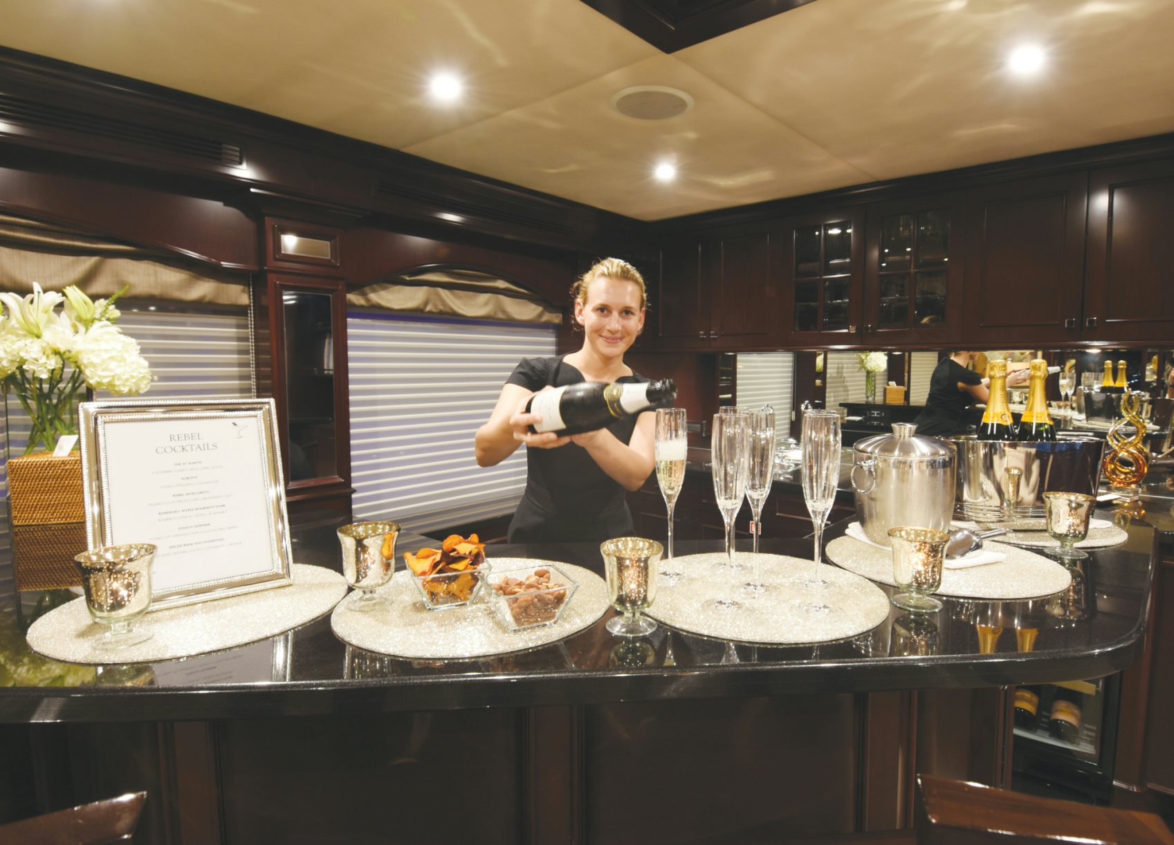 Luxury charter yacht REBEL showcases a modern and elegant interior that has a warm, welcoming ambiance —making charter guests feel at home. REBEL accommodates 10 guests in five sophisticated staterooms. The yacht’s contemporary full-beam master stateroom is a tranquil haven complete with large windows that provide stunning views of your destination and a spacious his-hers en-suite bath with a central steam shower and Jacuzzi tub. Led by a spectacular sculpted stairwell, the yacht’s below deck guest staterooms include three kings and a twin — each stateroom is complete with luxurious amenities and its own en-suite bath with Hermes bath products.