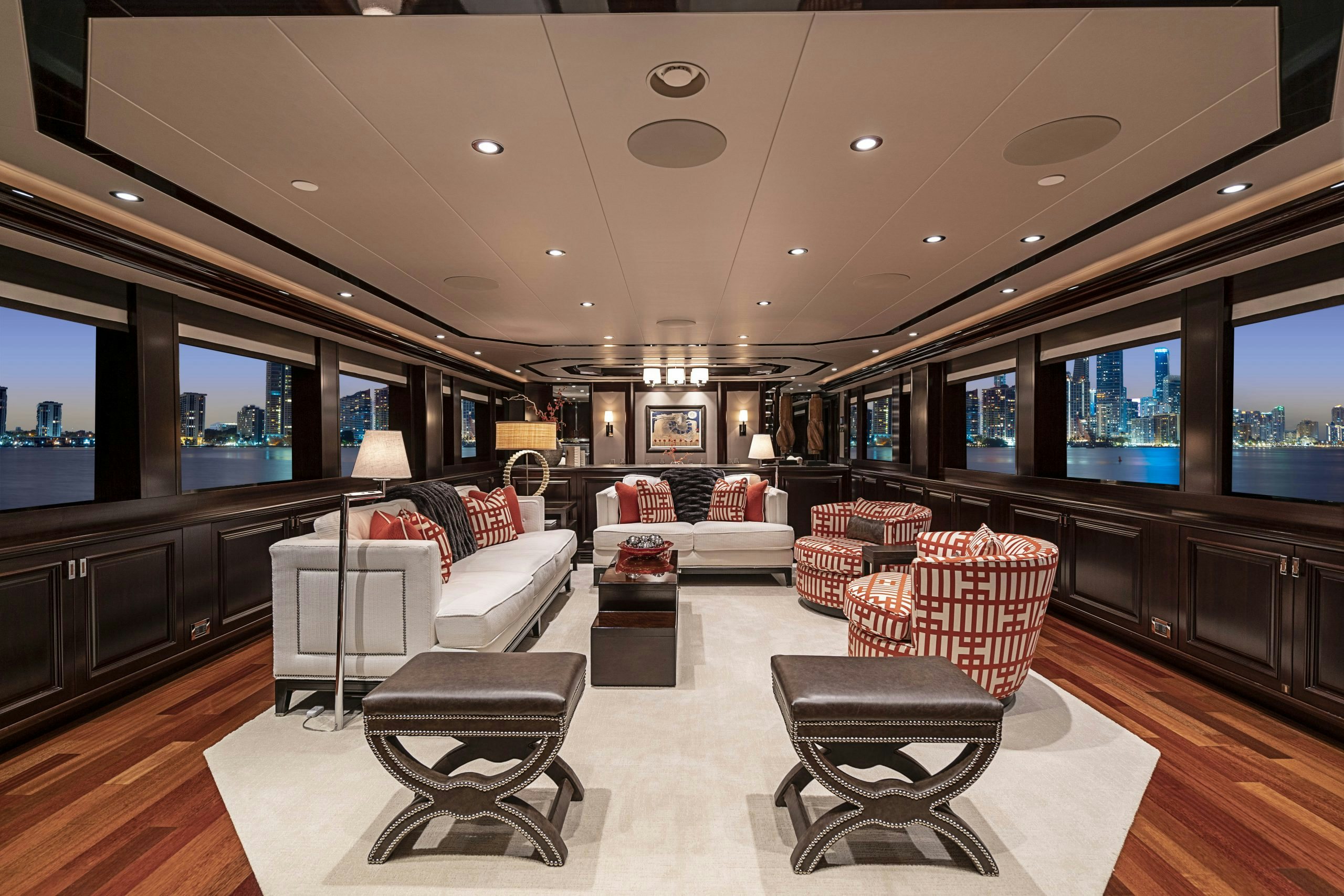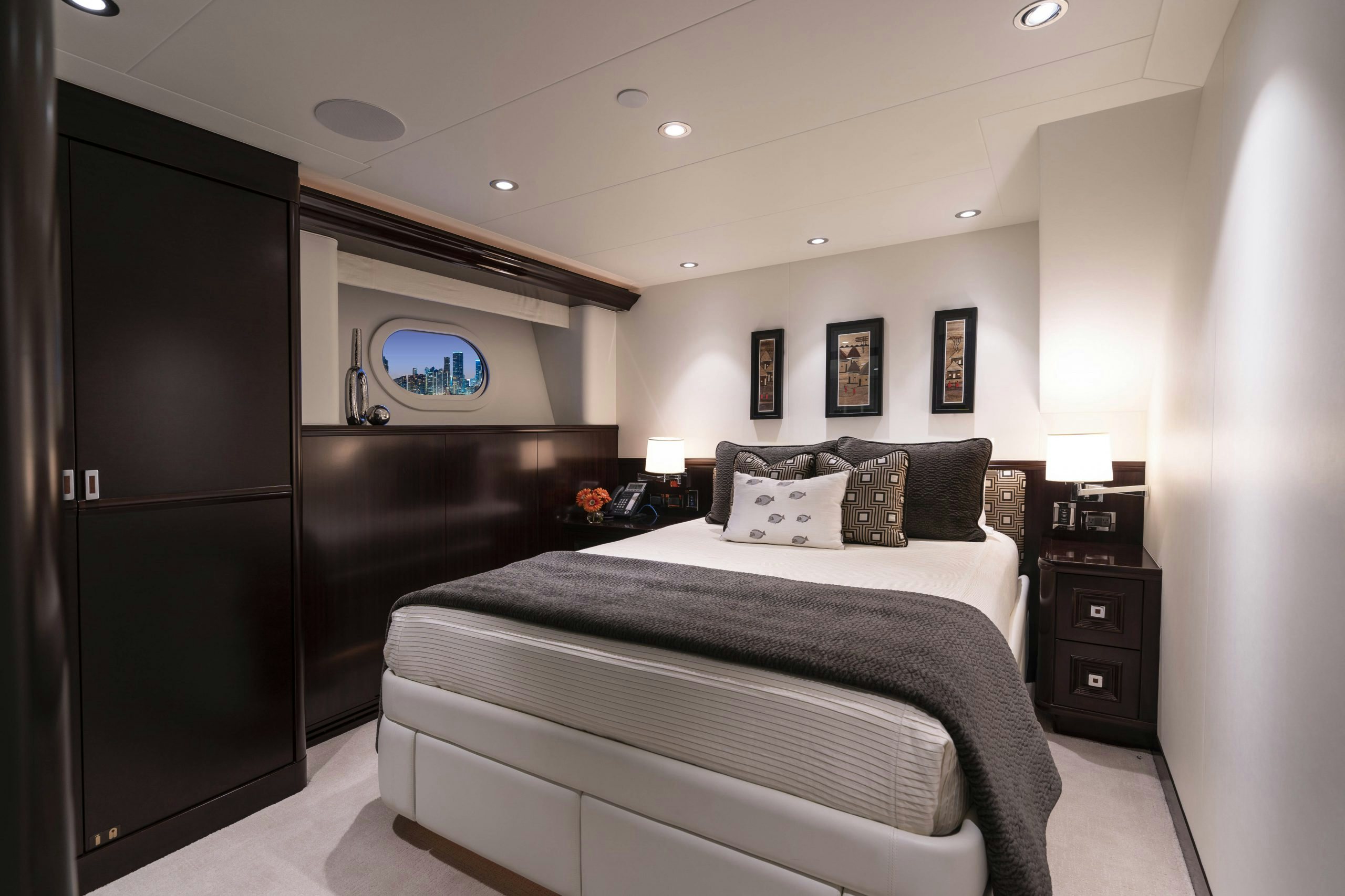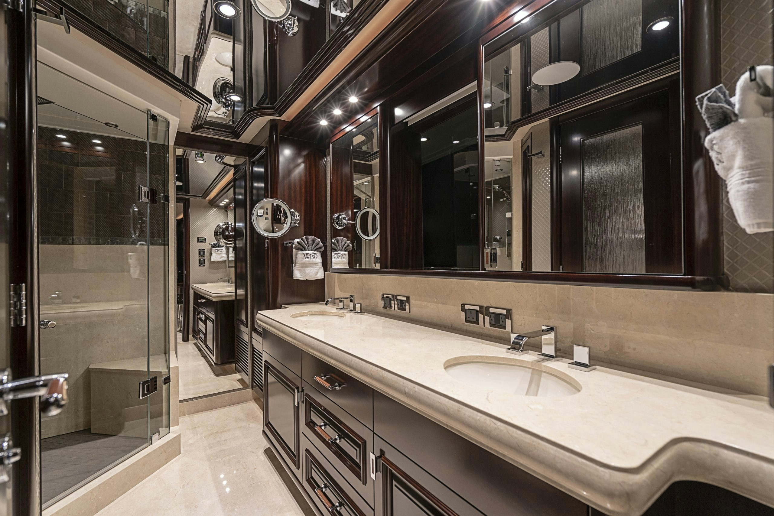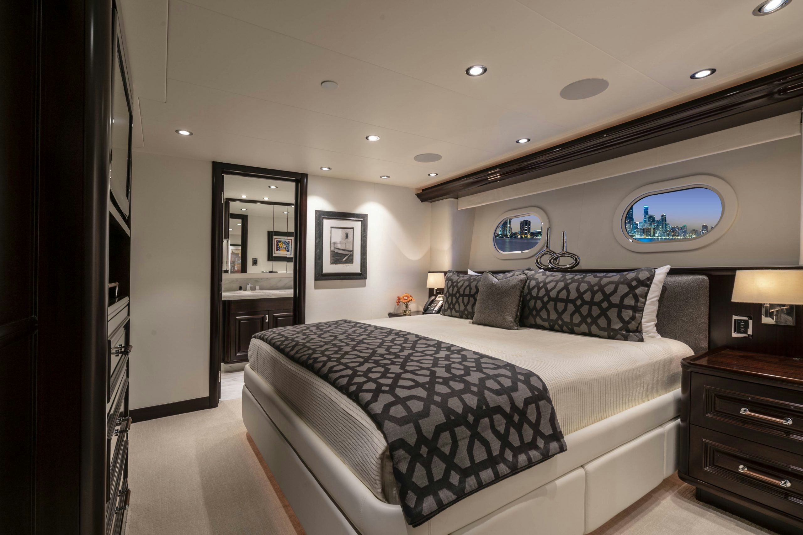 The luxury superyacht showcases a welcoming interior that will make guests feel at home. The space features an exquisite chic décor with fine fabrics and beautiful hardwood floors. The charter yacht accommodates 10 guests in the superior comfort of five beautifully appointed staterooms. Each stateroom is a haven for guests to rest their heads after a fun day on the water. Located on the main deck, RELEASE ME’s master suite is a private retreat with a plush king-size bed, en-suite bath and private office. The additional staterooms, located on the lower deck, includes two VIP king-bed staterooms, one queen-bed stateroom, and a twin-bed stateroom. All staterooms have en-suite bathrooms as well as entertainment centers.