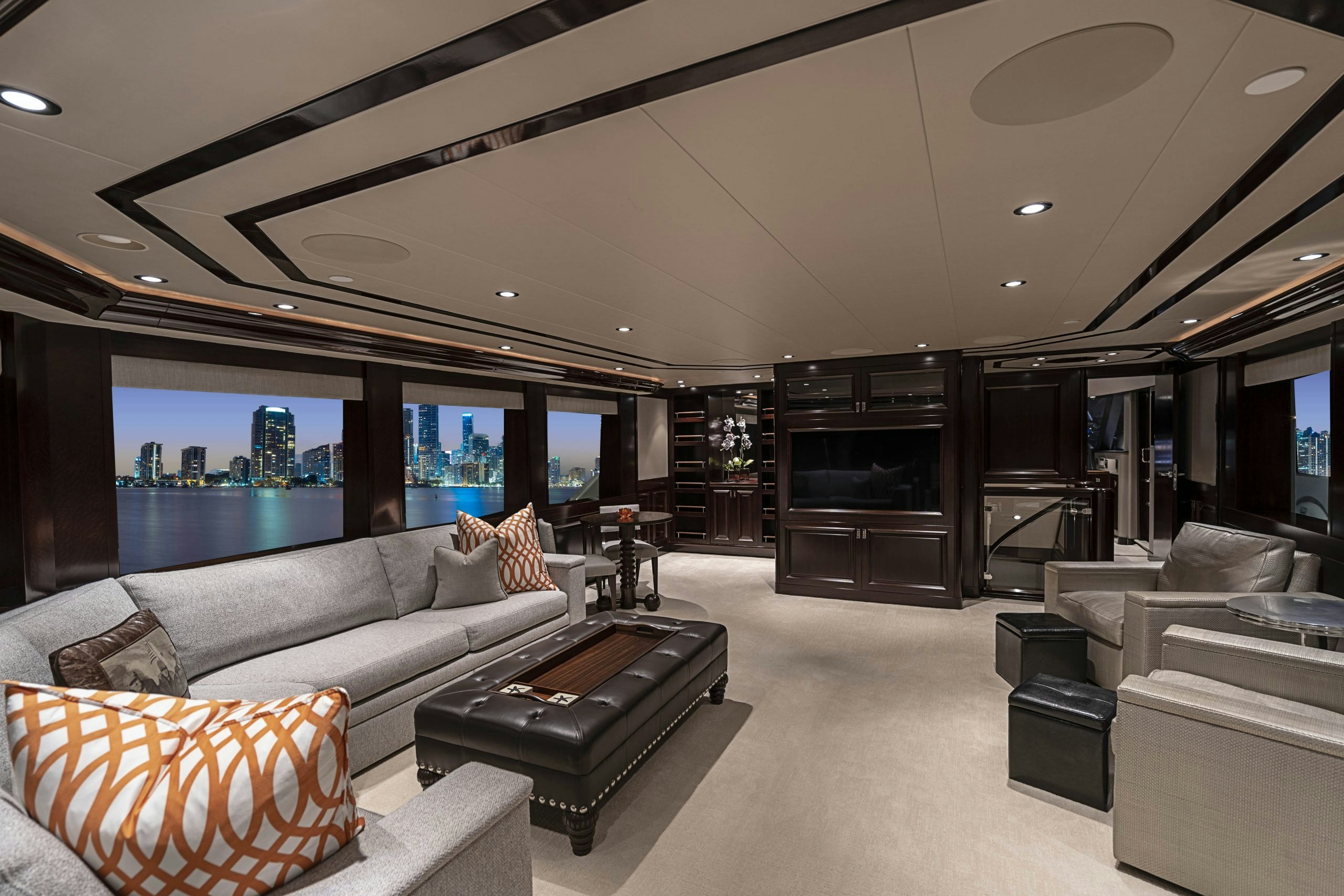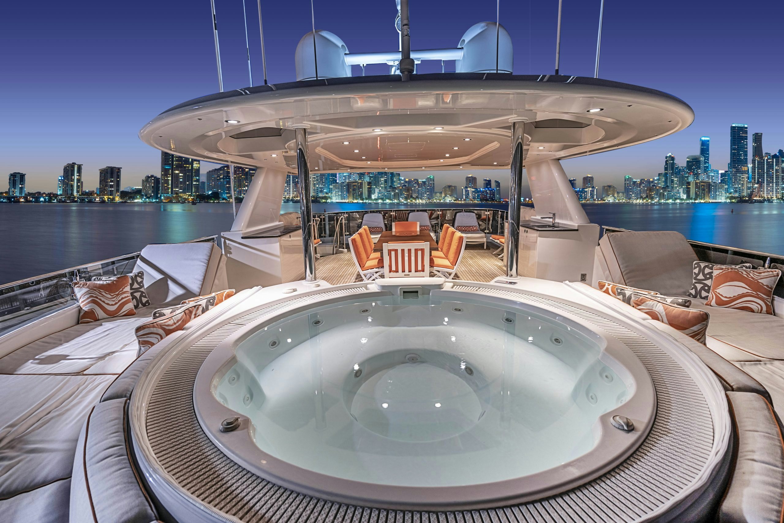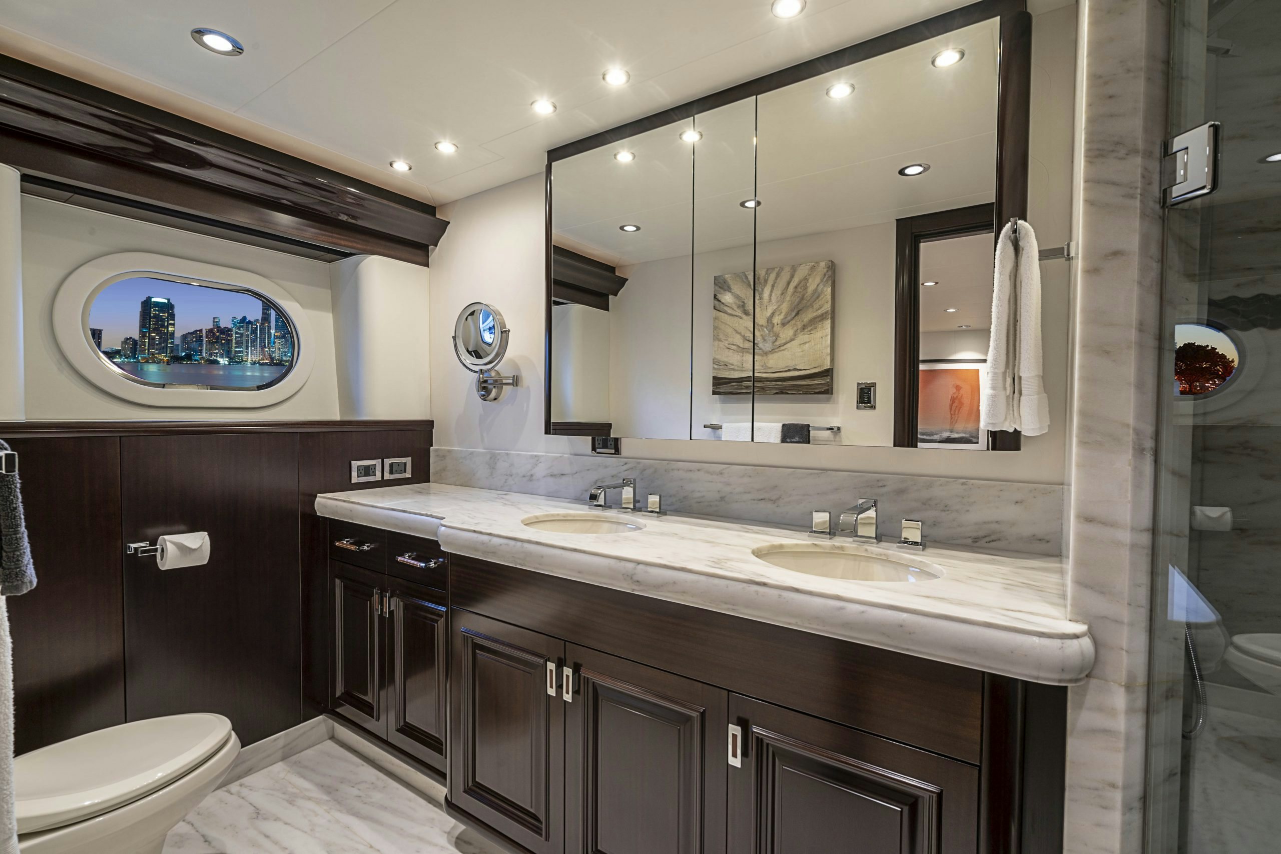 The luxury superyacht showcases a welcoming interior that will make guests feel at home. The space features an exquisite chic décor with fine fabrics and beautiful hardwood floors. The charter yacht accommodates 10 guests in the superior comfort of five beautifully appointed staterooms. Each stateroom is a haven for guests to rest their heads after a fun day on the water. Located on the main deck, RELEASE ME’s master suite is a private retreat with a plush king-size bed, en-suite bath and private office. The additional staterooms, located on the lower deck, includes two VIP king-bed staterooms, one queen-bed stateroom, and a twin-bed stateroom. All staterooms have en-suite bathrooms as well as entertainment centers.