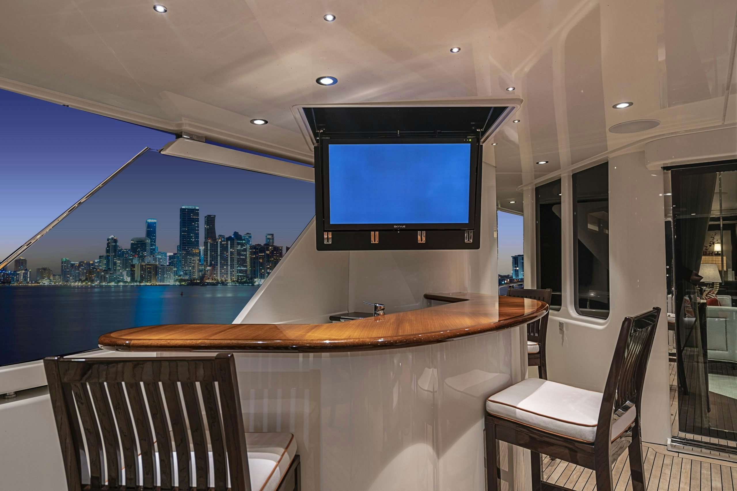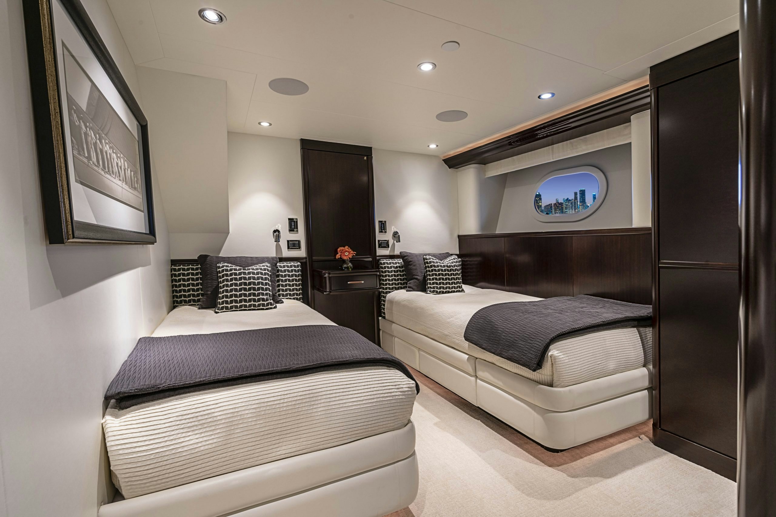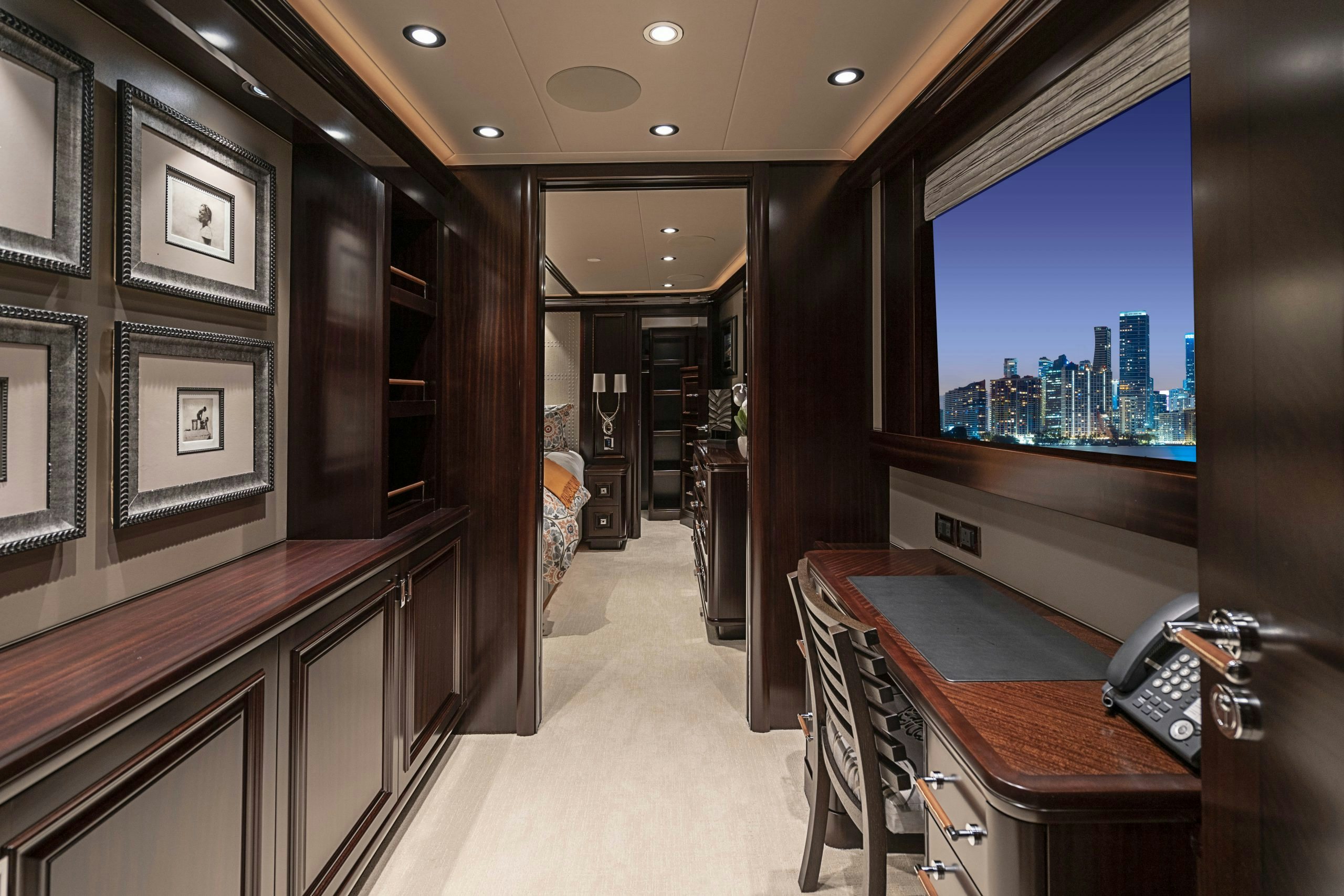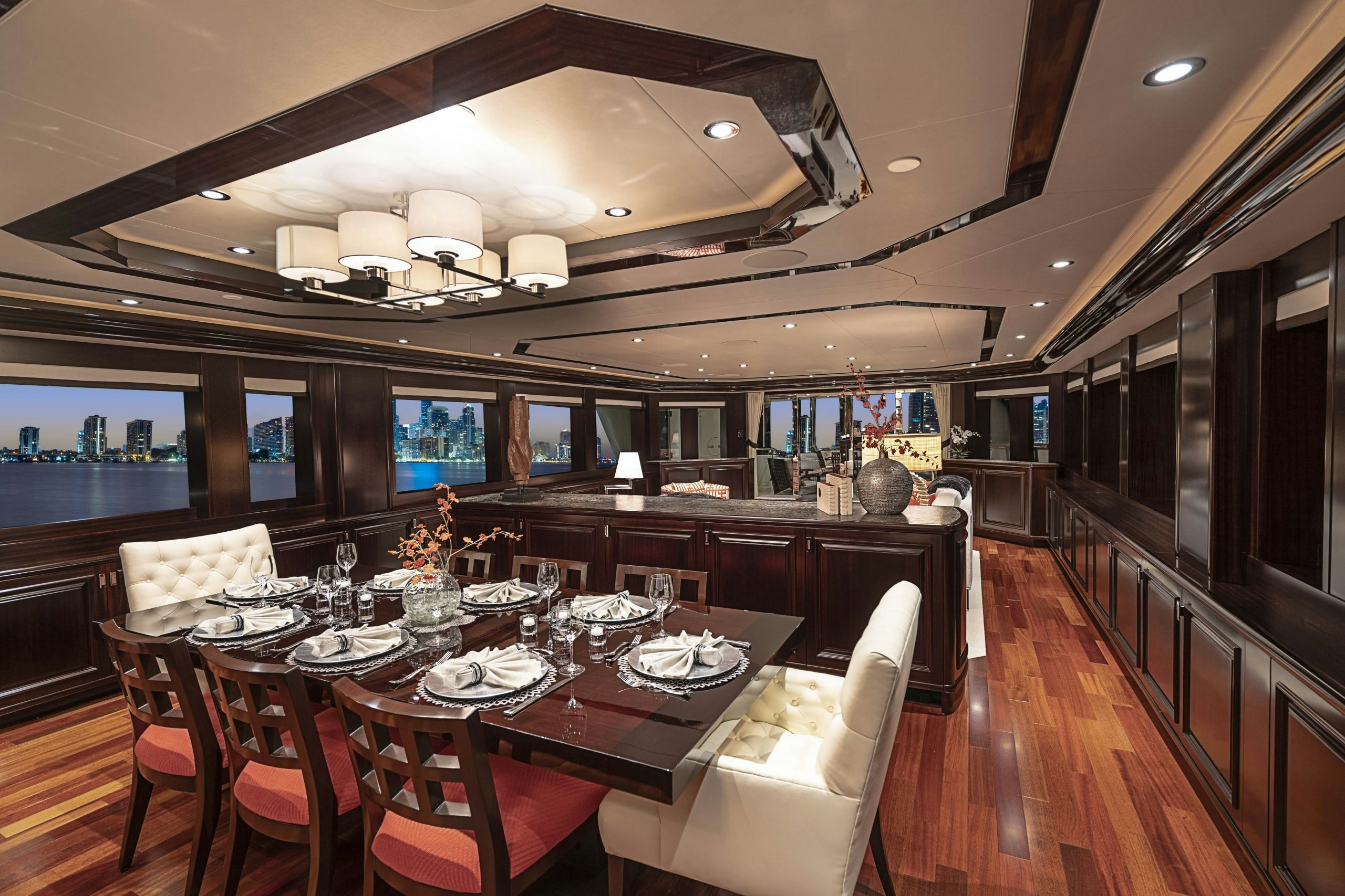 The luxury superyacht showcases a welcoming interior that will make guests feel at home. The space features an exquisite chic décor with fine fabrics and beautiful hardwood floors. The charter yacht accommodates 10 guests in the superior comfort of five beautifully appointed staterooms. Each stateroom is a haven for guests to rest their heads after a fun day on the water. Located on the main deck, RELEASE ME’s master suite is a private retreat with a plush king-size bed, en-suite bath and private office. The additional staterooms, located on the lower deck, includes two VIP king-bed staterooms, one queen-bed stateroom, and a twin-bed stateroom. All staterooms have en-suite bathrooms as well as entertainment centers.