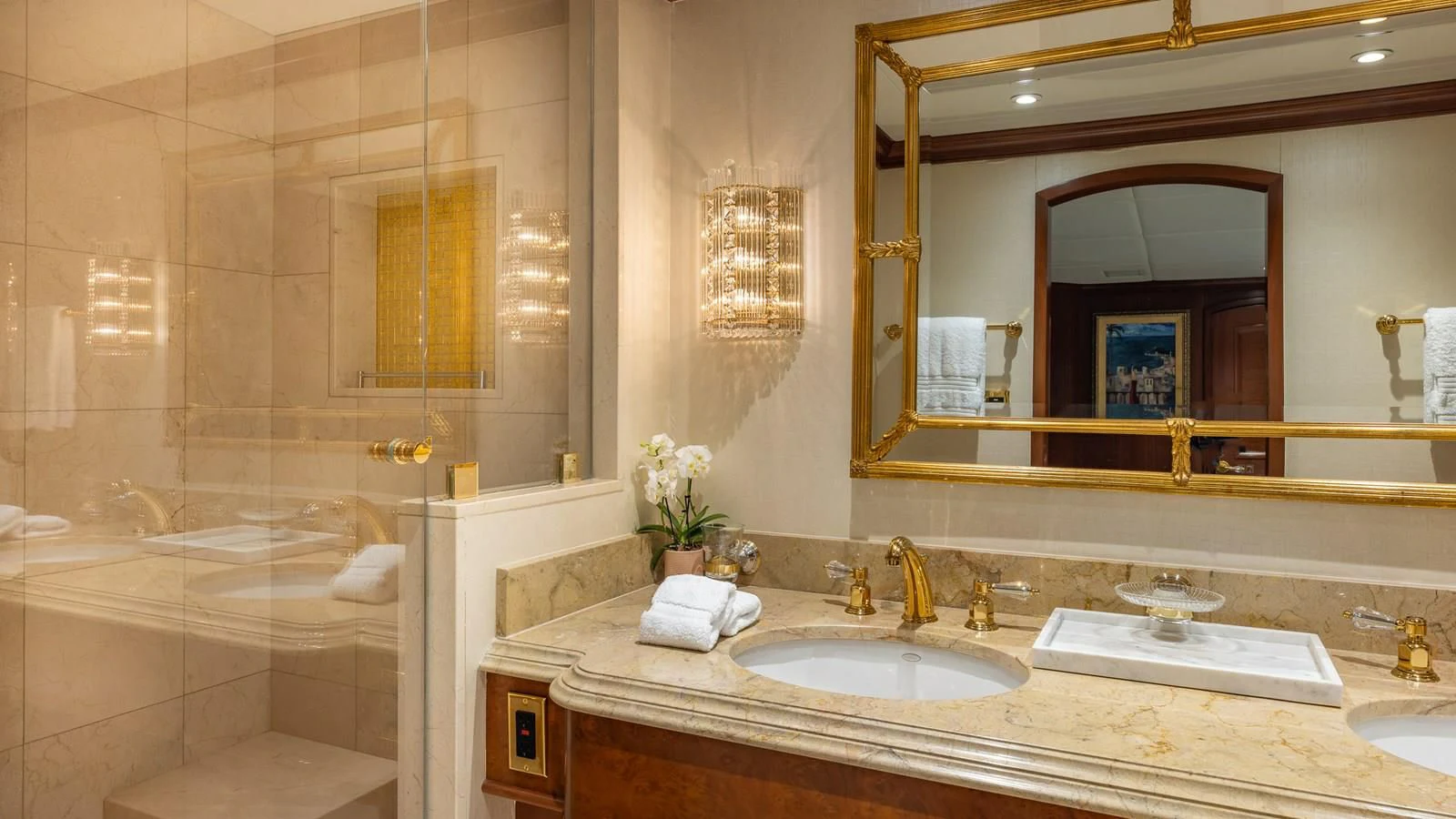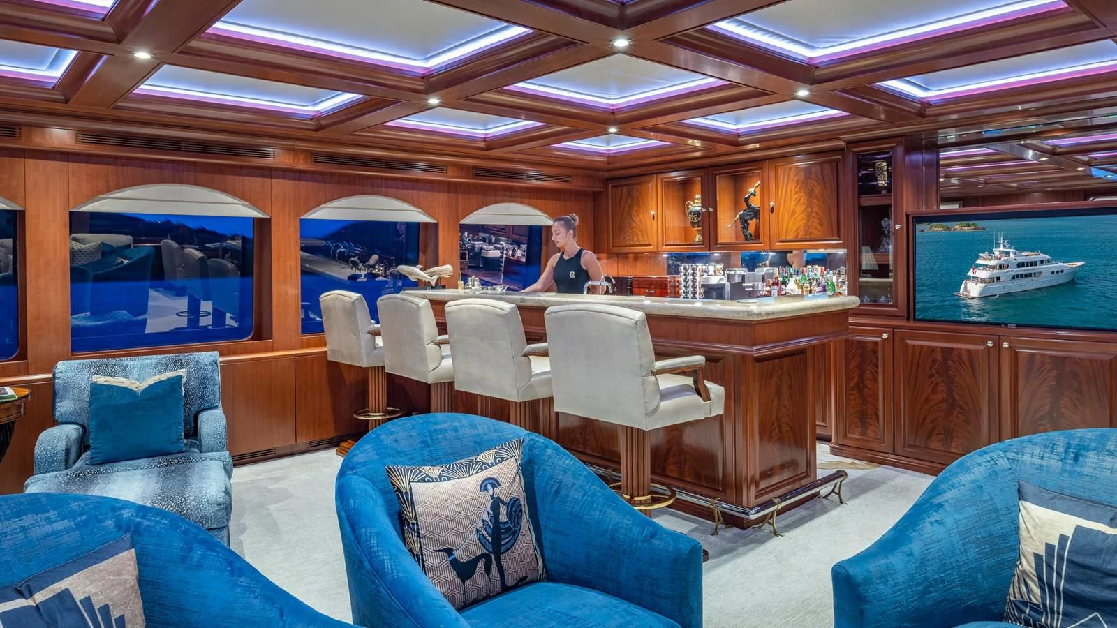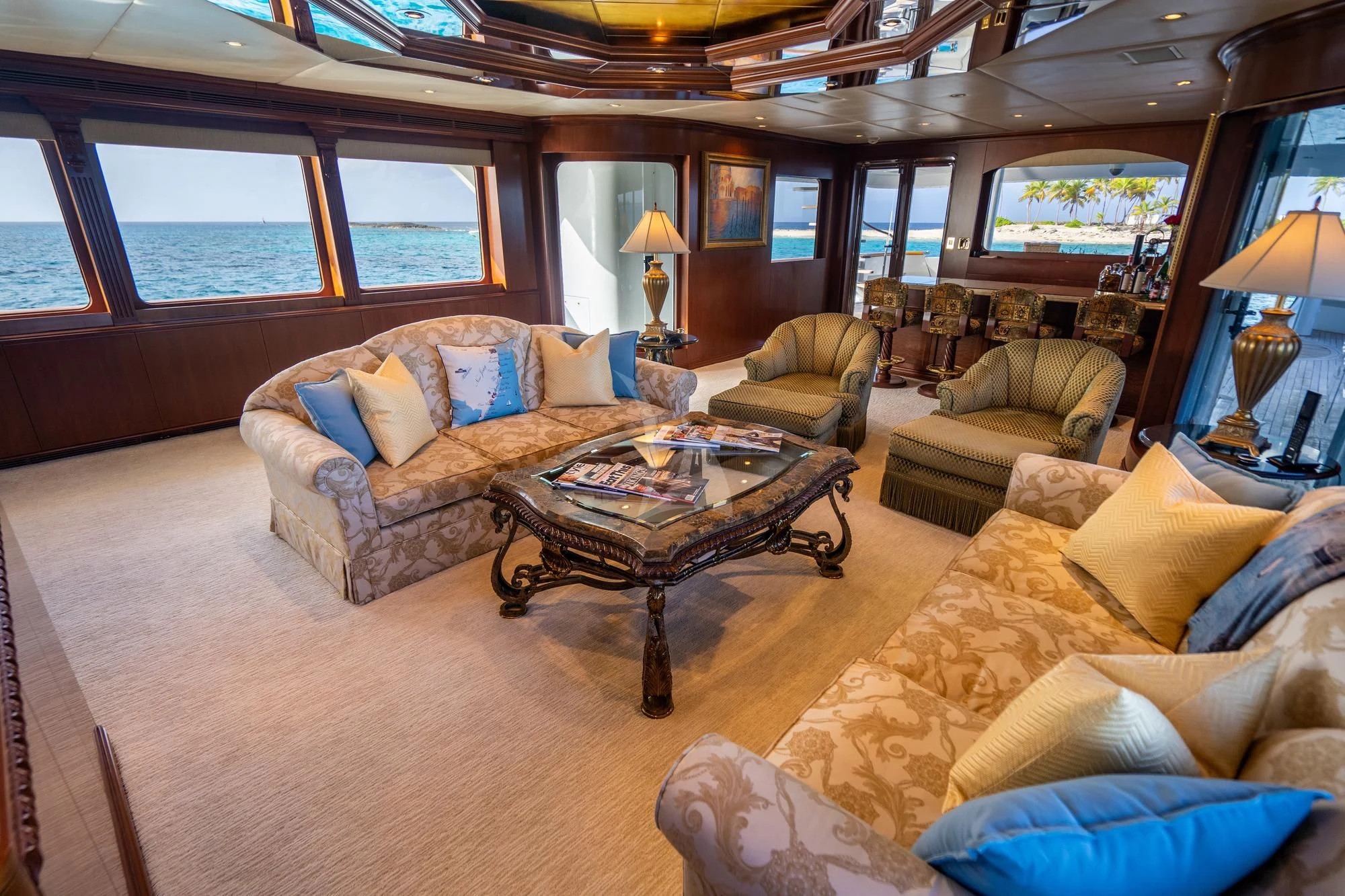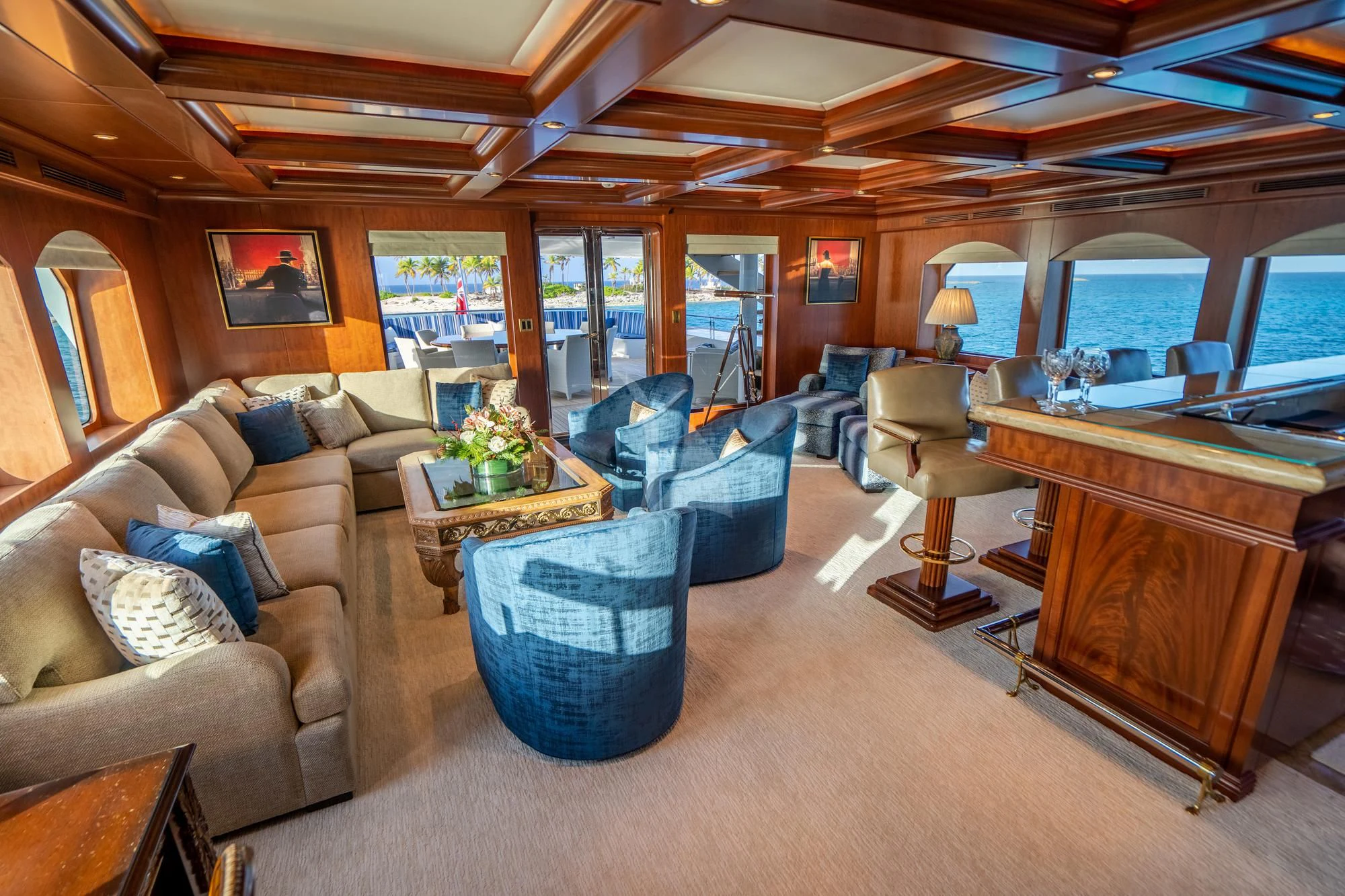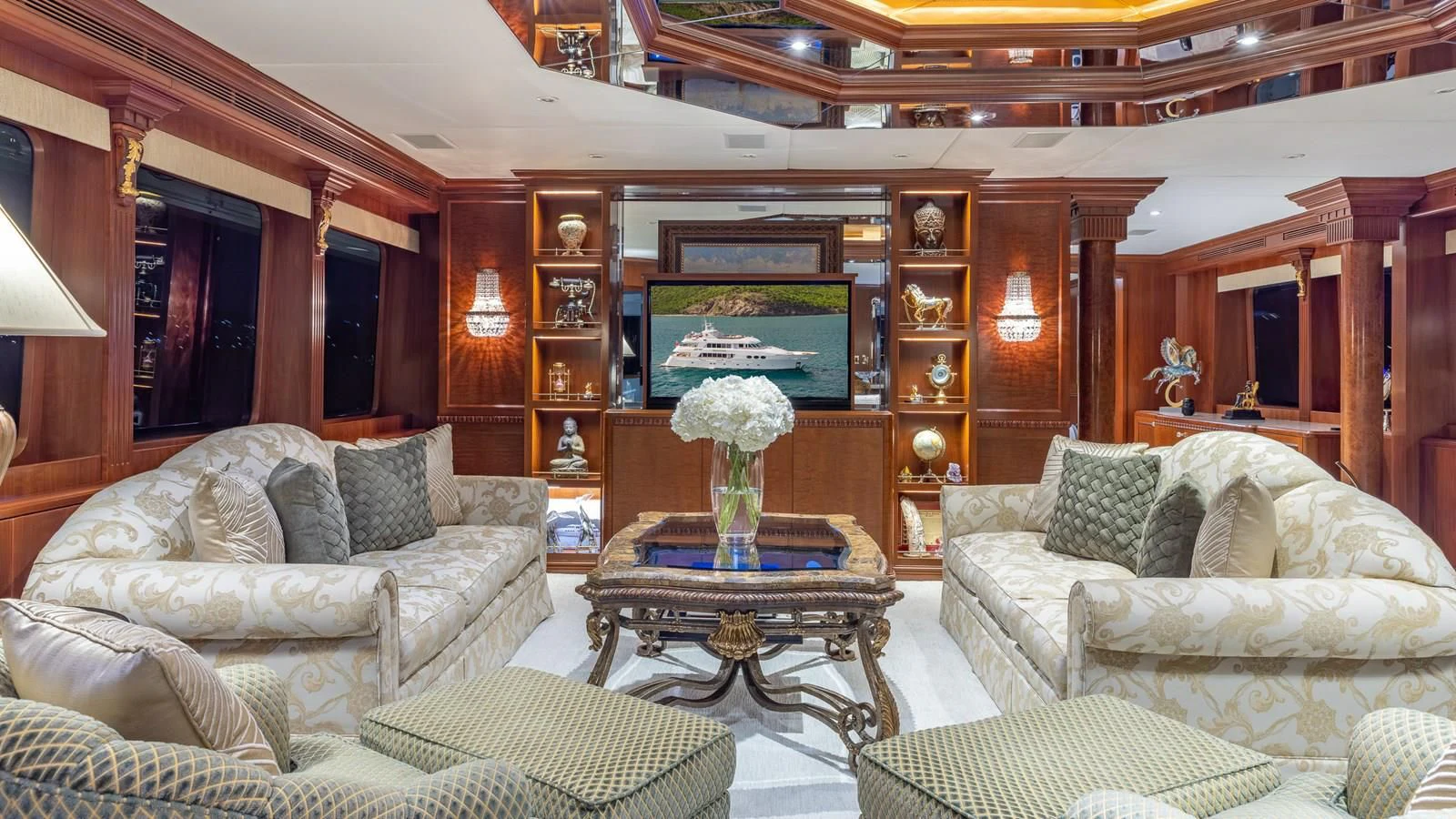 RELENTLESS’s George Paturzo interiors are a gorgeous work of traditional design. The elegant foyer and grand staircase set the scene with beautiful mahogany paneling and art deco-inspired touches. The main salon is elegant with stylish but comfortable sofas and a marble-topped bar lit with natural light from the large picture windows and glass doors. The lounge area flows seamlessly through to the beautiful dining room with lavish cream upholstery, gold leaf inserts, Murano crystal fixtures and seating for eight. Upstairs, the vast sky lounge is a real show stopper with a traditional wooden desk, a marble-topped bar, coffered ceilings and custom upholstered tapestry sofas. State-of-the-art entertainment and incredible views make this the place for entertaining well into the night.
