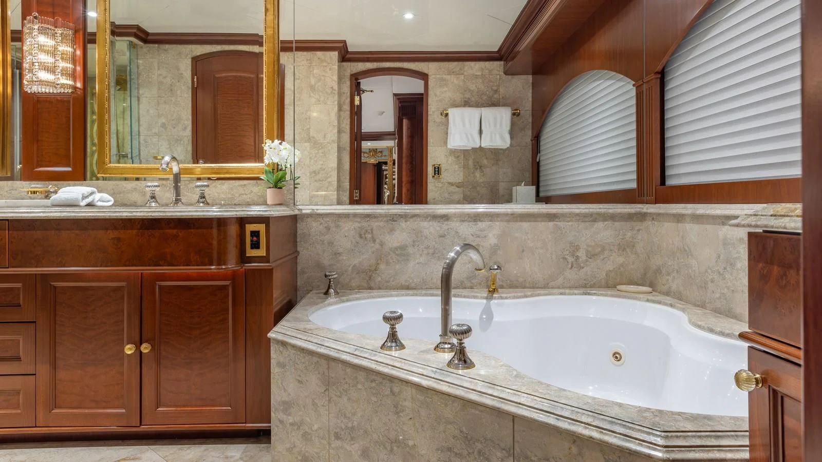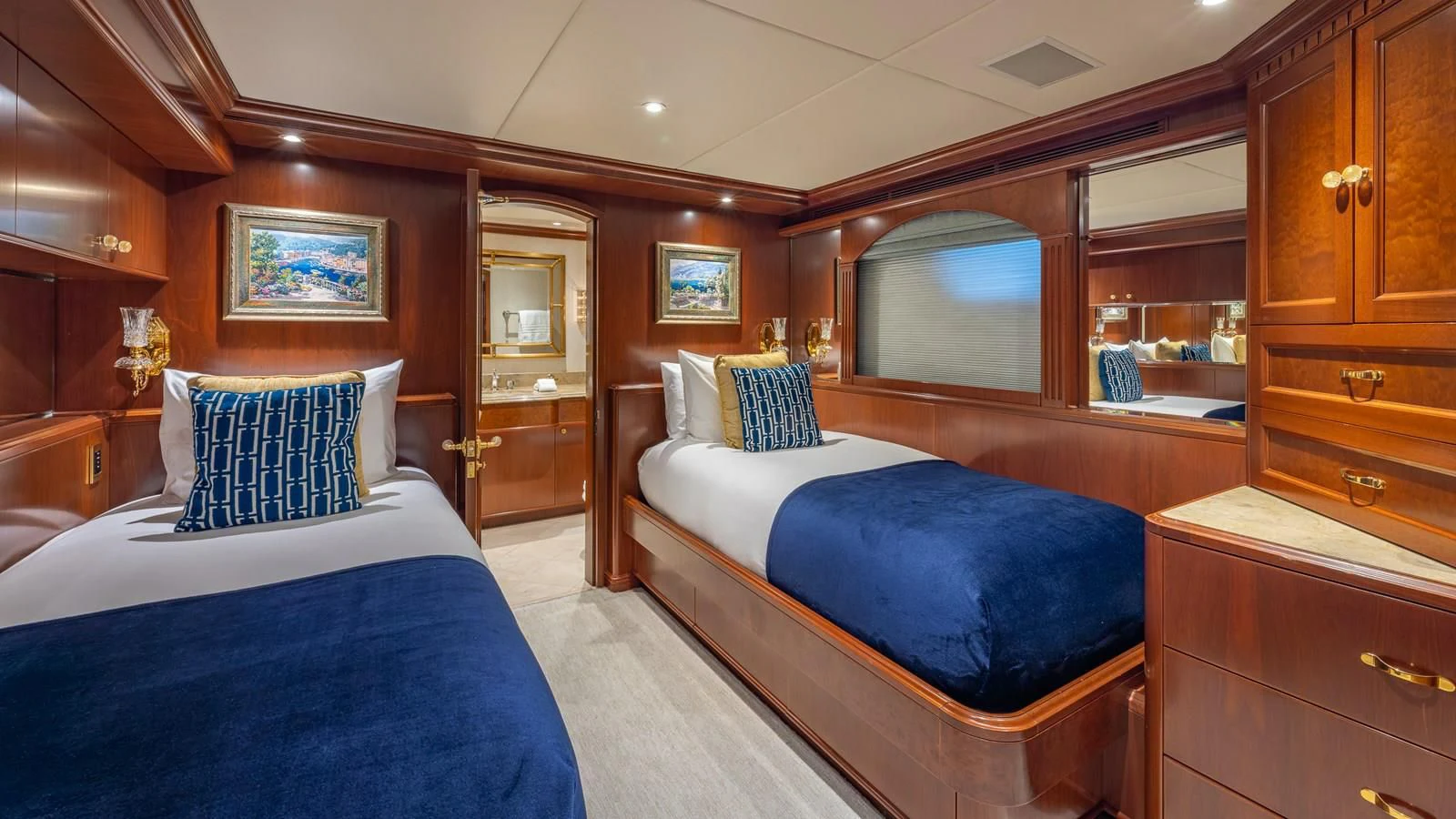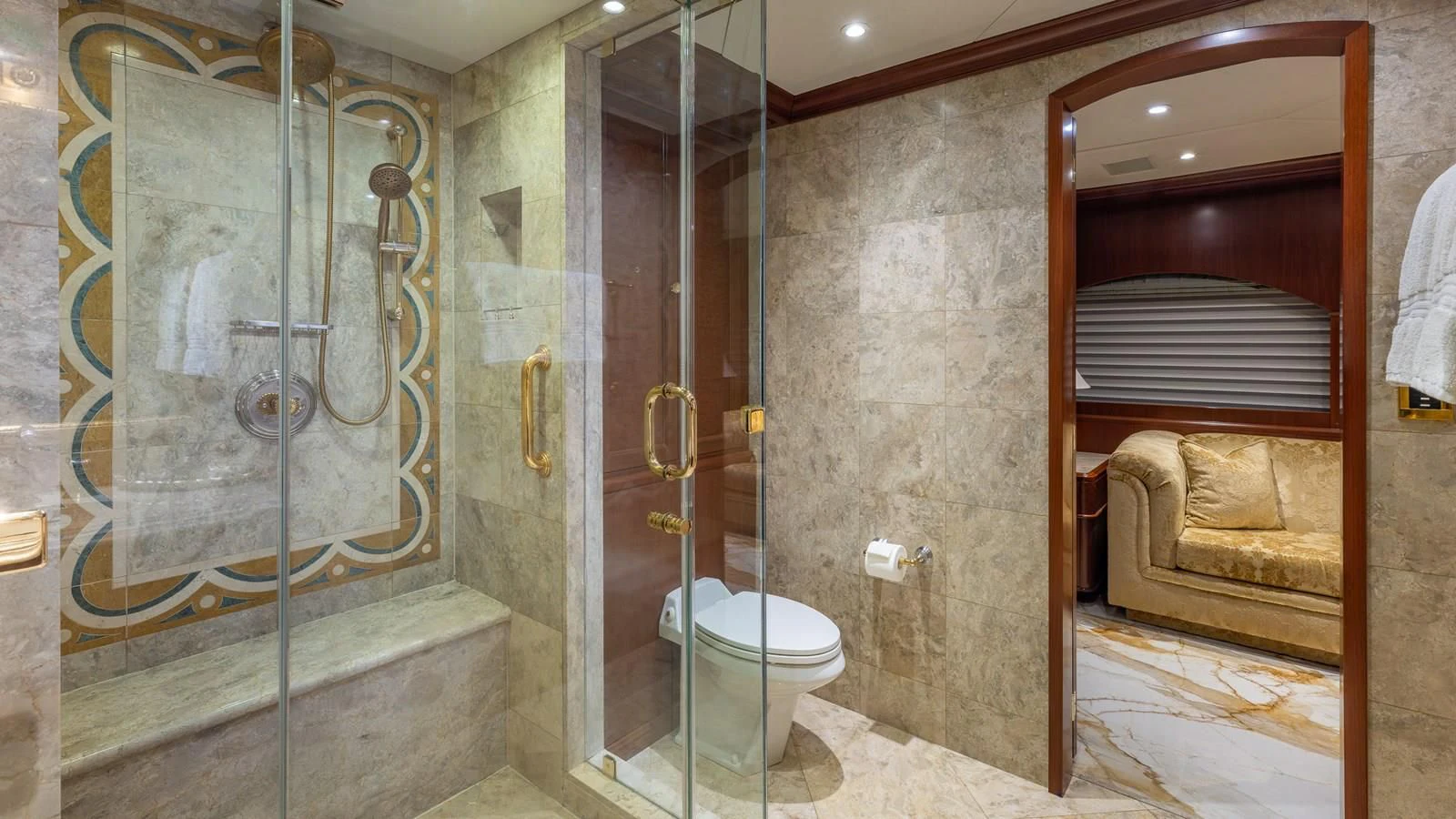 RELENTLESS features five opulent staterooms for up to 10 guests lavishly decorated with rich mahogany and with intricate use of Royal Oyster marble in the stunning en-suite bathrooms. The main deck master stateroom takes up the full width of the yacht to create a luxurious private retreat. A private sitting area and a massive his and hers bathroom with a Jacuzzi tub are found in this space. Four additional staterooms are situated on the lower deck and include two generous king staterooms, two queens and a twin cabin all with large closets for storage and gorgeous en-suite bathrooms.