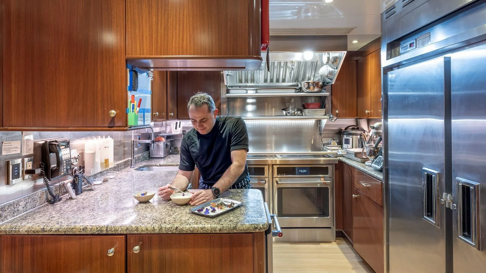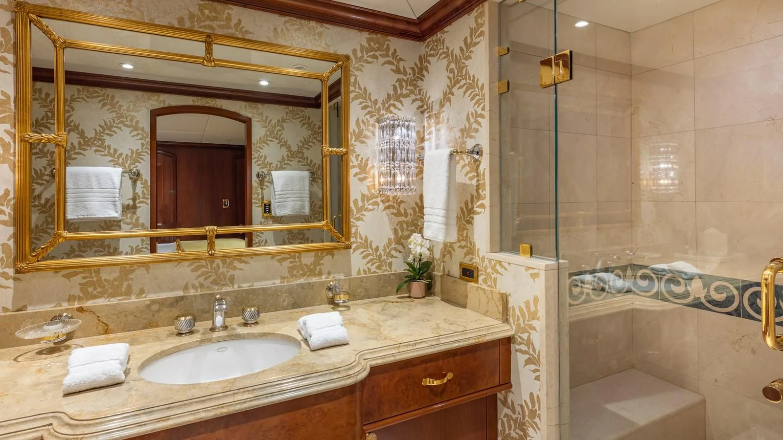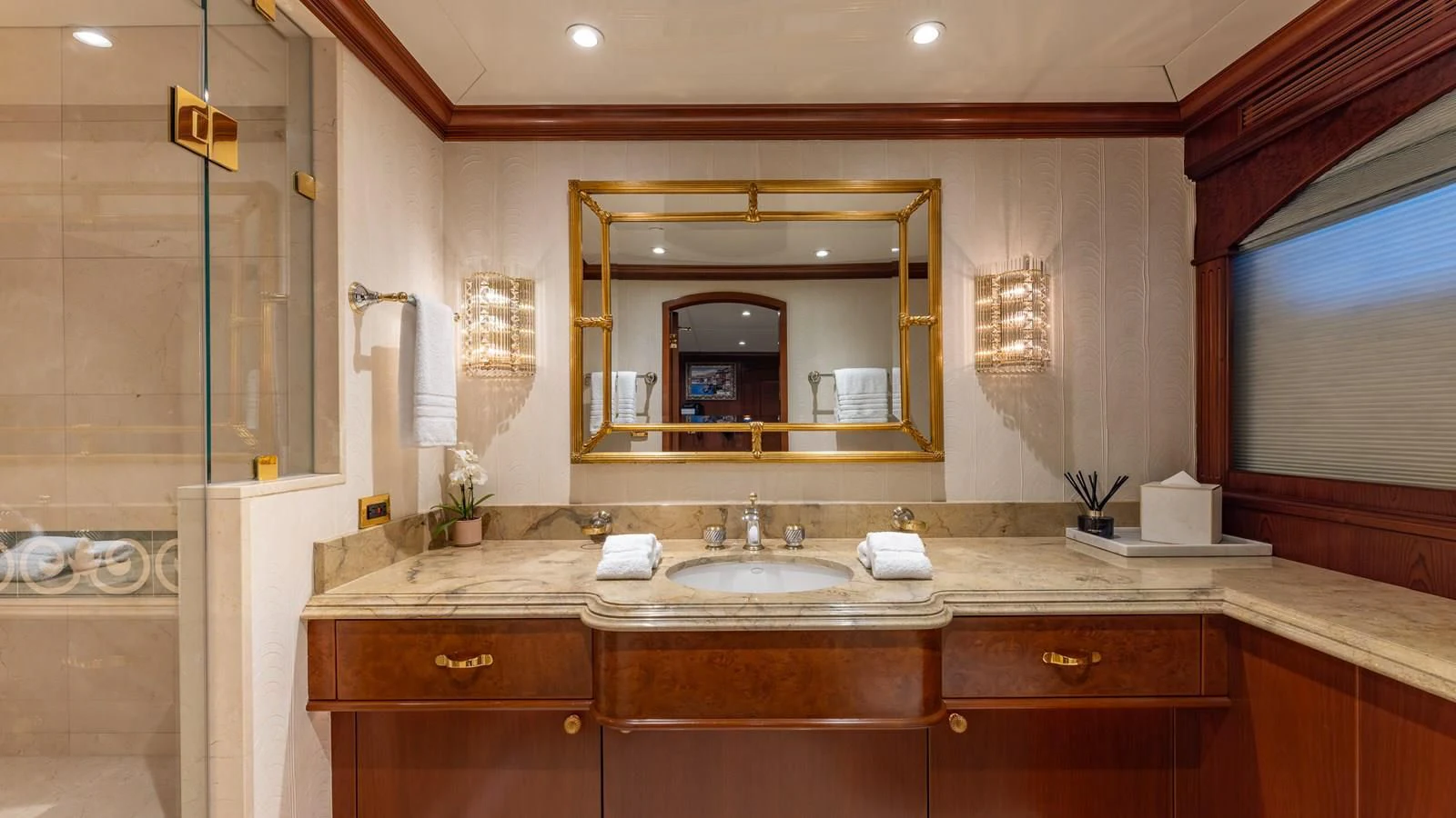 RELENTLESS features five opulent staterooms for up to 10 guests lavishly decorated with rich mahogany and with intricate use of Royal Oyster marble in the stunning en-suite bathrooms. The main deck master stateroom takes up the full width of the yacht to create a luxurious private retreat. A private sitting area and a massive his and hers bathroom with a Jacuzzi tub are found in this space. Four additional staterooms are situated on the lower deck and include two generous king staterooms, two queens and a twin cabin all with large closets for storage and gorgeous en-suite bathrooms.