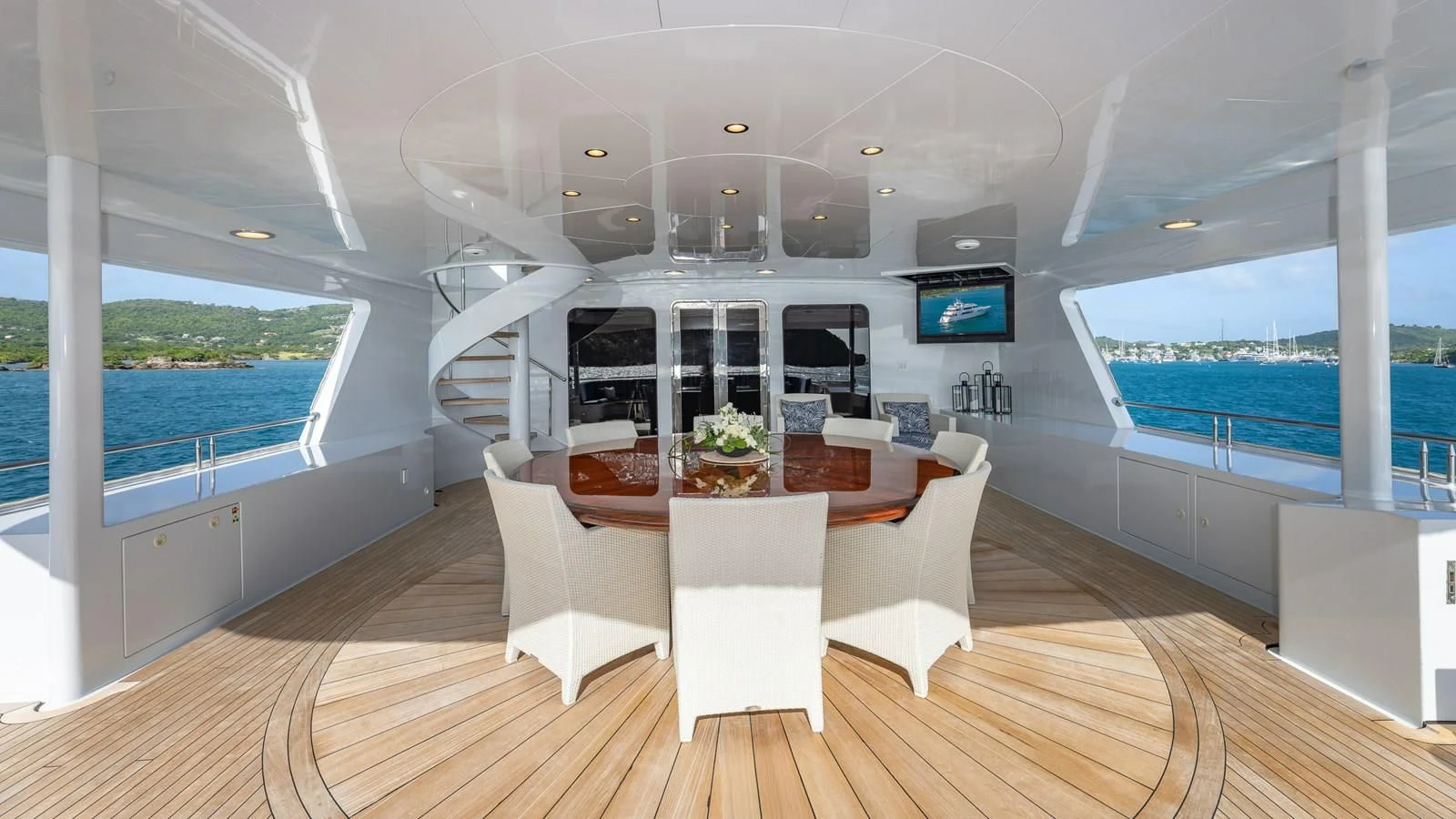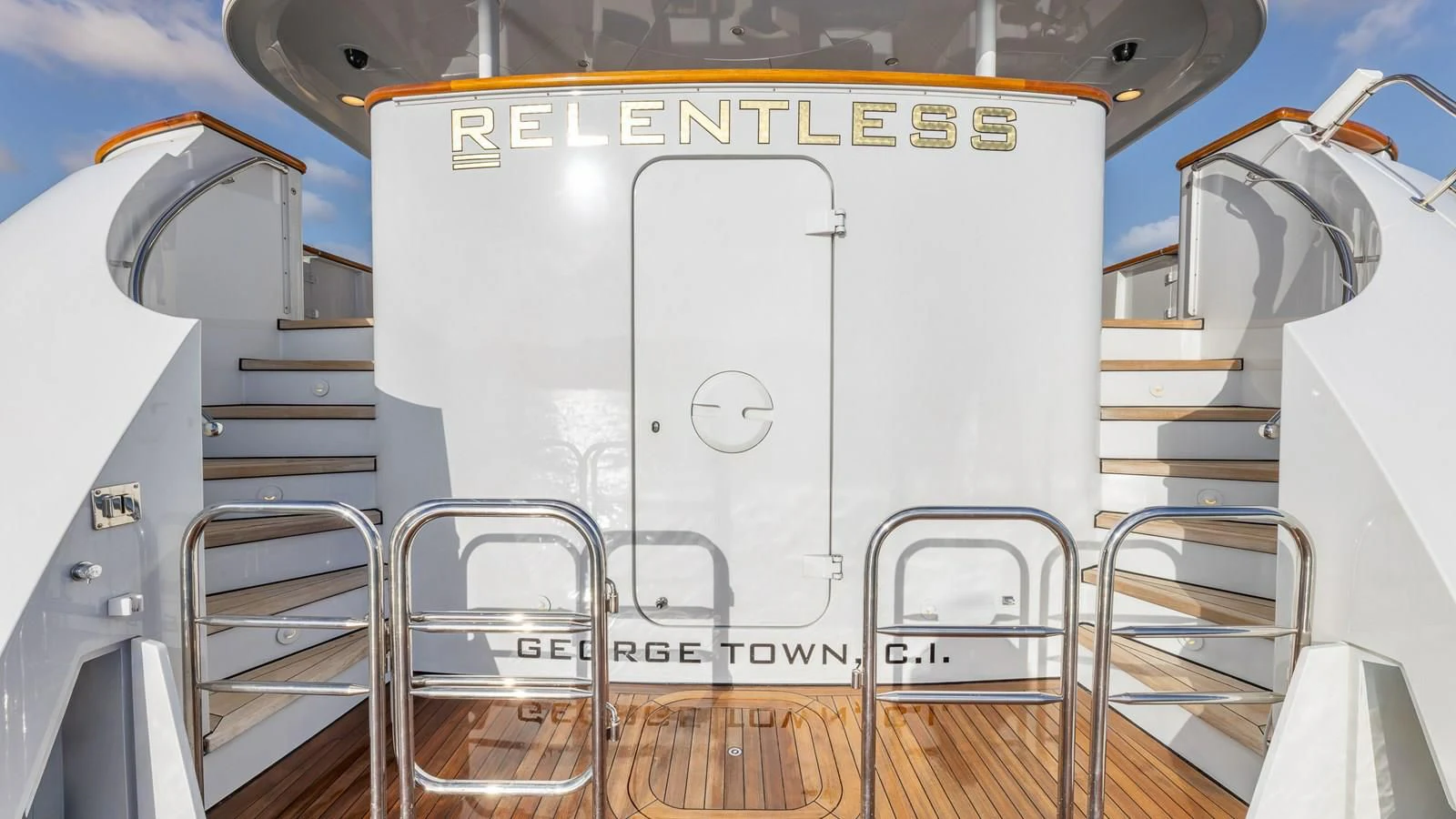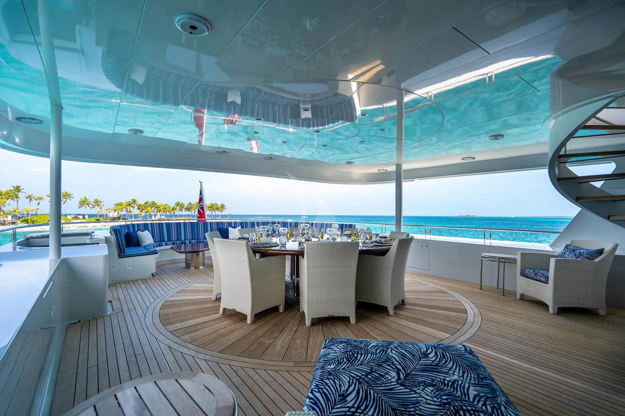 The exterior spaces on RELENTLESS have been designed for entertaining and socializing. There are stunning set-ups for alfresco dining both on the main deck for more formal occasions and on the upper deck, there is a table for 10 and a lounge area for casual lunches and dinners in the cooling breezes. The sundeck is a great place for socializing while topping up your tan. There is a large Jacuzzi for relaxing, wrap-around sun loungers and a U-shaped bar for cocktails with a view.
