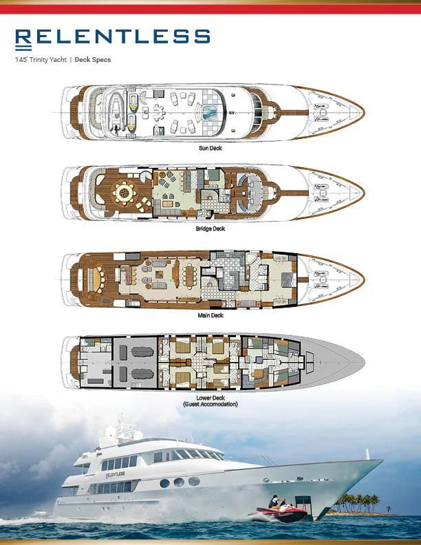 Elegance meets power with the artfully constructed Trinity Yacht, RELENTLESS. Launched in 2001, the 145-foot (43.28m) RELENTLESS completed her latest refit in 2019 returning her to as new luxury and comfort without losing any of the classic lines that make her so special. Cruising in the Caribbean, she is brilliantly equipped for family fun, vacations with friends or an intimate charter for two.