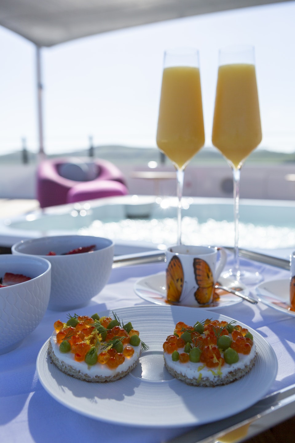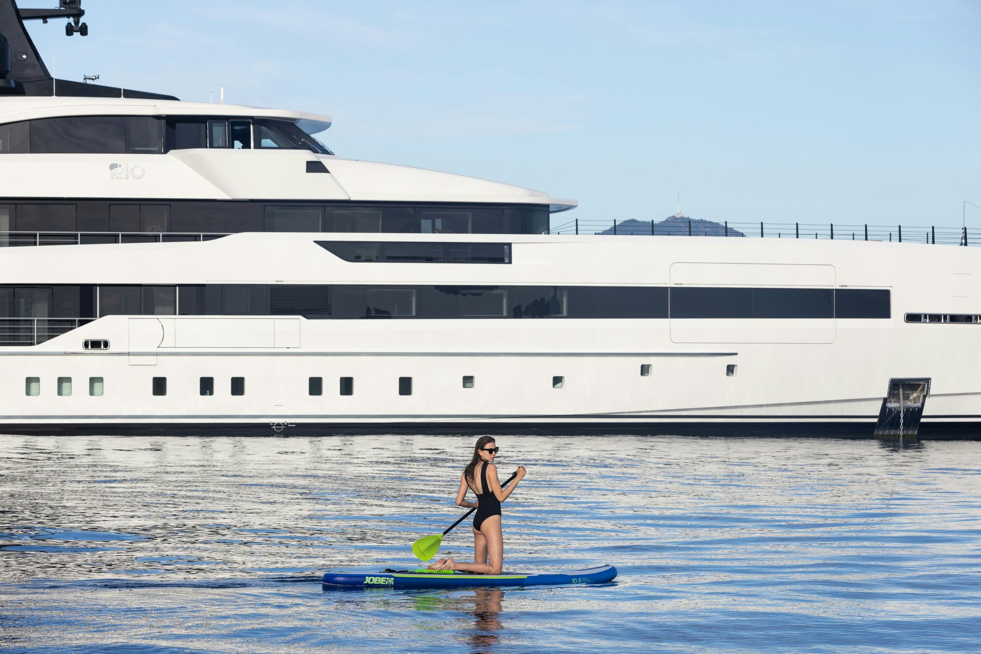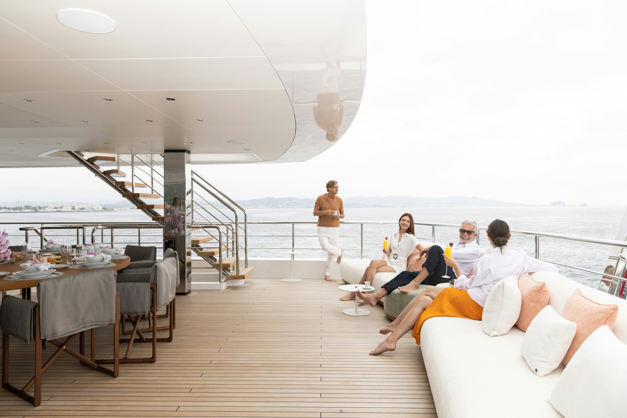 Starting at the water's edge, RIO has a stunning beach club/swim platform accessed through a door and staircase from the main salon. A glass hatch door opens to the swim platform that can be outfitted with a massage table, steam shower and hammam, making it a wellness space. From this space, walk up her dual staircases on each side and take guests to the main deck, which has a couch aft, armchairs on either side and a coffee table. Under the coffee table is a skylight for the beach club. The next deck up is the skylounge aft that features a large round table where guests enjoy alfresco dining for 12. It also features a lounge space with comfortable couches and a service bar with very rare Connemara marble to port, allowing for excellent service during mealtime. The yacht's sundeck features a large, raised, deep Jacuzzi. It is the ideal space for lounging in the sun and enjoying daytime cocktails thanks to sunbeds, a second Connemara marble bar with barstools, two large couches to port, and lots of privacy. This space also has a dayhead located inside behind the bridge.