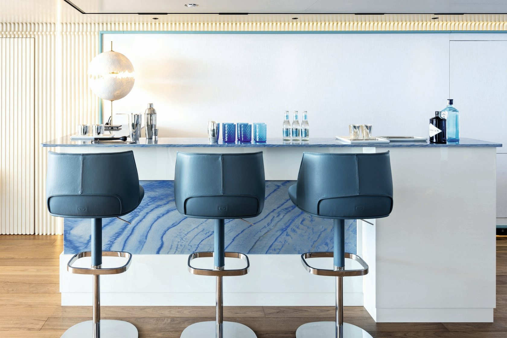 The yacht's main salon features an Azul Macaubas stone bar to port with three blue leather bar stools, two armchairs, and a coffee table. It is the perfect place to relax before enjoying a meal at the amidships' round dining table. This expandable table will seat all guests. Forward is a lounge with a sofa, ottomans, armchairs and a large TV. A small gym was added to the yacht's main deck in 2024, allowing guests to keep fit at sea.
