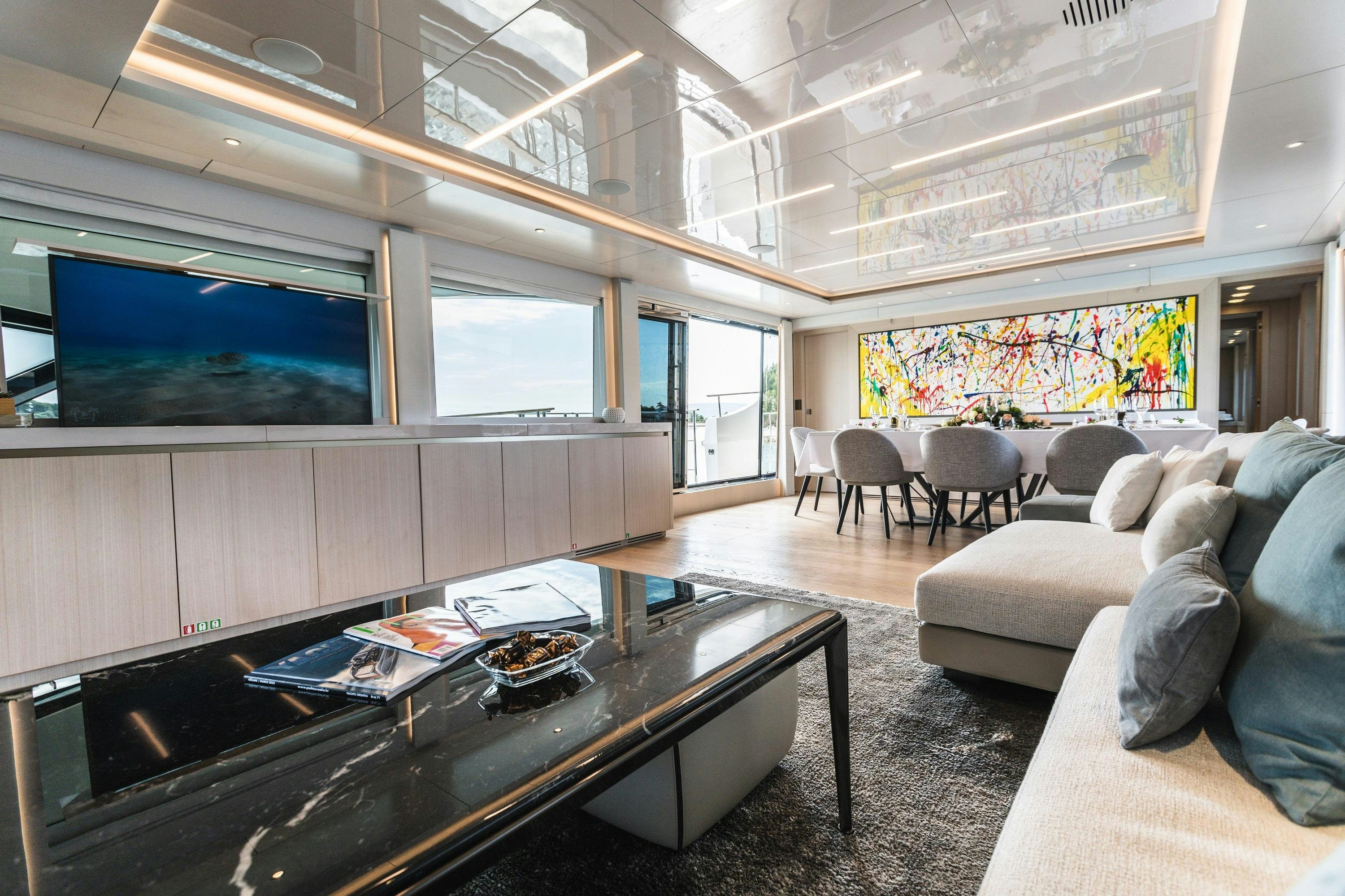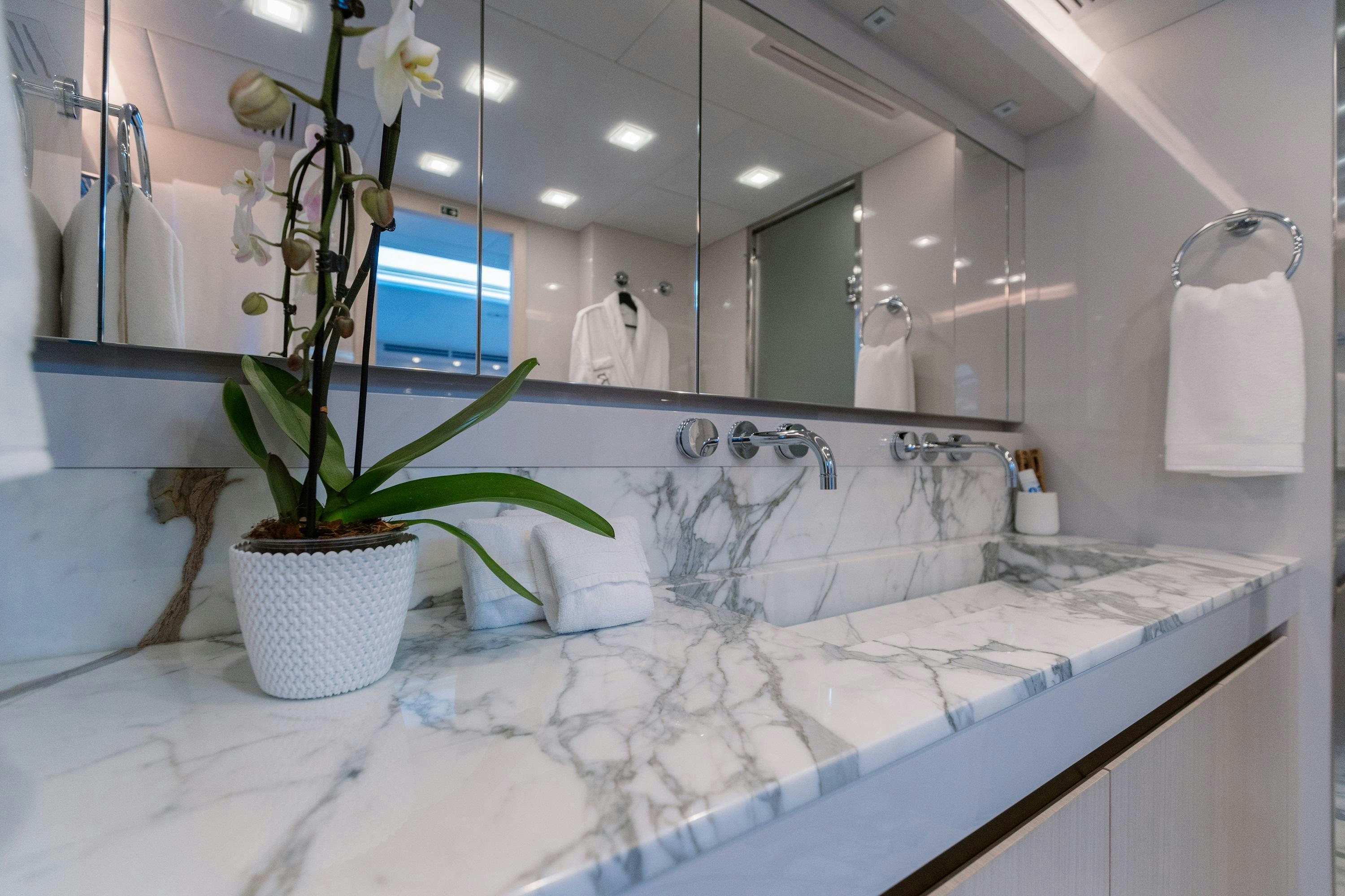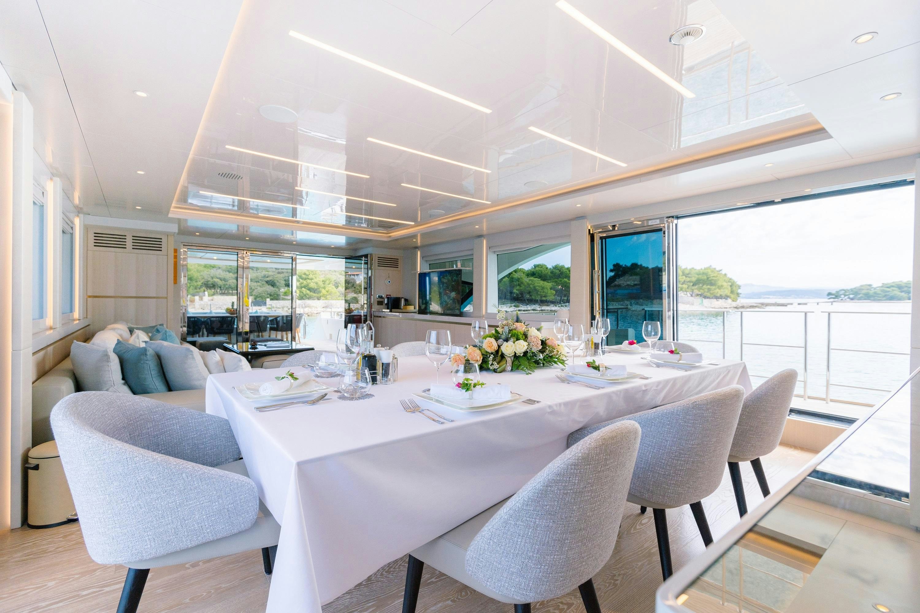 The interior of ROCCO is classy and modern with décor from Nuvolari Lenard. Her main salon spotlights breathtaking marble, wooden floors and leather seating (only the bean bags are in leather) for maximum comfort. From a plush L-shaped sofa to bean bags, ROCCO attends all guest desires, be they for family-friendly purposes or socializing with friends. It offers a large pop-up flatscreen TV, a coffee table, spaces for socializing, a formal dining area and large windows for natural light. Here, guests can take to the fold-down balconies for a breath of fresh air with drinks in hand. Beautiful fabrics interweave throughout the entirety of her layout, showcasing soft tones of blue and grey.