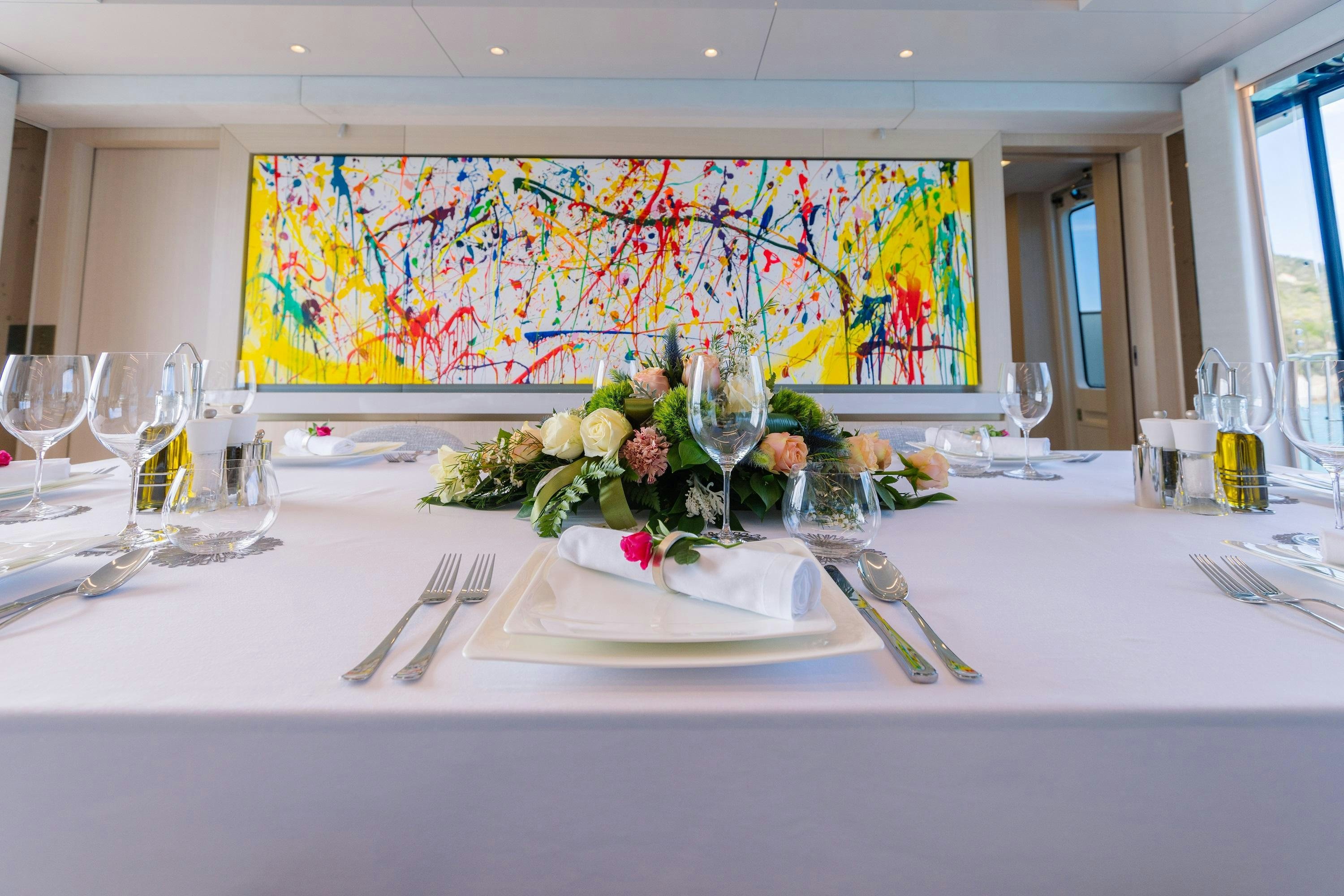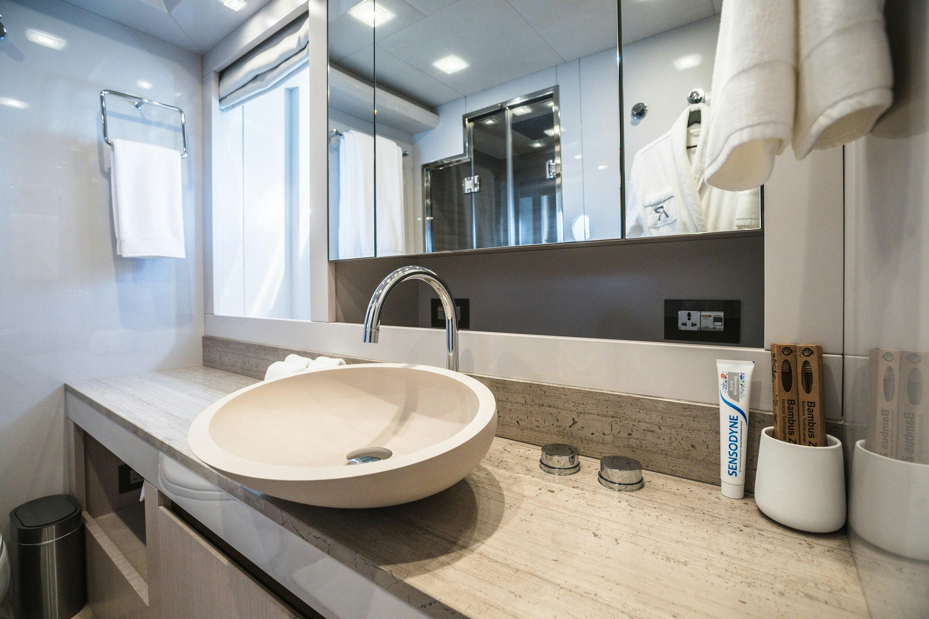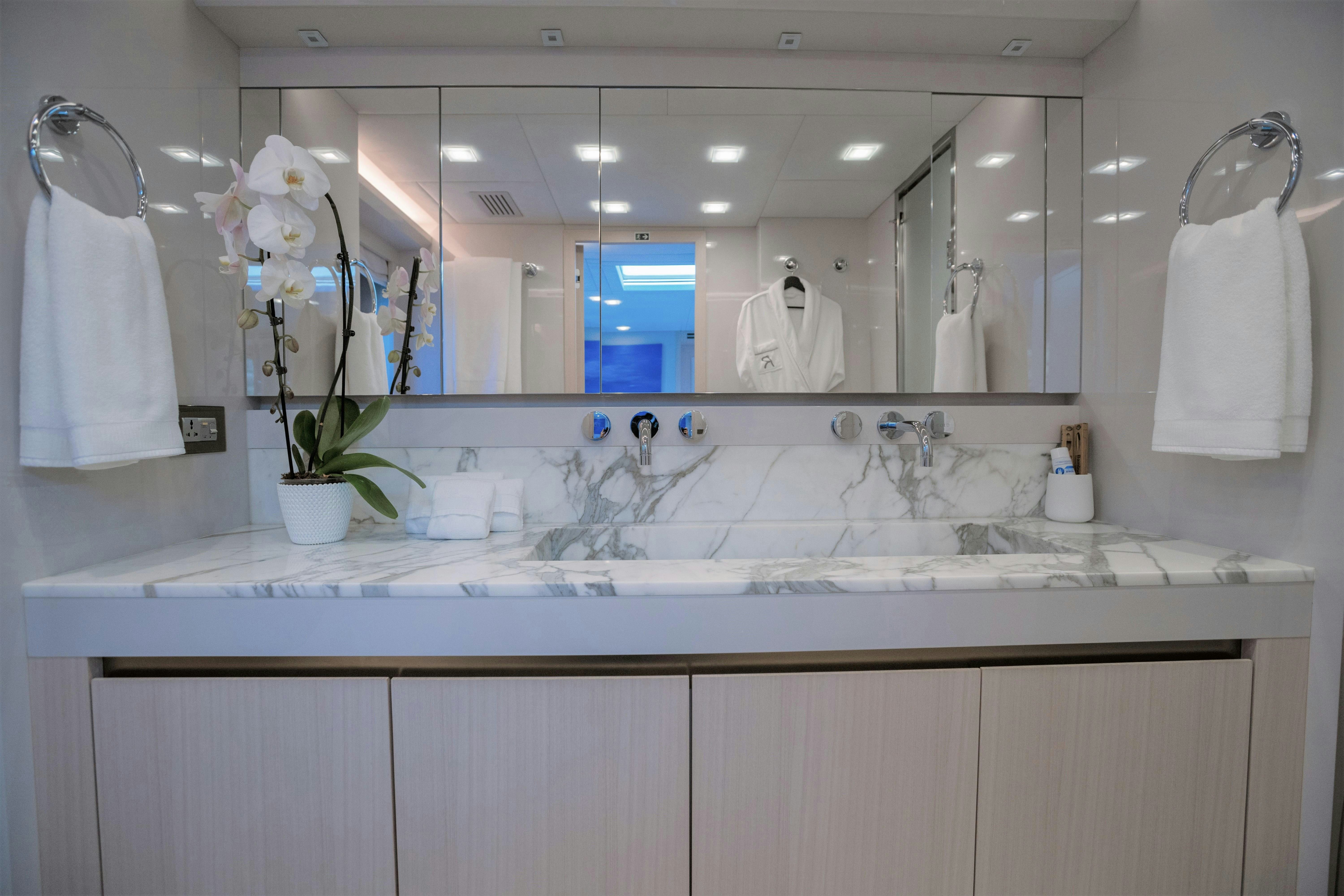 The interior of ROCCO is classy and modern with décor from Nuvolari Lenard. Her main salon spotlights breathtaking marble, wooden floors and leather seating (only the bean bags are in leather) for maximum comfort. From a plush L-shaped sofa to bean bags, ROCCO attends all guest desires, be they for family-friendly purposes or socializing with friends. It offers a large pop-up flatscreen TV, a coffee table, spaces for socializing, a formal dining area and large windows for natural light. Here, guests can take to the fold-down balconies for a breath of fresh air with drinks in hand. Beautiful fabrics interweave throughout the entirety of her layout, showcasing soft tones of blue and grey.