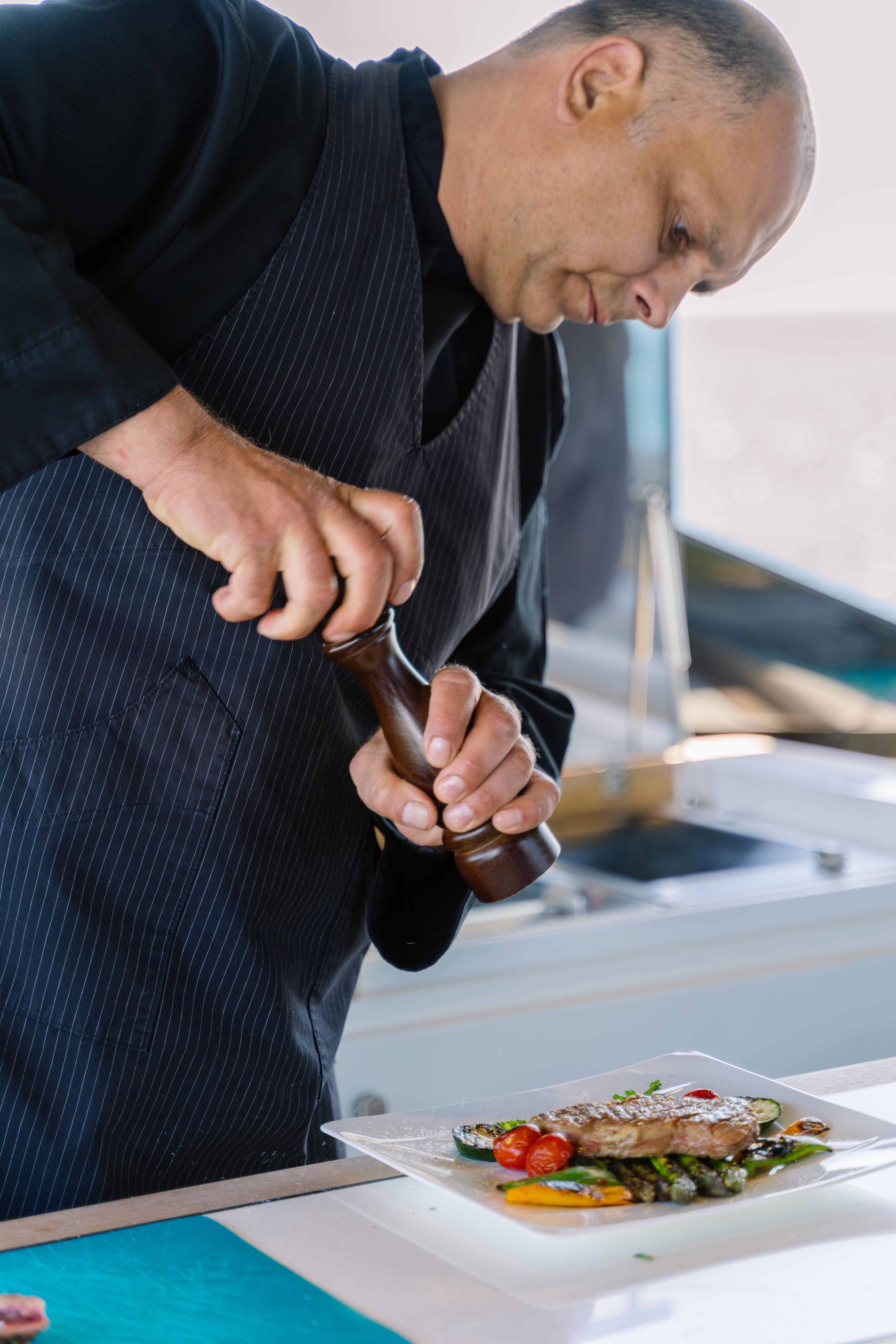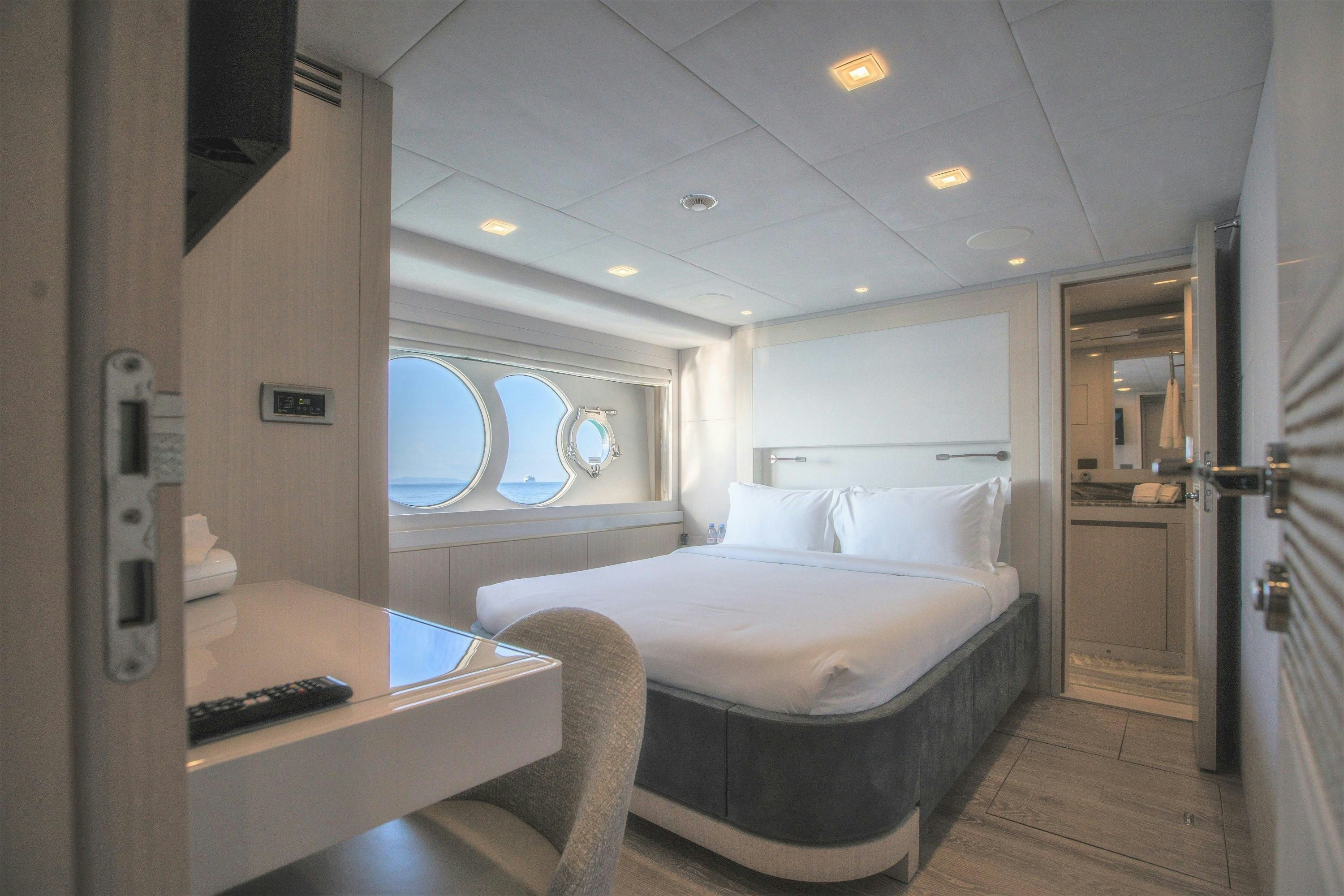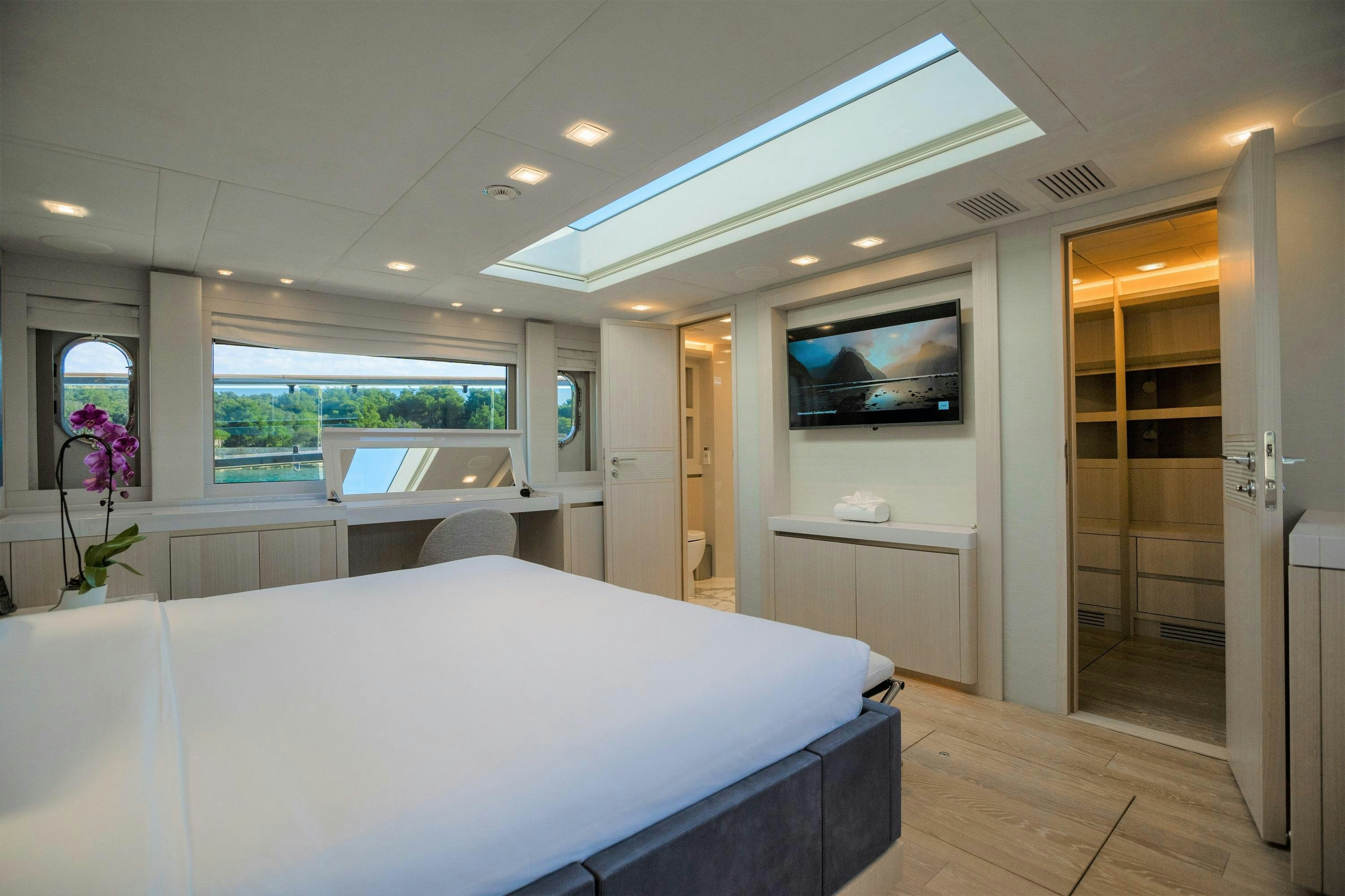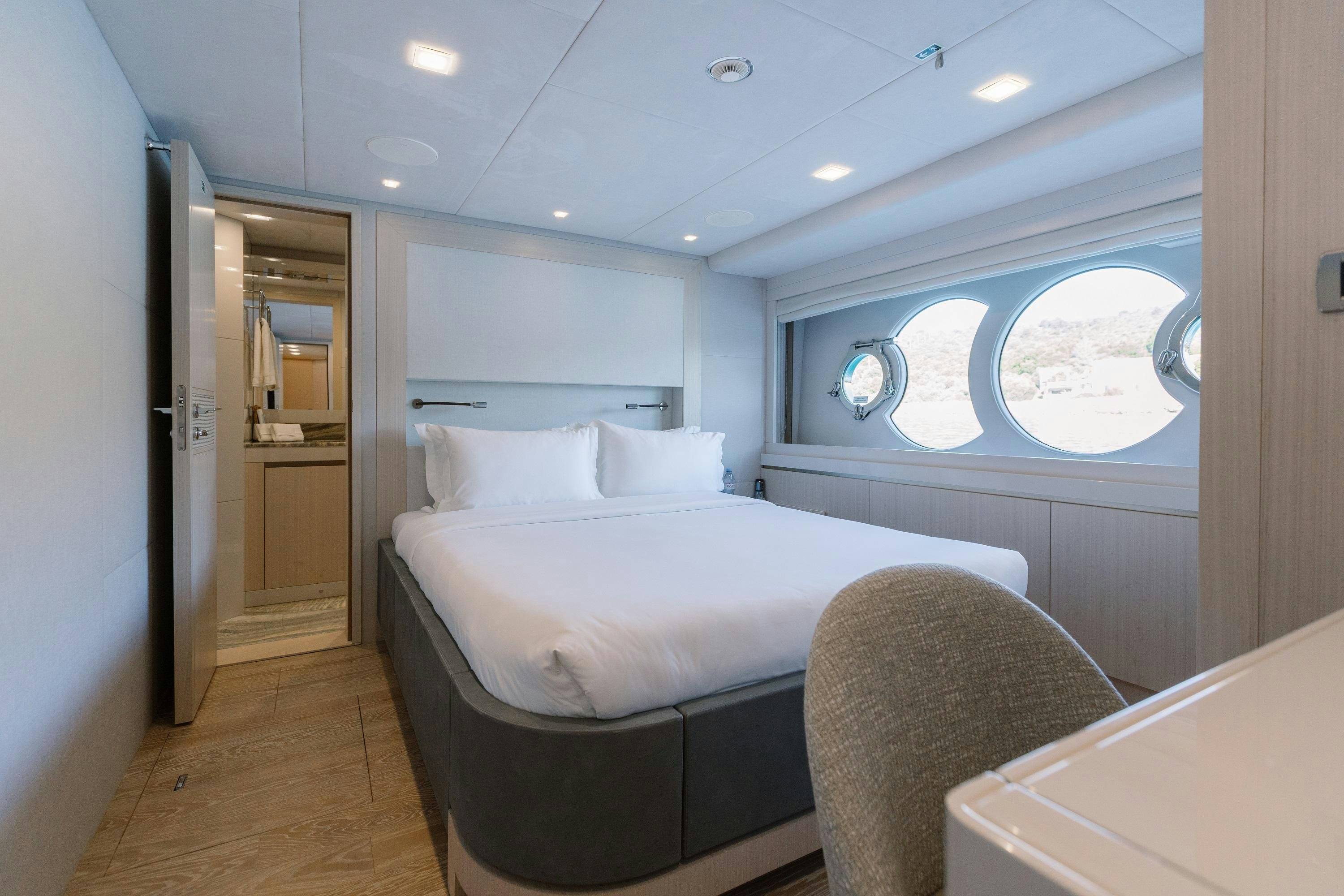 For overnight stays, ROCCO welcomes 10 guests into five sumptuous staterooms, each with a focus on elegance and entertainment for relaxation. Her beautiful and luminous master suite is located forward on the main deck, allowing ample room for the guest cabins below. The additional four staterooms, equally sized, feature soft accommodations with a cozy ambiance. ROCCO hosts a crew of five at the bow.