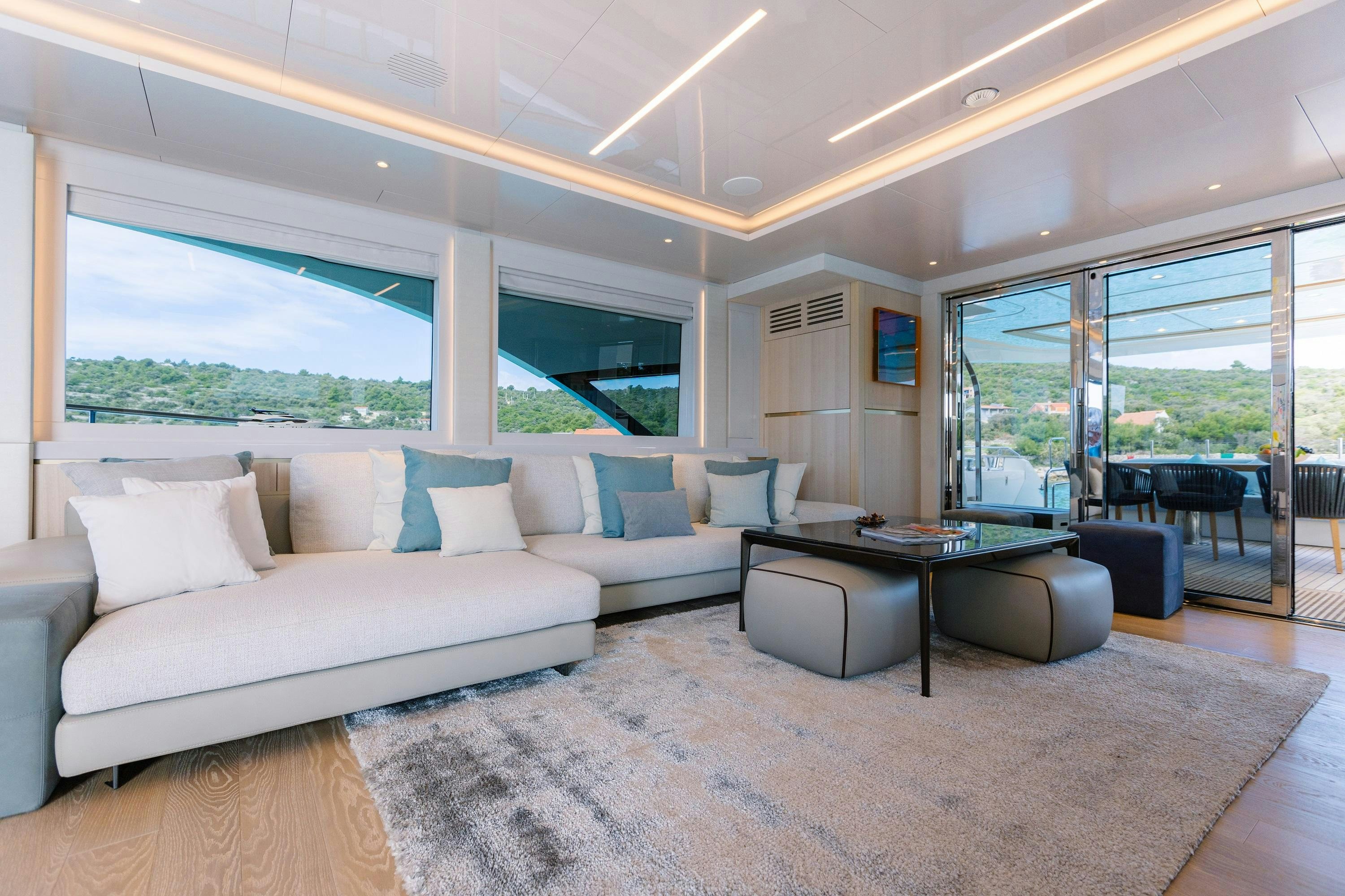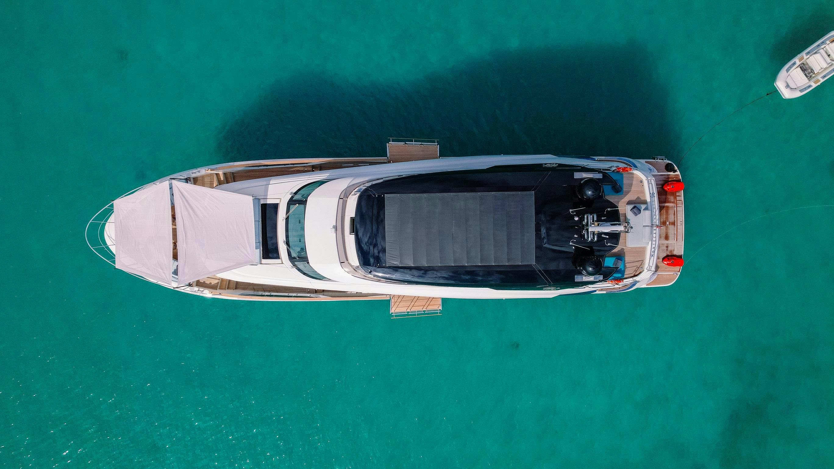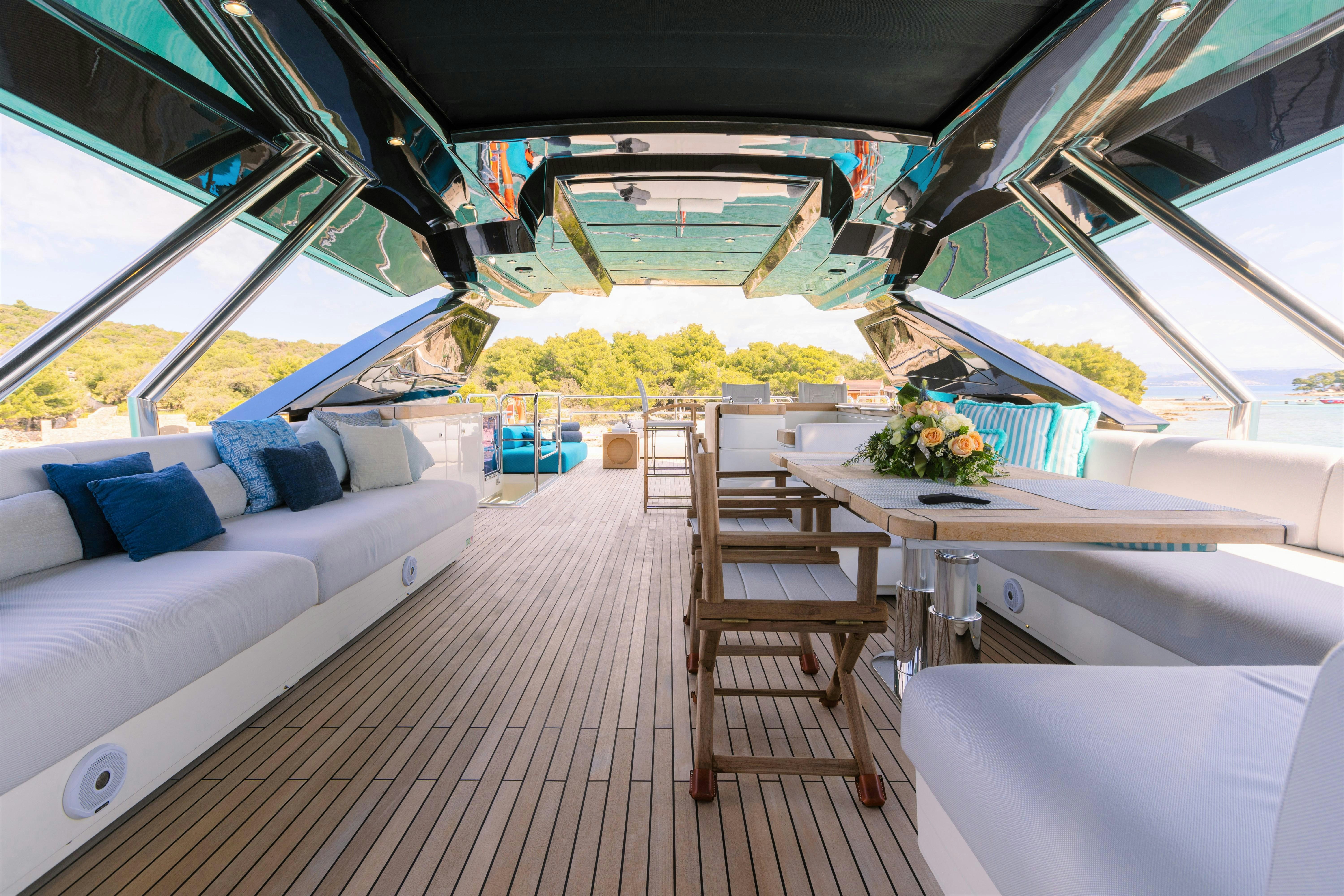 Ascending to her main deck aft, guests are immediately enveloped in overwhelming sense of spaciousness and rejuvenation. This includes two fold-out terraces, a large swimming platform for easy water-access and delightful deck spaces for the alfresco lifestyle. Her magnificent flybridge offers open space, a service bar, a delightful sofa, a coffee table and warm sunbeds. Forward, it has a covered area with sunpads and an open cockpit.