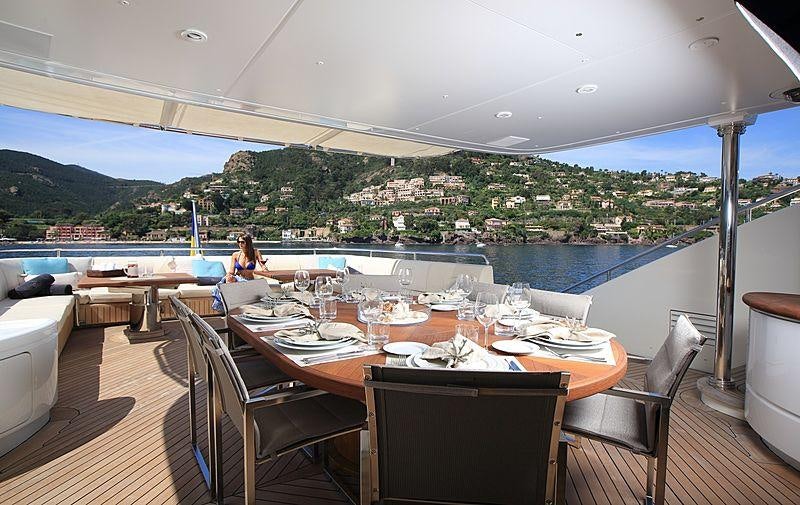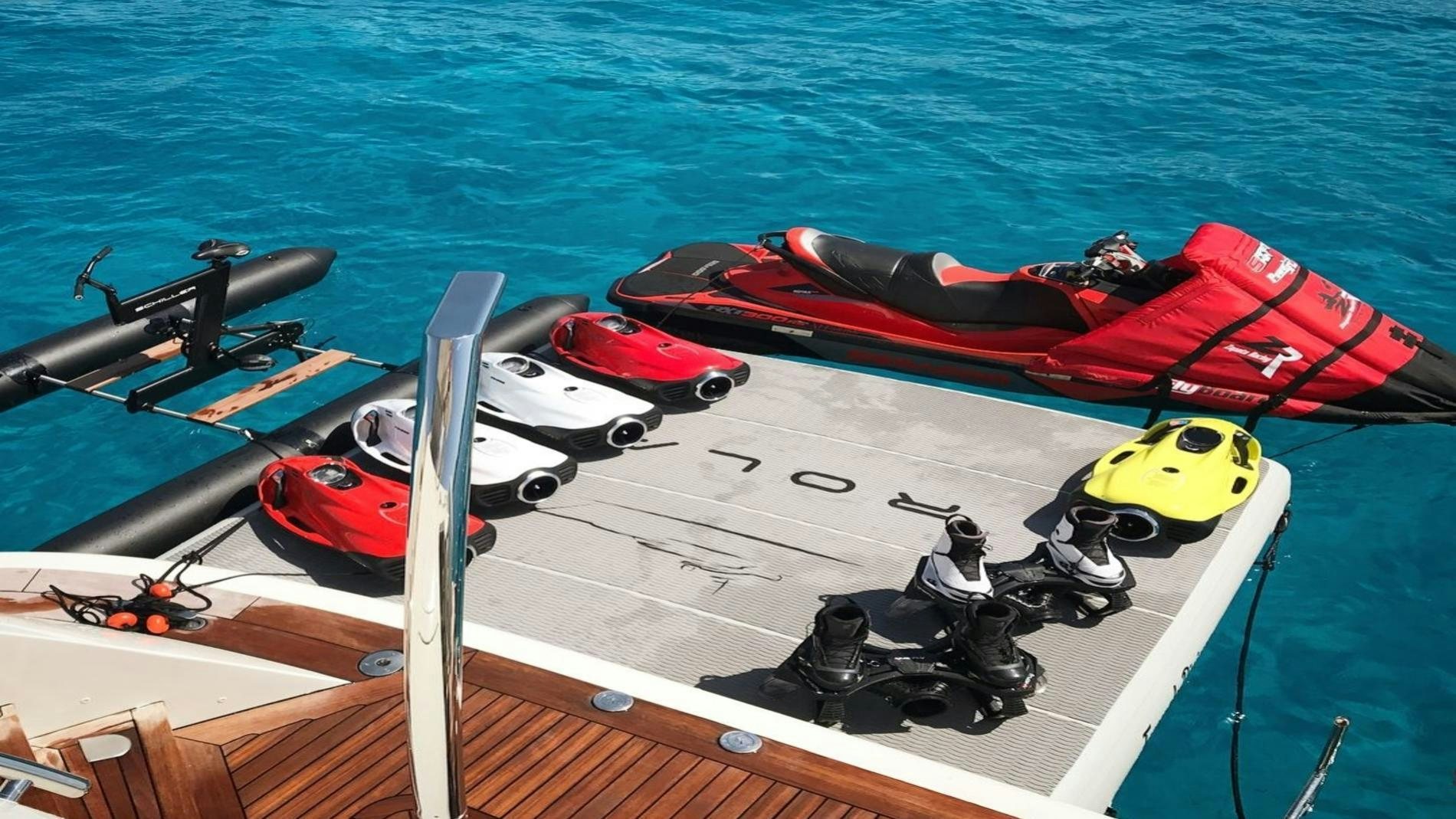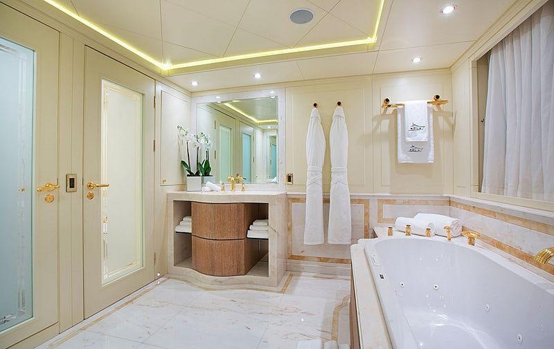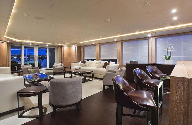 The luxury yacht’s outdoor spaces are all well equipped, showcasing numerous seating areas for guests to socialize. A Jacuzzi, bar and alfresco dining can all be found on the yacht’s sundeck, which is an excellent spot for unwinding and sunbathing. Aft ROLA boasts an excellent beach club for enjoying all the yacht’s spectacular water toys.