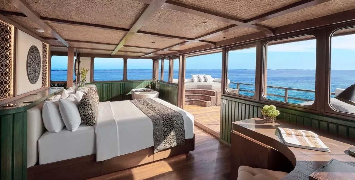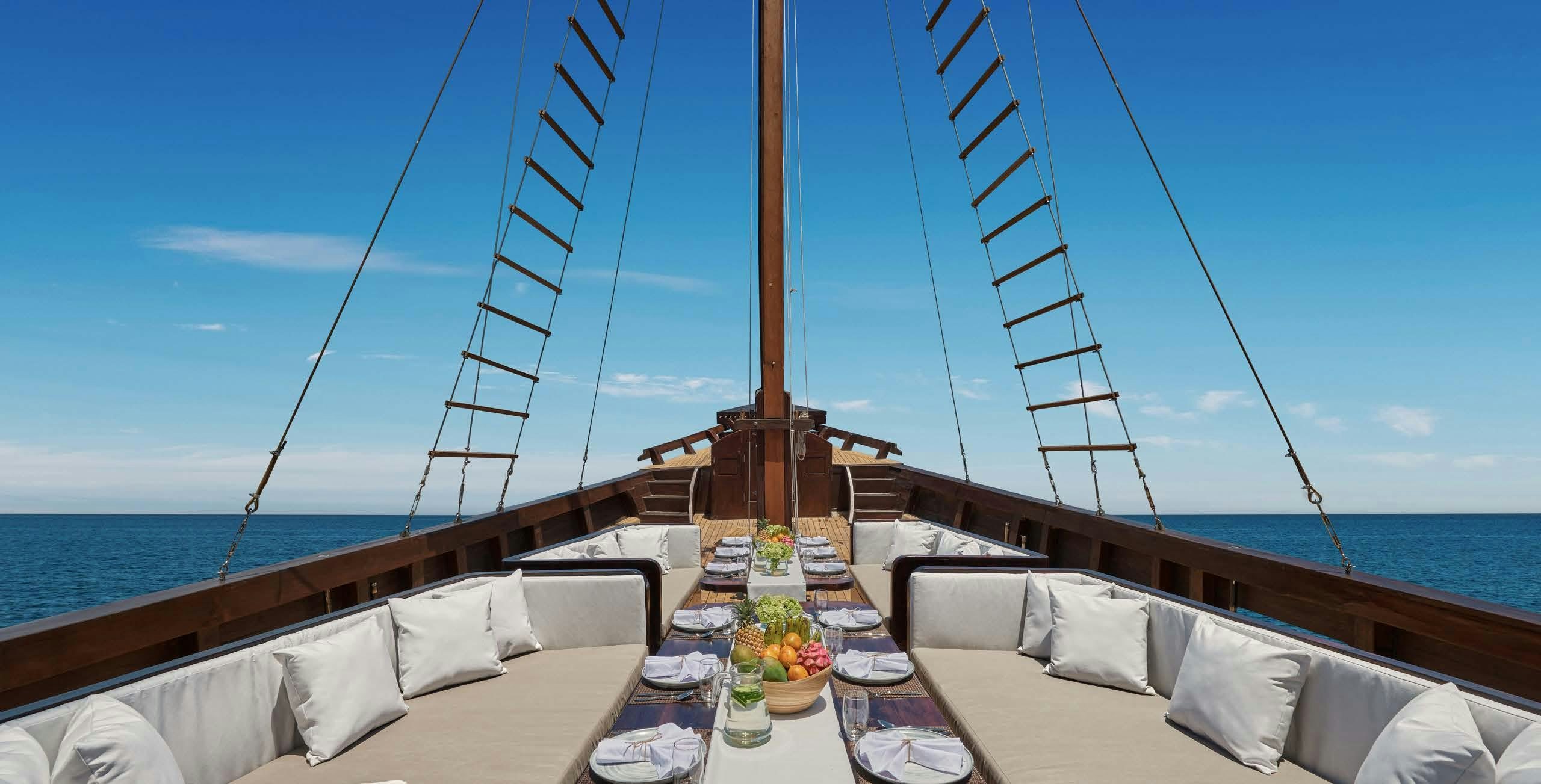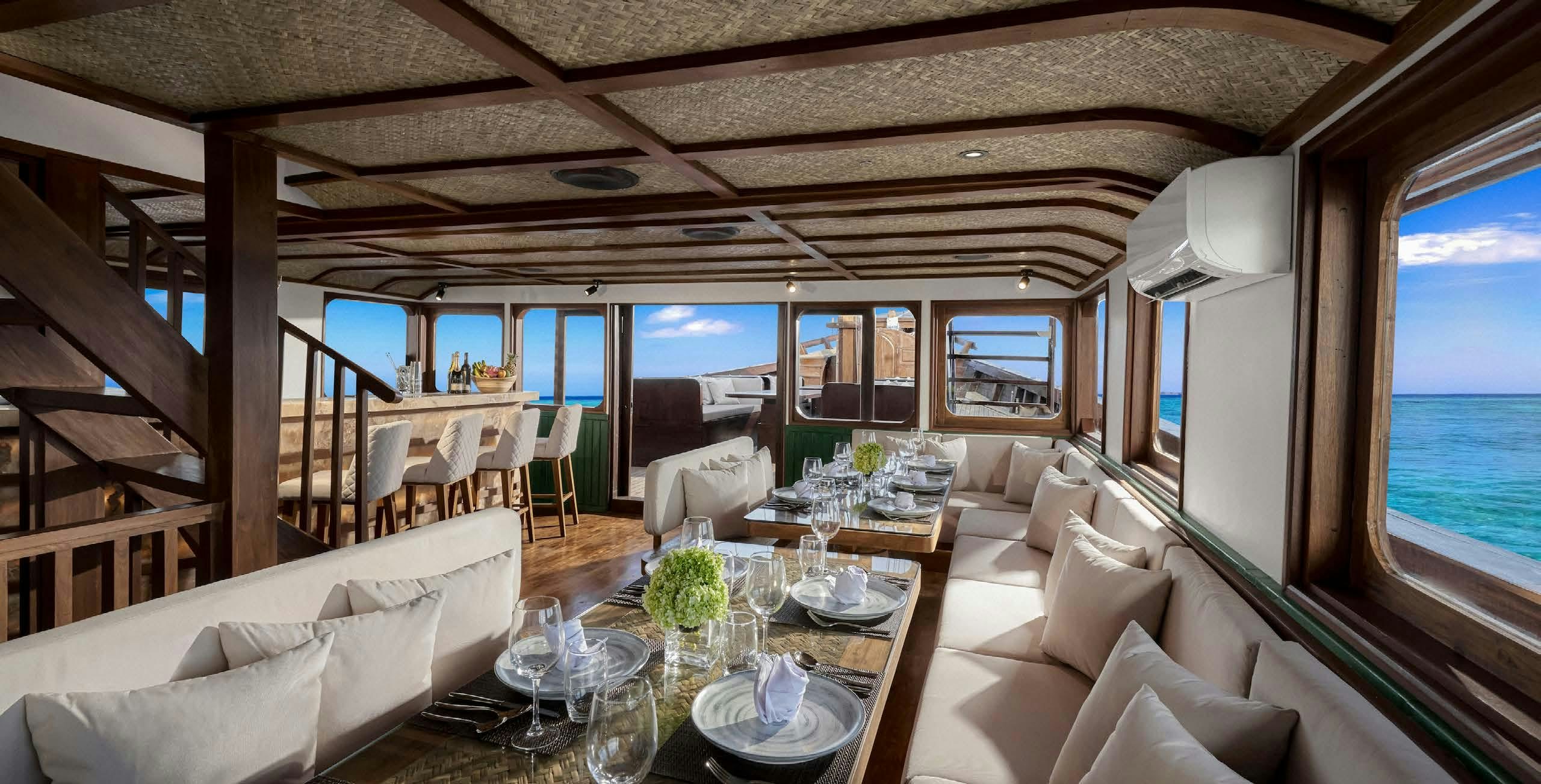 Drawing inspiration from exotic areas across the Indonesian archipelago, the interior is timeless, sophisticated and chic blending rich, dark wood accentuated with cream and hints of deep green, reminiscent of her sister resort in the verdant rainforest of Bali’s Ubud. Beautifully styled by her owner to create a luxurious beach house aesthetic, large windows fill the interior with floods of natural light illuminating the carved fretwork and exposed beams. The main living space is a vast salon with sumptuous cream sofas, glass topped dining tables with intricate woven flax below, and an art deco-inspired gold leafed bar for fun-filled, boho-chic cocktail hours. The space is equipped with a state-of-the-art sound system and fully opens to the spacious forward deck in the bow for seamless entertaining from day into starry nights.