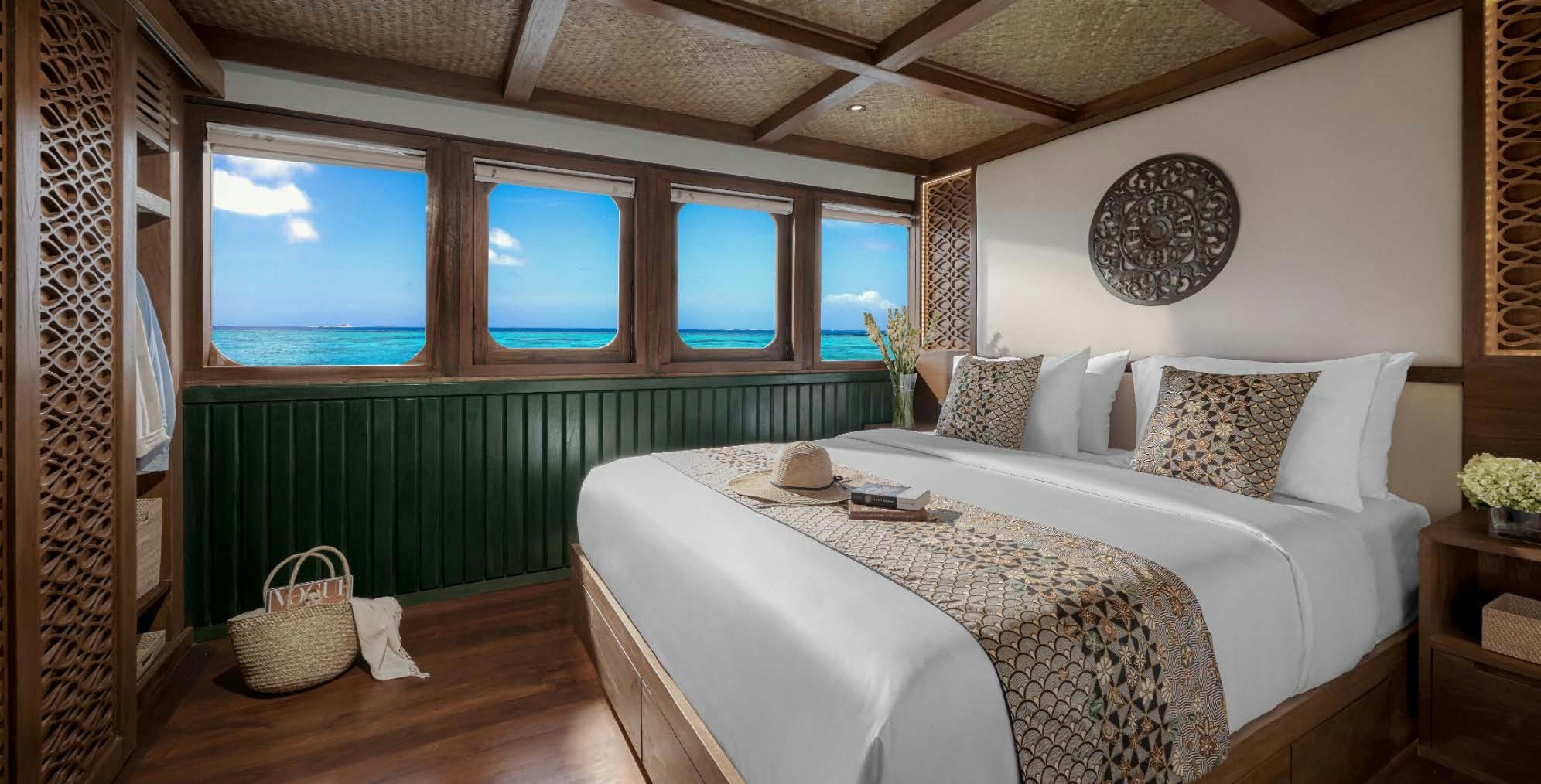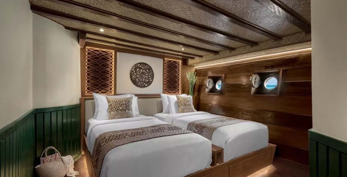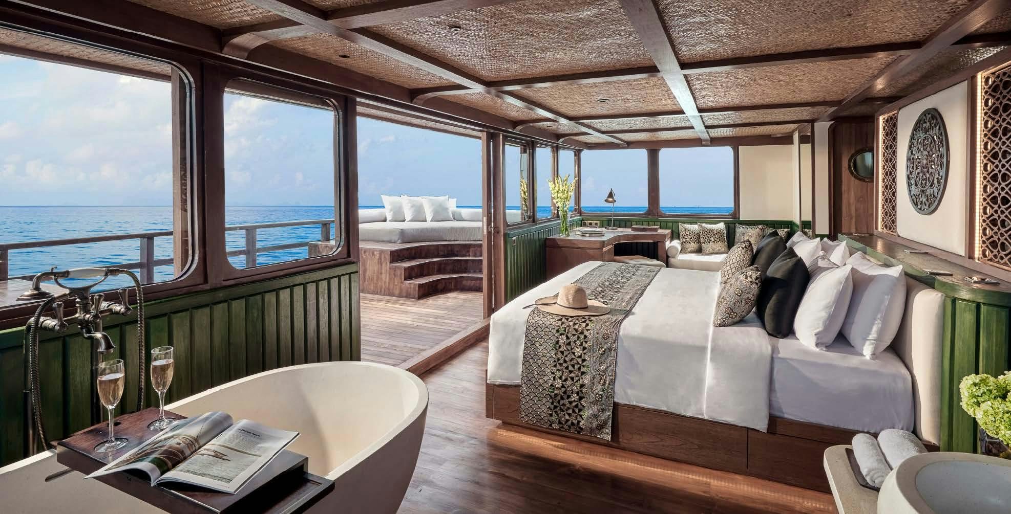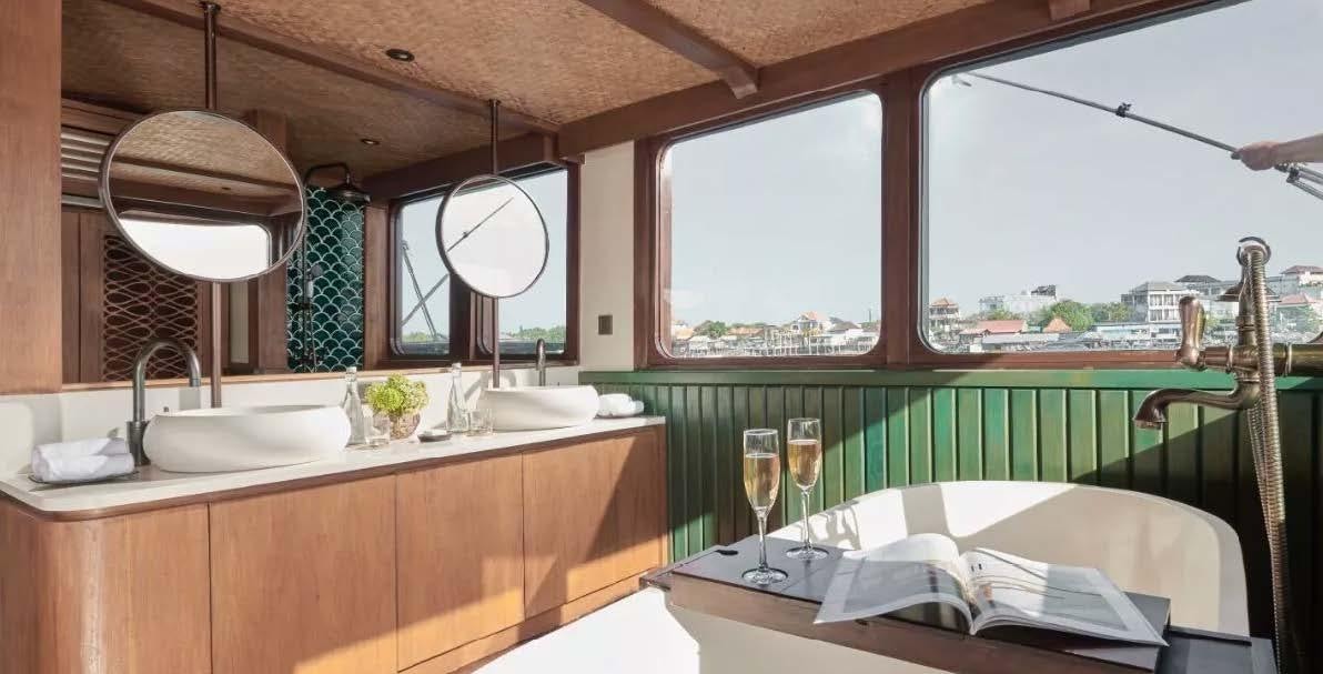 Drawing inspiration from exotic areas across the Indonesian archipelago, the interior is timeless, sophisticated and chic blending rich, dark wood accentuated with cream and hints of deep green, reminiscent of her sister resort in the verdant rainforest of Bali’s Ubud. Beautifully styled by her owner to create a luxurious beach house aesthetic, large windows fill the interior with floods of natural light illuminating the carved fretwork and exposed beams. The main living space is a vast salon with sumptuous cream sofas, glass topped dining tables with intricate woven flax below, and an art deco-inspired gold leafed bar for fun-filled, boho-chic cocktail hours. The space is equipped with a state-of-the-art sound system and fully opens to the spacious forward deck in the bow for seamless entertaining from day into starry nights.