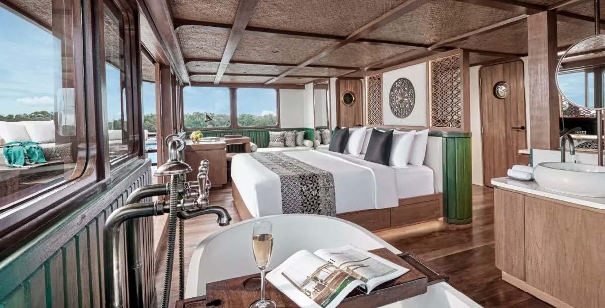 SAMSARA SAMUDRA six stunning staterooms are among her many stand-out features and include a superb upper deck master suite. Opening onto a spacious private terrace with raised sun pads and great views over the sea, the master stateroom also offers a sumptuous lounge, indulgent king-size bed and a beautiful open-concept en-suite bathroom with a free-standing bathtub and gorgeous styling. Massive windows and large sliding doors to the terrace enhance the indoor/outdoor ambience. There is a further double stateroom on this level with the same locally inspired décor and amazing views framed by the panoramic windows. There is also a generous en-suite shower room. The remaining staterooms can be found on the lower deck and include two doubles and two twin cabins with side-by-side single beds that can be converted to doubles if required, making SAMSARA SAMUDRA a flexible option for a wide range of charter parties.