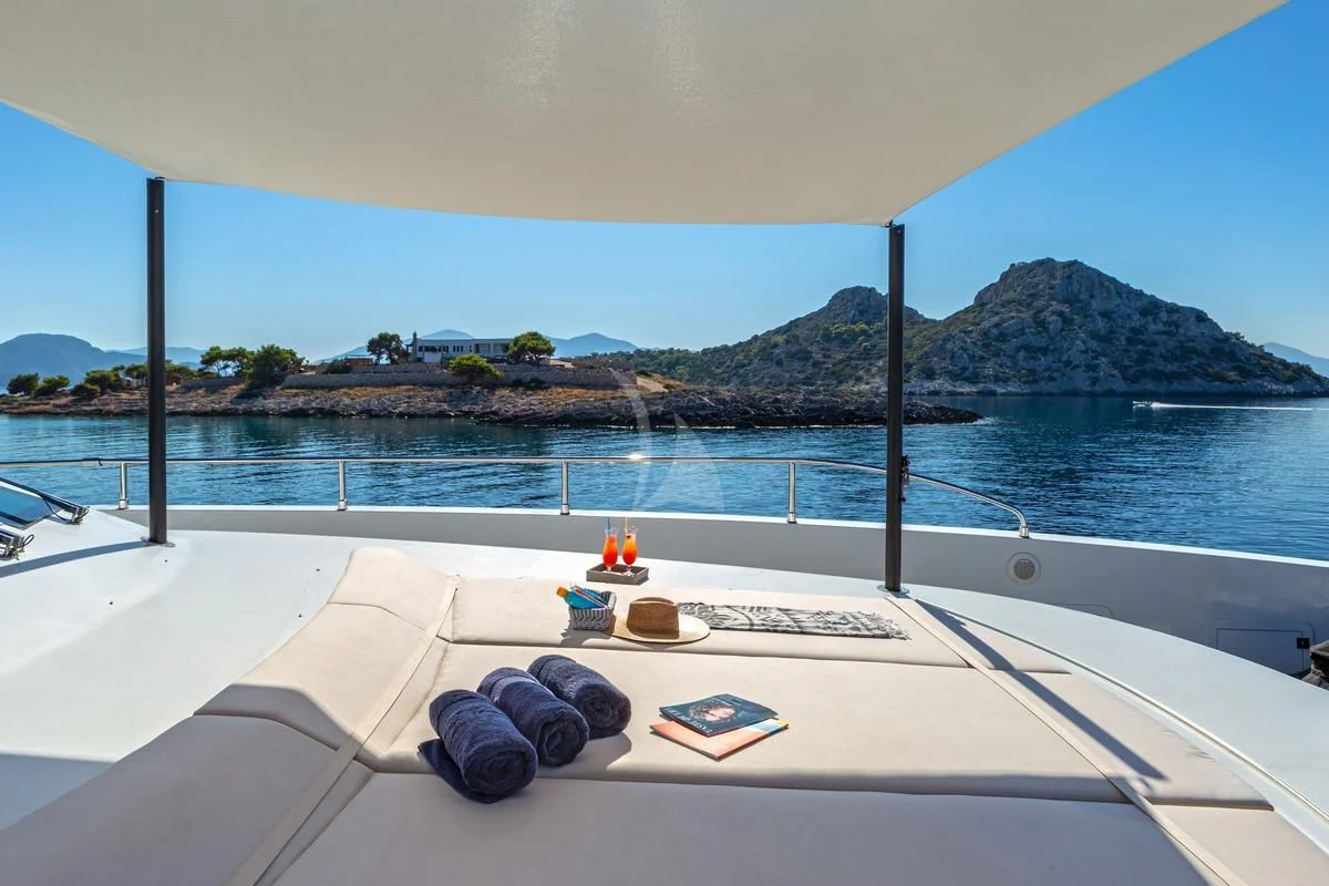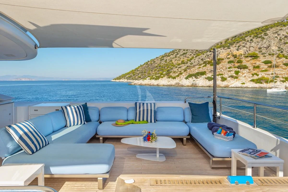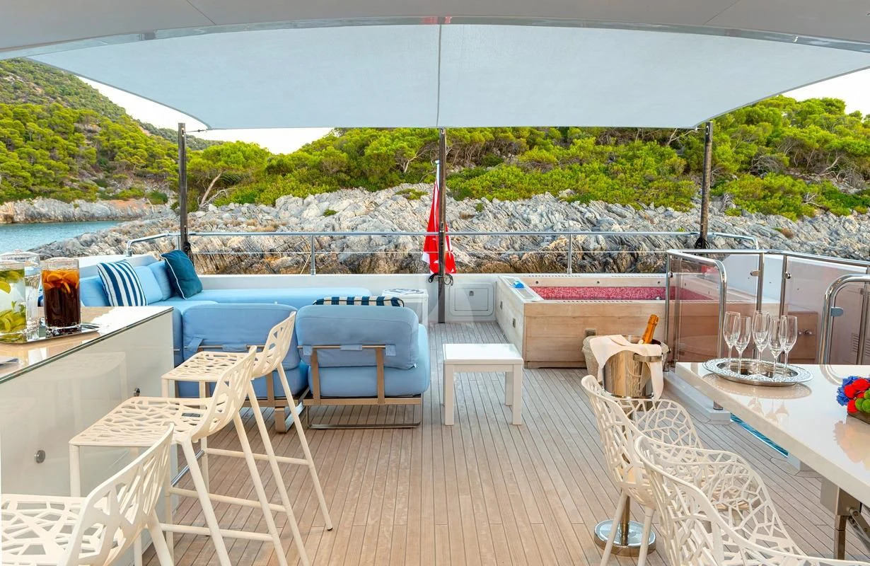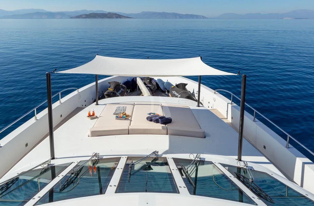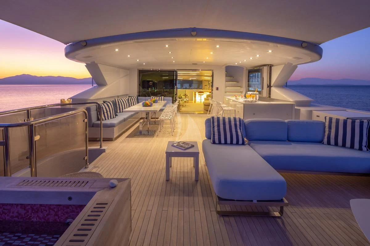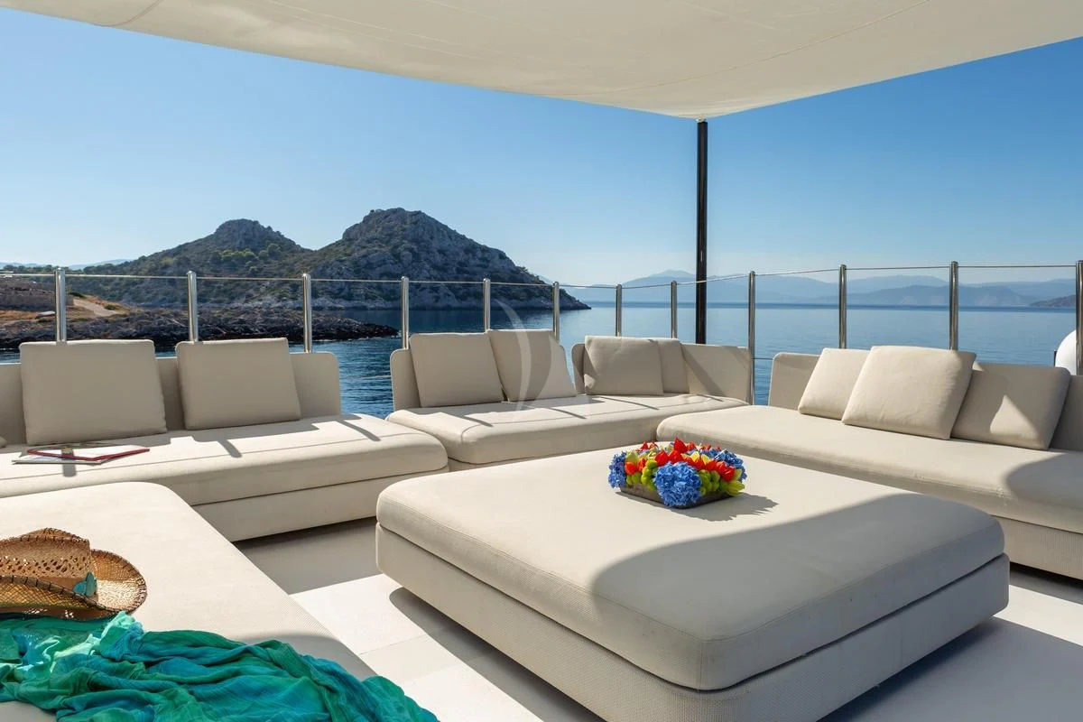 Decks on SEA WOLF provide an array of stylish spaces for sunbathing, socializing and entertaining, or simply soaking in the views this stunning region has to offer. The main aft deck offers a stunning spot for a lazy breakfast or casual lunch shaded by the upper deck overhang. The integrated sofa seating overlooks the stern to take in the action on the water or the colorful scenes of life in port. For sunset soirées and entertaining, the upper deck has it all, from a sit-up LED-lit bar for cocktails and an elegant alfresco dining table, to a comfy lounge, a huge plasma screen for movies and a Jacuzzi for relaxing dips day or night. Wide side decks lead to the foredeck where sun pads provide a quiet escape and uninterrupted bronzing during the day. For the best views on board and endless sunshine, the sundeck definitely lives up to its name. There are sun loungers, luxurious sun pads and extra wide sofas for relaxing or reclining with 360-degree views.