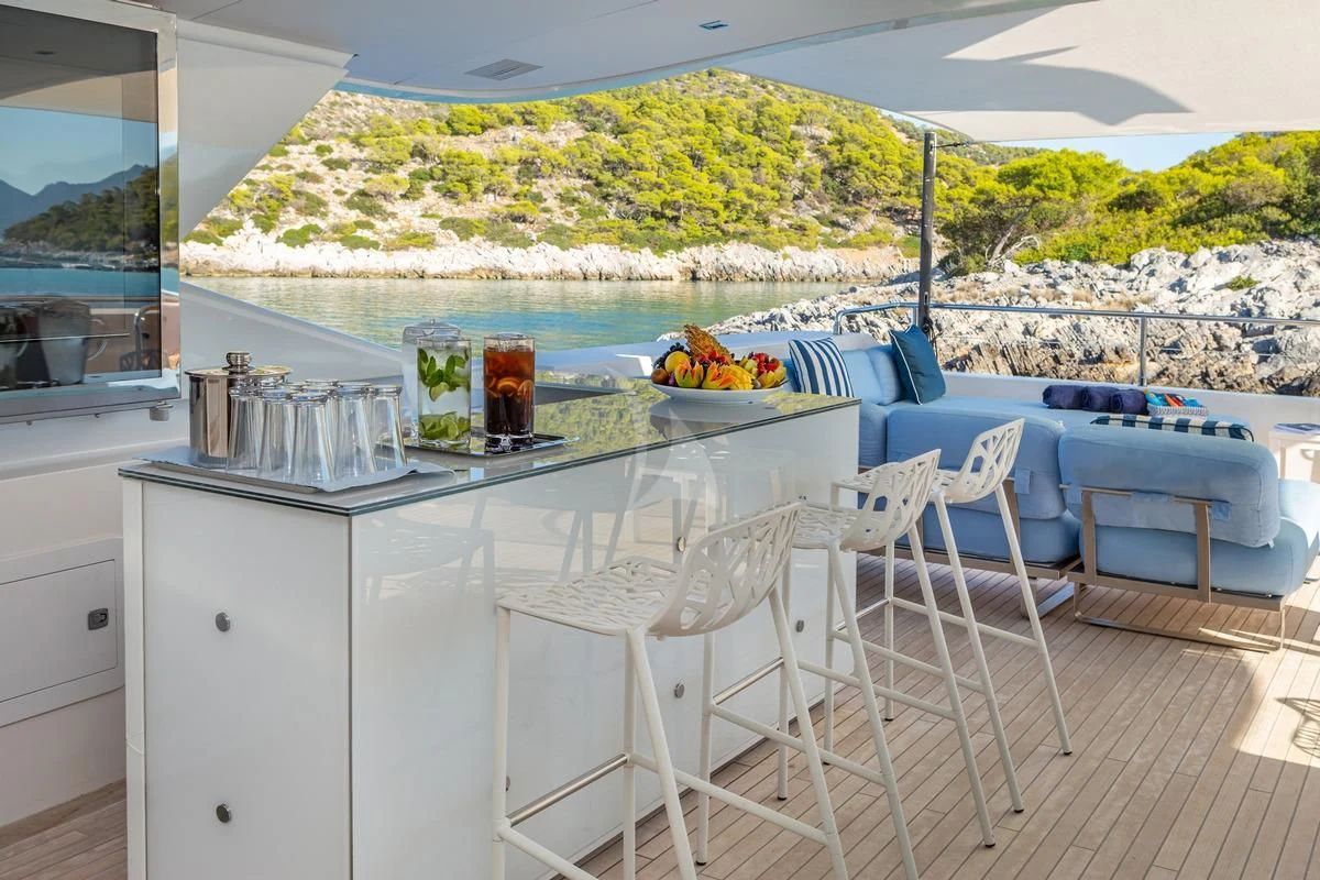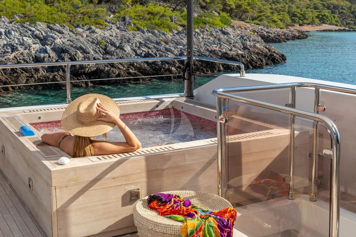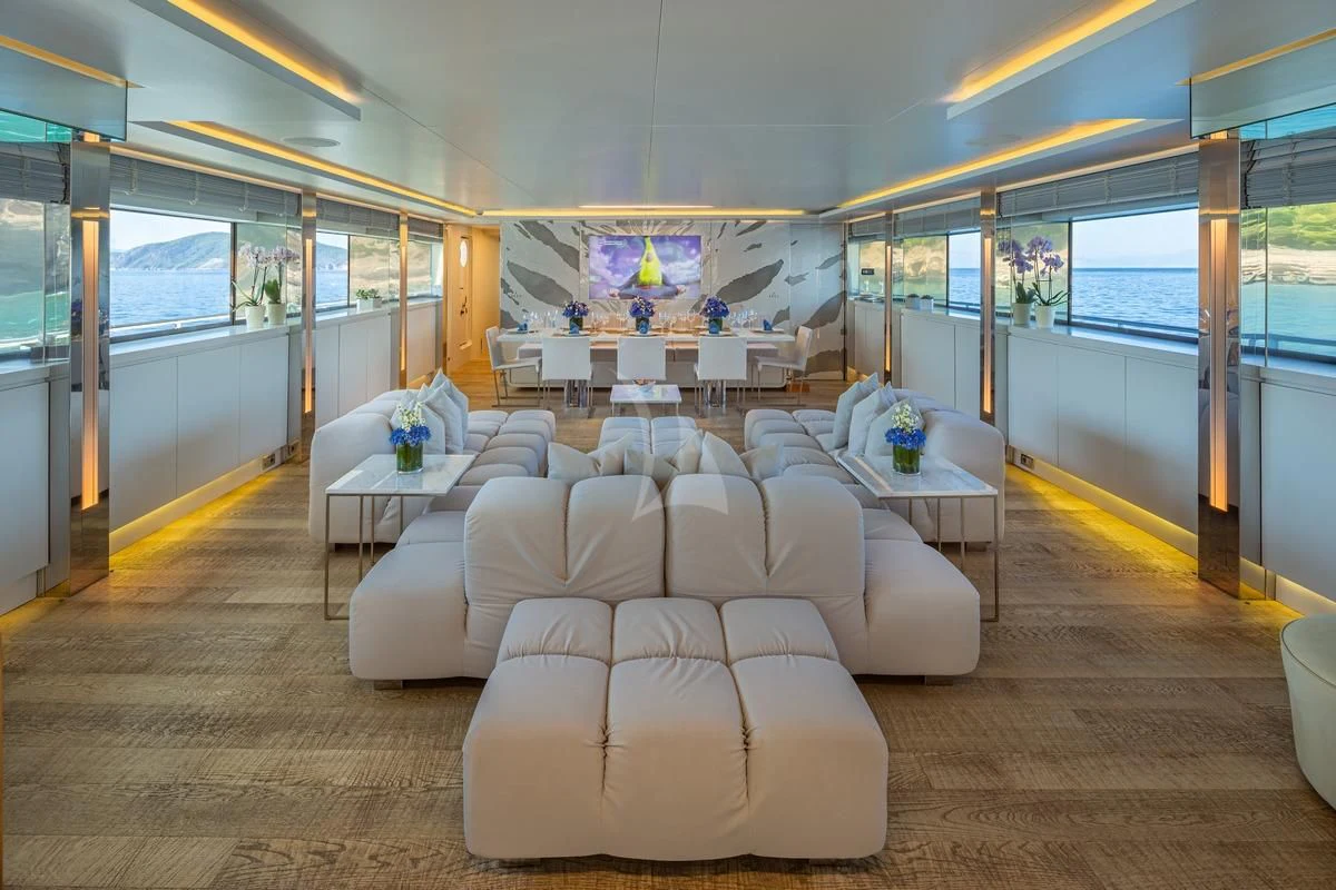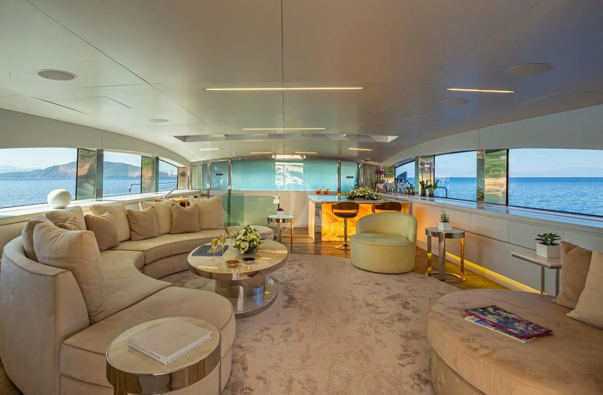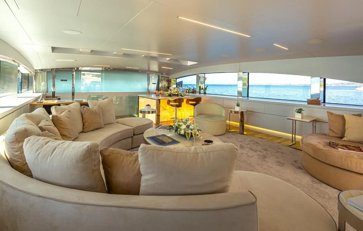 Decks on SEA WOLF provide an array of stylish spaces for sunbathing, socializing and entertaining, or simply soaking in the views this stunning region has to offer. The main aft deck offers a stunning spot for a lazy breakfast or casual lunch shaded by the upper deck overhang. The integrated sofa seating overlooks the stern to take in the action on the water or the colorful scenes of life in port. For sunset soirées and entertaining, the upper deck has it all, from a sit-up LED-lit bar for cocktails and an elegant alfresco dining table, to a comfy lounge, a huge plasma screen for movies and a Jacuzzi for relaxing dips day or night. Wide side decks lead to the foredeck where sun pads provide a quiet escape and uninterrupted bronzing during the day. For the best views on board and endless sunshine, the sundeck definitely lives up to its name. There are sun loungers, luxurious sun pads and extra wide sofas for relaxing or reclining with 360-degree views.