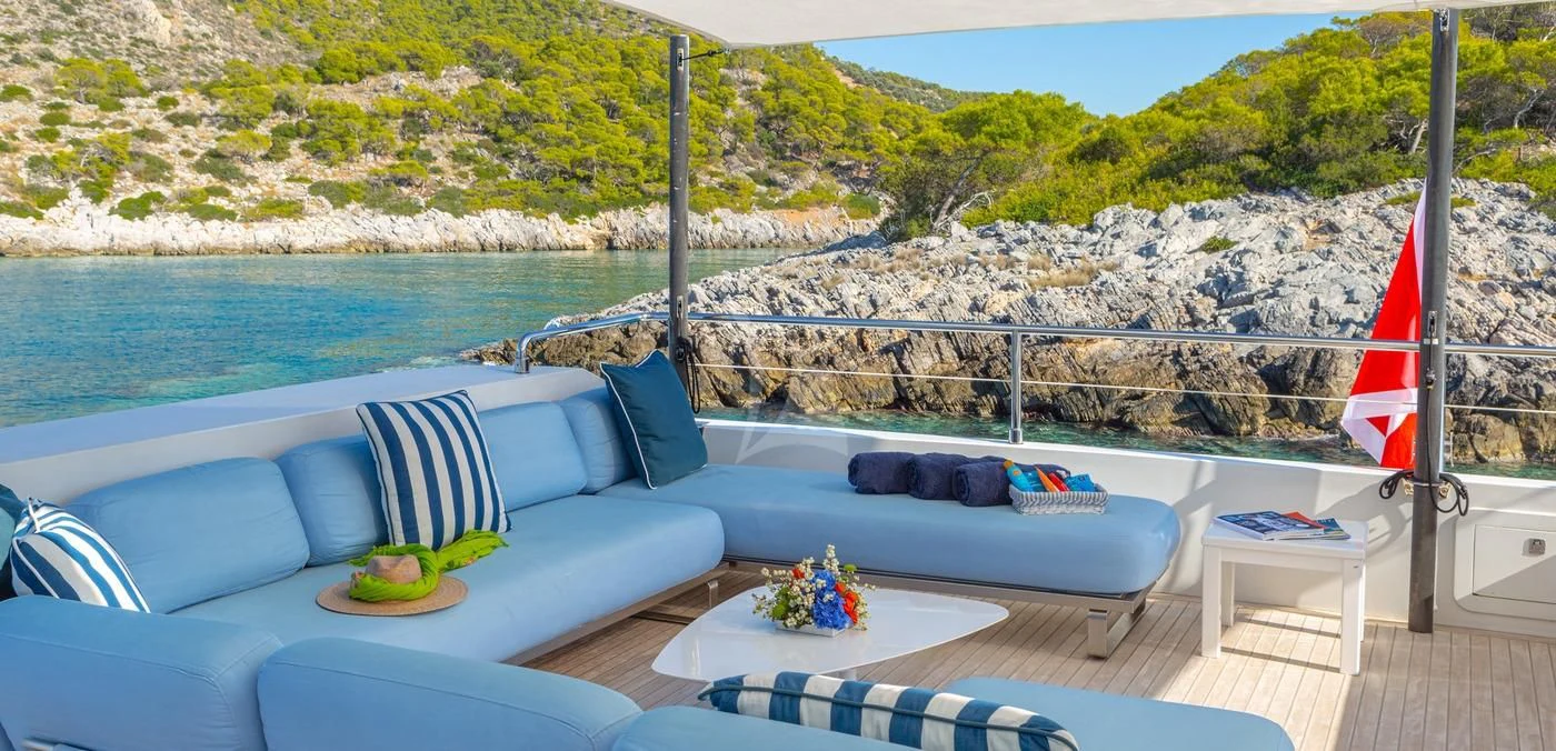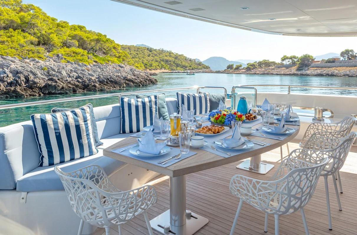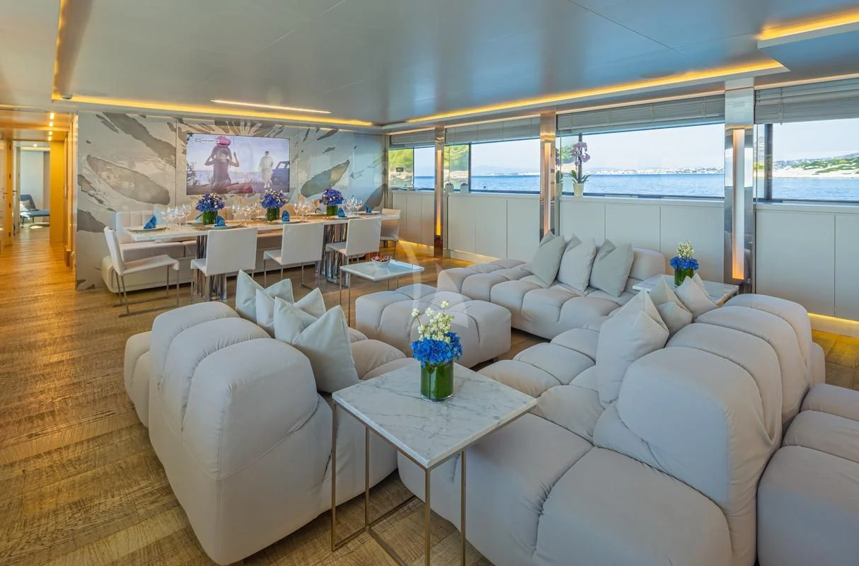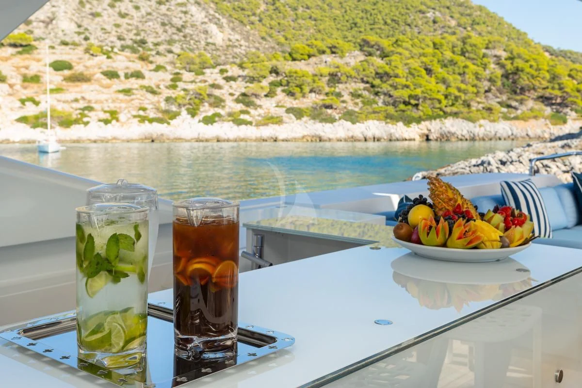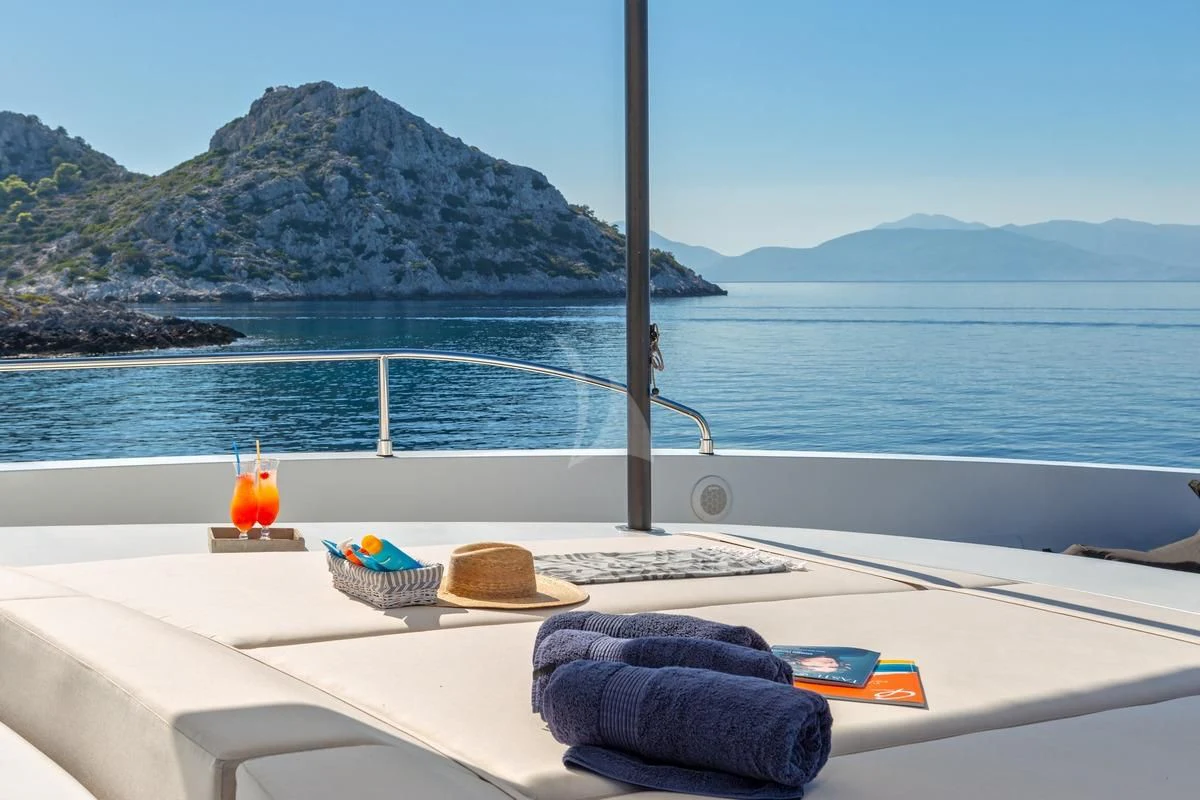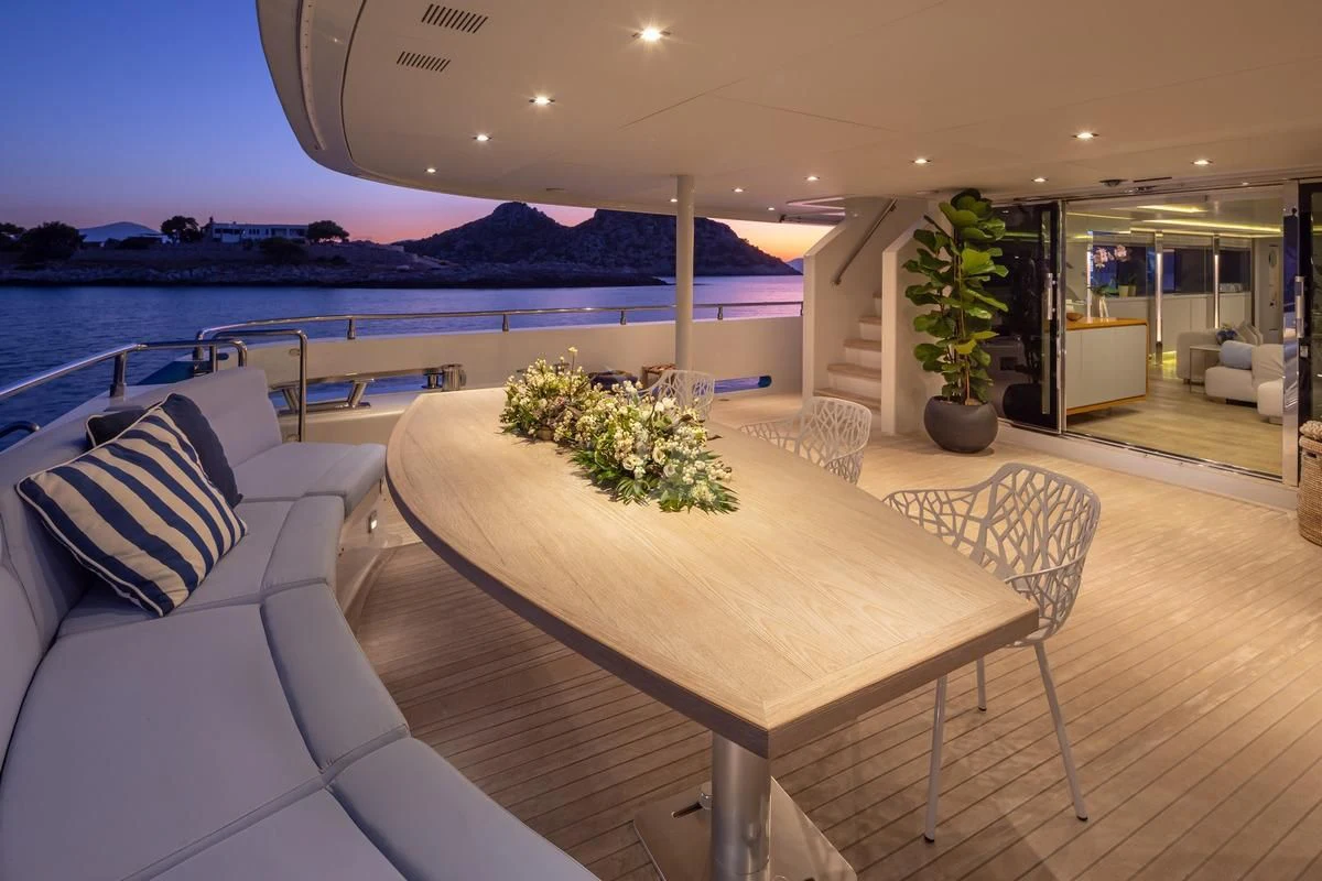 Decks on SEA WOLF provide an array of stylish spaces for sunbathing, socializing and entertaining, or simply soaking in the views this stunning region has to offer. The main aft deck offers a stunning spot for a lazy breakfast or casual lunch shaded by the upper deck overhang. The integrated sofa seating overlooks the stern to take in the action on the water or the colorful scenes of life in port. For sunset soirées and entertaining, the upper deck has it all, from a sit-up LED-lit bar for cocktails and an elegant alfresco dining table, to a comfy lounge, a huge plasma screen for movies and a Jacuzzi for relaxing dips day or night. Wide side decks lead to the foredeck where sun pads provide a quiet escape and uninterrupted bronzing during the day. For the best views on board and endless sunshine, the sundeck definitely lives up to its name. There are sun loungers, luxurious sun pads and extra wide sofas for relaxing or reclining with 360-degree views.