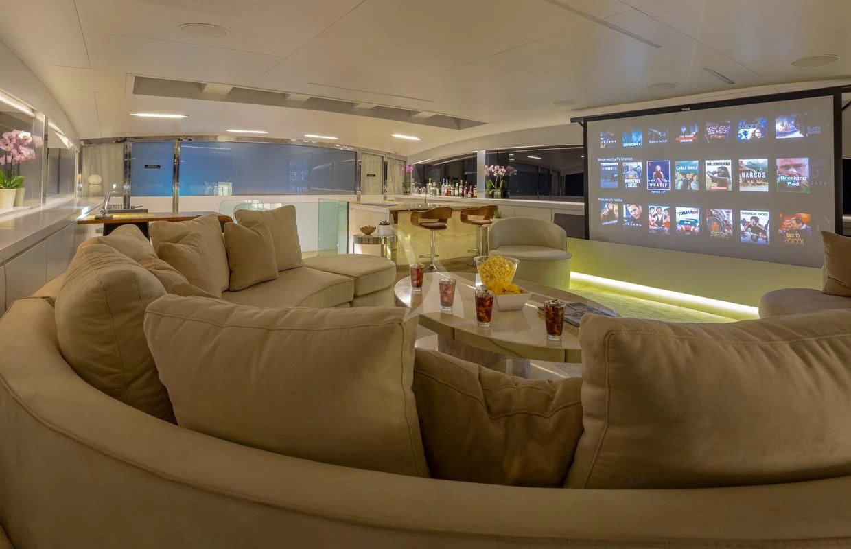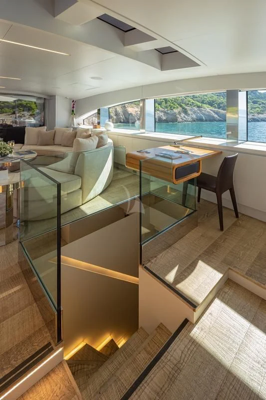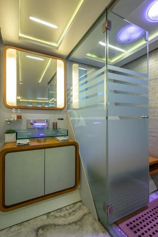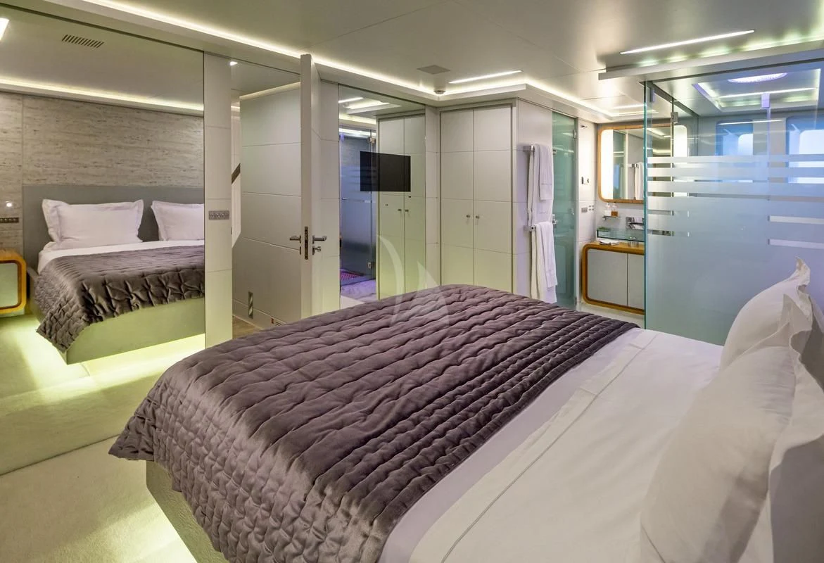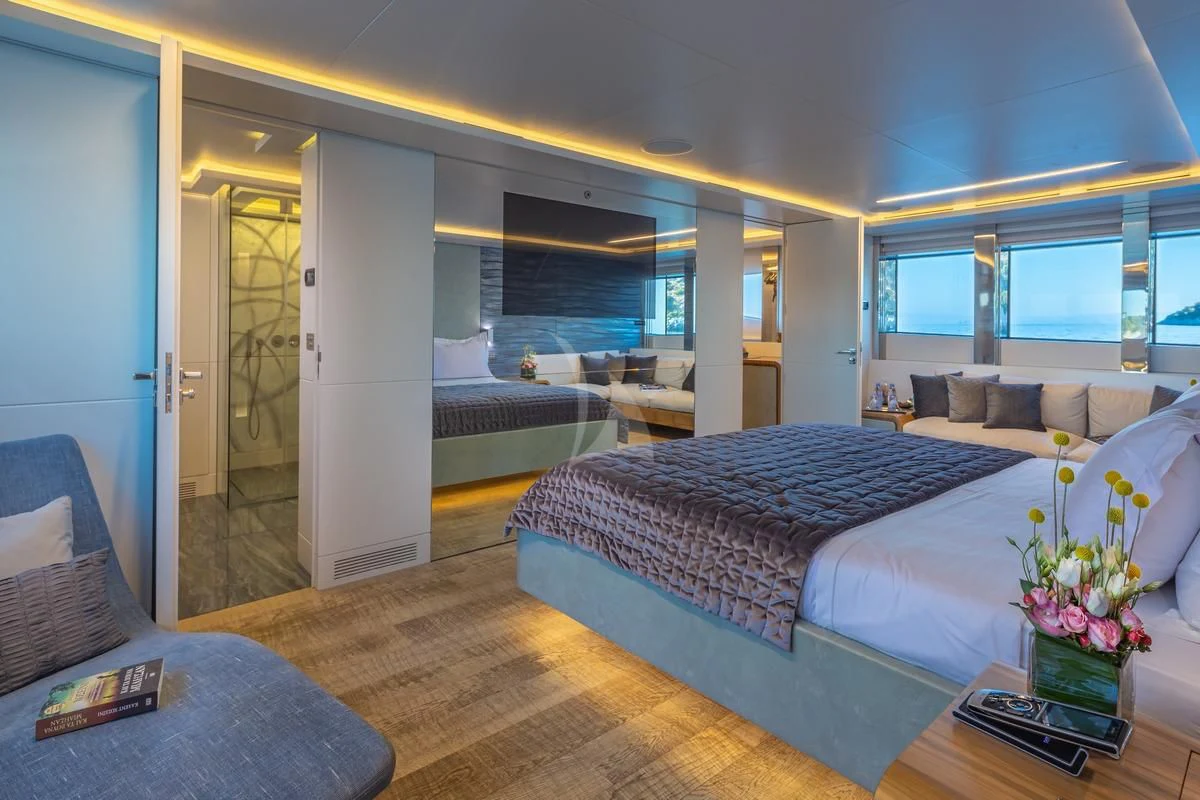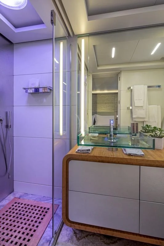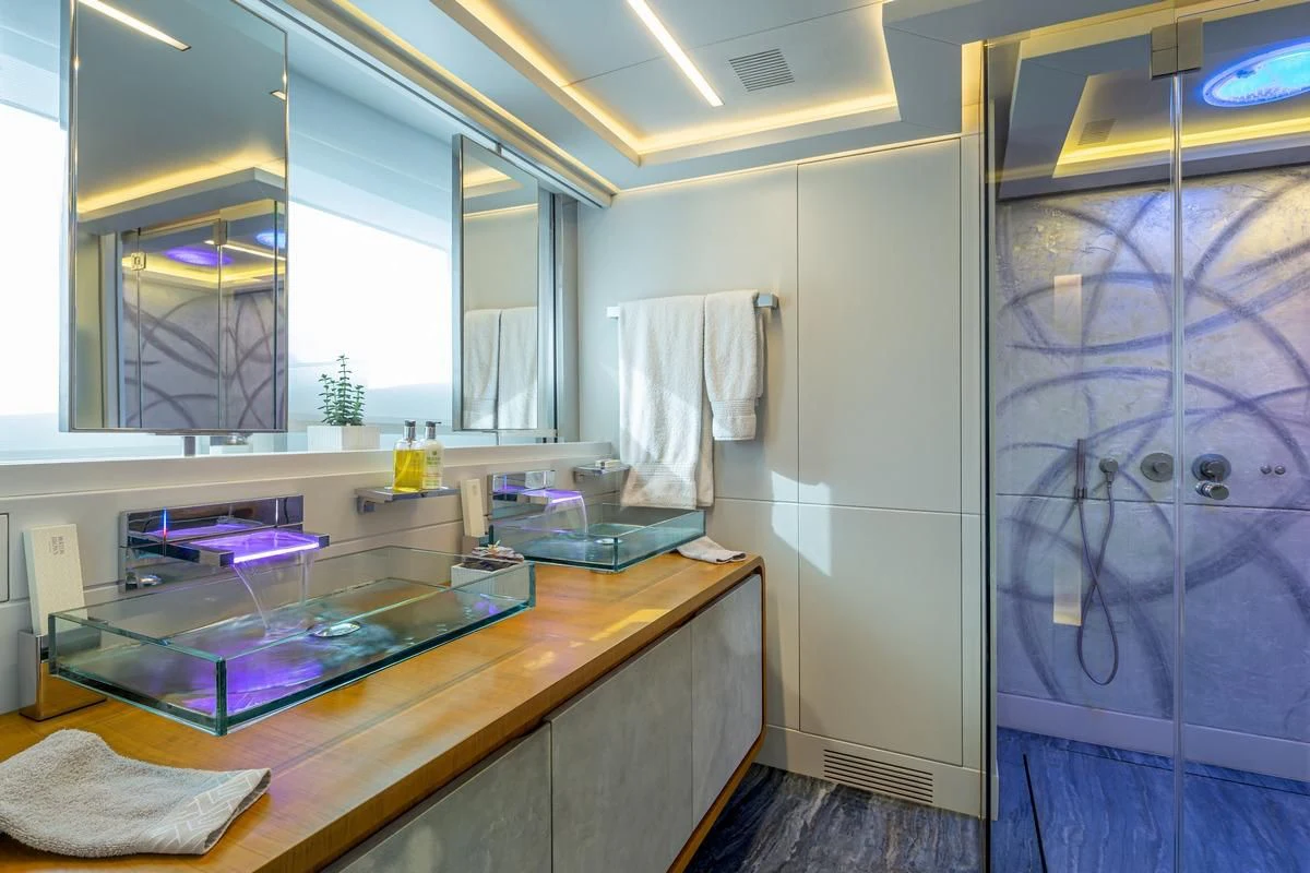 The same chic décor can be found in SEA WOLF’s six stunning staterooms. Spanning the full beam on the main deck, the master stateroom is particularly lavish. There’s a private office, indulgent king-size bed, lounge area in front of the massive windows, a walk-in closet and a his-and-hers ensuite bathroom. On the lower deck, the VIP stateroom also spans the full beam and showcases a king-size bed, lovely lounge area and generous ensuite shower room. There are a further two double staterooms and two twin cabins—each with a Pullman bunk—all with dedicated ensuite facilities and access to SEA WOLF’s impressive entertainment system.