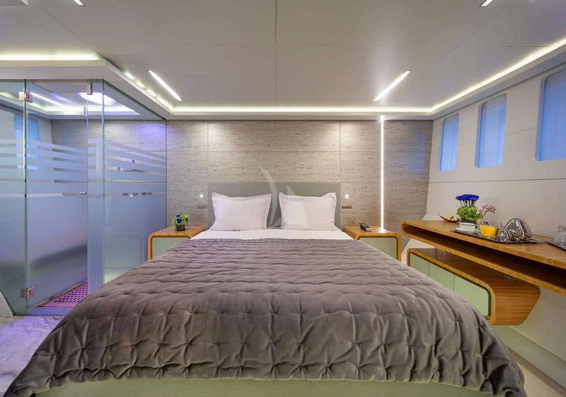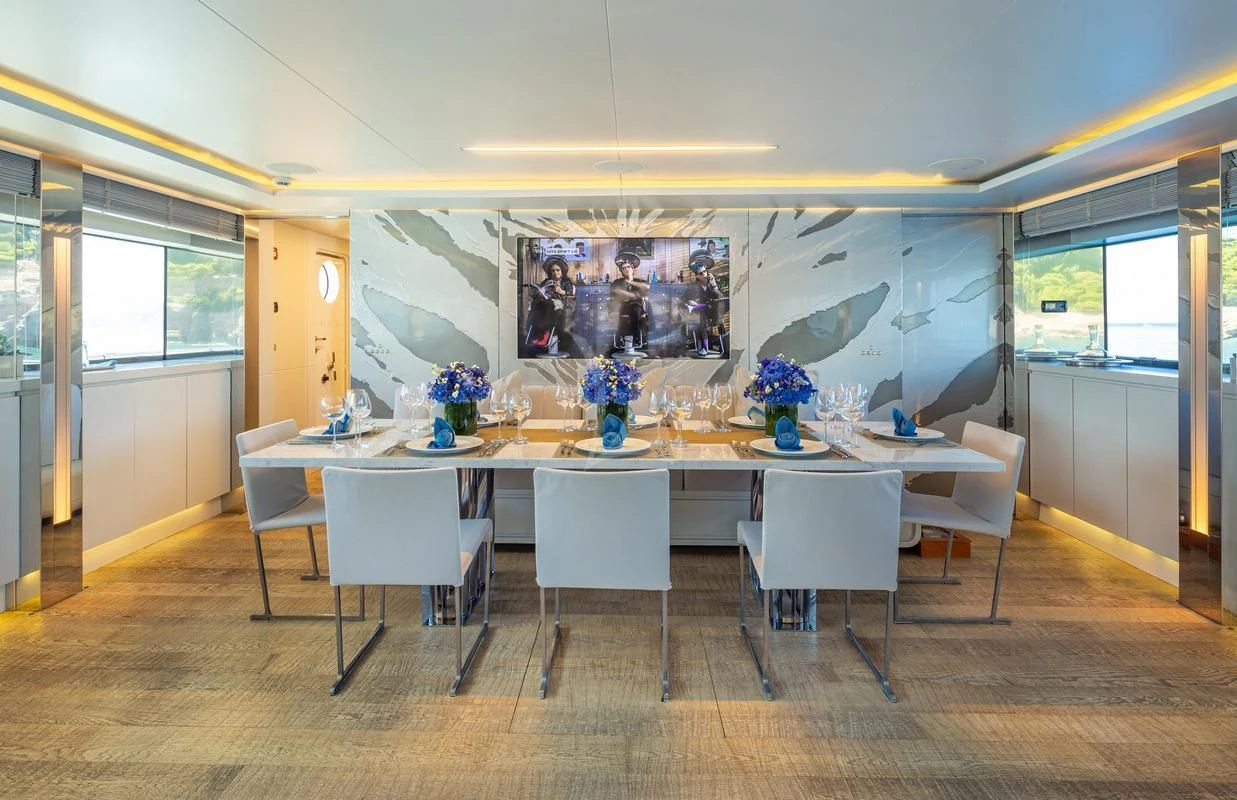 SEA WOLF’s interiors are nothing short of spectacular. Designed by the celebrated Luca Dini, the impressive volumes feature polished hardwood floors, crisp white furnishings, pops of energizing color and glittering chrome accents. There is also LED lighting throughout enabling guests to change the colors to suit their mood. The main salon is an impressive space with large beige leather sofas with bright blue throw pillows adding a splash of vibrancy. The open plan space leads forward to the dining table seating 12 for fabulous formal occasions. Panoramic windows embrace the space with natural light adding to the light and airy, beach house feel. The upper deck skylounge is another uber-comfortable space flooded with natural light. The oversized sofa and plush chaise longue are ideal for curling up to watch a movie on the wide-screen TV with a drink in hand from the handsome underlit onyx bar. There’s also a games table for cards and board games while taking in the views.