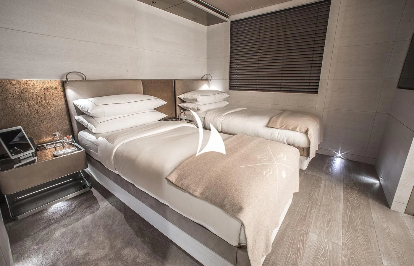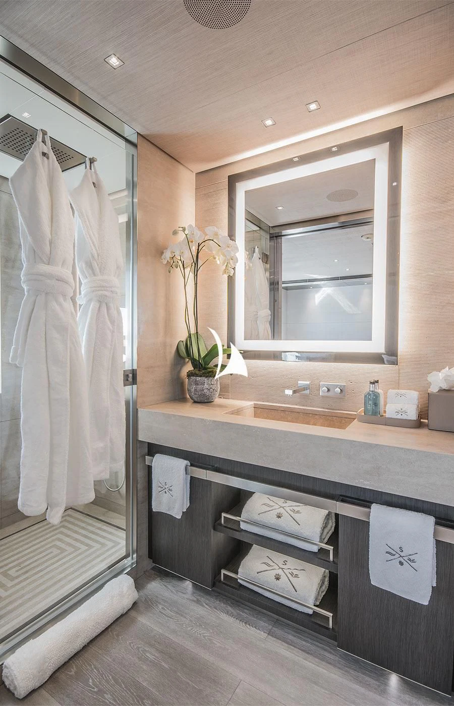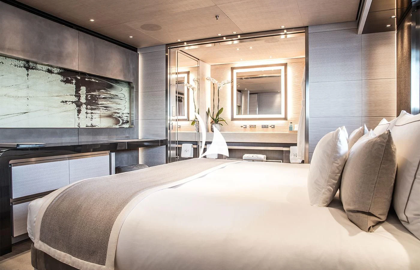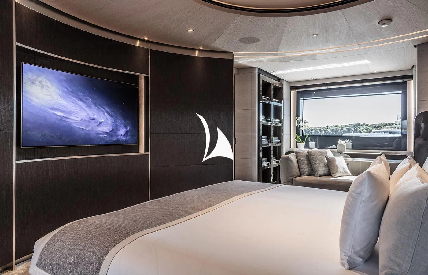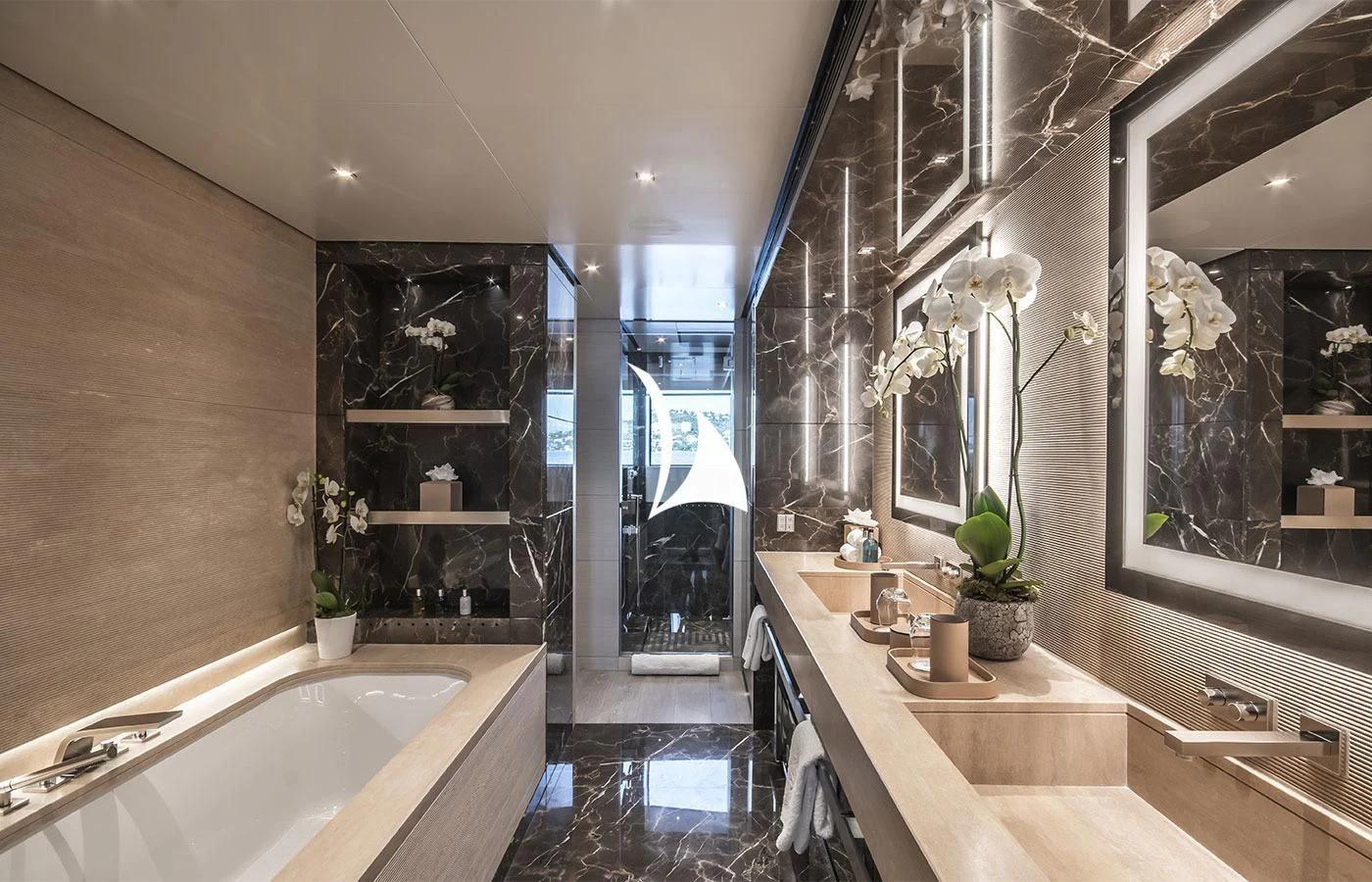 SEVERIN*S accommodates up to 12 guests across six staterooms, including her master suite on the main deck, two VIP staterooms, two double cabins and one convertible cabin. The two VIP staterooms are located on the lower deck. The accommodation layout is extremely versatile as the convertible cabin can also be used as a massage room or even a playroom if required. Her style throughout is sophisticated with the use of monochrome colors, with features of brass and marble.