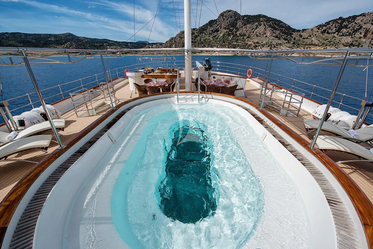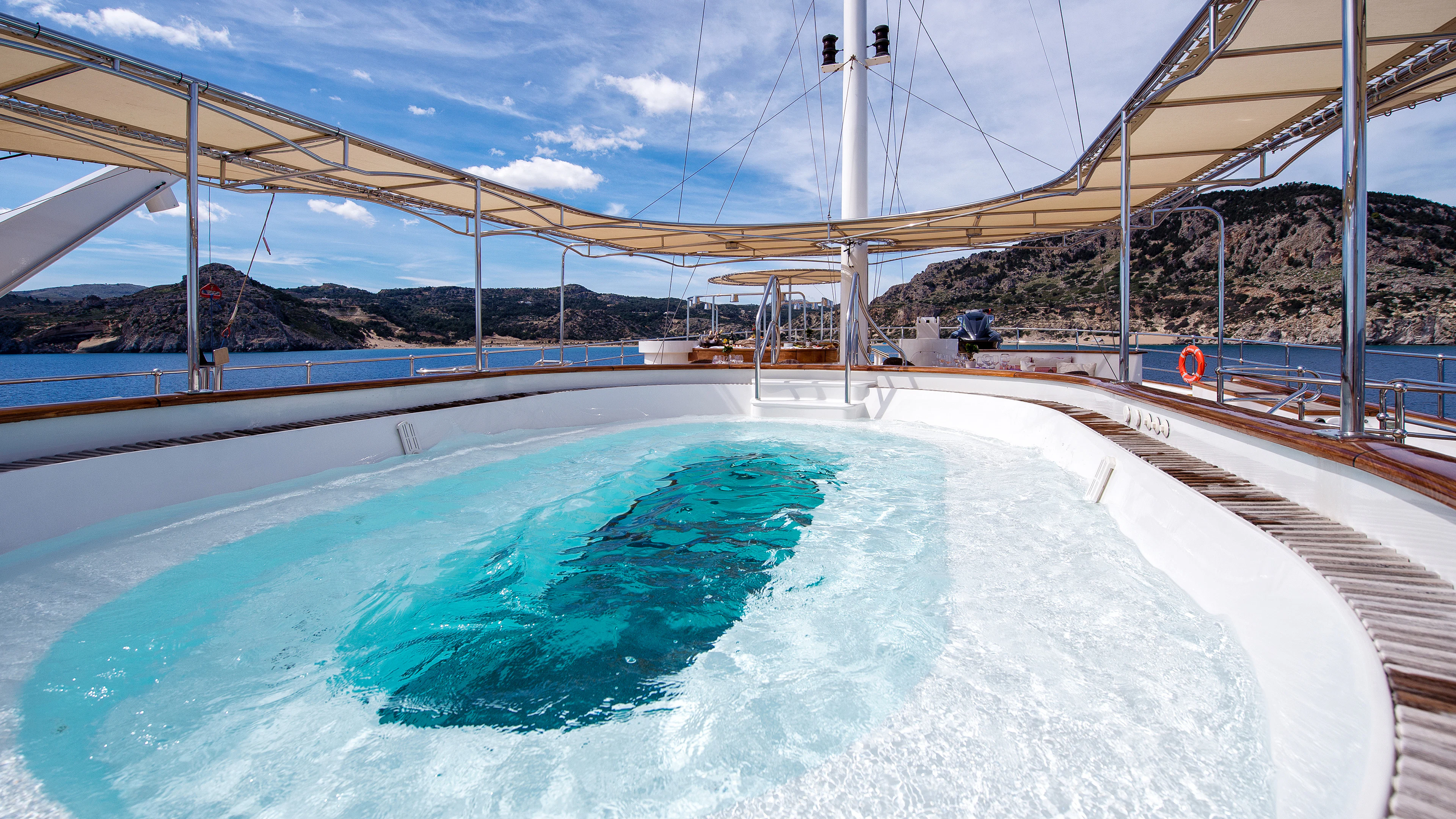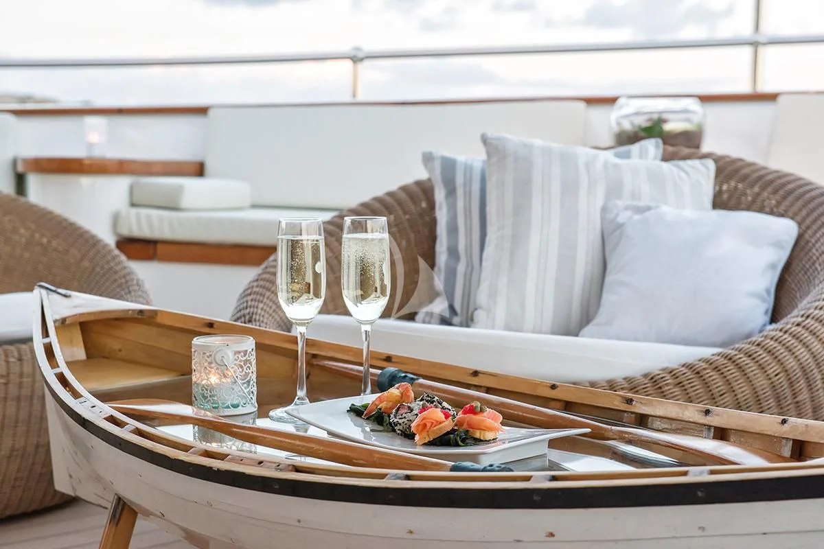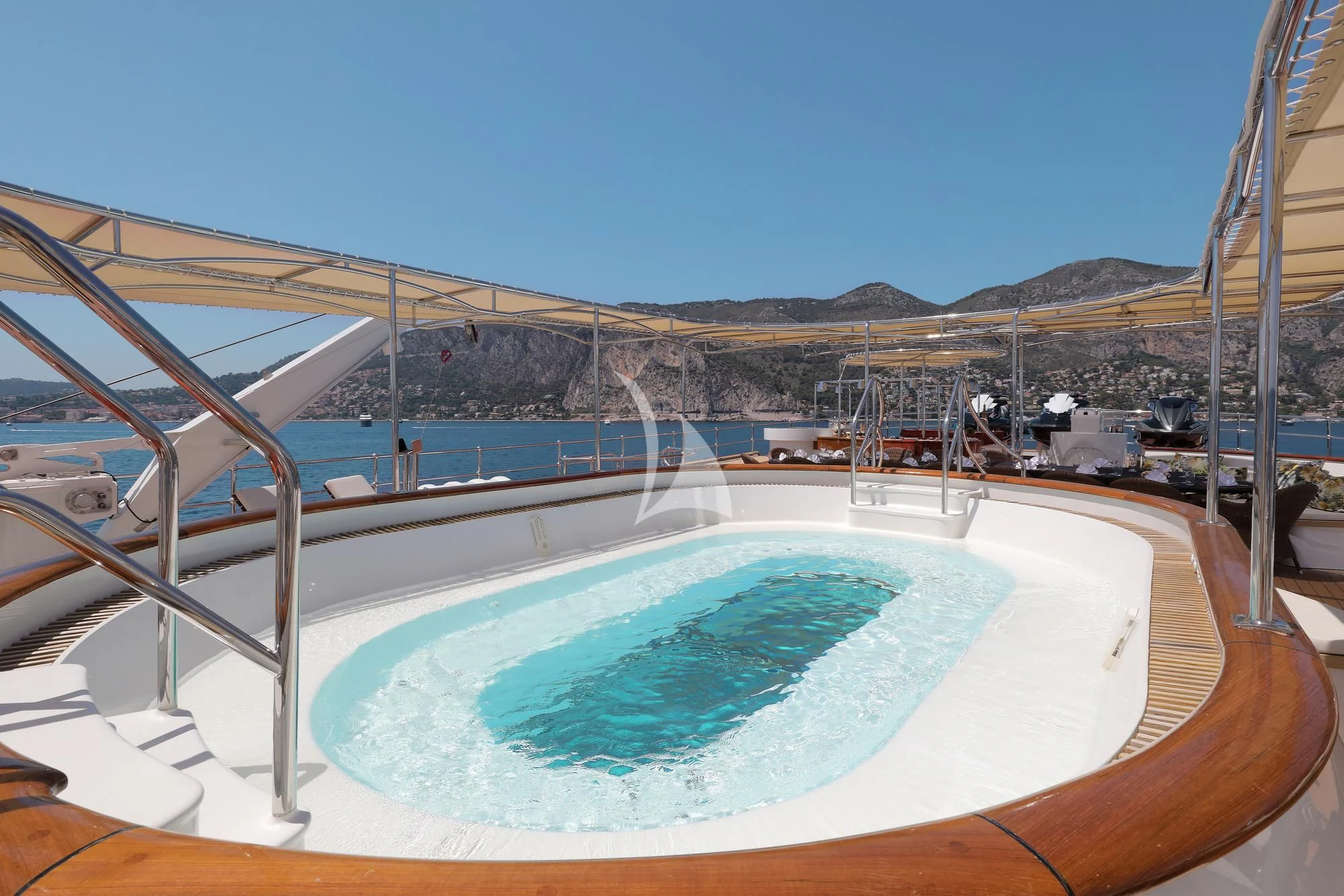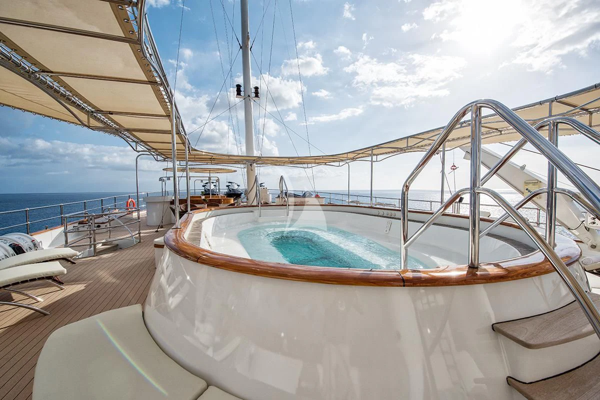 Outdoors, the wide, spacious decks of SHERAKHAN invite guests to take advantage of the alfresco living while on board. For the utmost in relaxation, SHERAKHAN features an 18-person Jacuzzi, a fully equipped onboard gym and spa and a beauty salon, with a trained masseuse on staff. She features a hydraulic swim platform and a tender garage allowing guests to easily access the water and the yacht’s host of water toys and tenders, including a classic Dutch tender for excursions, WaveRunners, Jet Skis, wakeboards and more for guests to enjoy while on board. She also has 19 crewmembers on hand to ensure the epitome of five-star service is maintained.