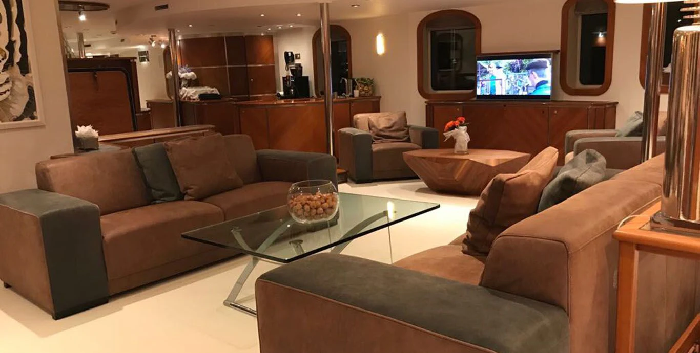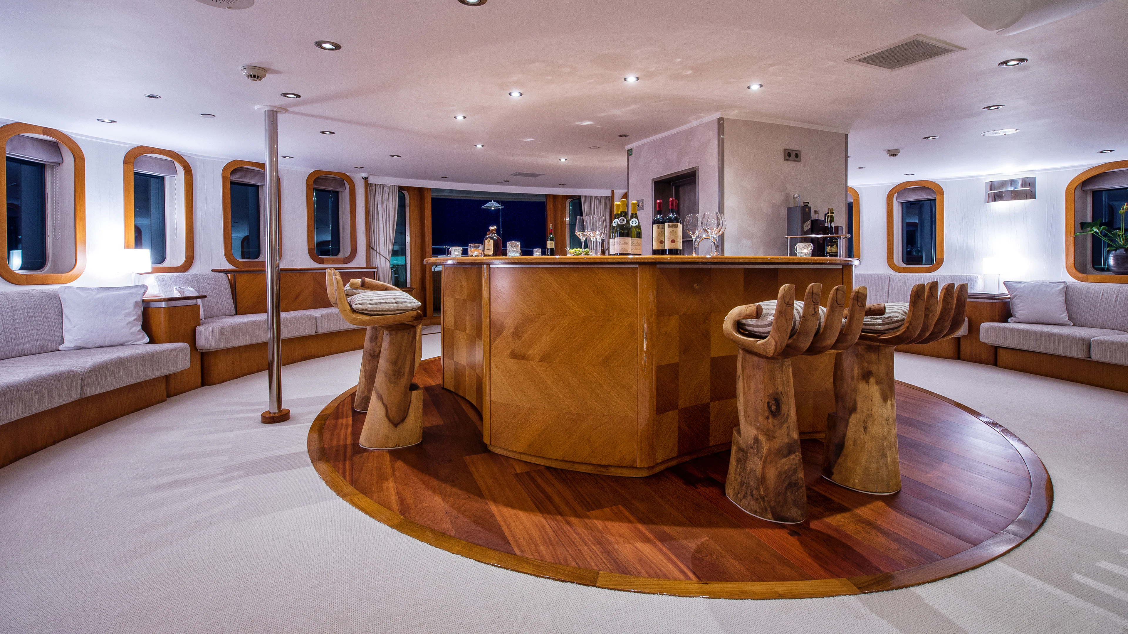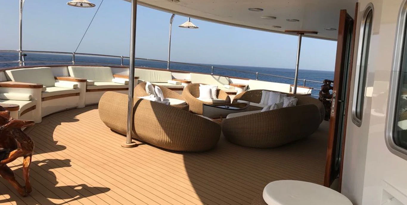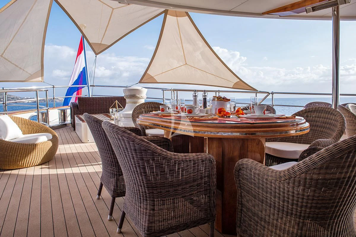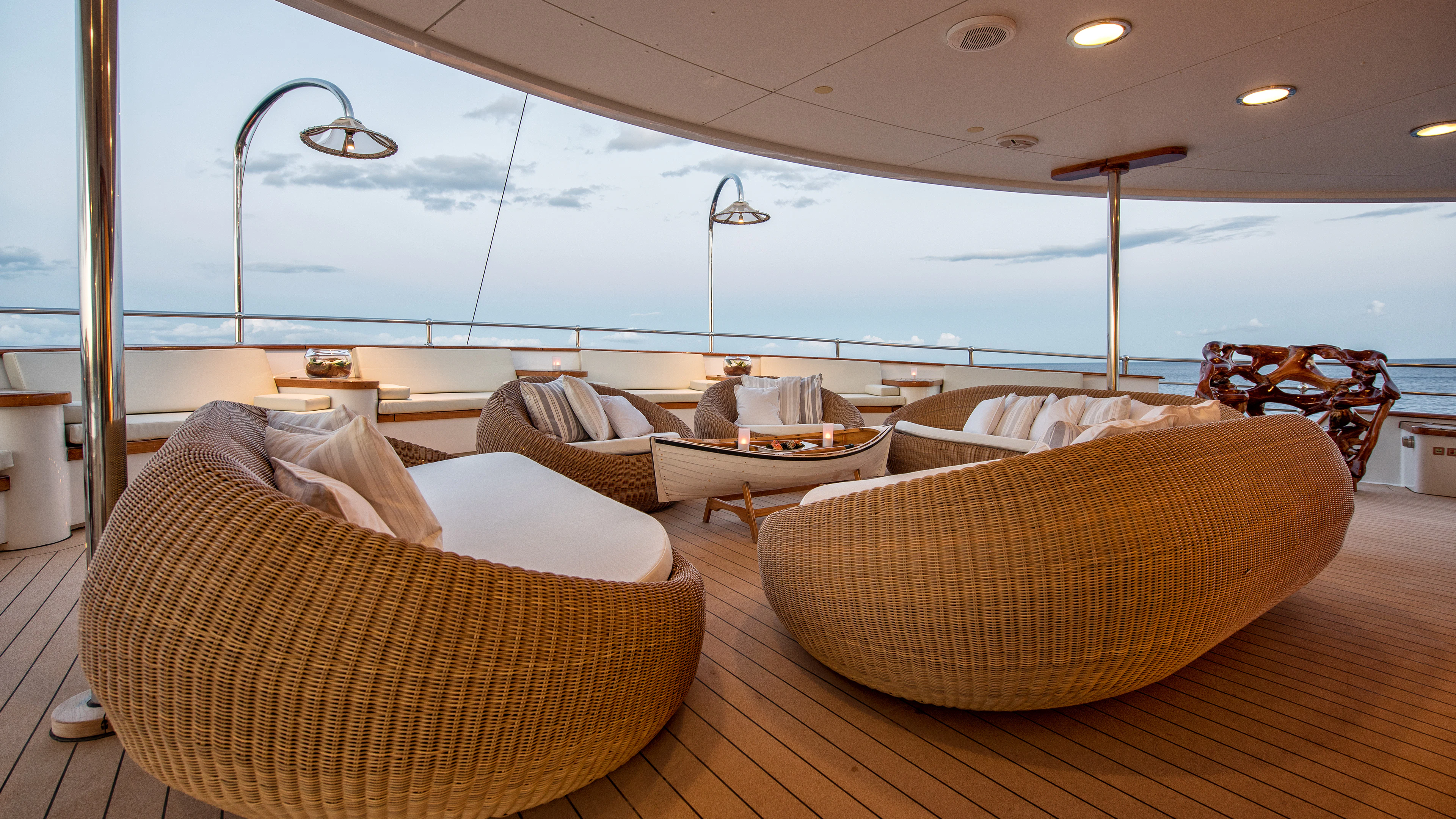 Outdoors, the wide, spacious decks of SHERAKHAN invite guests to take advantage of the alfresco living while on board. For the utmost in relaxation, SHERAKHAN features an 18-person Jacuzzi, a fully equipped onboard gym and spa and a beauty salon, with a trained masseuse on staff. She features a hydraulic swim platform and a tender garage allowing guests to easily access the water and the yacht’s host of water toys and tenders, including a classic Dutch tender for excursions, WaveRunners, Jet Skis, wakeboards and more for guests to enjoy while on board. She also has 19 crewmembers on hand to ensure the epitome of five-star service is maintained.