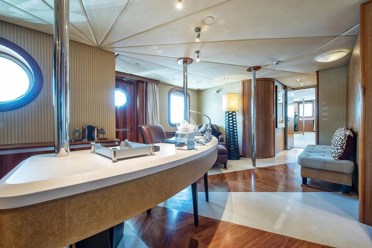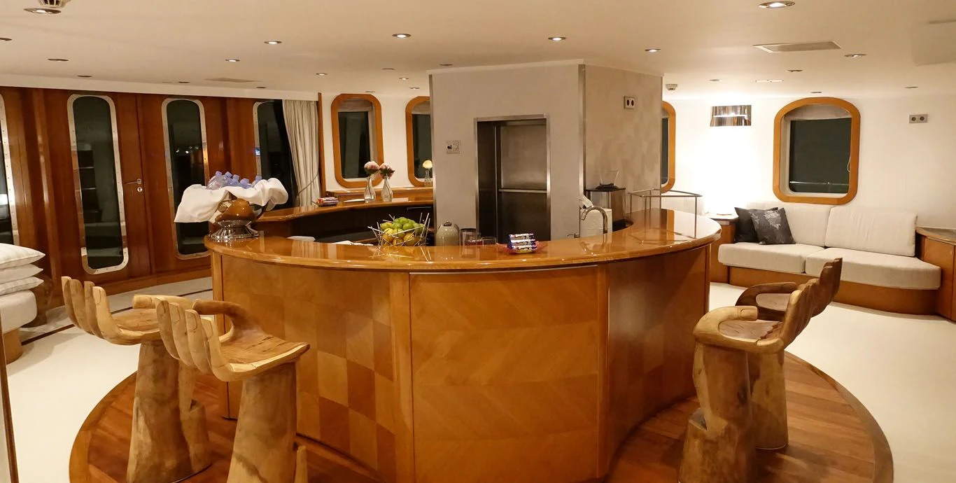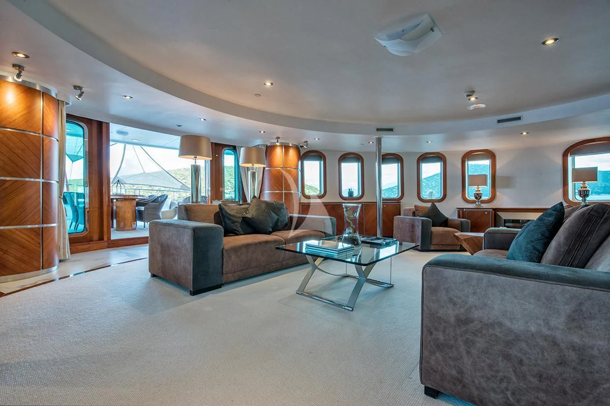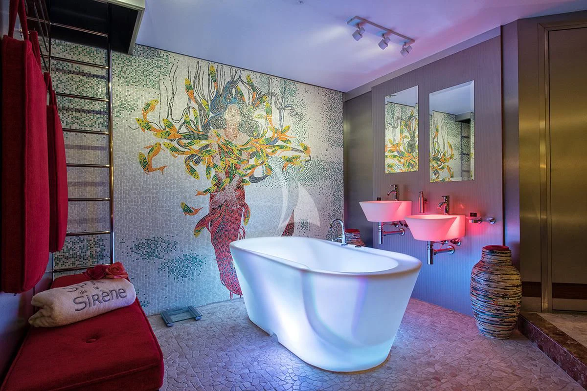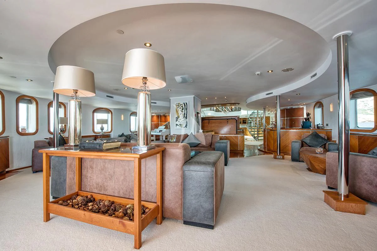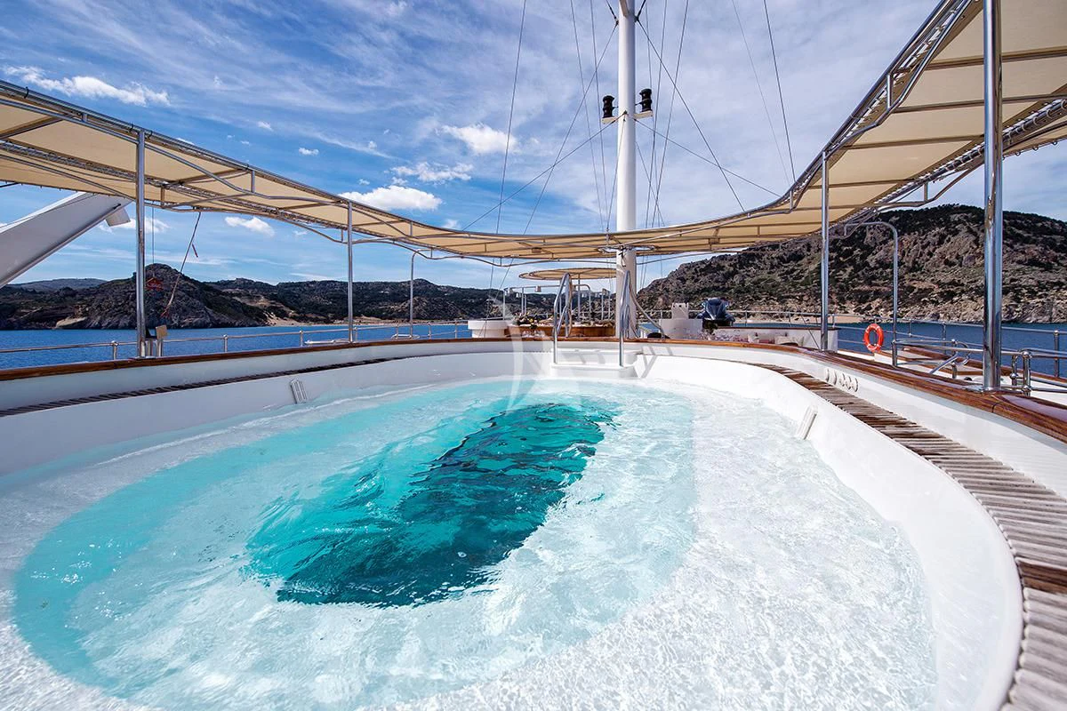 Outdoors, the wide, spacious decks of SHERAKHAN invite guests to take advantage of the alfresco living while on board. For the utmost in relaxation, SHERAKHAN features an 18-person Jacuzzi, a fully equipped onboard gym and spa and a beauty salon, with a trained masseuse on staff. She features a hydraulic swim platform and a tender garage allowing guests to easily access the water and the yacht’s host of water toys and tenders, including a classic Dutch tender for excursions, WaveRunners, Jet Skis, wakeboards and more for guests to enjoy while on board. She also has 19 crewmembers on hand to ensure the epitome of five-star service is maintained.