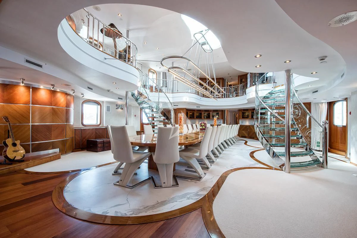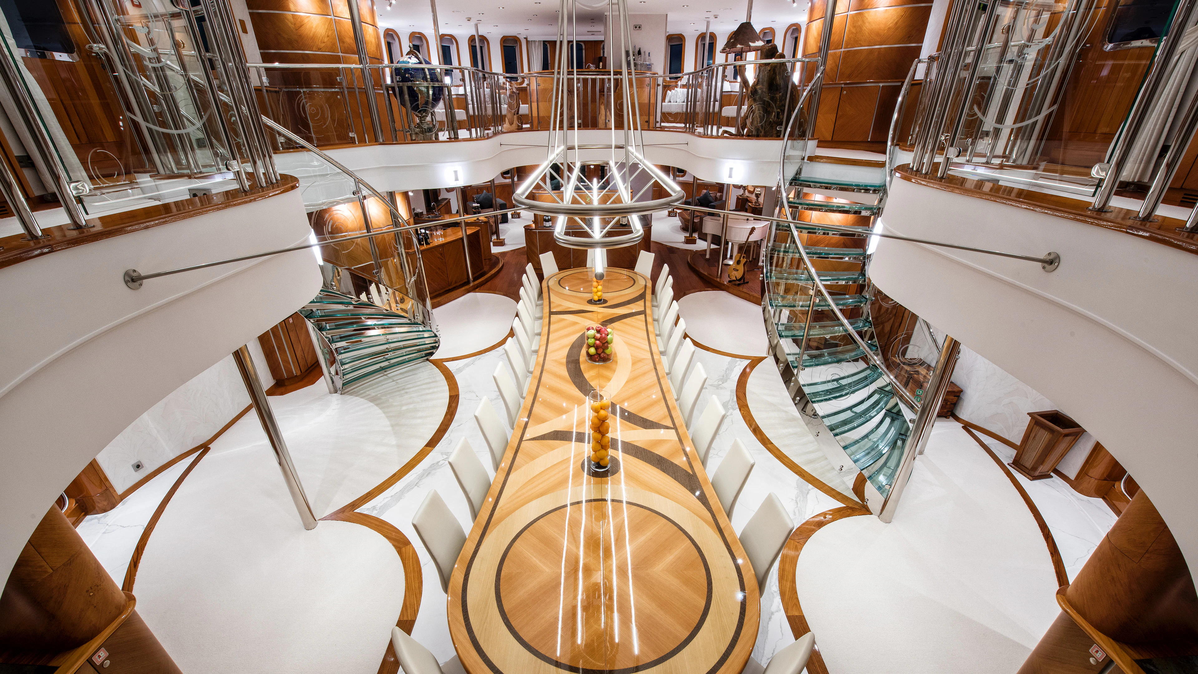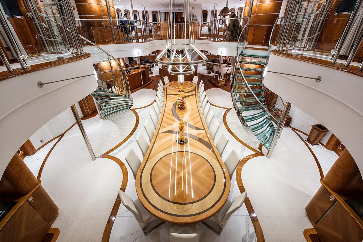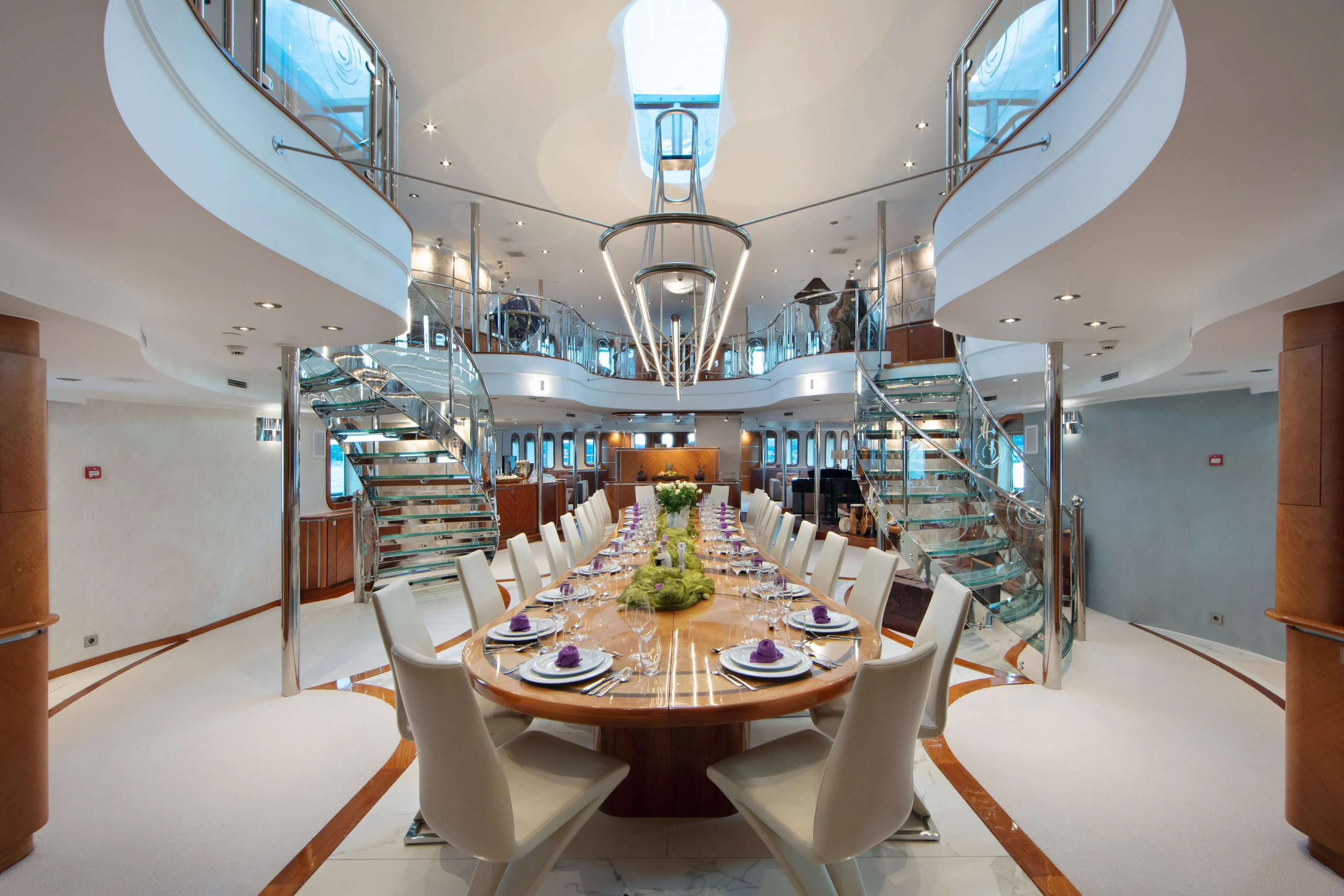 This stunning yacht is able to sleep up to 26 guests in the utmost of comfort and style. Her 13 staterooms include a master suite, two VIP staterooms, four doubles, six twins and two singles, ensuring she is ideally suited for family cruising and can carry nannies, teachers, security and other staff aboard. Her interior is elegantly styled with resplendent furnishings and utilizes a beautiful mix of traditional and contemporary aesthetics to create an inviting and home-like atmosphere on board. Luxury charter yacht SHERAKHAN’s sophisticated formal dining space, located forward of the main salon on the main deck, is able to seat up to 22 guests. This seven-meter atrium is bathed in natural light from the glass-bottomed Jacuzzi.