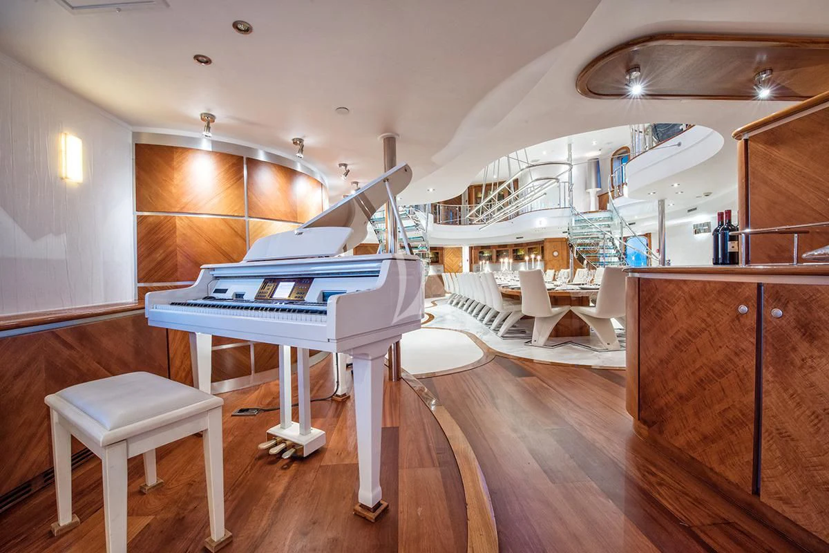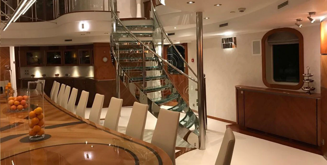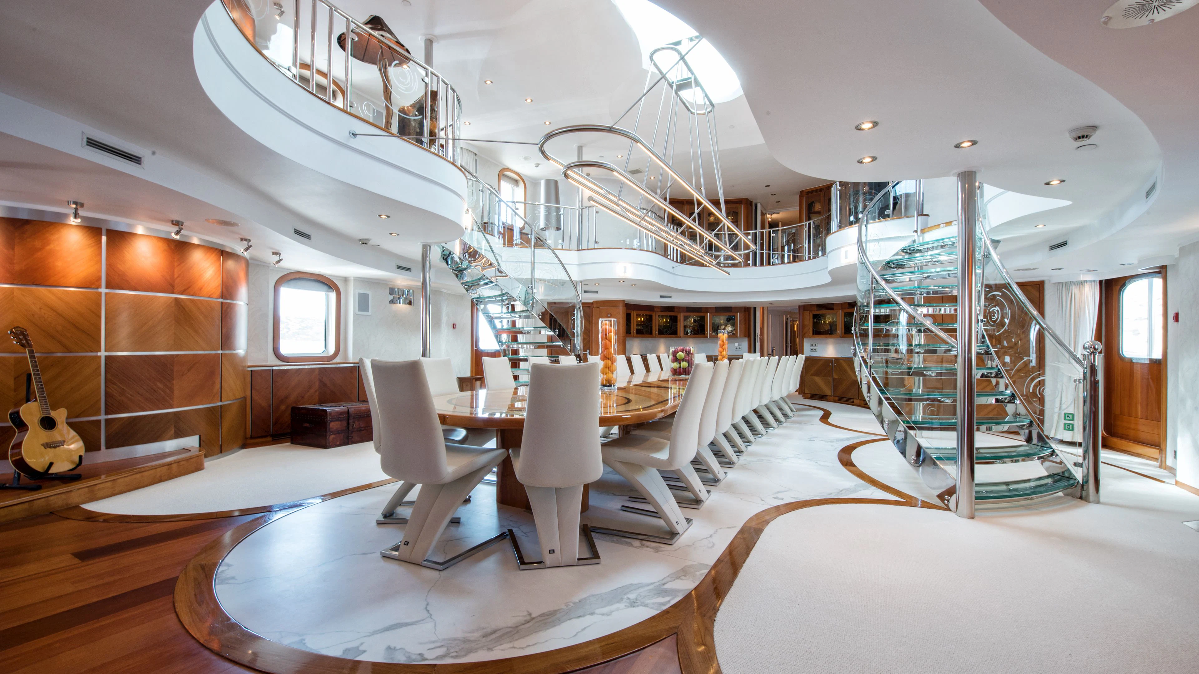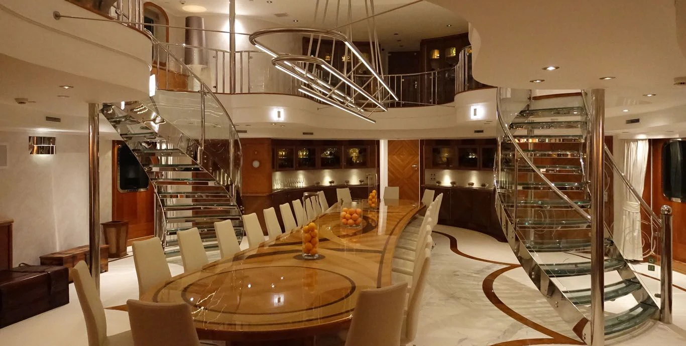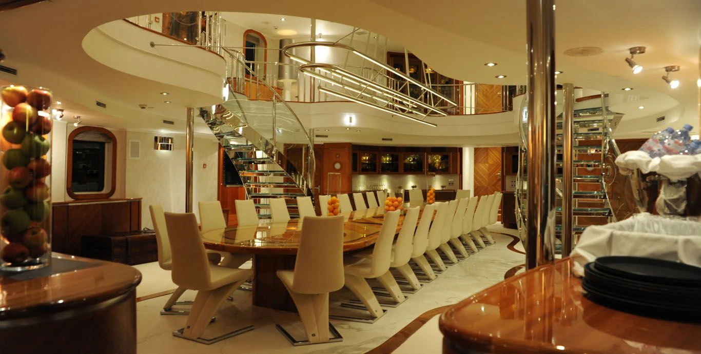 This stunning yacht is able to sleep up to 26 guests in the utmost of comfort and style. Her 13 staterooms include a master suite, two VIP staterooms, four doubles, six twins and two singles, ensuring she is ideally suited for family cruising and can carry nannies, teachers, security and other staff aboard. Her interior is elegantly styled with resplendent furnishings and utilizes a beautiful mix of traditional and contemporary aesthetics to create an inviting and home-like atmosphere on board. Luxury charter yacht SHERAKHAN’s sophisticated formal dining space, located forward of the main salon on the main deck, is able to seat up to 22 guests. This seven-meter atrium is bathed in natural light from the glass-bottomed Jacuzzi.