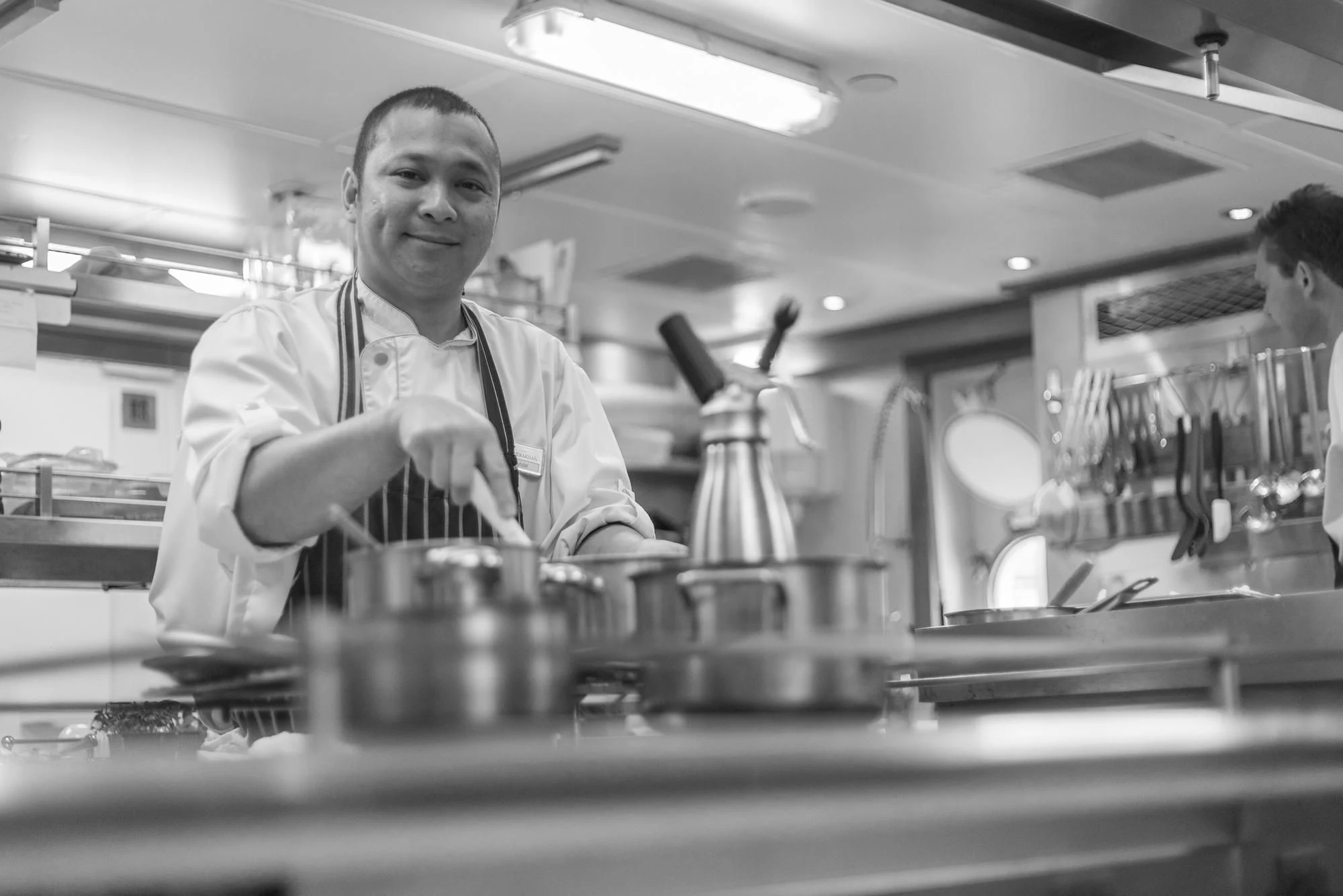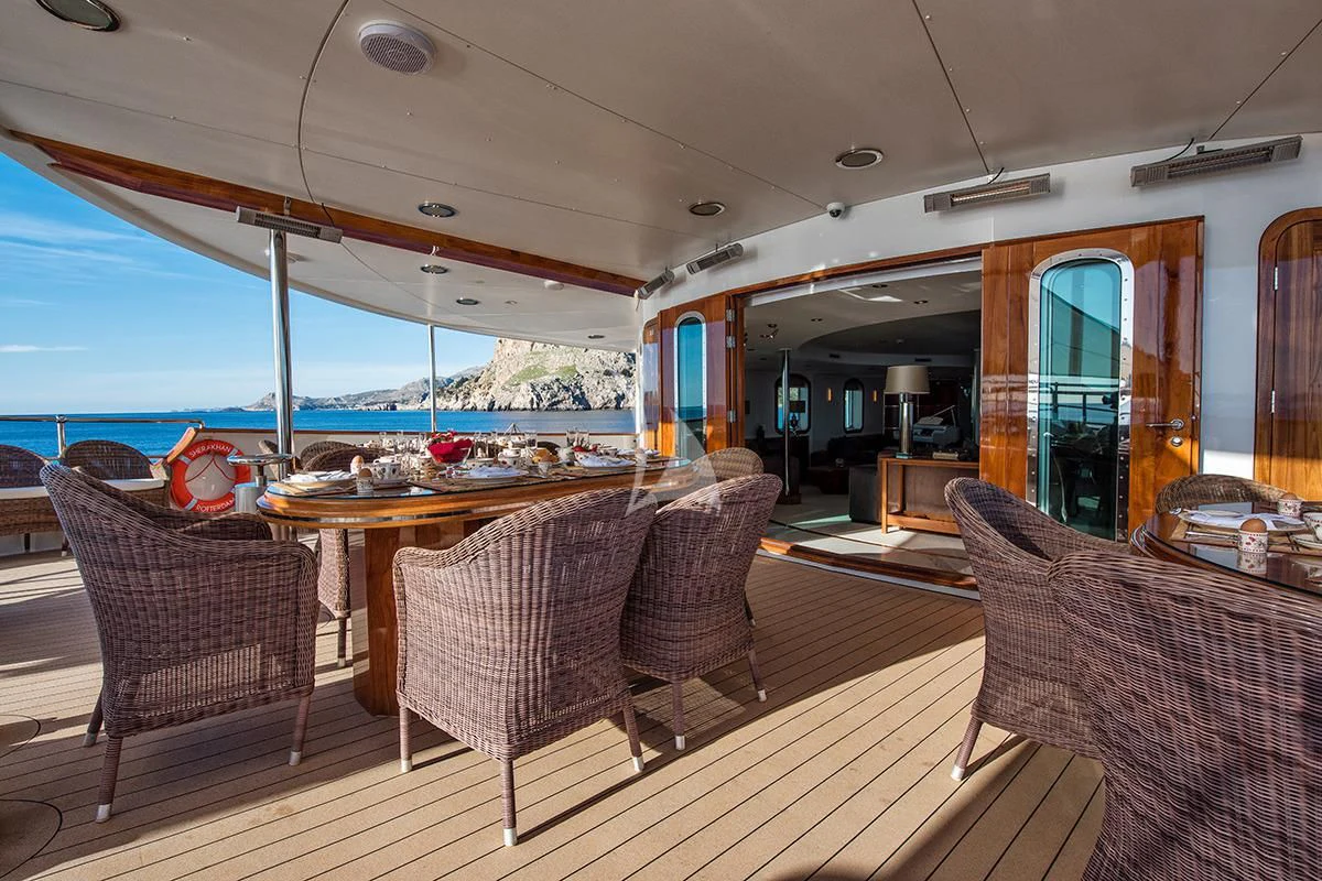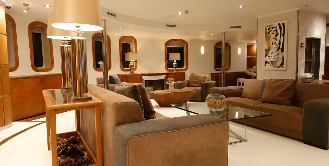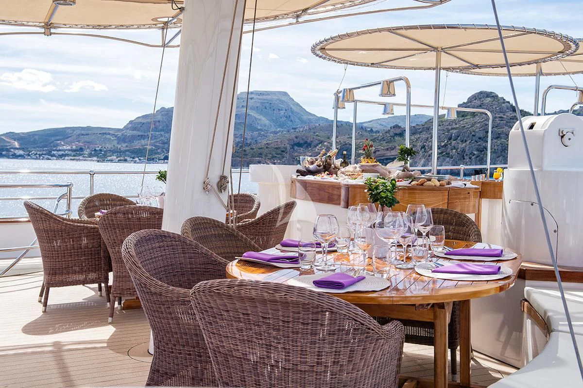 This stunning yacht is able to sleep up to 26 guests in the utmost of comfort and style. Her 13 staterooms include a master suite, two VIP staterooms, four doubles, six twins and two singles, ensuring she is ideally suited for family cruising and can carry nannies, teachers, security and other staff aboard. Her interior is elegantly styled with resplendent furnishings and utilizes a beautiful mix of traditional and contemporary aesthetics to create an inviting and home-like atmosphere on board. Luxury charter yacht SHERAKHAN’s sophisticated formal dining space, located forward of the main salon on the main deck, is able to seat up to 22 guests. This seven-meter atrium is bathed in natural light from the glass-bottomed Jacuzzi.