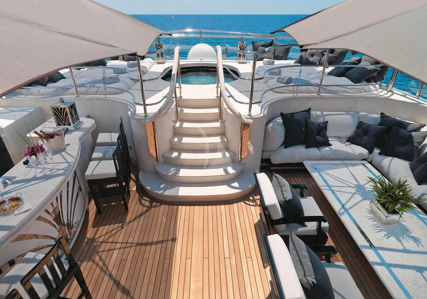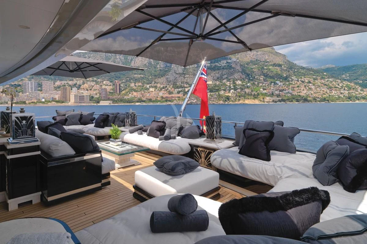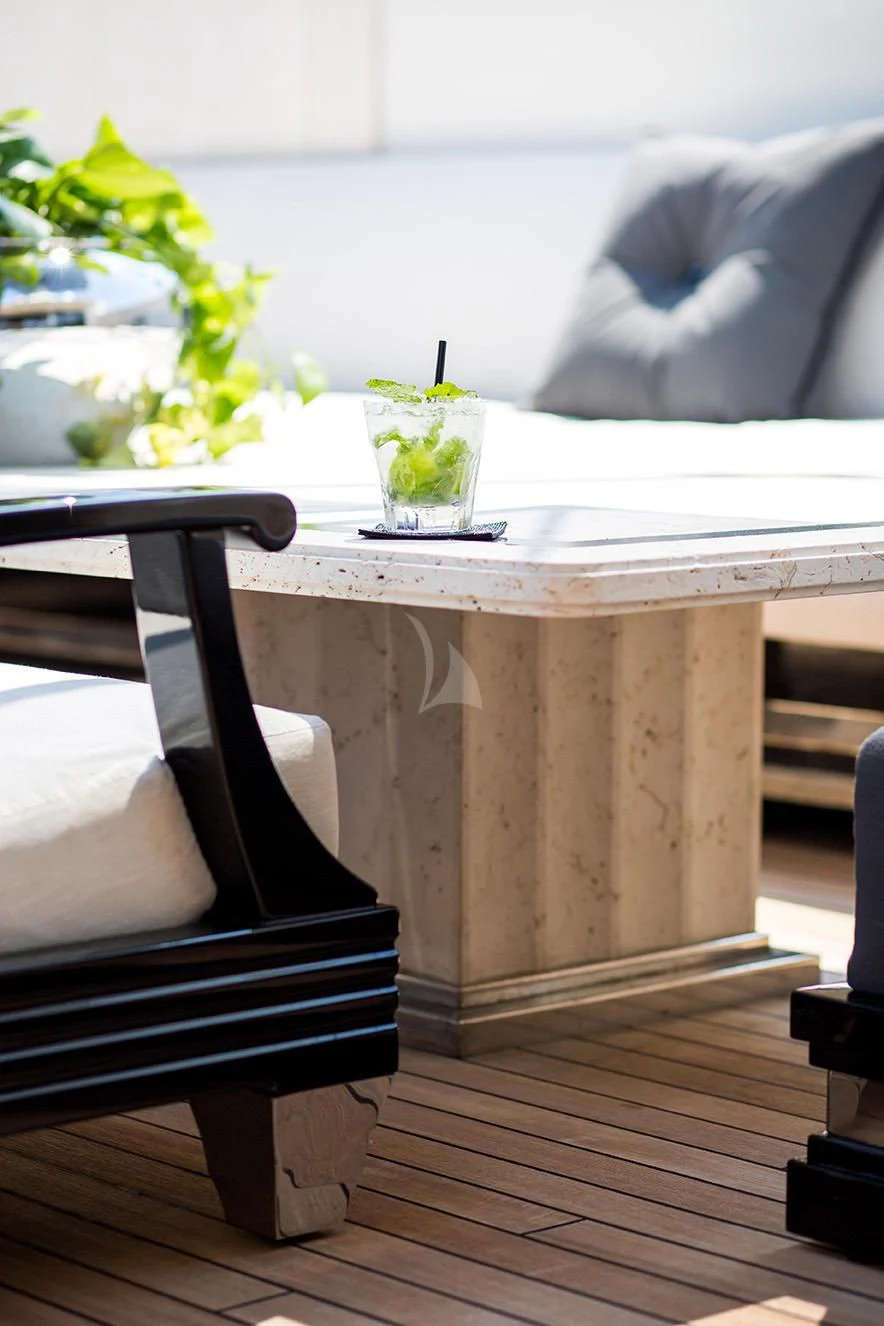 SILVER ANGEL offers guests an abundance of space to relax. Her stunning sundeck houses one of the most impressive spa pools to be found on any yacht. The raised oval Jacuzzi is surrounded with sun pads and glass windbreaks and is the perfect place from which to enjoy uninterrupted views. There is also a bar and further sumptuous seating, with a large coffee table and armchairs. Throughout her outdoor guest areas the use of travertine adds to the luxurious feel that SILVER ANGEL provides. Large alfresco dining areas are situated on both her upper and main deck aft areas, providing ample opportunity to change the scene throughout a charter.