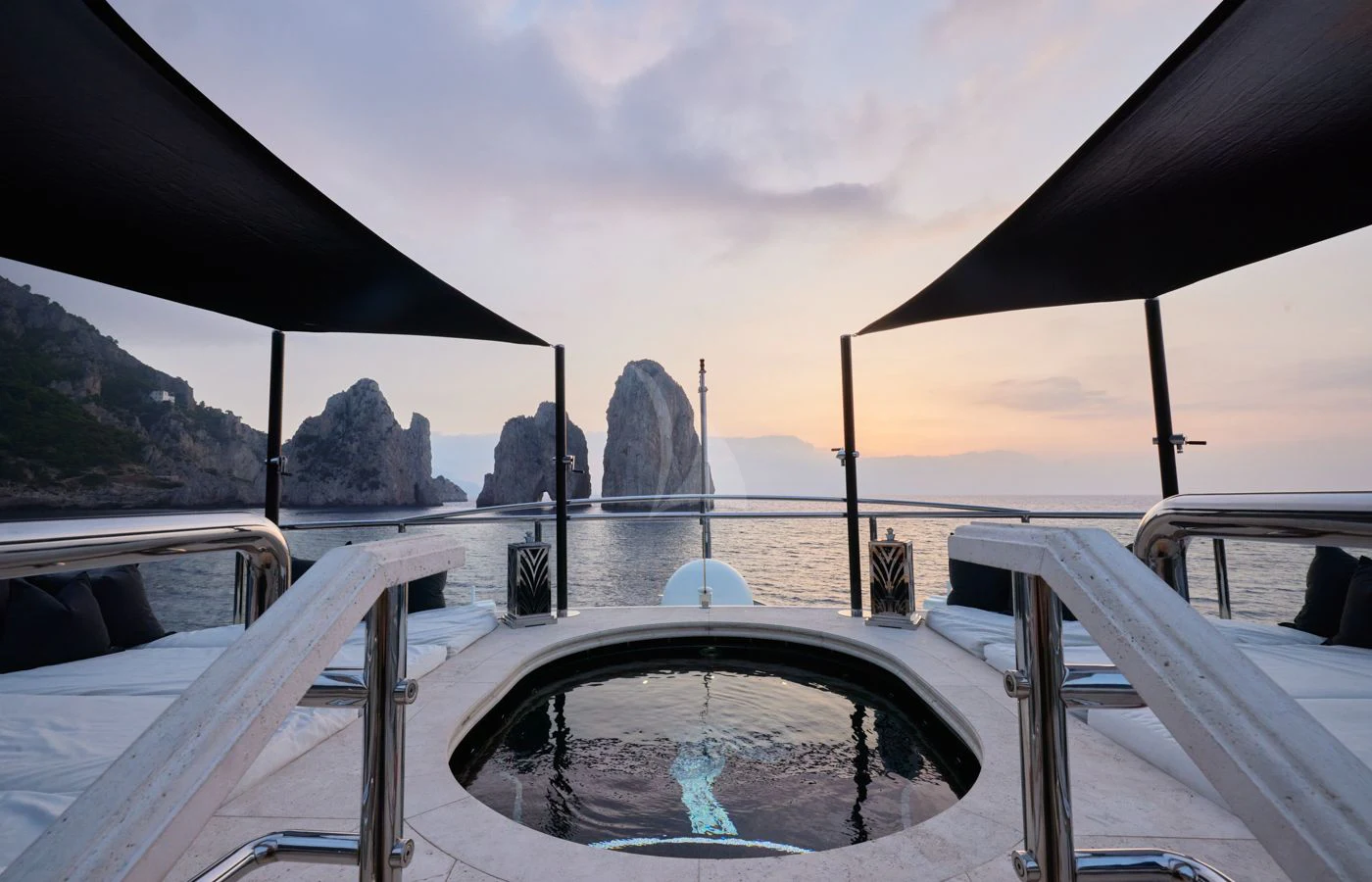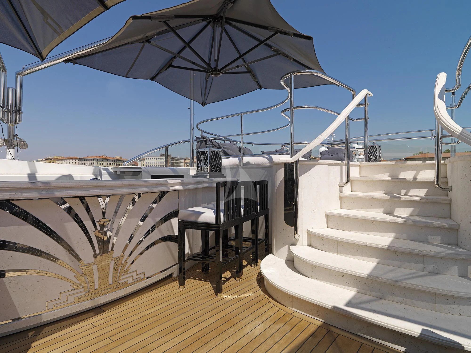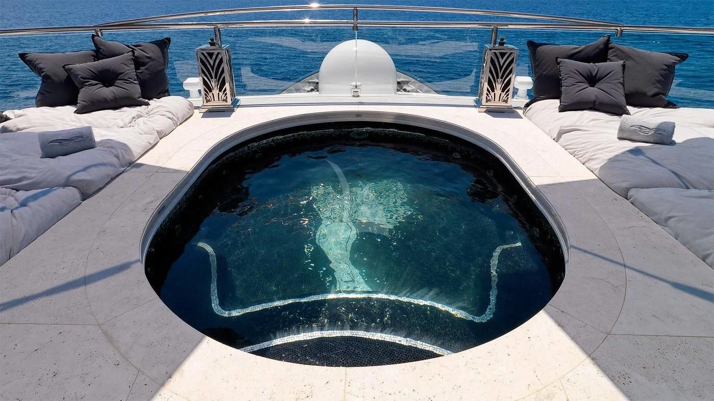 SILVER ANGEL offers guests an abundance of space to relax. Her stunning sundeck houses one of the most impressive spa pools to be found on any yacht. The raised oval Jacuzzi is surrounded with sun pads and glass windbreaks and is the perfect place from which to enjoy uninterrupted views. There is also a bar and further sumptuous seating, with a large coffee table and armchairs. Throughout her outdoor guest areas the use of travertine adds to the luxurious feel that SILVER ANGEL provides. Large alfresco dining areas are situated on both her upper and main deck aft areas, providing ample opportunity to change the scene throughout a charter.