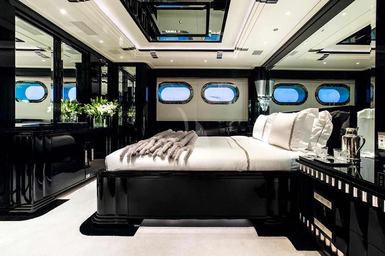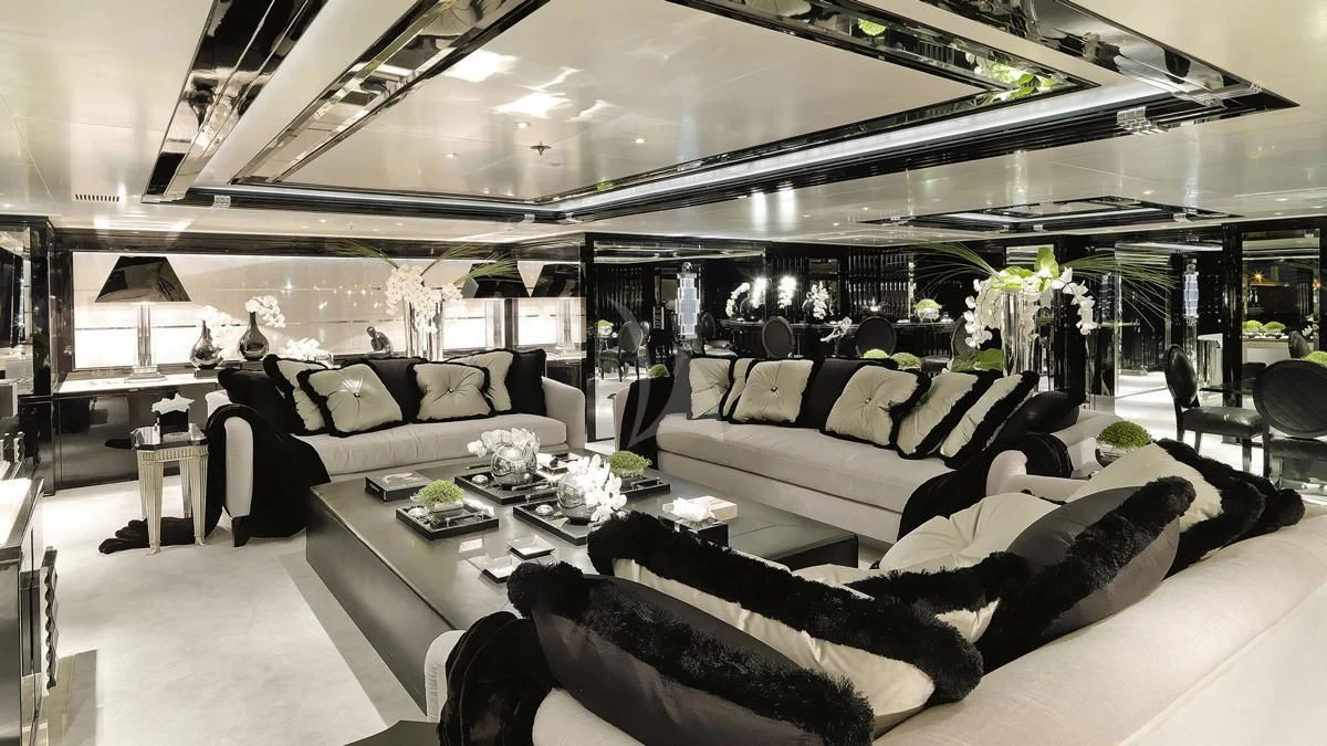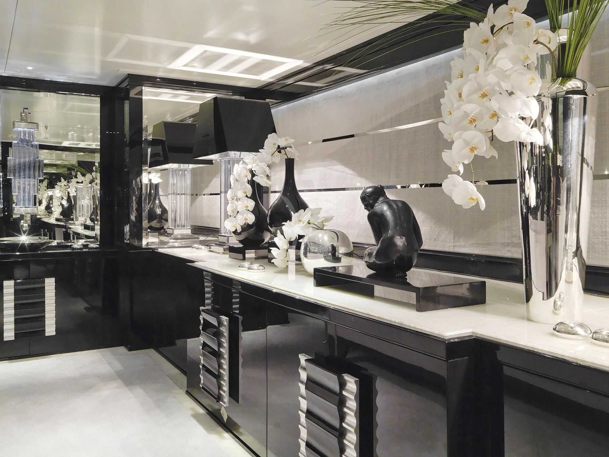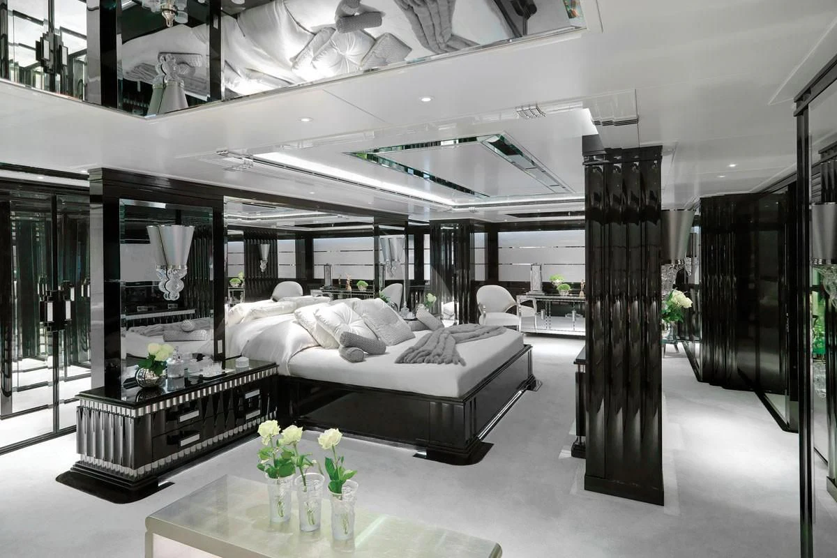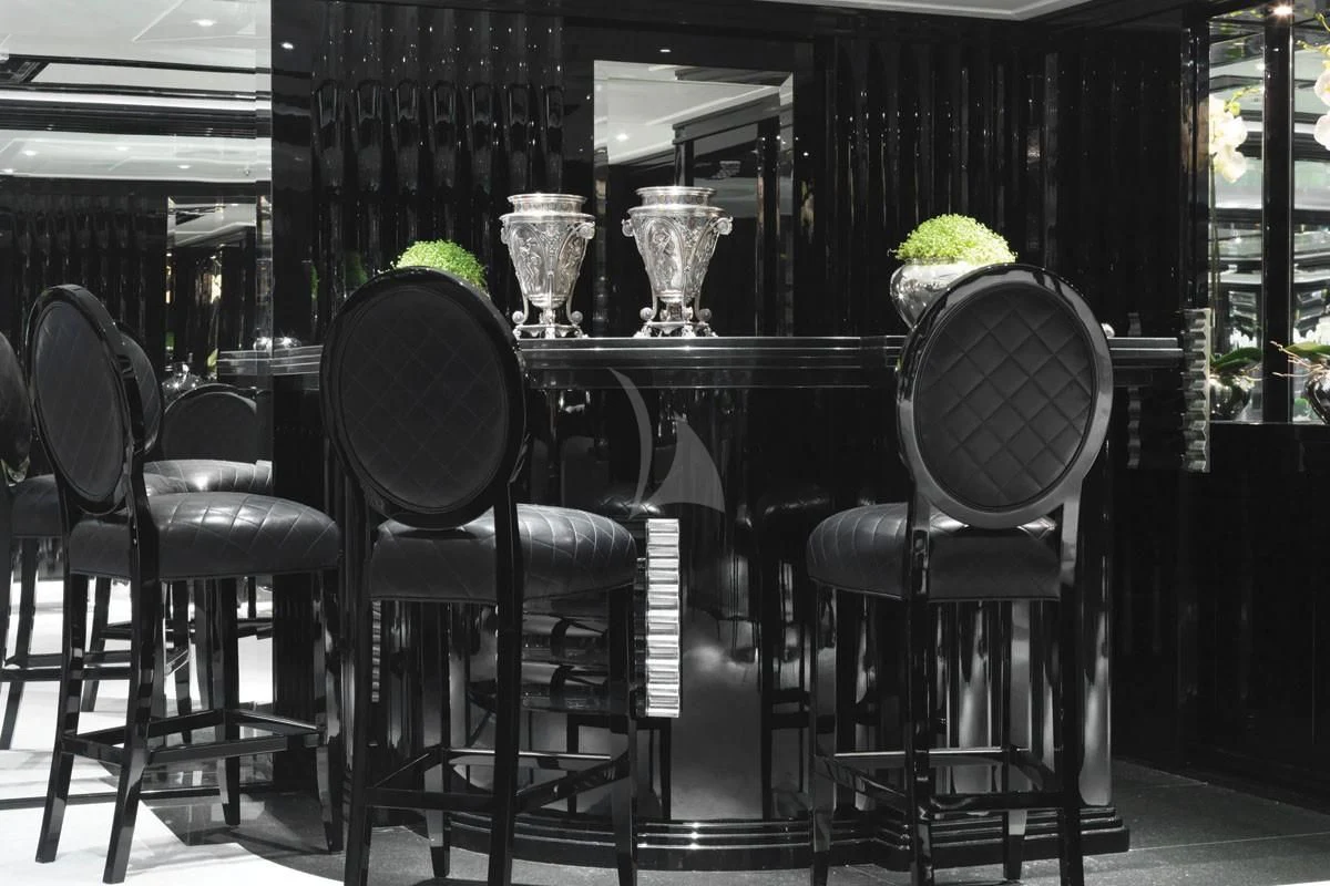 SILVER ANGEL’s Art Deco interior is designed in perfect harmony with her name. Created by Italy-based Stefano Natucci in collaboration with London-based Argent Design and the Benetti team, the entire yacht is filled with white and silver fabrics, carpeting, and accoutrements, all of it accented by glass, mirrors, and high-gloss black oak woodwork. Thousands of feet of fine marble and white onyx finish add to her lavish styling.