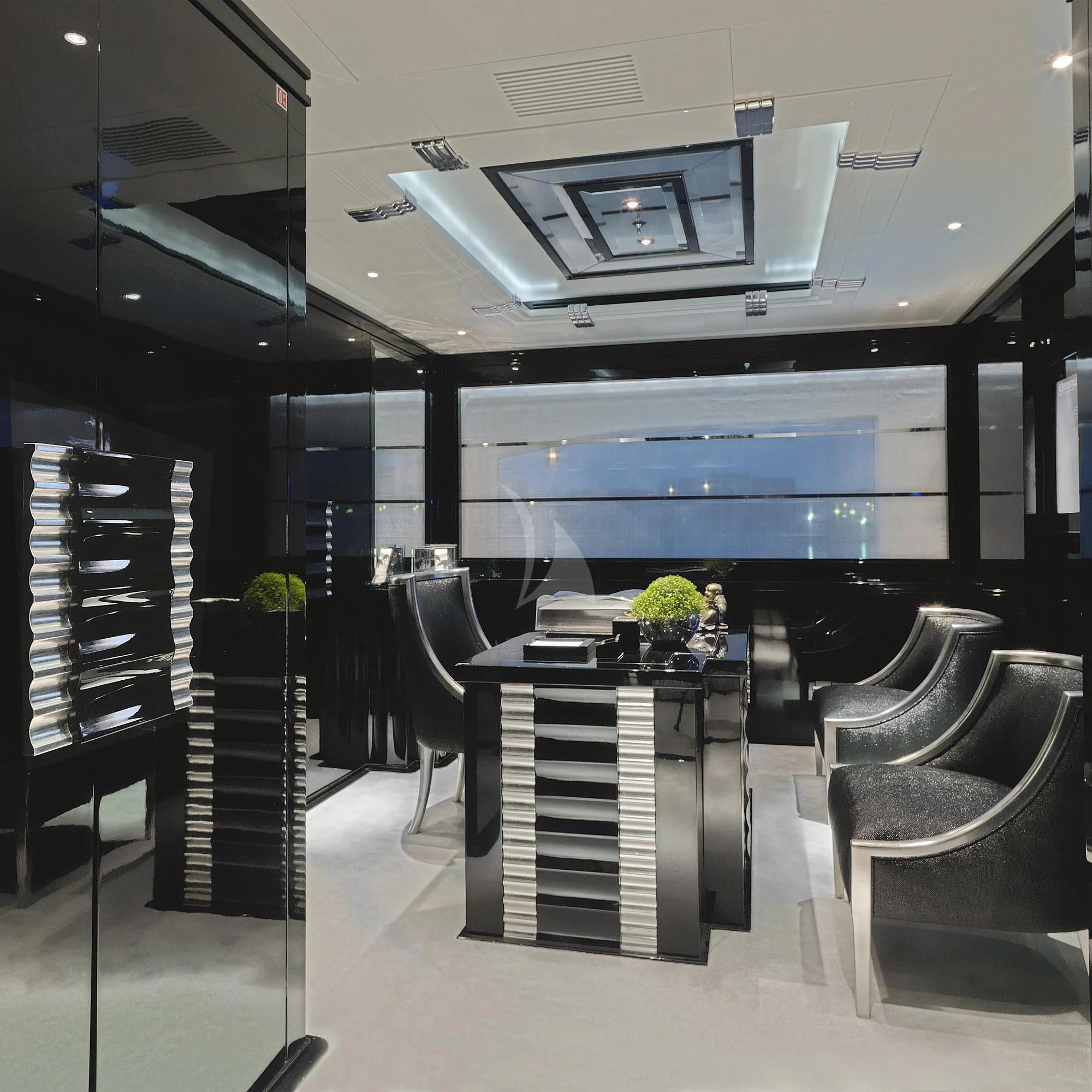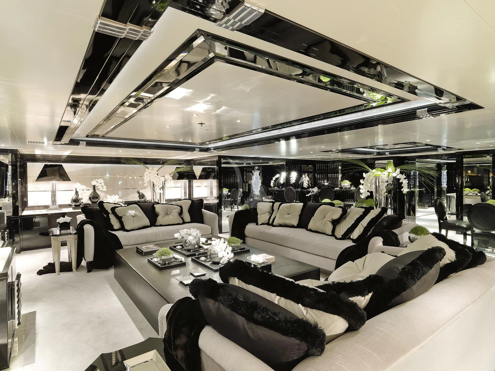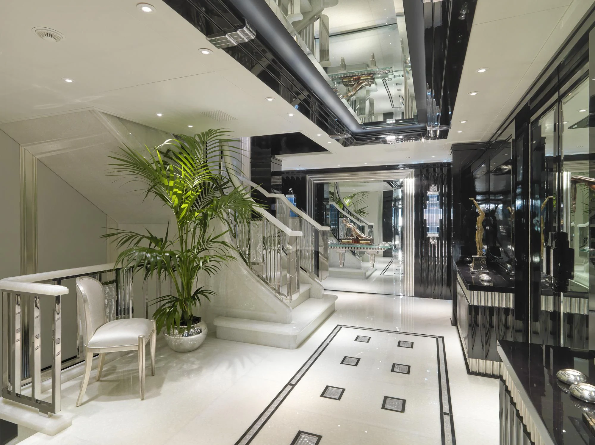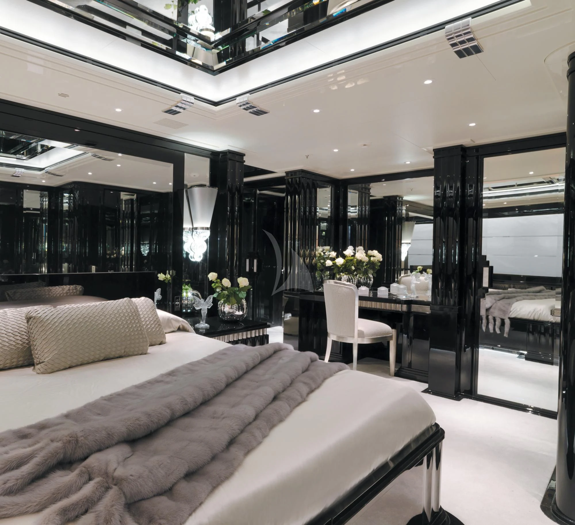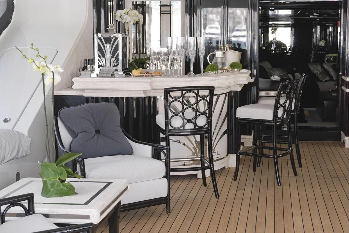SILVER ANGEL’s Art Deco interior is designed in perfect harmony with her name. Created by Italy-based Stefano Natucci in collaboration with London-based Argent Design and the Benetti team, the entire yacht is filled with white and silver fabrics, carpeting, and accoutrements, all of it accented by glass, mirrors, and high-gloss black oak woodwork. Thousands of feet of fine marble and white onyx finish add to her lavish styling.