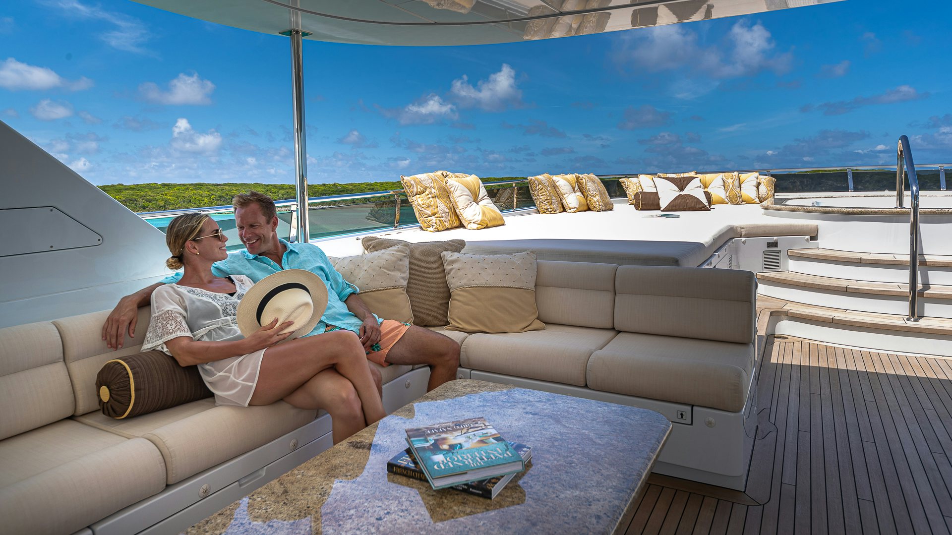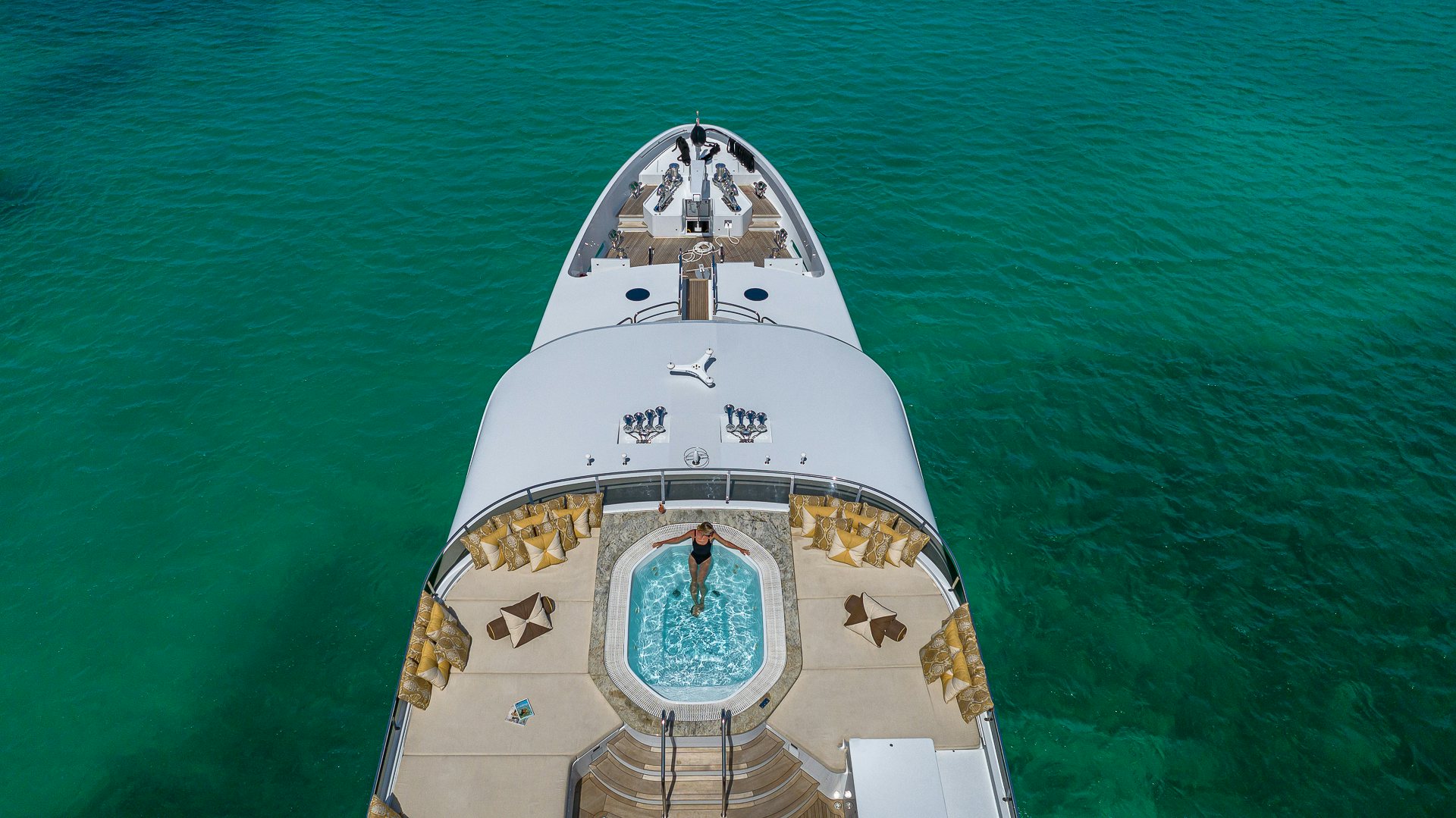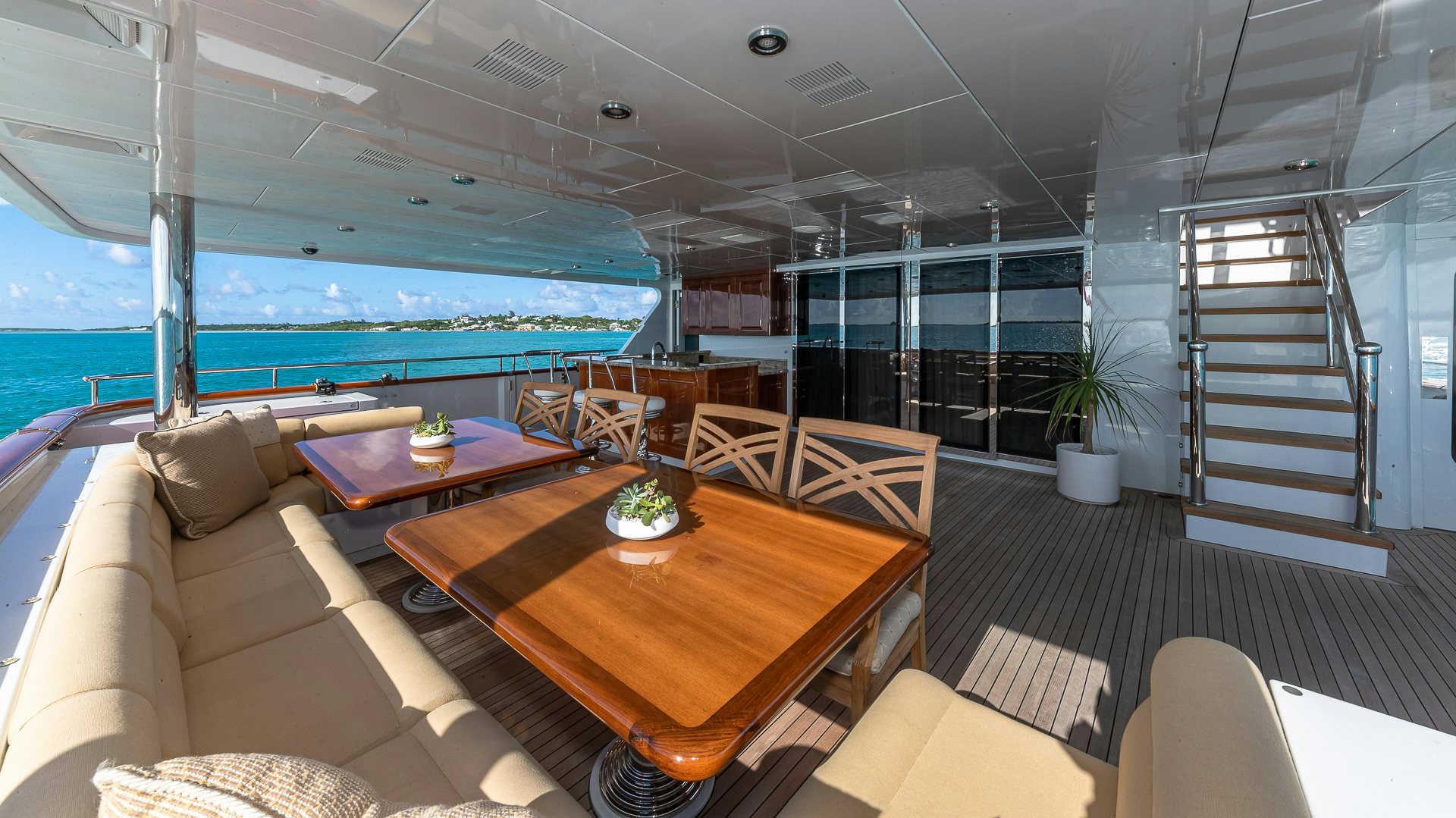 The on-deck spaces of SILVER LINING are perfectly suited for on-water living. The main deck aft features a settee with seating for 10 to 12. This space is outfitted with a full bar and 65-inch TV. Guests have access to the swim platform as well as the bridge deck. The bridge deck is the ideal place to enjoy alfresco meals courtesy of its large round wooden dining table for 12. For added comfort, guests will find overhead A/C or heating depending on the weather conditions. Aft of the dining table is a lounge spot with a couch and two chairs. The sundeck of SILVER LINING features a unique three-section layout. Forward on this deck is a 10-person Jacuzzi surrounded by large sunpads. The middle section of the sundeck features a 55-inch TV, a full bar with seating for nine, a barbecue and comfortable U-shaped seating where guests may enjoy meals, cocktails or both. The sundeck aft has four lounge chairs where guests can soak in the rays.