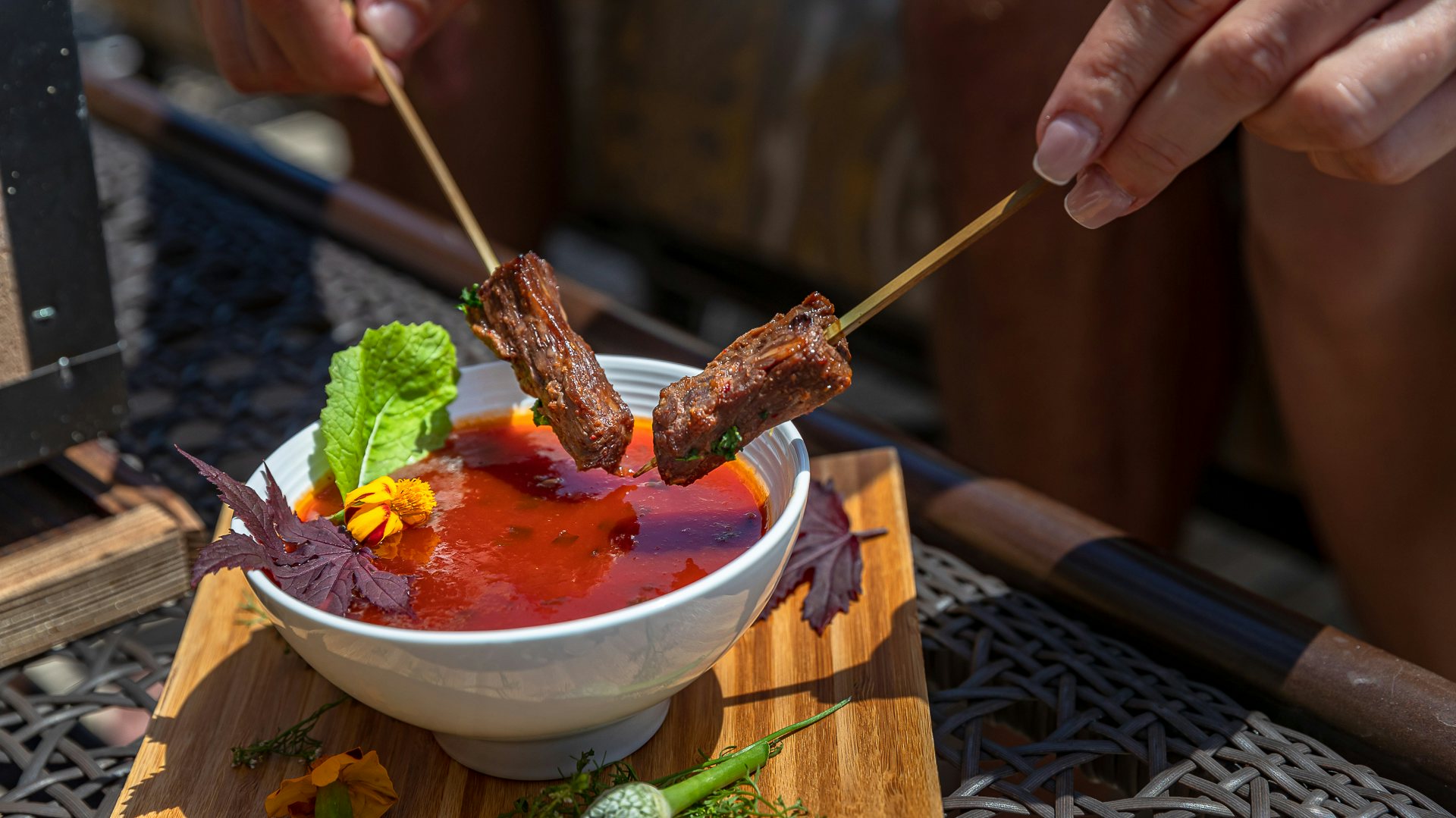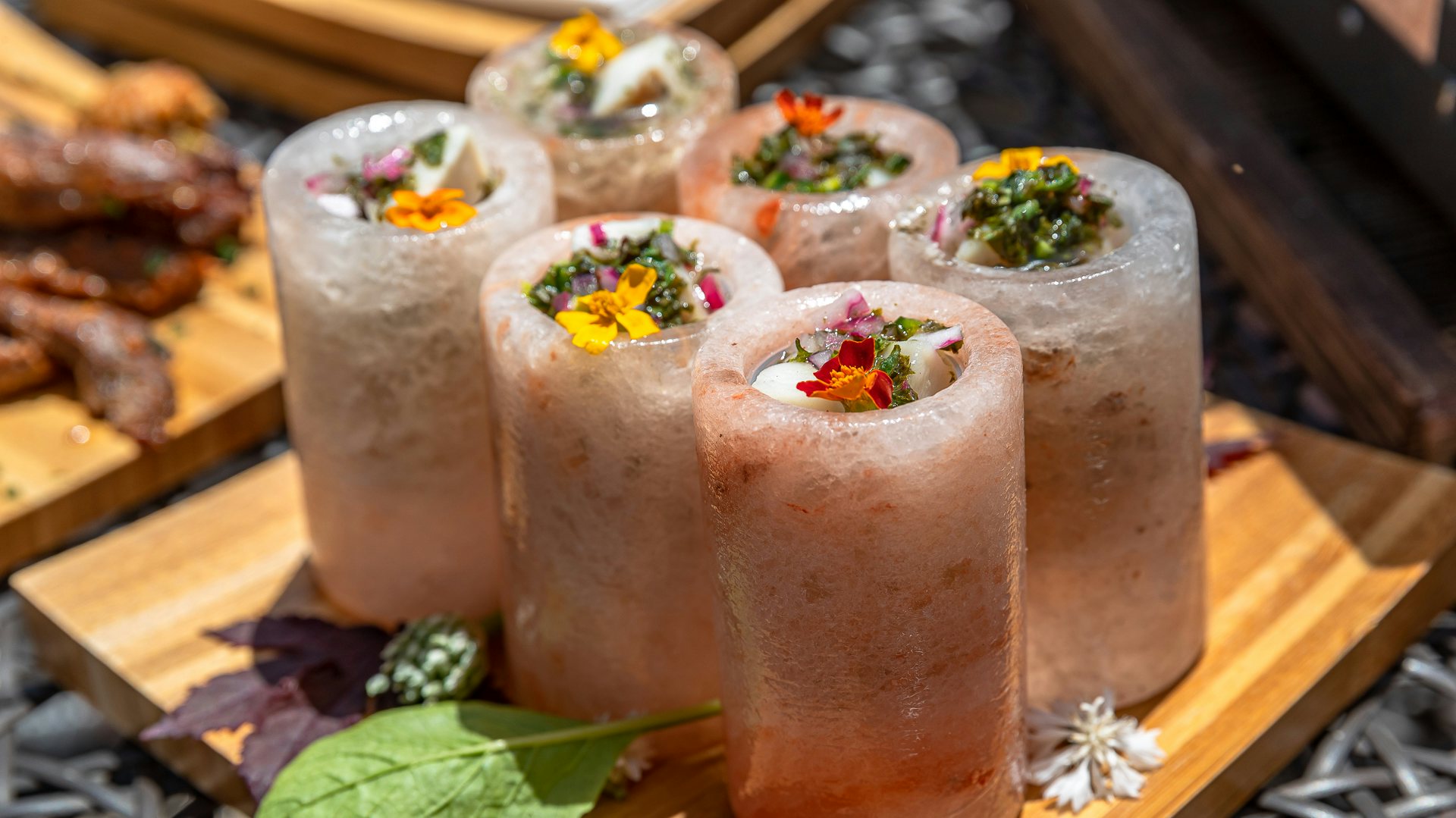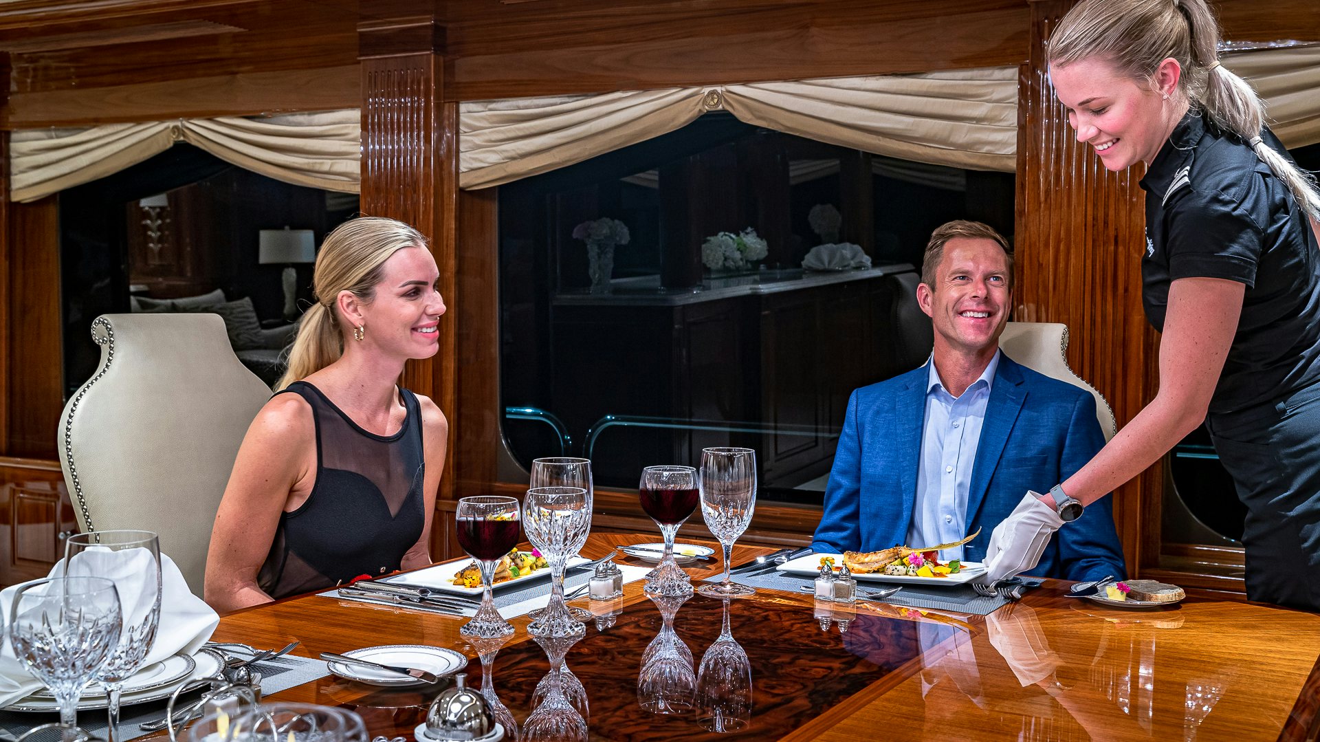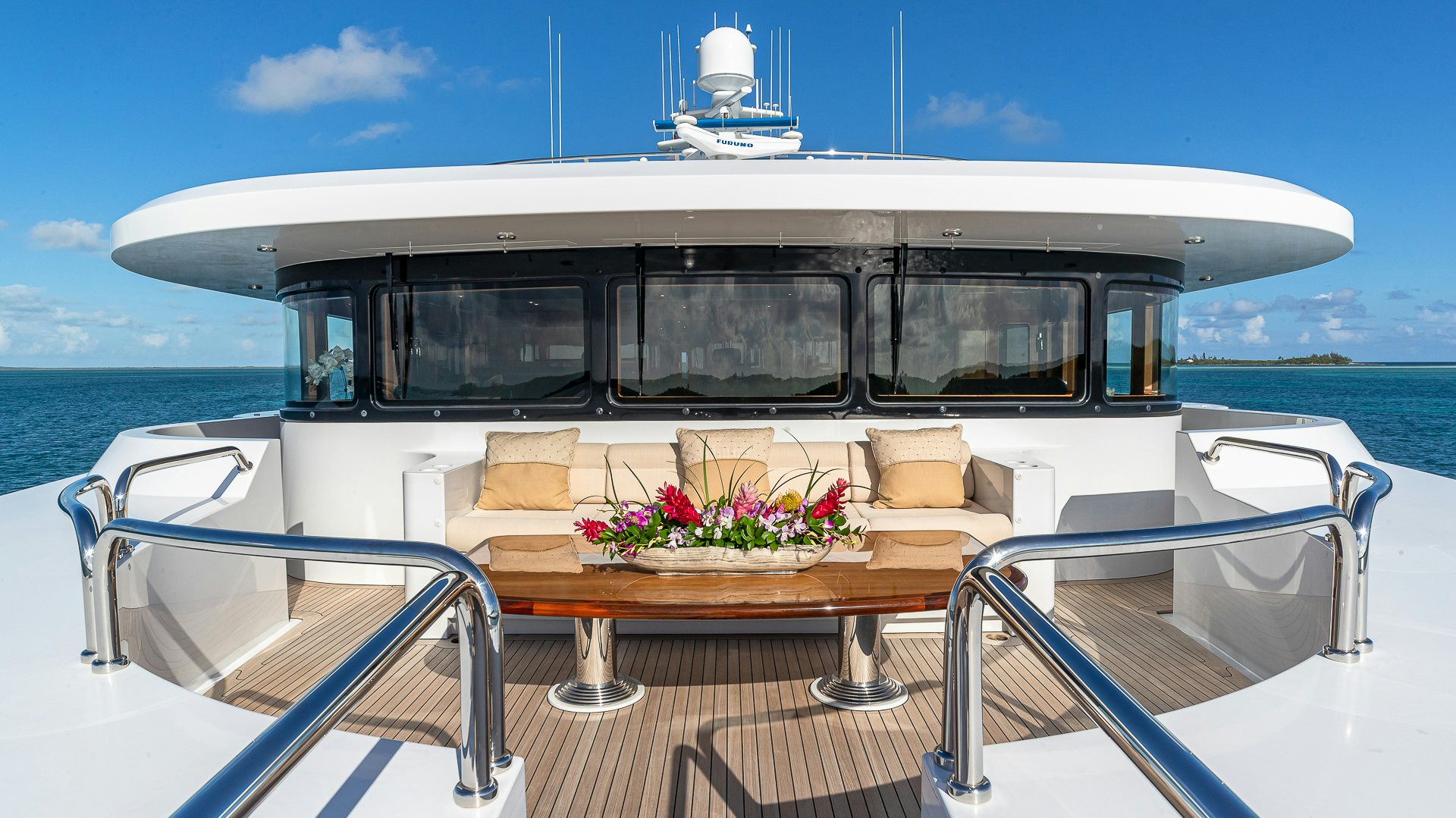 The on-deck spaces of SILVER LINING are perfectly suited for on-water living. The main deck aft features a settee with seating for 10 to 12. This space is outfitted with a full bar and 65-inch TV. Guests have access to the swim platform as well as the bridge deck. The bridge deck is the ideal place to enjoy alfresco meals courtesy of its large round wooden dining table for 12. For added comfort, guests will find overhead A/C or heating depending on the weather conditions. Aft of the dining table is a lounge spot with a couch and two chairs. The sundeck of SILVER LINING features a unique three-section layout. Forward on this deck is a 10-person Jacuzzi surrounded by large sunpads. The middle section of the sundeck features a 55-inch TV, a full bar with seating for nine, a barbecue and comfortable U-shaped seating where guests may enjoy meals, cocktails or both. The sundeck aft has four lounge chairs where guests can soak in the rays.