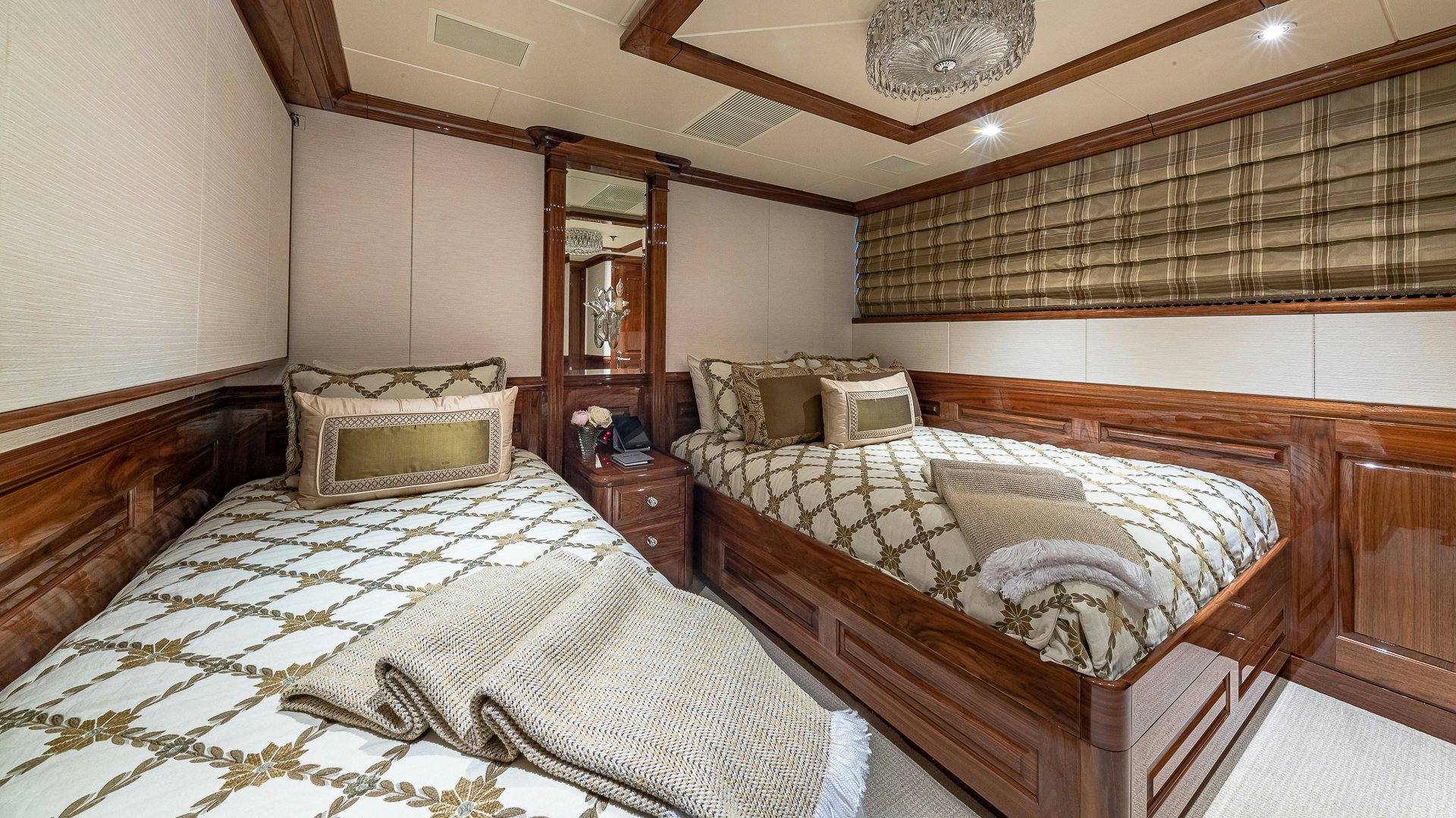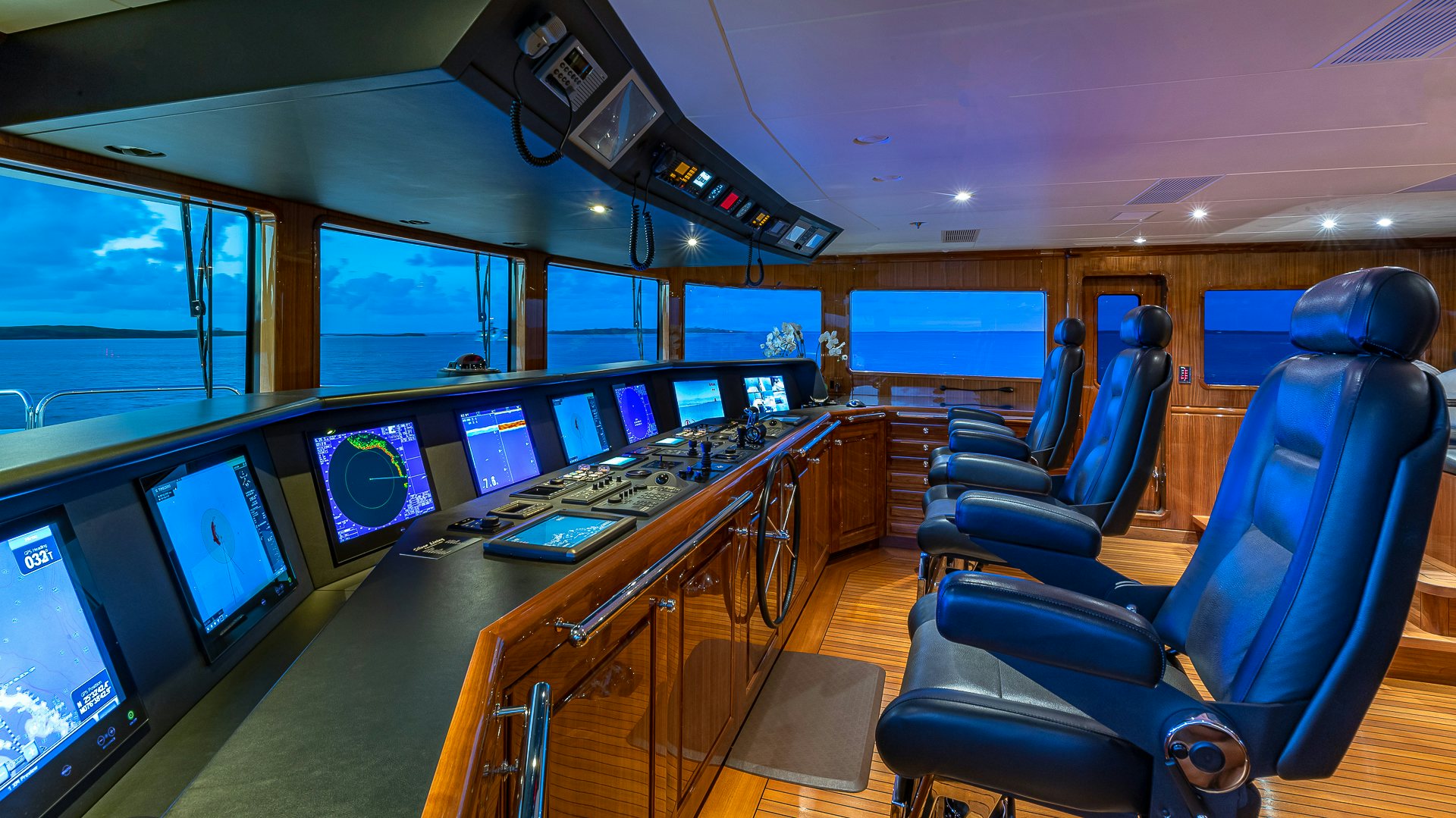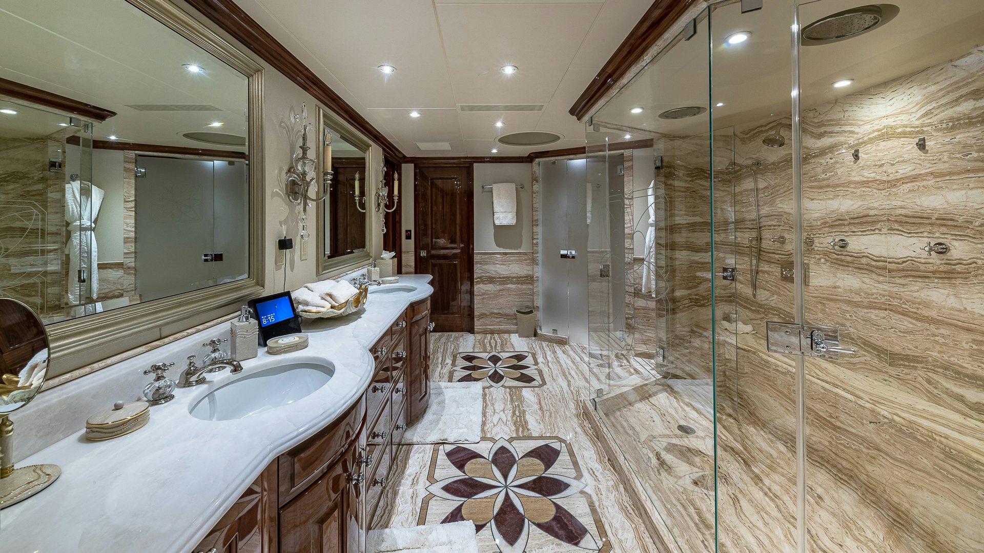 Twelve guests are comfortably accommodated in six staterooms aboard SILVER LINING. The yacht’s full-beam master suite is located on the main deck. It offers a comfortable king-size bed, a full suite of entertainment amenities, including a 65-inch TV, a beautiful his-and-hers en-suite bathroom with heated floors, a large European shower and two sinks, and six large oval windows that provide exceptional views. The yacht’s additional accommodations are located below deck. Each is accessed by the elevator. These include a full-beam VIP stateroom, two king guest staterooms and two double guest staterooms which offer an additional single bed and Pullman for added flexibility. All staterooms aboard SILVER LINING feature en-suite bathrooms, full suites of entertainment facilities, and other impressive amenities. SILVER LINING carries a professional crew of 10.