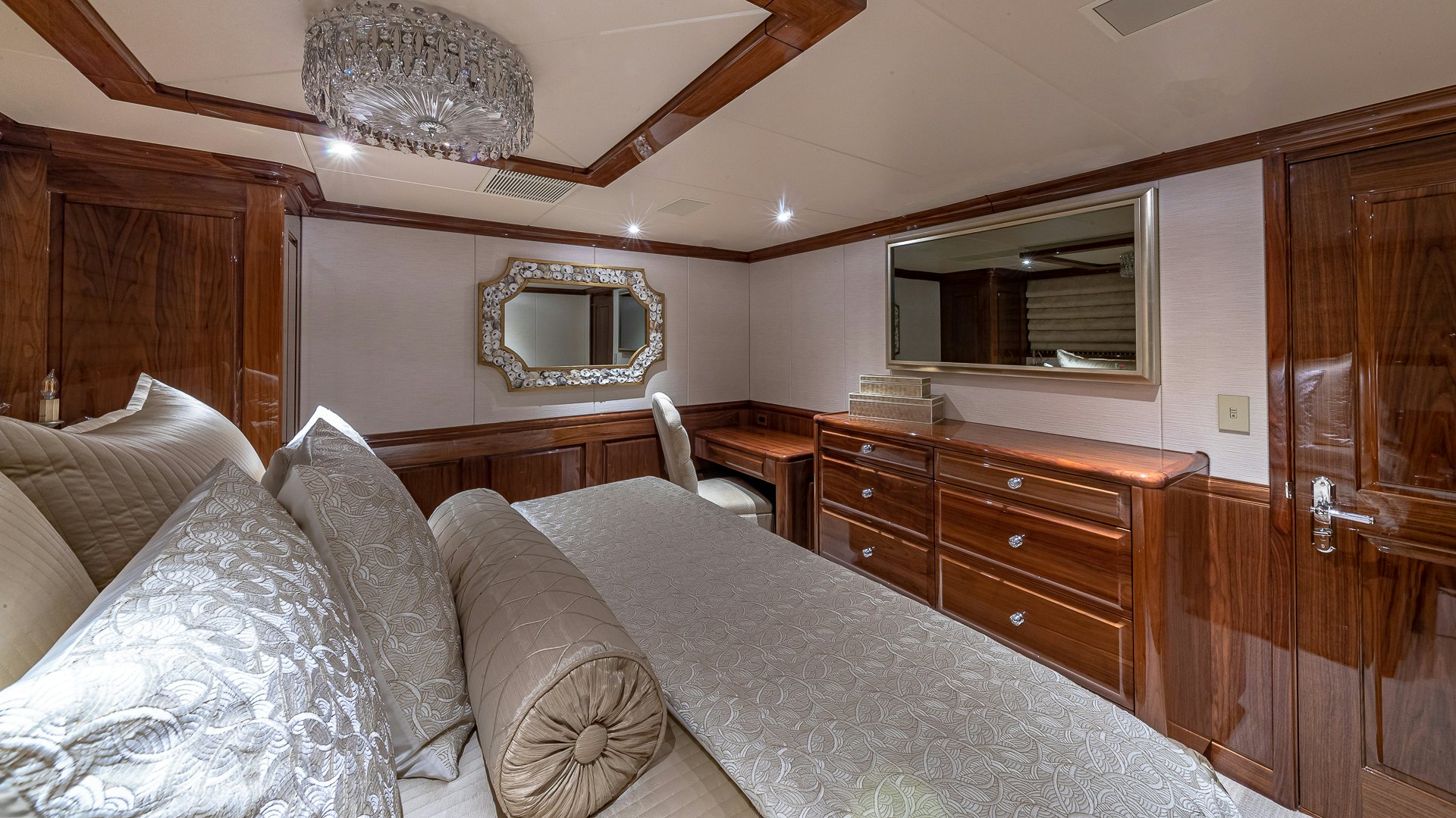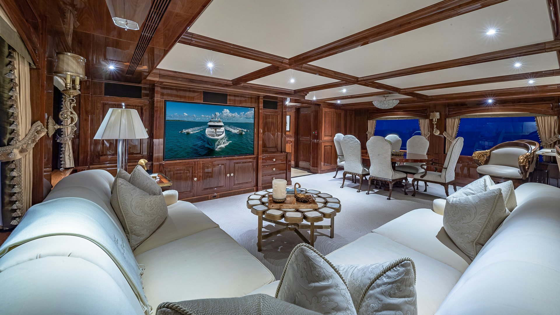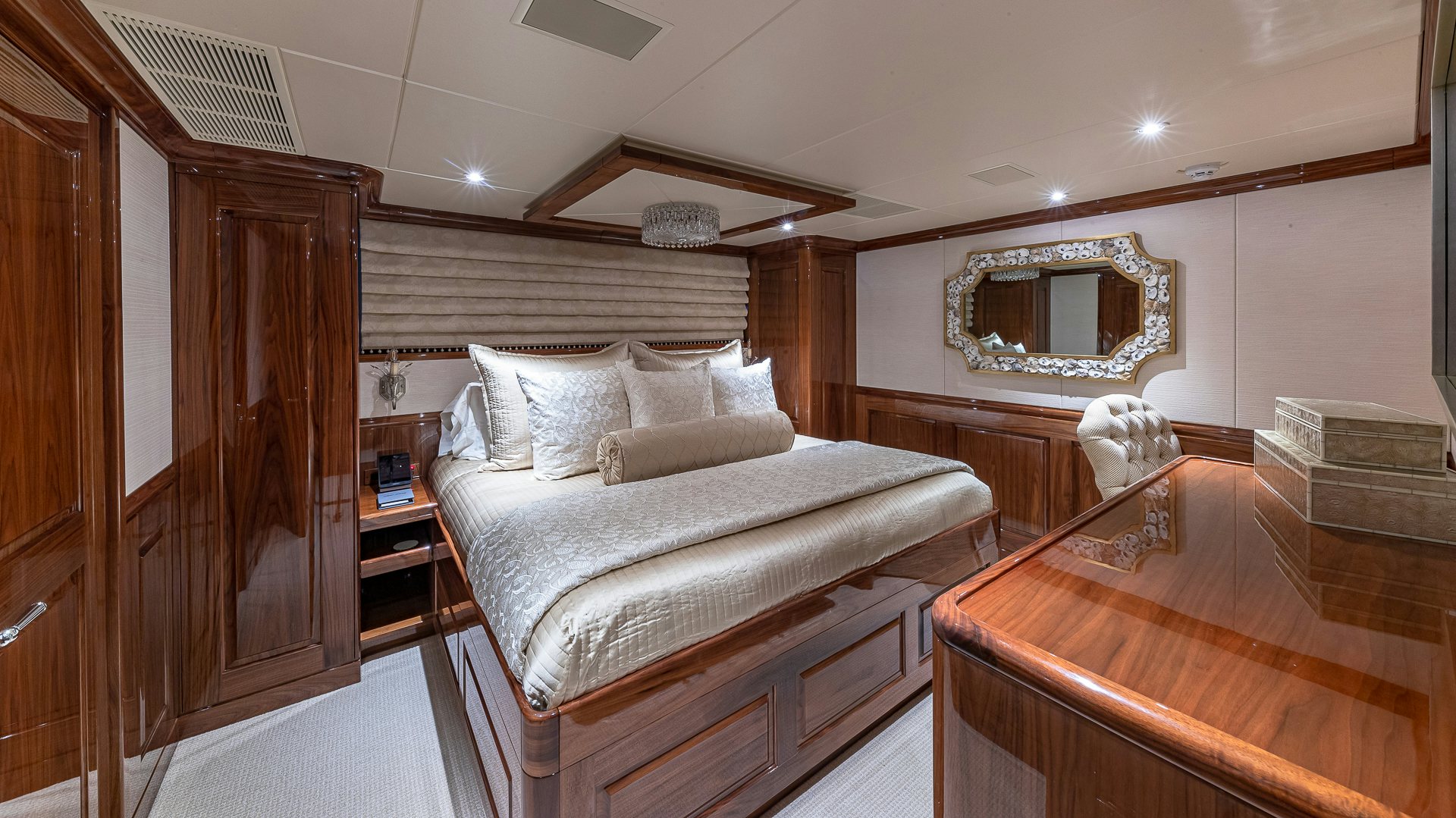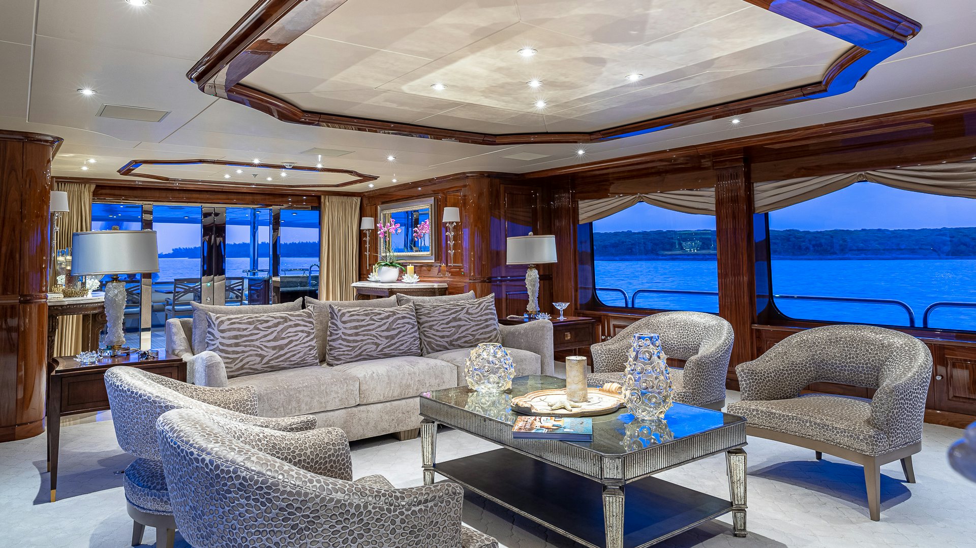 The interior spaces of SILVER LINING are comfortable and welcoming. This sophisticated yacht exudes a glamorously elegant atmosphere. Her main salon is exquisite, featuring timeless styling. The voluminous salon with abundant lounge and seating provides guests with the perfect place to socialize and entertain. The main salon also offers a 50-inch flat-screen TV, which divides the salon from the dining room, which is located forward. The formal dining salon welcomes 12 for exceptional dinners prepared by the yacht’s five-star chef. From the dining salon, guests can access the lovely main foyer with elevator access to all 4 decks. The skylounge located on the bridge deck is also outfitted with ample seating featuring a beautiful marble bar with nine oversized chairs, three TVs, including a 65-inch TV, and other top entertainment amenities.