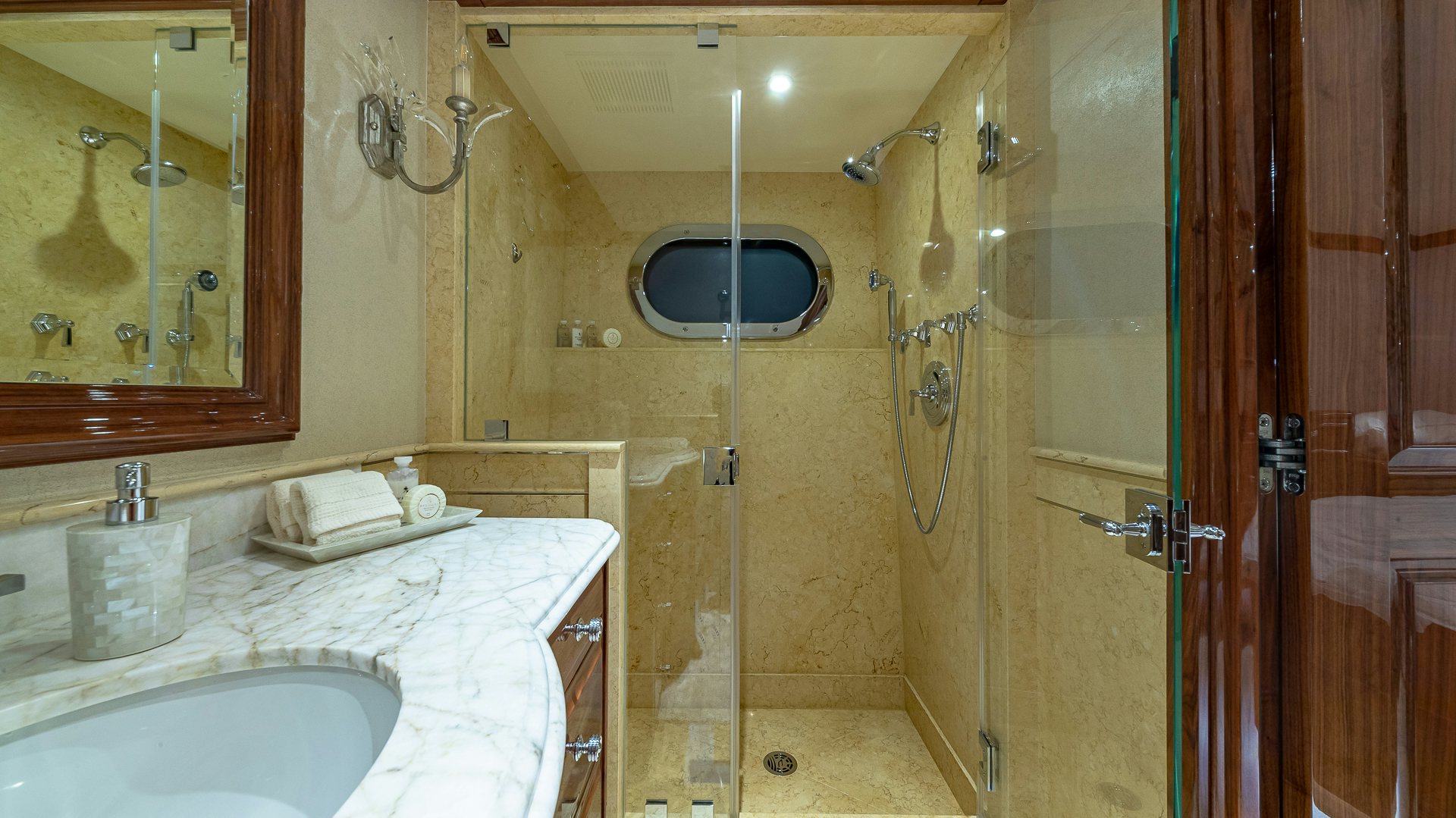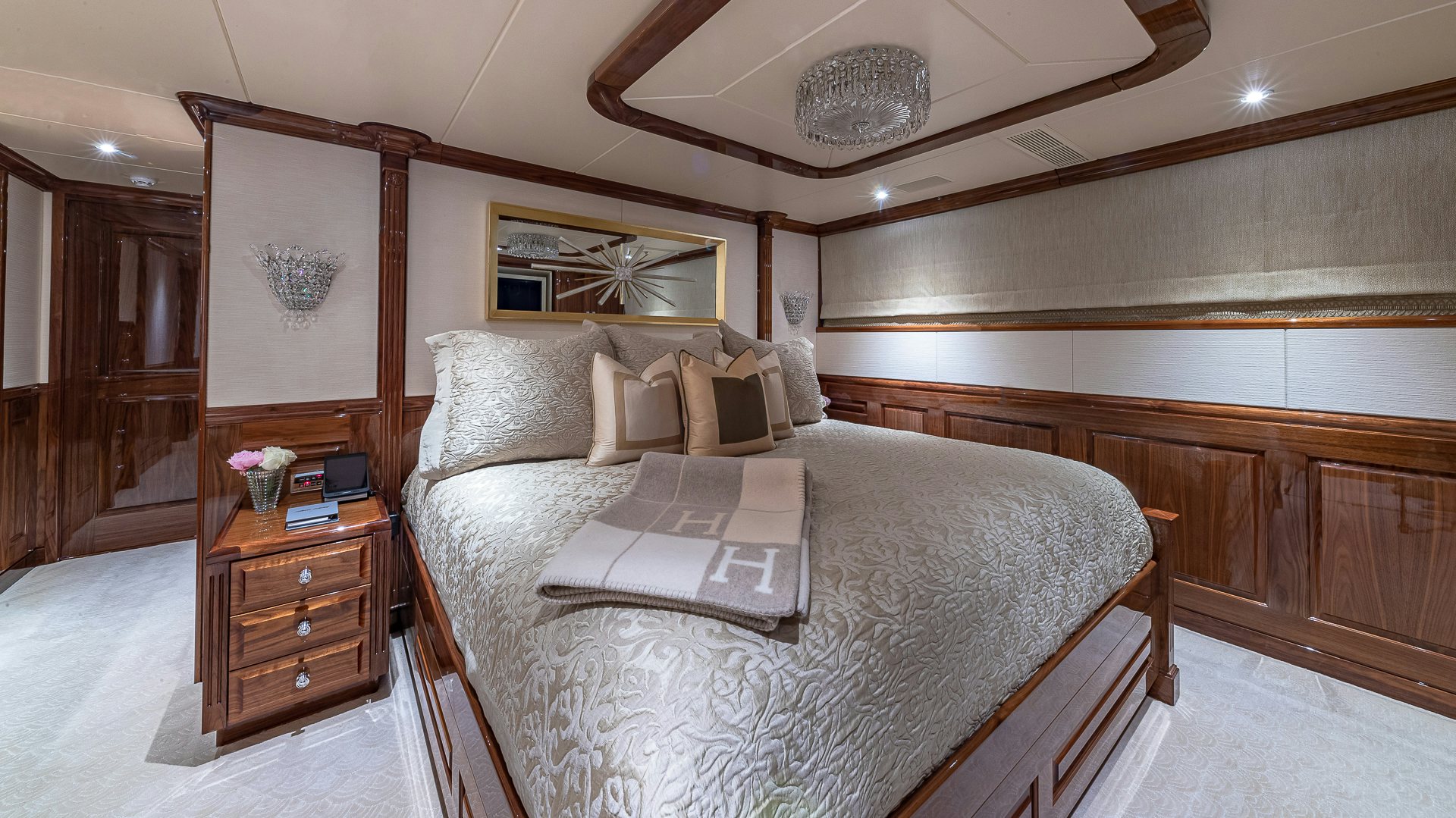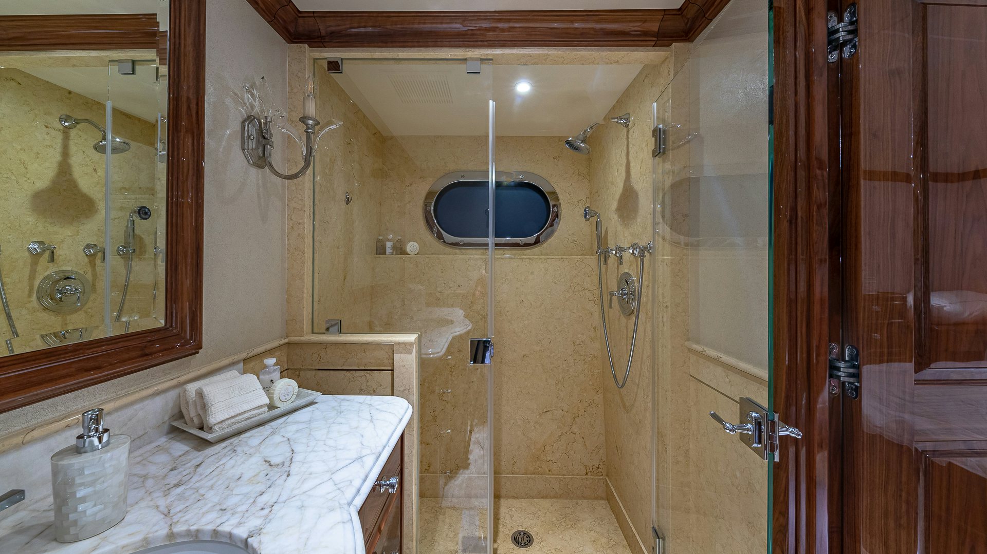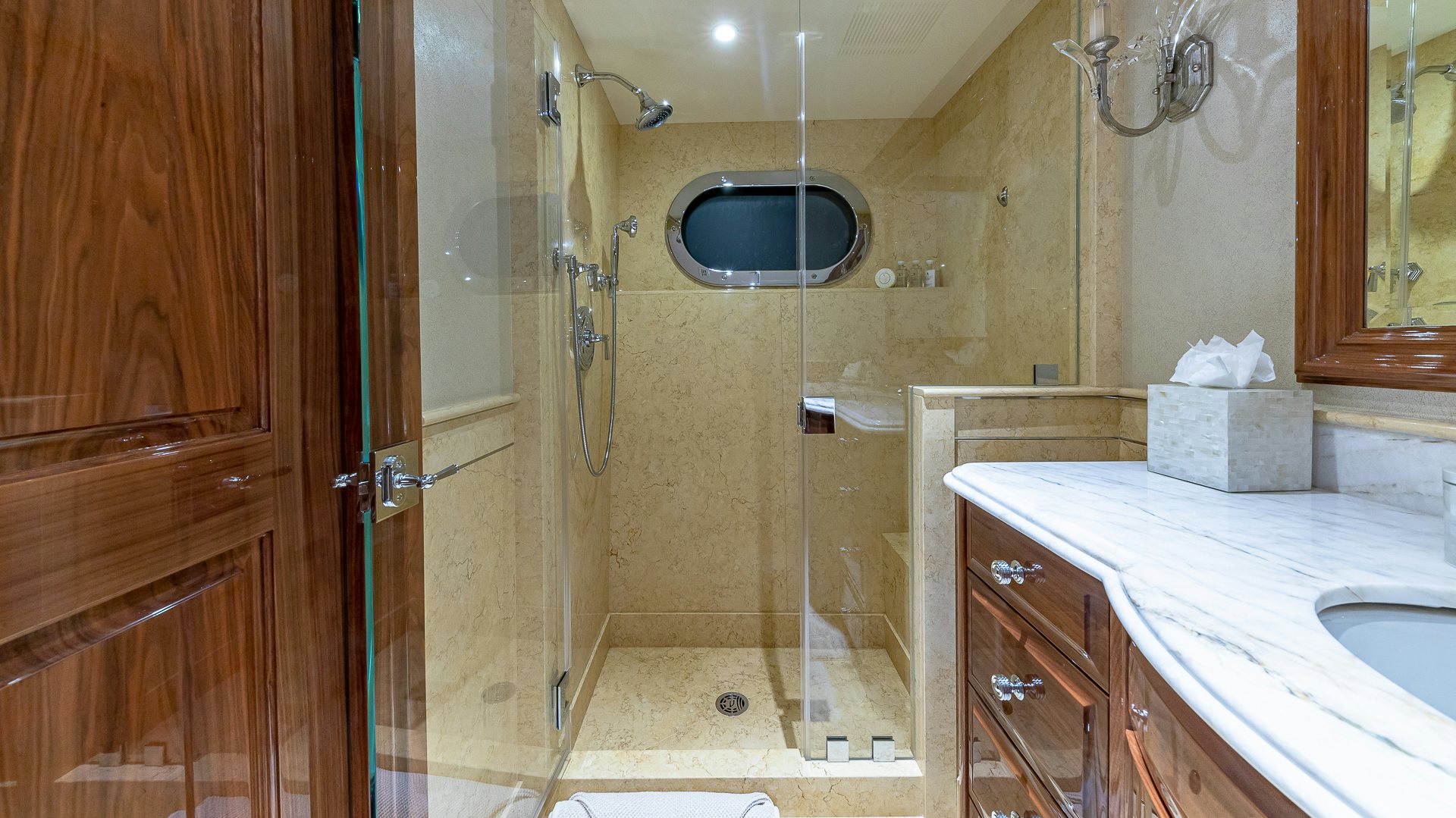 The interior spaces of SILVER LINING are comfortable and welcoming. This sophisticated yacht exudes a glamorously elegant atmosphere. Her main salon is exquisite, featuring timeless styling. The voluminous salon with abundant lounge and seating provides guests with the perfect place to socialize and entertain. The main salon also offers a 50-inch flat-screen TV, which divides the salon from the dining room, which is located forward. The formal dining salon welcomes 12 for exceptional dinners prepared by the yacht’s five-star chef. From the dining salon, guests can access the lovely main foyer with elevator access to all 4 decks. The skylounge located on the bridge deck is also outfitted with ample seating featuring a beautiful marble bar with nine oversized chairs, three TVs, including a 65-inch TV, and other top entertainment amenities.