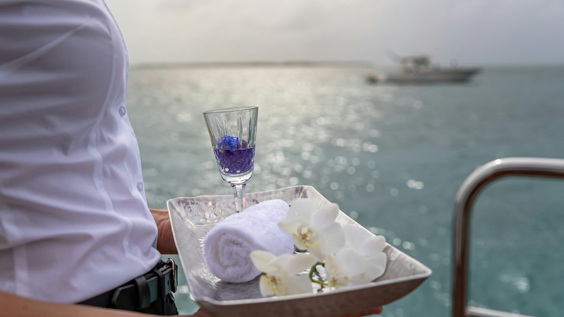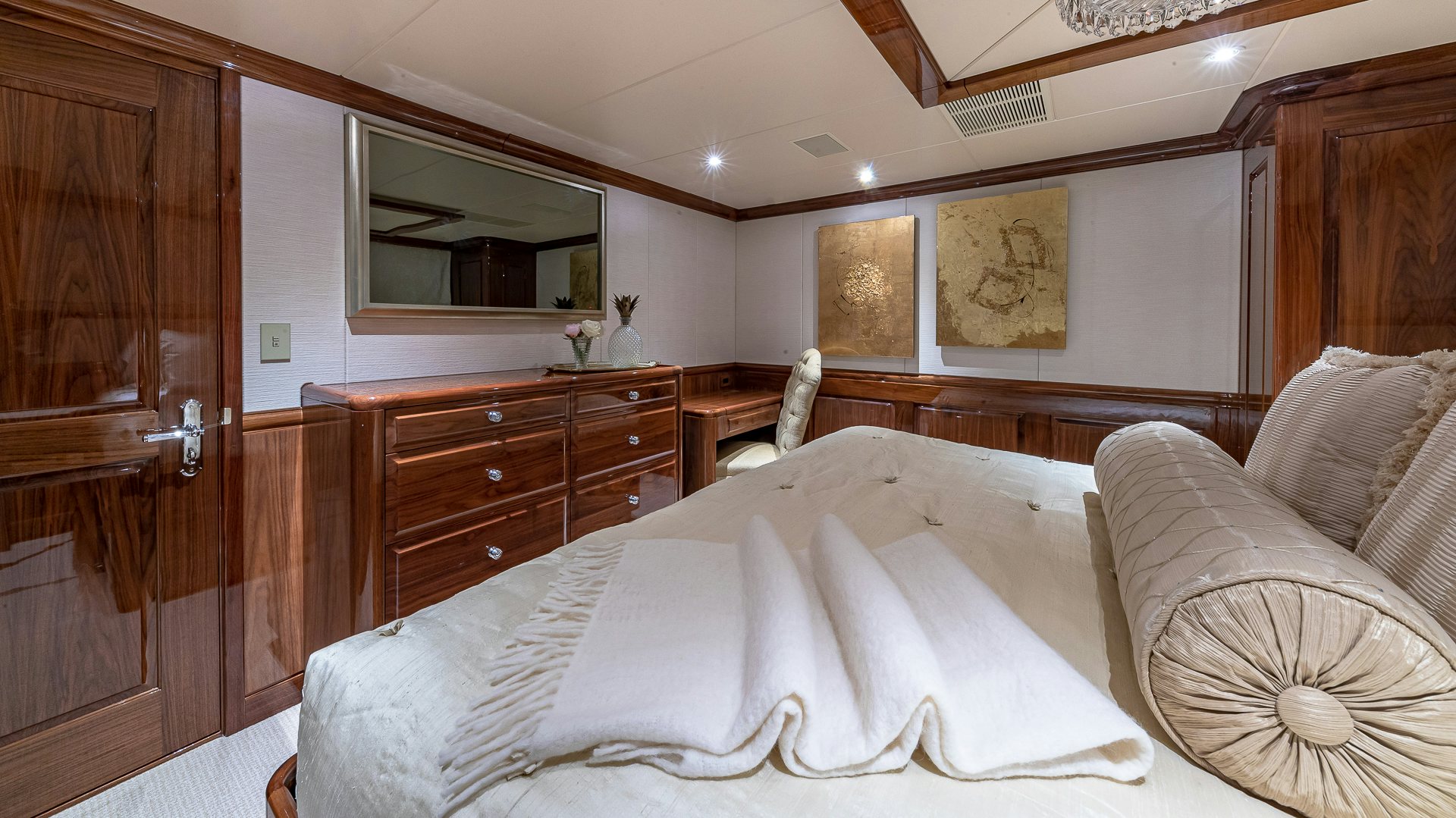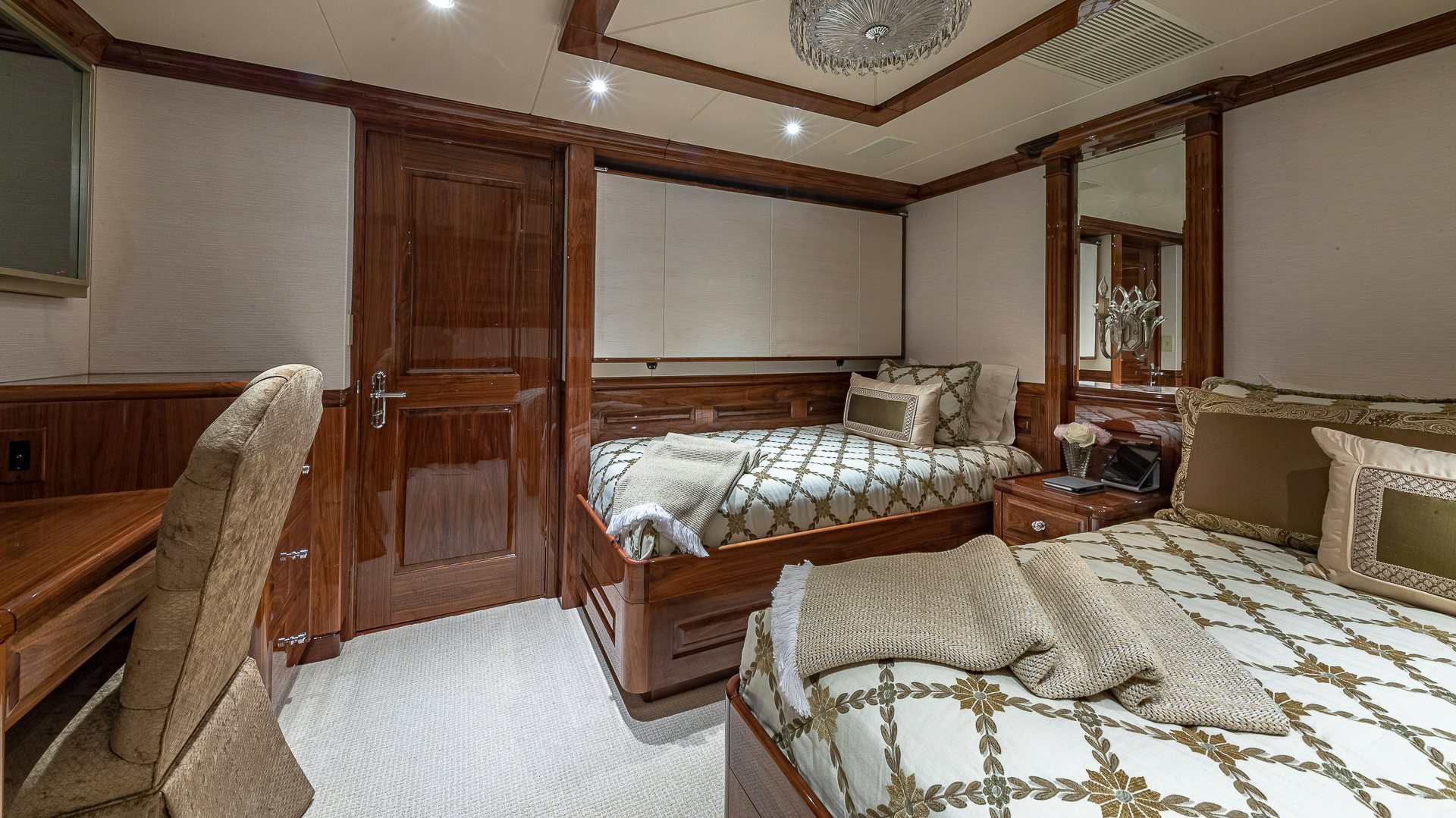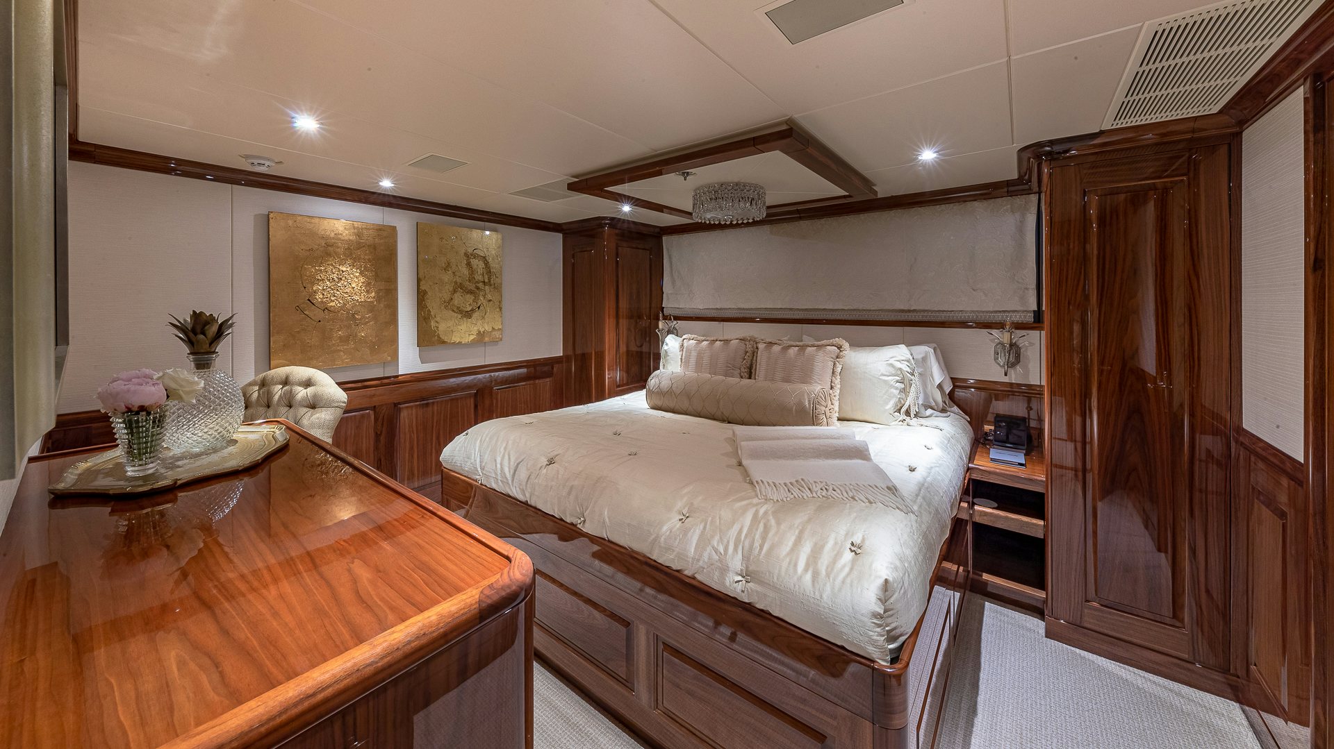 The interior spaces of SILVER LINING are comfortable and welcoming. This sophisticated yacht exudes a glamorously elegant atmosphere. Her main salon is exquisite, featuring timeless styling. The voluminous salon with abundant lounge and seating provides guests with the perfect place to socialize and entertain. The main salon also offers a 50-inch flat-screen TV, which divides the salon from the dining room, which is located forward. The formal dining salon welcomes 12 for exceptional dinners prepared by the yacht’s five-star chef. From the dining salon, guests can access the lovely main foyer with elevator access to all 4 decks. The skylounge located on the bridge deck is also outfitted with ample seating featuring a beautiful marble bar with nine oversized chairs, three TVs, including a 65-inch TV, and other top entertainment amenities.